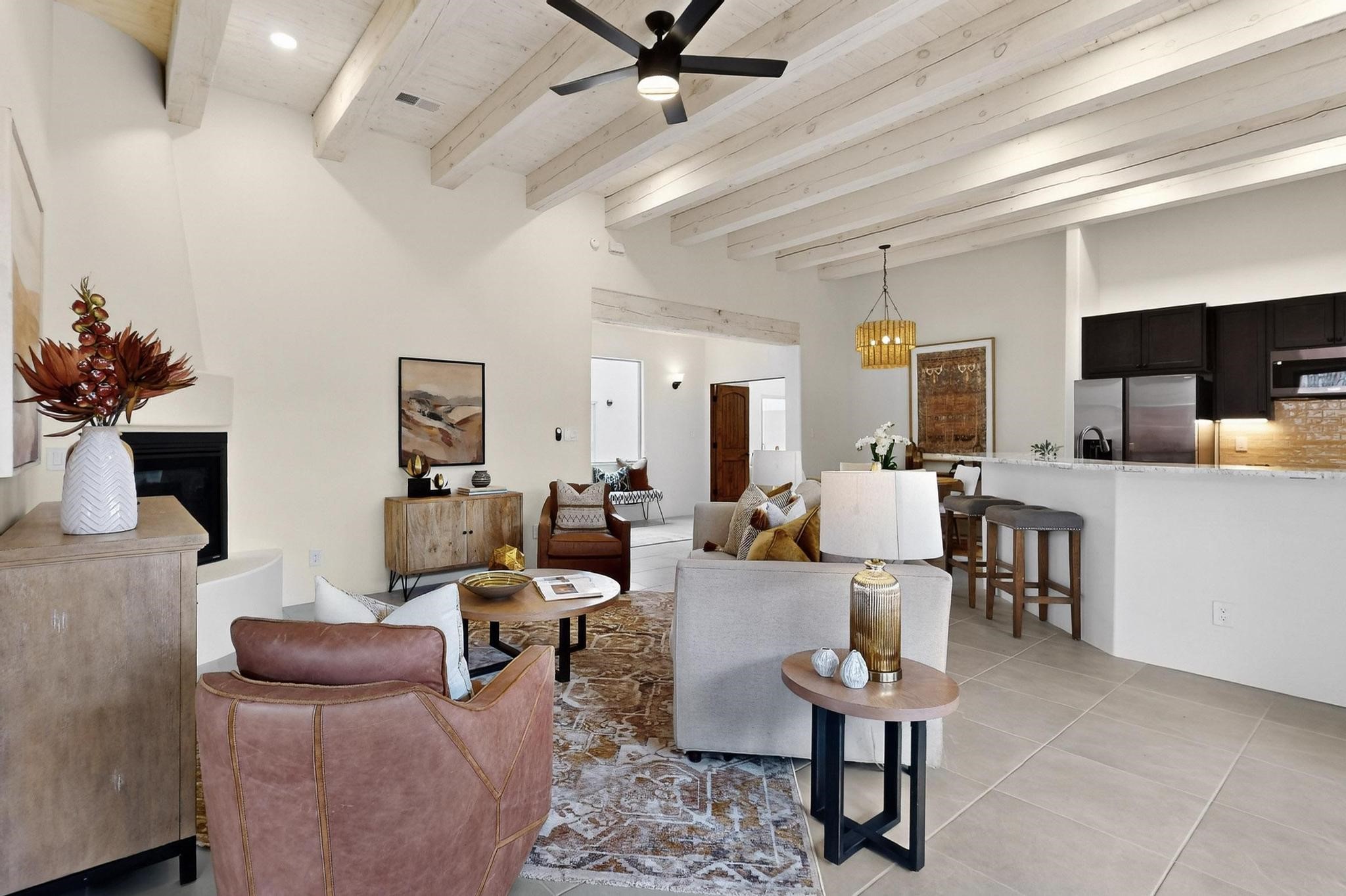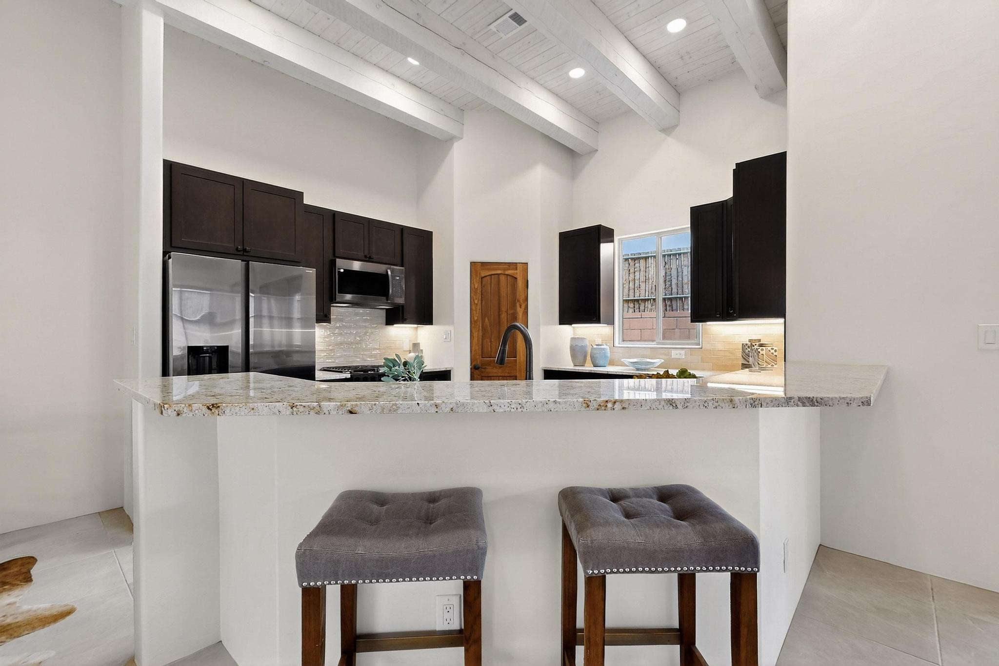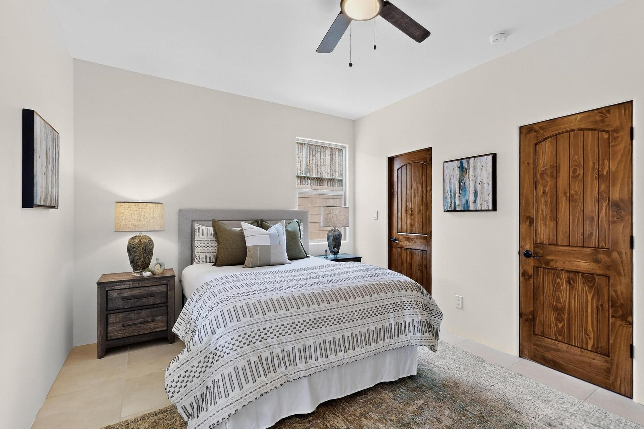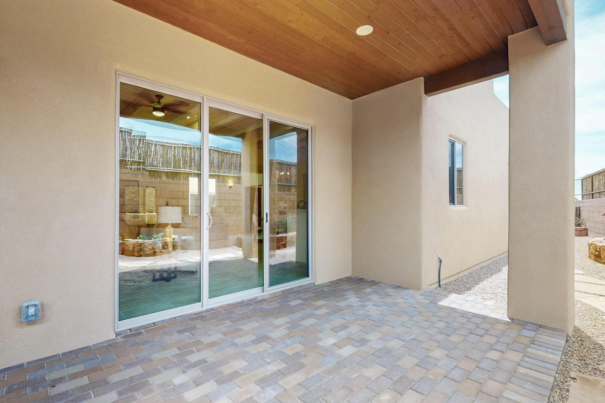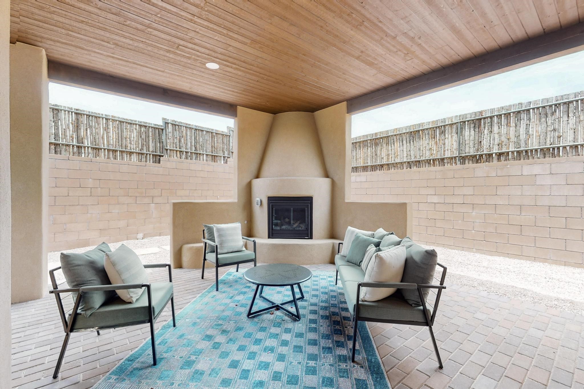 With a unique site plan and multiple pocket gardens and sitting areas,this delightful Zaguanita Plan with its rich and sophisticated colors is enteredthrough a lockable double-cedar and wrought iron gate into a covered entry (a"Zaguan") with brick pavers and an open private courtyard. To your left is aseparate living unit with a bedroom and three-quarter bath and its own HVAC unit, atankless hot water heater, tiled shower surrounds, ebony-colored cabinets withgrey quartz countertops, and a sink and an under-counter refrigerator. Themain entry leads to the formal entry with a lighted nicho and boveda ceiling. Tothe left is the owner's suite with a barn door entry to the master bath with alarge walk-in shower with euro-style shower fixtures and an overhead rainshower head. His-and-Hers closets are separated by a commode closet. Directlyahead of the entrance is the open living room with Pickling-white stained beamsand T&G planking offset with white quartz countertops, a kiva fireplace and anopen kitchen with an oversized counter. The kitchen and guest bedroom bothopen out to a covered portal that has a gas-fired kiva fireplace and brick pavers.To the right is the guest bedroom bath that can also serve as a powder room.The open kitchen has Smoked Gray color cabinets. All floors are tiled with lightgray porcelain planks. The exterior is a contemporary design with a TPO roof.The driveway is a colored stamped concrete design, and the insulated garageincludes an epoxy-coated floor.