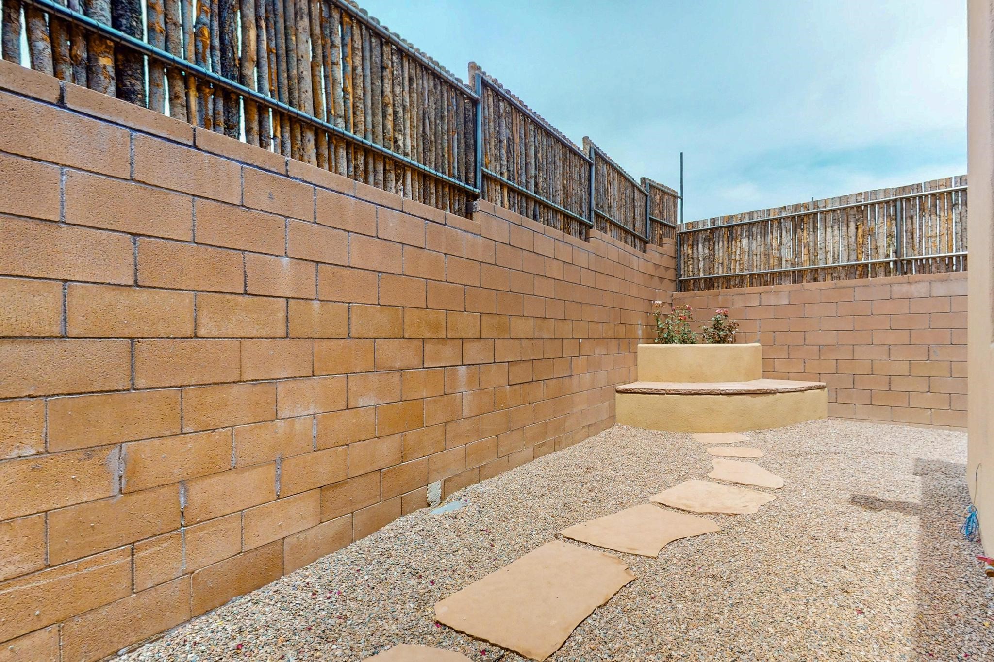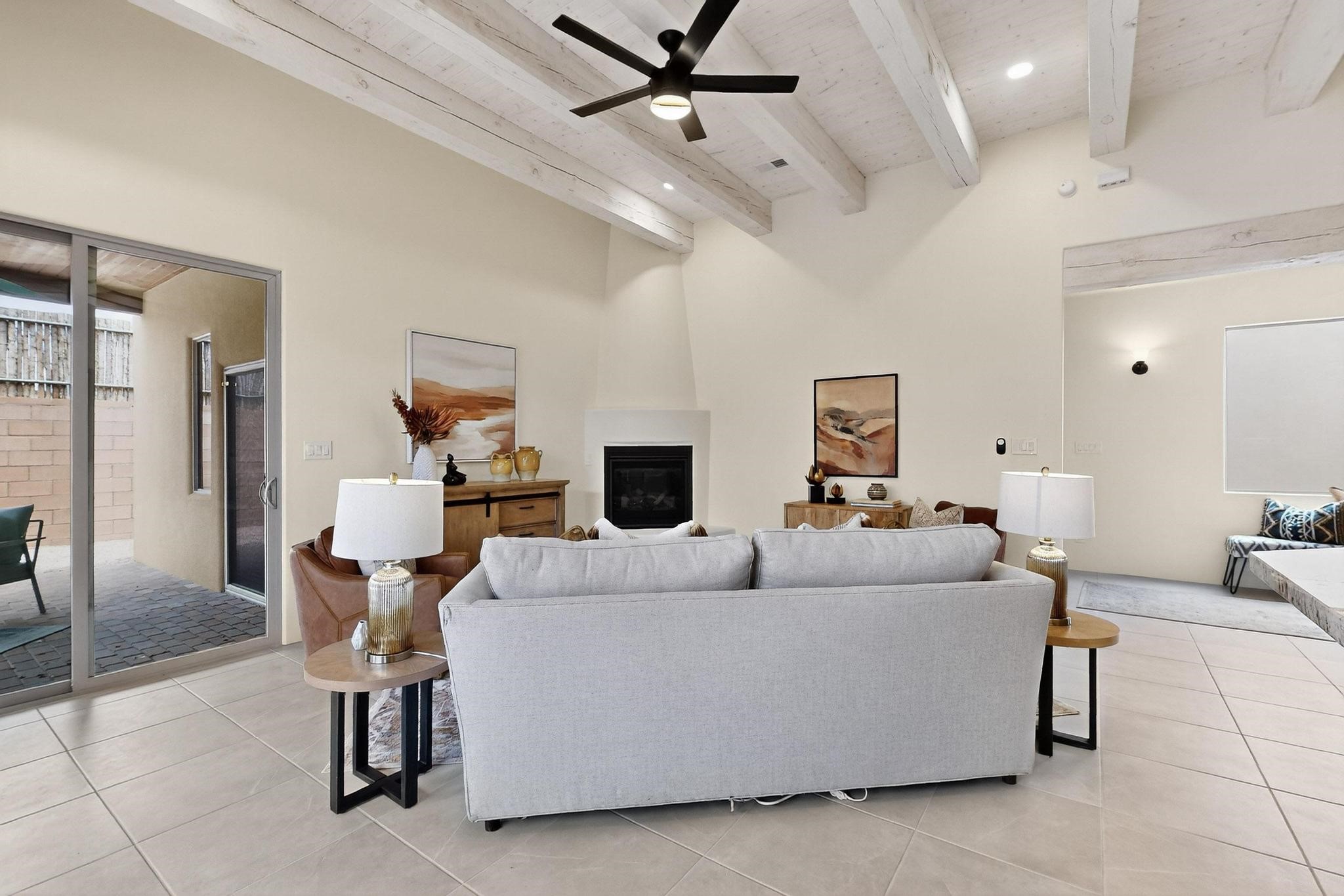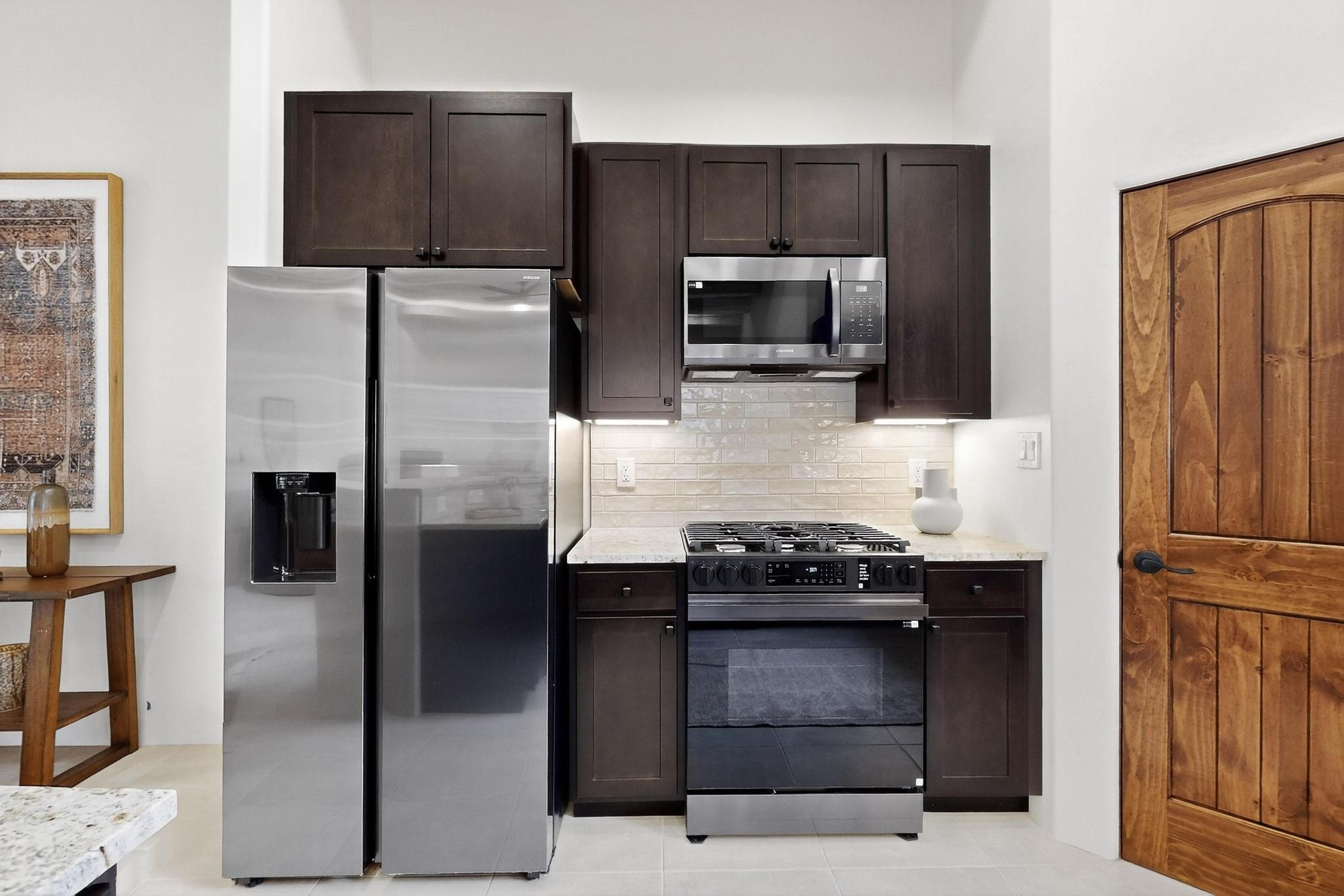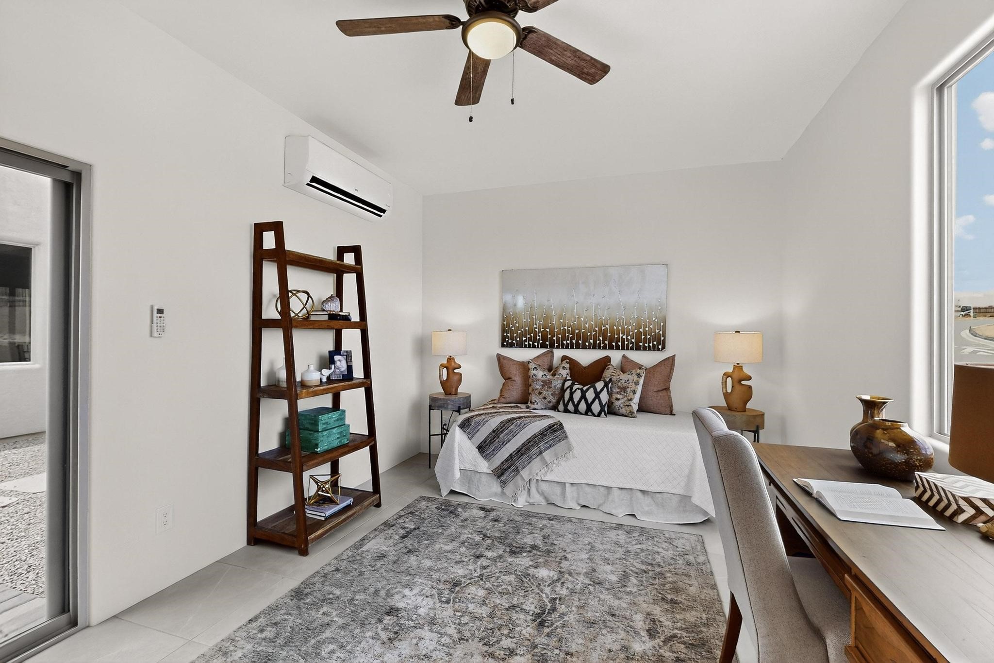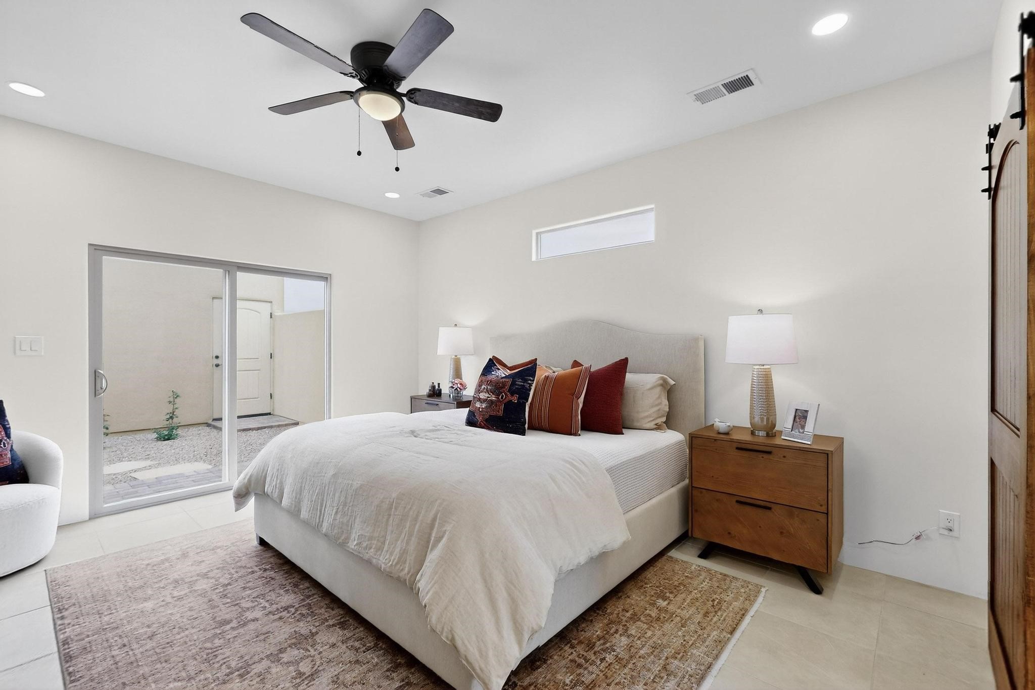 With a unique site plan and multiple pocket gardens and sitting areas,this delightful Zaguanita Plan with its rich and sophisticated colors is enteredthrough a lockable double-cedar and wrought iron gate into a covered entry (a"Zaguan") with brick pavers and an open private courtyard. To your left is aseparate living unit with a bedroom and three-quarter bath and its own HVAC unit, atankless hot water heater, tiled shower surrounds, ebony-colored cabinets withgrey quartz countertops, and a sink and an under-counter refrigerator. Themain entry leads to the formal entry with a lighted nicho and boveda ceiling. Tothe left is the owner's suite with a barn door entry to the master bath with alarge walk-in shower with euro-style shower fixtures and an overhead rainshower head. His-and-Hers closets are separated by a commode closet. Directlyahead of the entrance is the open living room with Pickling-white stained beamsand T&G planking offset with white quartz countertops, a kiva fireplace and anopen kitchen with an oversized counter. The kitchen and guest bedroom bothopen out to a covered portal that has a gas-fired kiva fireplace and brick pavers.To the right is the guest bedroom bath that can also serve as a powder room.The open kitchen has Smoked Gray color cabinets. All floors are tiled with lightgray porcelain planks. The exterior is a contemporary design with a TPO roof.The driveway is a colored stamped concrete design, and the insulated garageincludes an epoxy-coated floor.
