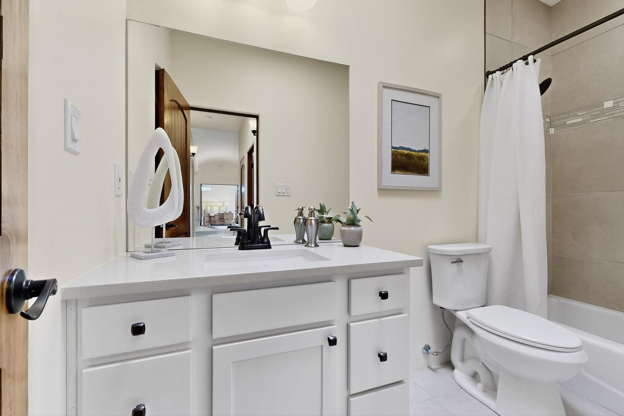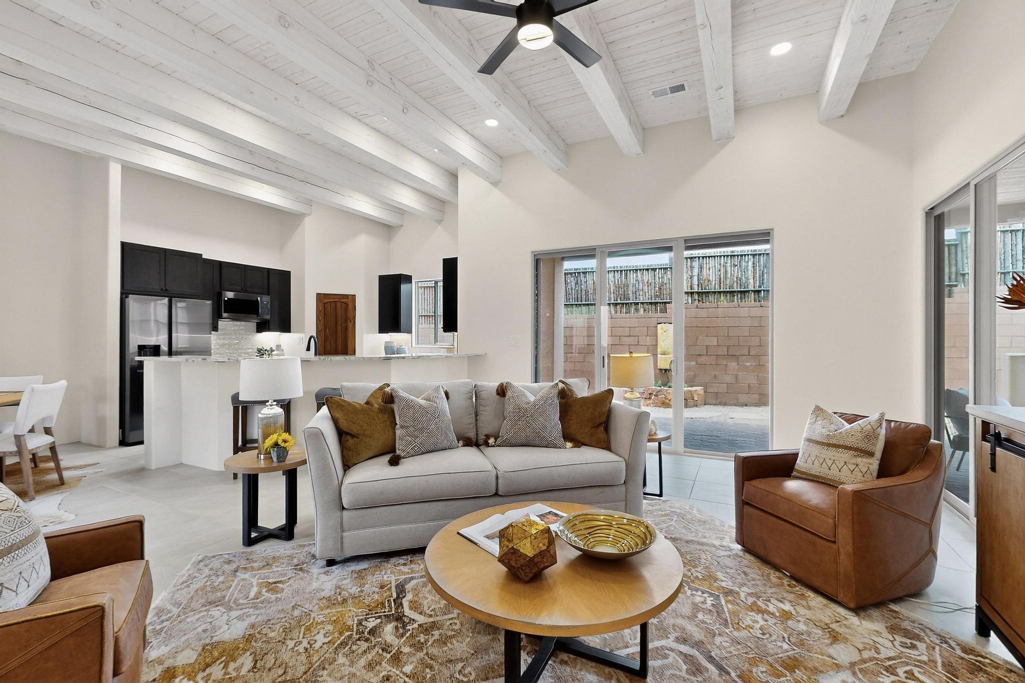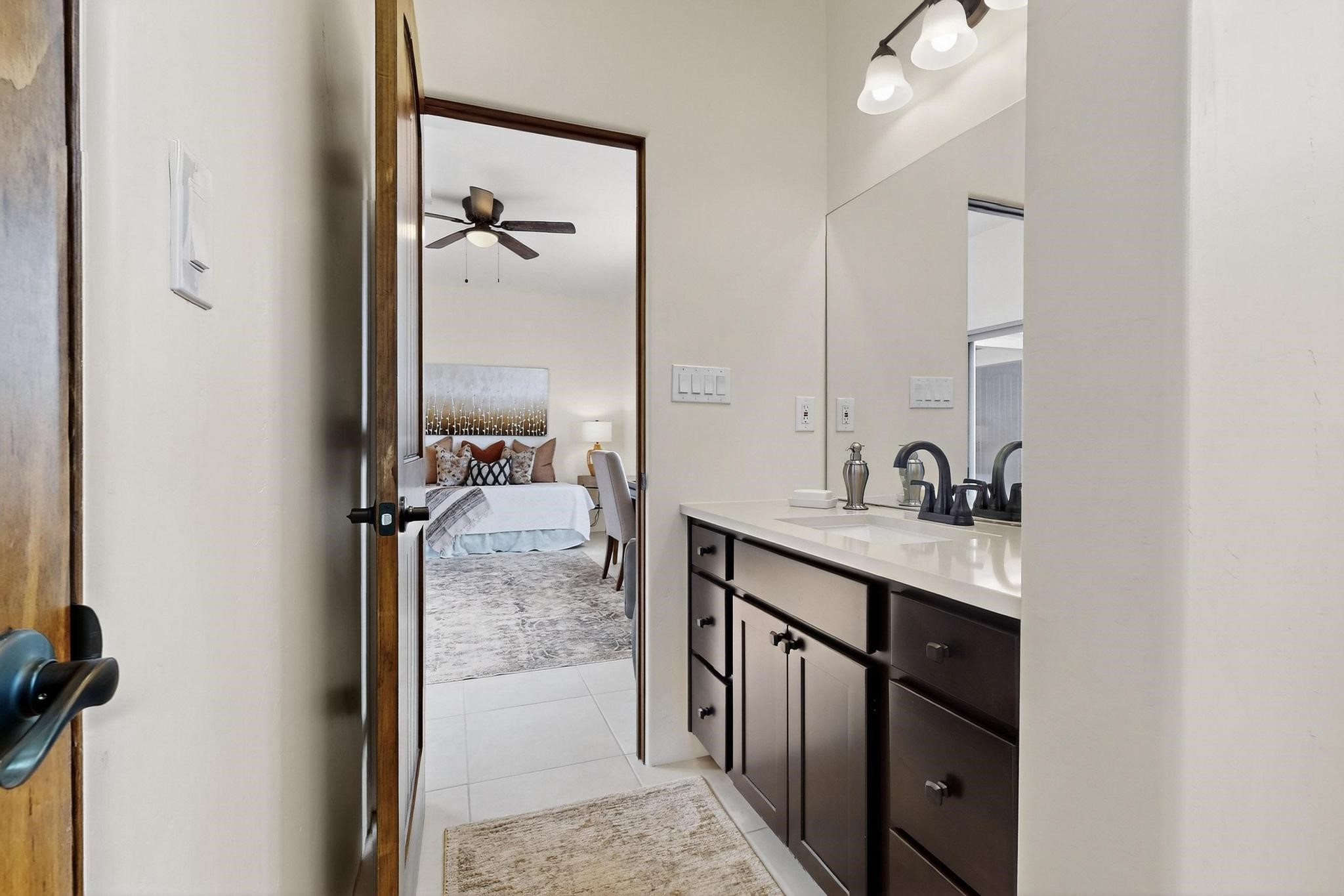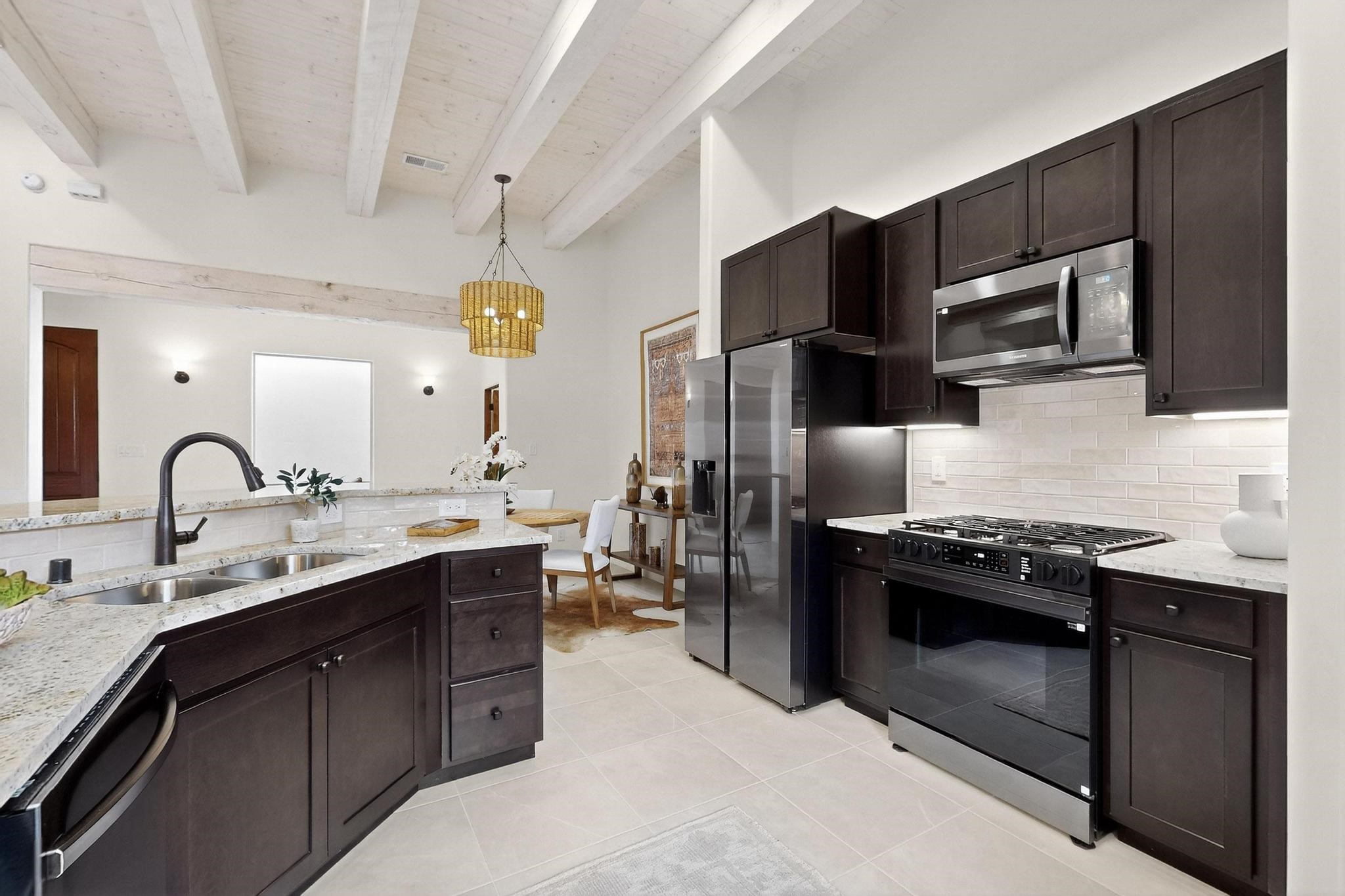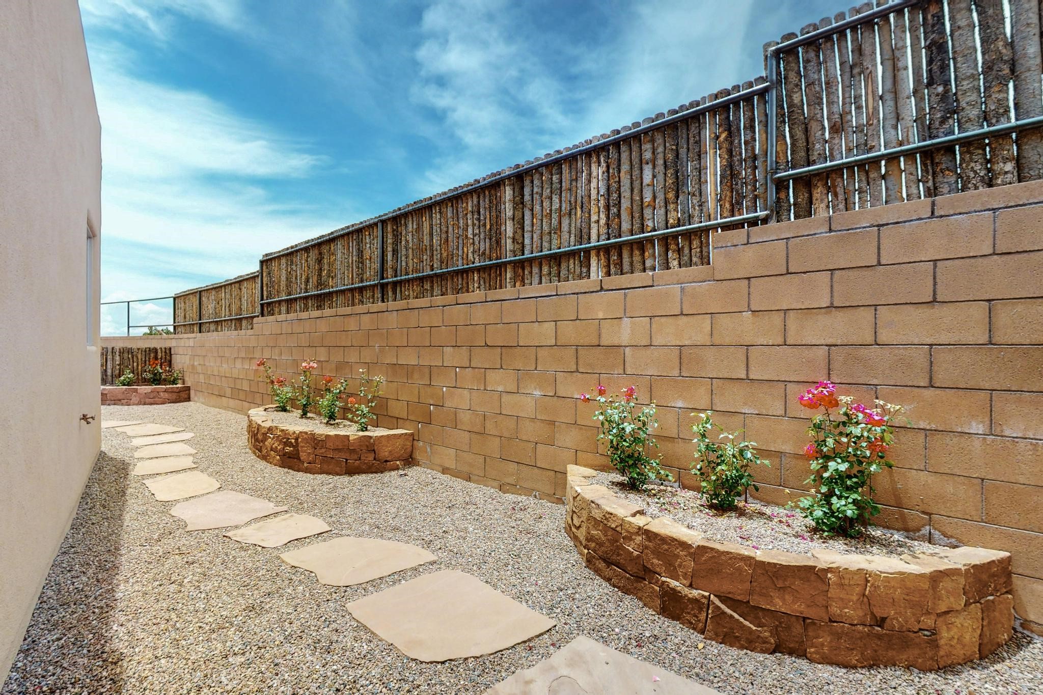 With a unique site plan and multiple pocket gardens and sitting areas,this delightful Zaguanita Plan with its rich and sophisticated colors is enteredthrough a lockable double-cedar and wrought iron gate into a covered entry (a"Zaguan") with brick pavers and an open private courtyard. To your left is aseparate living unit with a bedroom and three-quarter bath and its own HVAC unit, atankless hot water heater, tiled shower surrounds, ebony-colored cabinets withgrey quartz countertops, and a sink and an under-counter refrigerator. Themain entry leads to the formal entry with a lighted nicho and boveda ceiling. Tothe left is the owner's suite with a barn door entry to the master bath with alarge walk-in shower with euro-style shower fixtures and an overhead rainshower head. His-and-Hers closets are separated by a commode closet. Directlyahead of the entrance is the open living room with Pickling-white stained beamsand T&G planking offset with white quartz countertops, a kiva fireplace and anopen kitchen with an oversized counter. The kitchen and guest bedroom bothopen out to a covered portal that has a gas-fired kiva fireplace and brick pavers.To the right is the guest bedroom bath that can also serve as a powder room.The open kitchen has Smoked Gray color cabinets. All floors are tiled with lightgray porcelain planks. The exterior is a contemporary design with a TPO roof.The driveway is a colored stamped concrete design, and the insulated garageincludes an epoxy-coated floor.