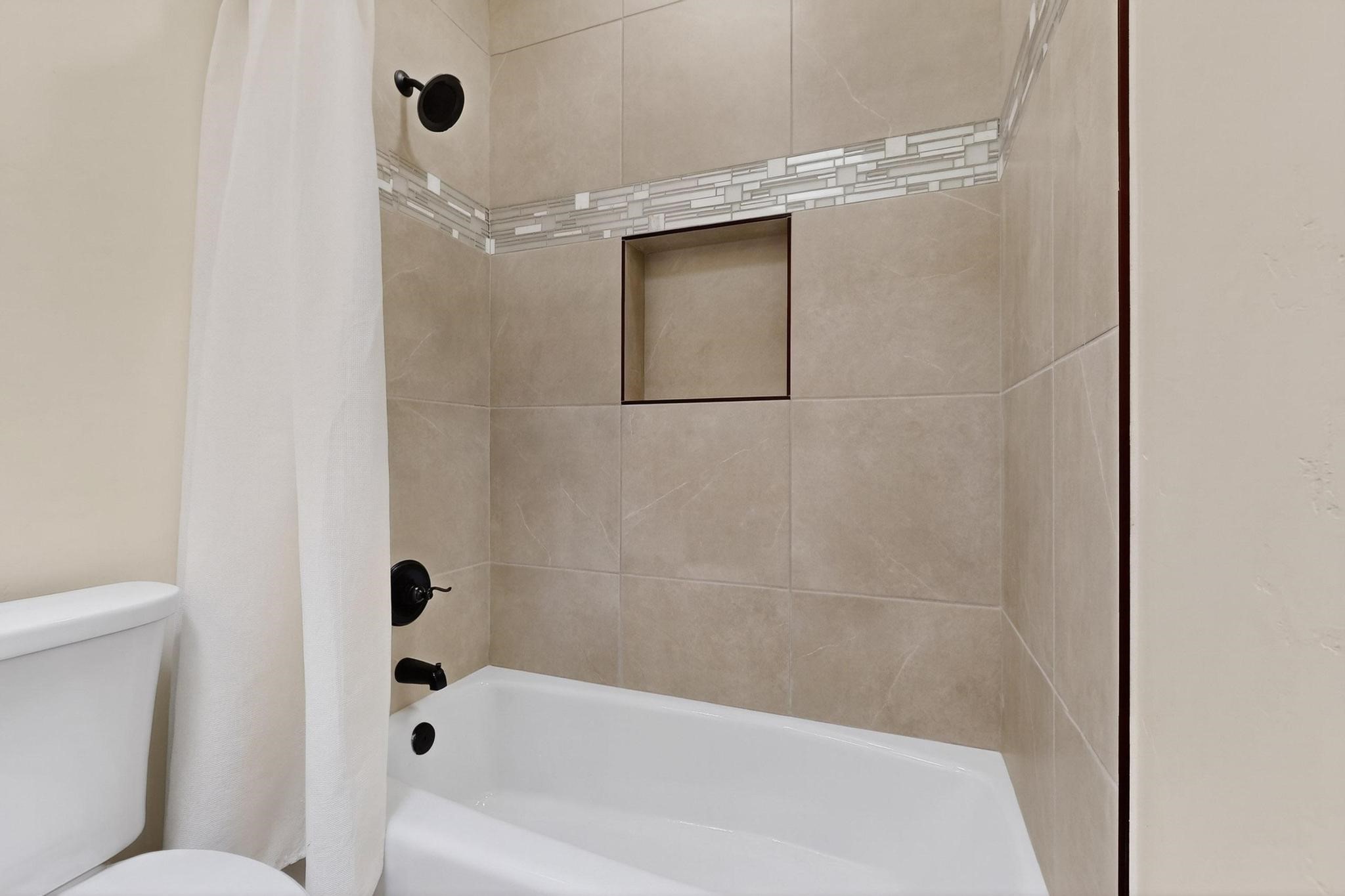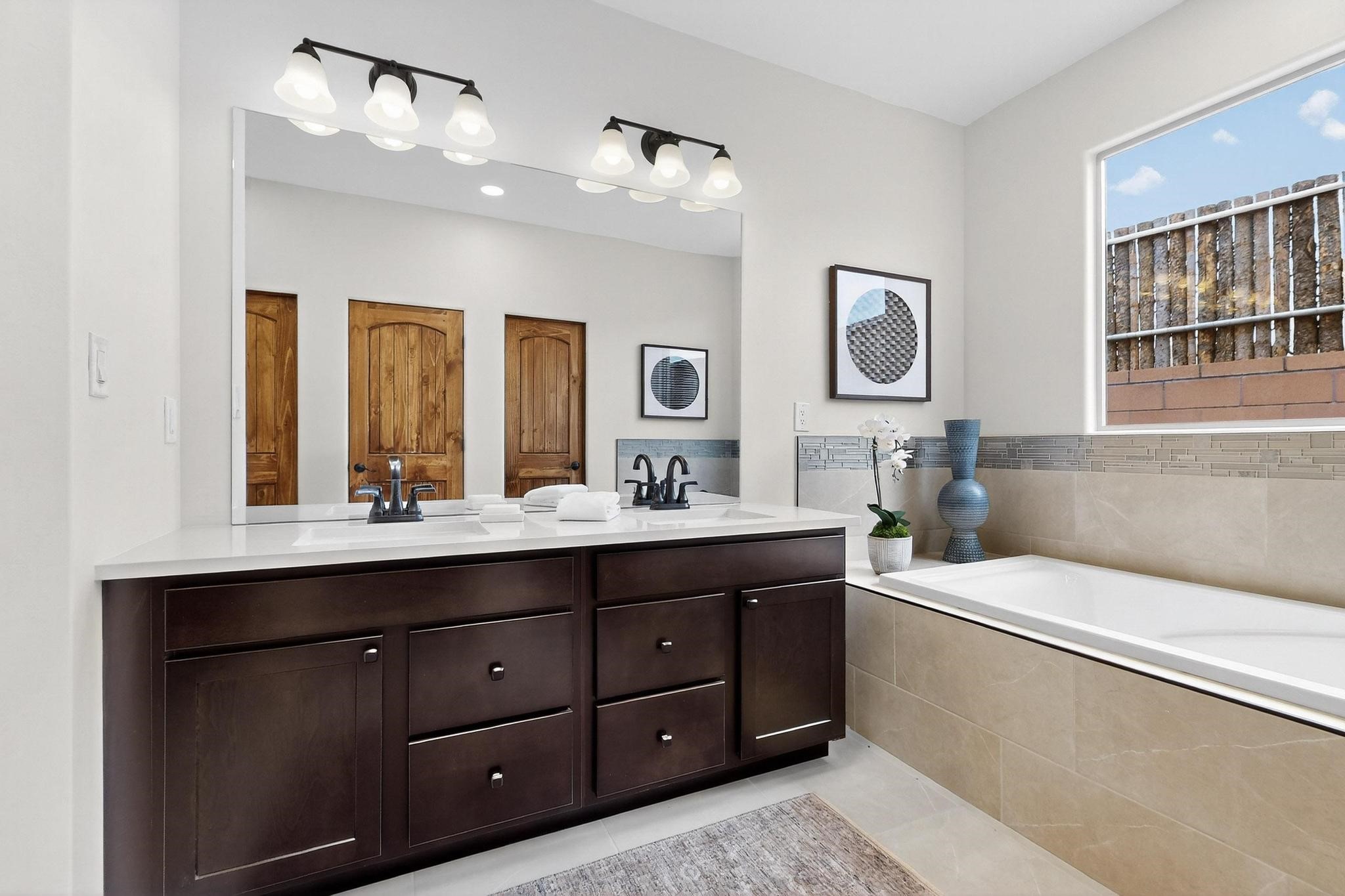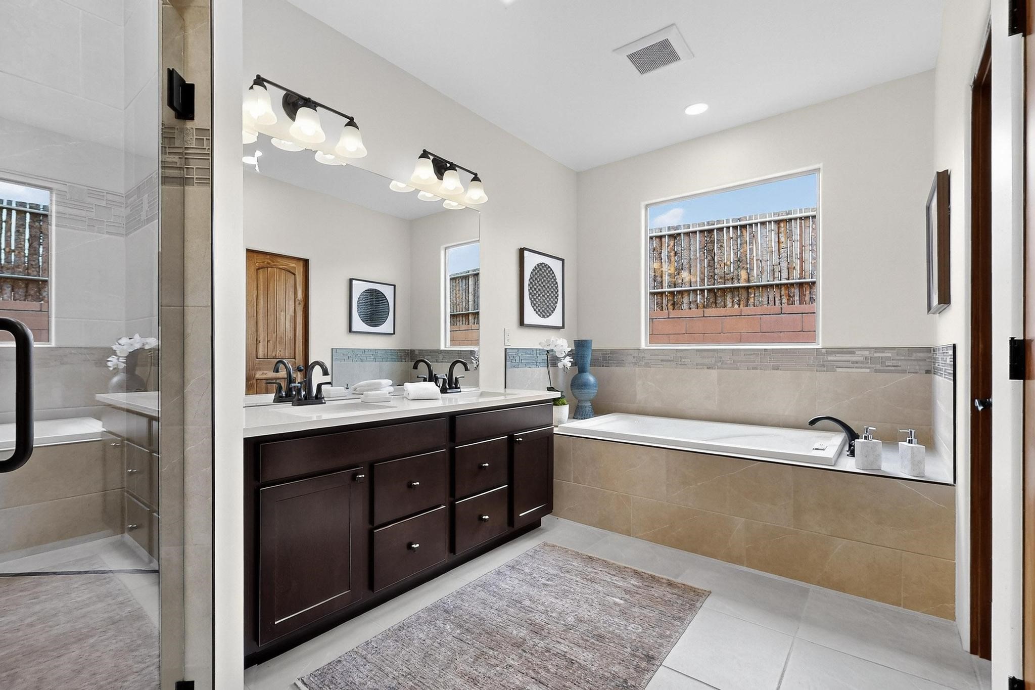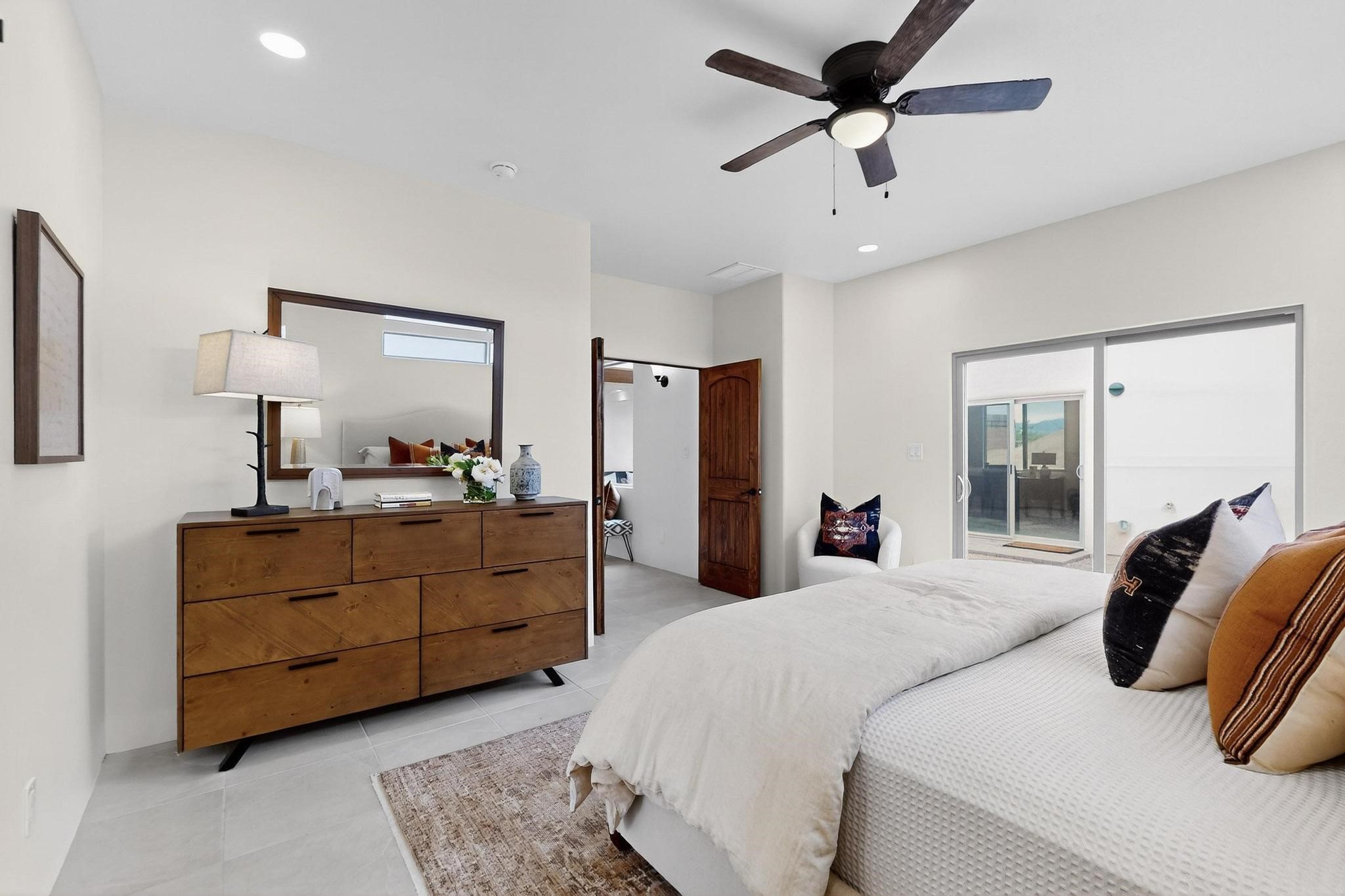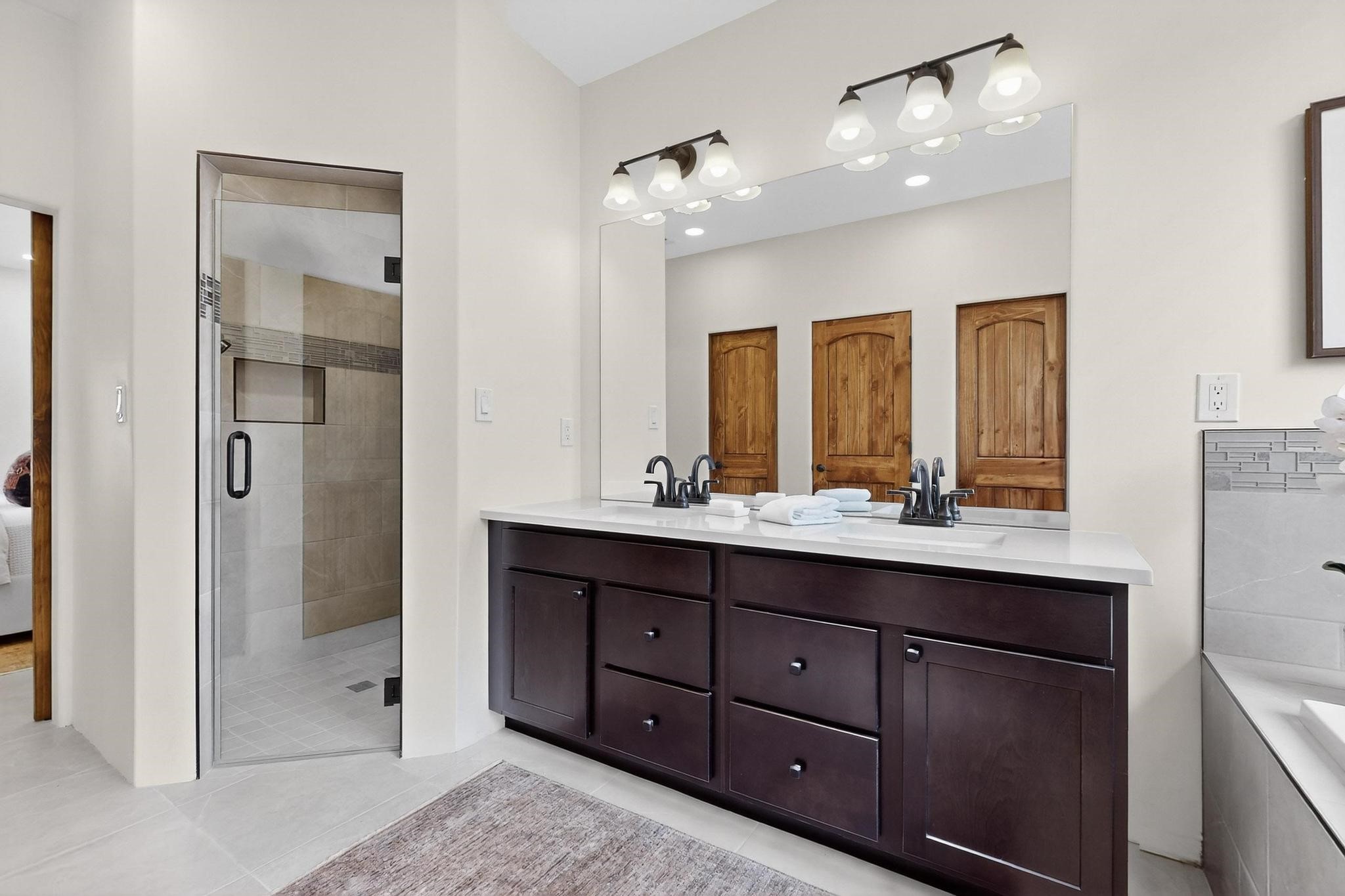 With a unique site plan and multiple pocket gardens and sitting areas,this delightful Zaguanita Plan with its rich and sophisticated colors is enteredthrough a lockable double-cedar and wrought iron gate into a covered entry (a"Zaguan") with brick pavers and an open private courtyard. To your left is aseparate living unit with a bedroom and three-quarter bath and its own HVAC unit, atankless hot water heater, tiled shower surrounds, ebony-colored cabinets withgrey quartz countertops, and a sink and an under-counter refrigerator. Themain entry leads to the formal entry with a lighted nicho and boveda ceiling. Tothe left is the owner's suite with a barn door entry to the master bath with alarge walk-in shower with euro-style shower fixtures and an overhead rainshower head. His-and-Hers closets are separated by a commode closet. Directlyahead of the entrance is the open living room with Pickling-white stained beamsand T&G planking offset with white quartz countertops, a kiva fireplace and anopen kitchen with an oversized counter. The kitchen and guest bedroom bothopen out to a covered portal that has a gas-fired kiva fireplace and brick pavers.To the right is the guest bedroom bath that can also serve as a powder room.The open kitchen has Smoked Gray color cabinets. All floors are tiled with lightgray porcelain planks. The exterior is a contemporary design with a TPO roof.The driveway is a colored stamped concrete design, and the insulated garageincludes an epoxy-coated floor.
