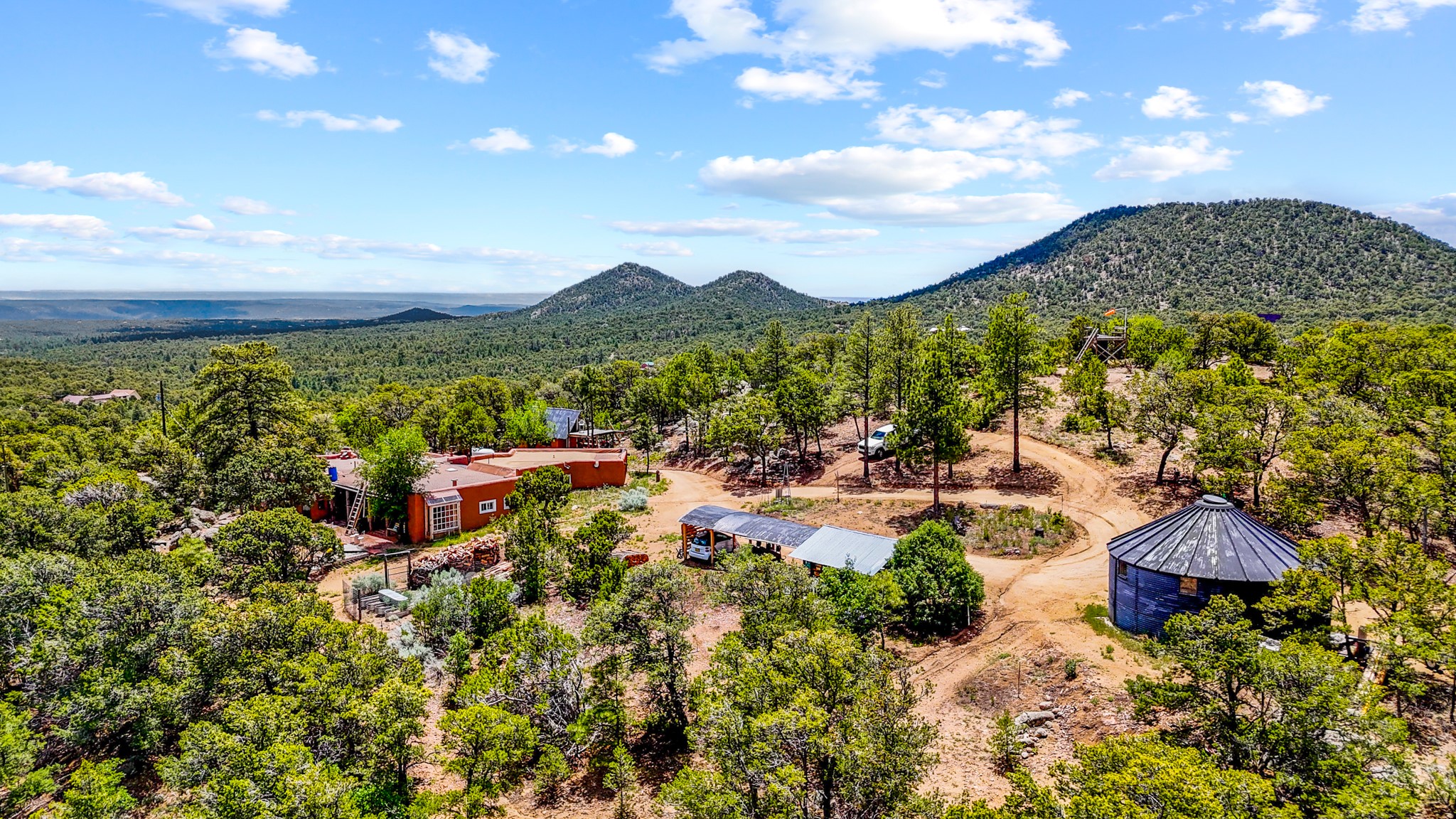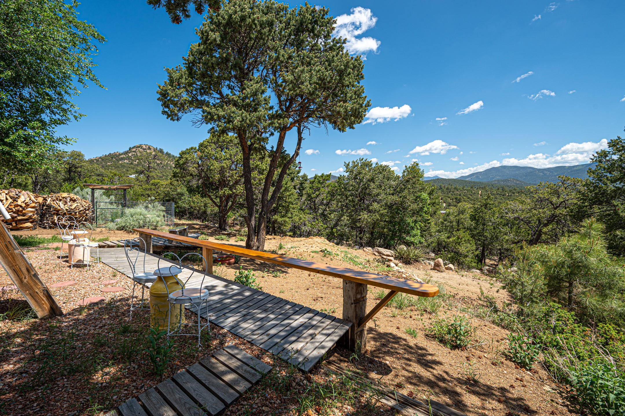 Set on 10 serene acres on the Old Santa Fe Trail and with striking mountain views, this unique 2-bedroom, 2.5-bath home offers space, versatility, and charm. Thoughtfully designed with high ceilings, custom woodwork, wood-burning fireplaces, and windows to capture the high desert terrain and fill the interiors with natural light, the open-concept living, kitchen, and dining areas create an inviting atmosphere. Additional workspace has been created with a built-ins and the bar/game room is sure to house many a fun night. The layout allows for an easy division into two one-bedroom units, presenting excellent rental income opportunities. Enjoy a peaceful lifestyle with whimsical gardens, a vibrant bar room, and a detached studio perfect for creative pursuits. A workshop with tools and a carport add function and value. The property features a private well, septic system, and can be divided into two 5-acre parcels for added potential. Located near Santa Fe's rail station, shopping at The Agora, and cultural destinations like Santa Fe Plaza only minutes away, this home blends rural tranquility with access to urban amenities--ideal for both full-time living or a flexible investment. **Details as provided by Sellers. See additional information in Broker Remarks and attached documents.
