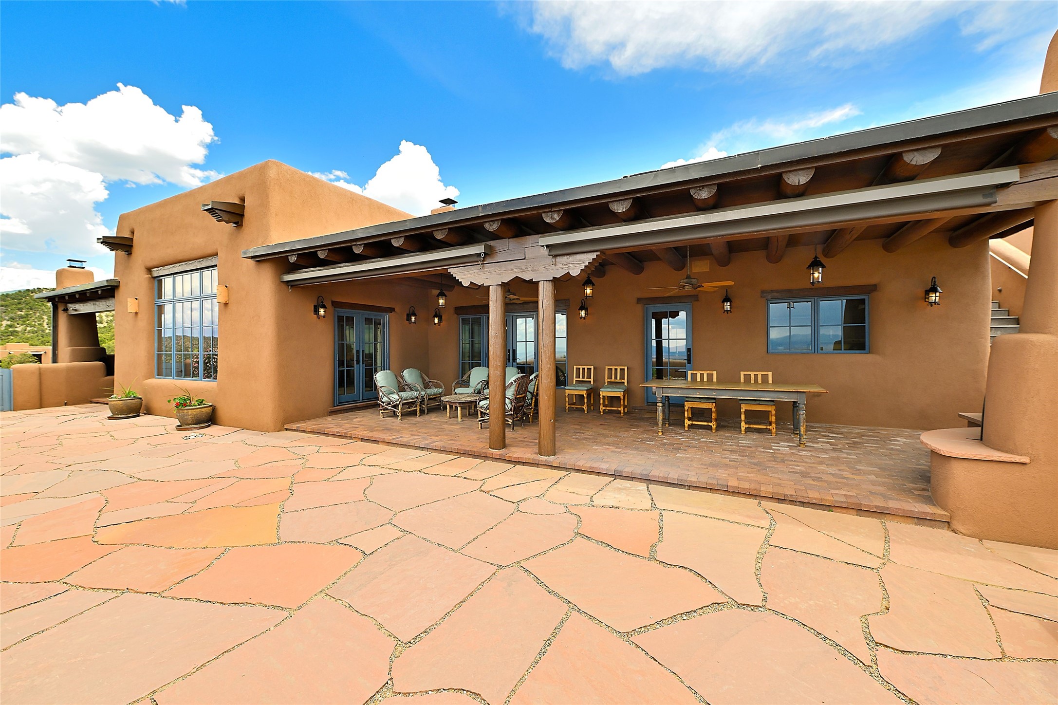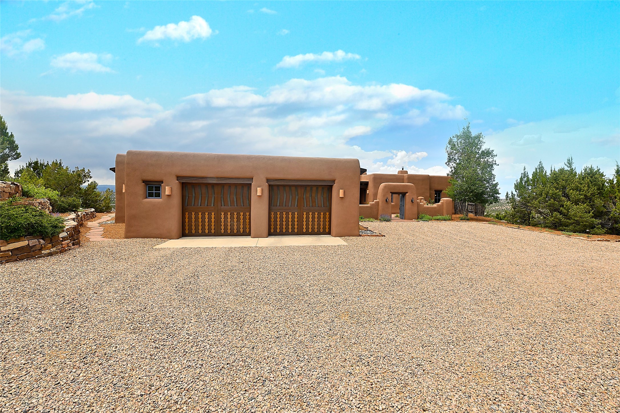 A true masterpiece of Spanish Pueblo architecture, this exceptional residence in Bishop's Lodge Hills is a stunning collaboration between acclaimed architect Ed Boniface and master builder Will Prull. Designed and constructed in 2007 for the current owner, with meticulous attention to detail, this home seamlessly blends traditional craftsmanship with modern luxury, all while capturing commanding views of the surrounding mountains and breathtaking sunsets. Upon entering the foyer, guests are enveloped in a space inspired by the sacred geometry of a Navajo Hogan, setting the tone for the rich architectural heritage woven throughout the home. The grand living room boasts soaring beamed ceilings supported by hand-carved corbels, while a striking fireplace design--borrowed from ancient traditions--serves as a warm and welcoming focal point. The formal dining area opens gracefully onto the Grand Portal, which leads to an expansive rooftop deck, offering panoramic vistas that define Santa Fe's unparalleled beauty. The chef's kitchen is a showpiece of authenticity and elegance, featuring antiqued custom cabinetry, classic tile countertops and custom carved backsplashes, and top-of-the-line Viking Stainless appliances. At its heart sits a black walnut-topped center island--both functional and visually stunning--complemented by an adjacent breakfast room that overlooks the walled entry courtyard, creating an intimate space for morning gatherings. The luxurious primary suite is a retreat unto itself, complete with a charming gas Kiva fireplace, two spa-like baths, and two walk-in closets. A separate office, situated within the primary wing, provides the perfect setting for focus and creativity. On the opposite wing, comfortable guest suites ensure privacy and tranquility, making this home an ideal sanctuary for both residents and visitors alike. Every aspect of this home's design and construction reflects an extraordinary commitment to craftsmanship, authenticity, and architectural excellence.