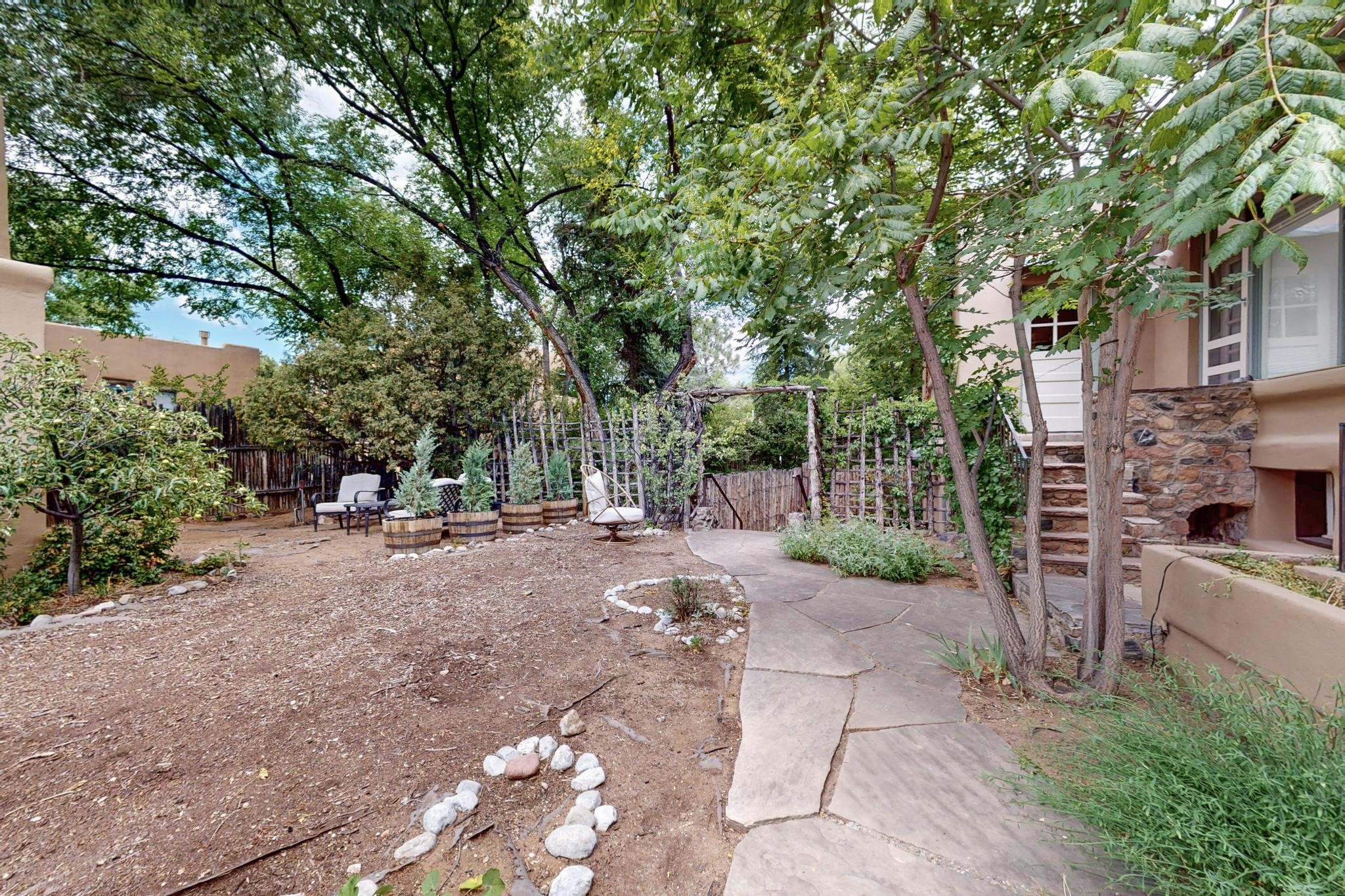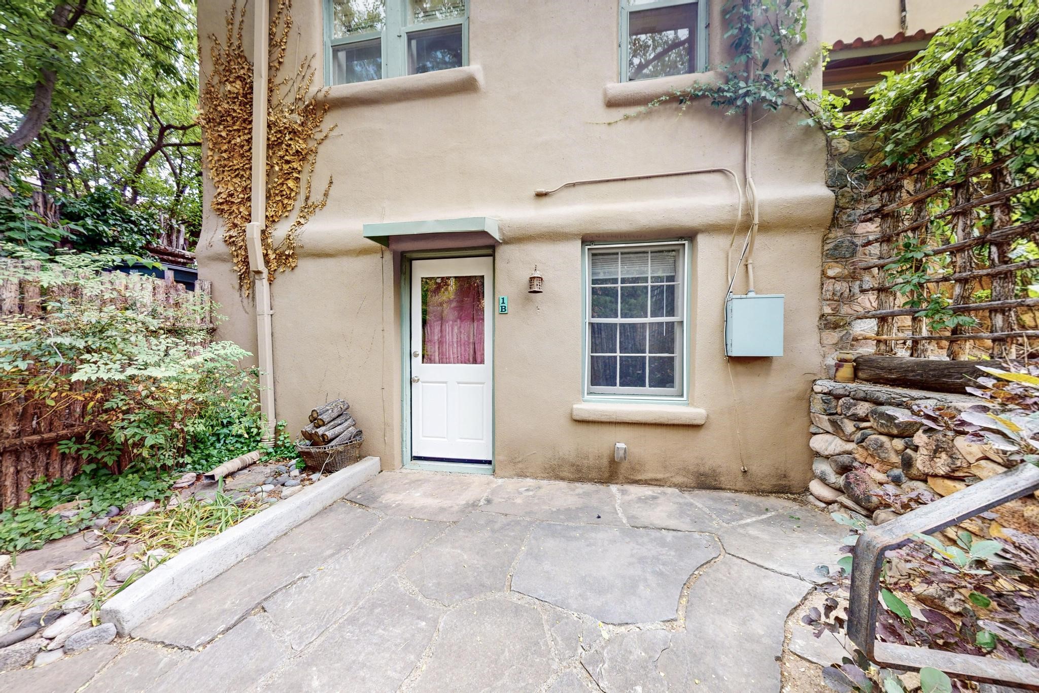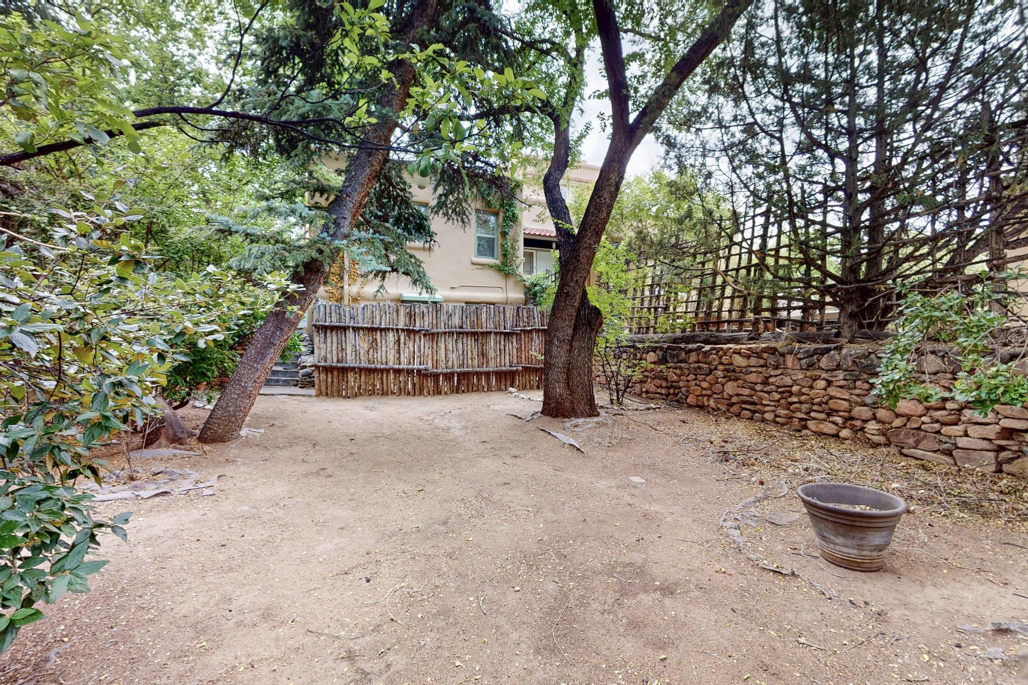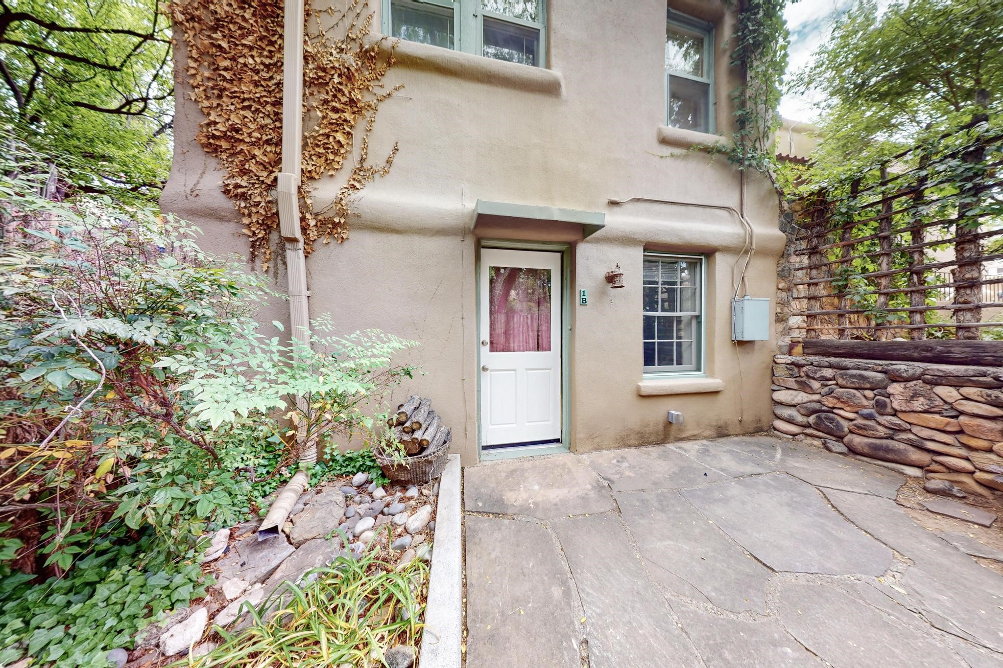 Bright Beautiful Condo with Casita in desirable South Capital in a beautiful small compound with mature trees and close proximity to the Plaza. This former residence was built in 1940 and has been converted into condos consisting of five units. These two units offer so many possibilities, live in one and rent the other, use one as for guests when they visit, or to have a parent close by. A very good price when divided by two units in the desirable South Capital. The main Condo 1A, 1 Bd, 1 bath, welcomes you as you enter through the french doors into a bright large living room with tall windows, wood floors, hand-hewn beams and a grand fireplace. The adorable kitchen has a country copper sink, granite countertop, lively deep red lower cabinets and light wood upper cabinets. Casita 1B, 1 bd, 1 bath has painted wood floors, an impressive fireplace, charming kitchen, and separate entrance. Each unit has its own private courtyard, they are the only ones in the compound that have this feature. This rare opportunity should not be missed. HOA fees include all utilities for both units, Electric, gas, water, maintenance, landscaping and insurance, the amount varies based on usage etc and is billed every 6 months.