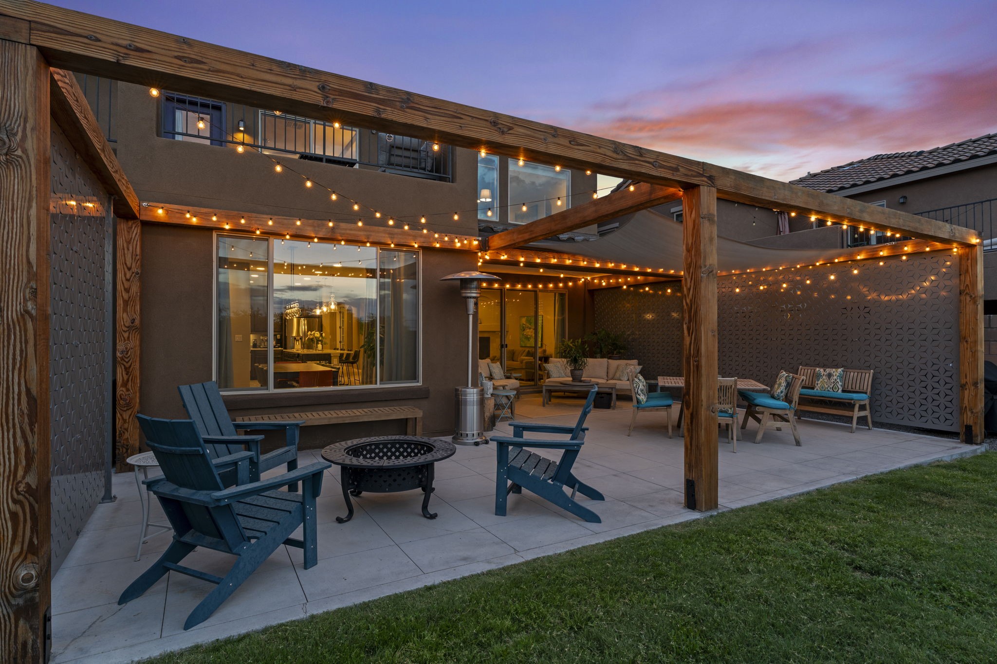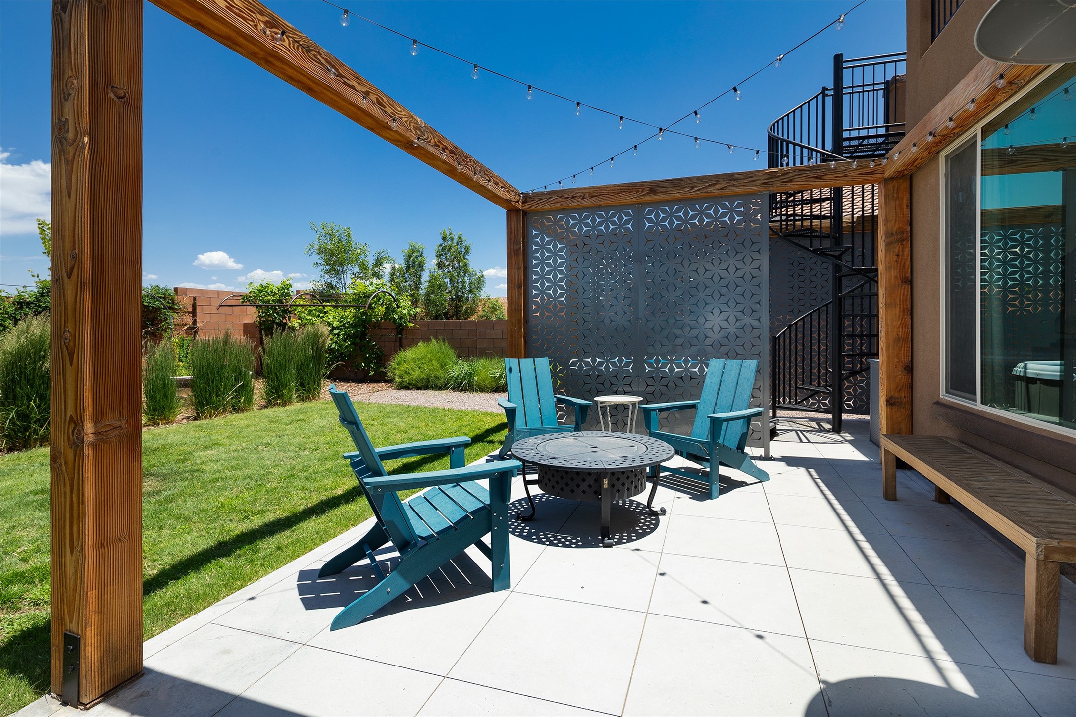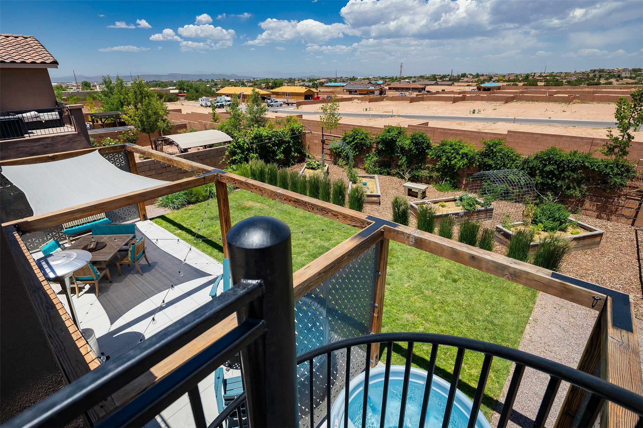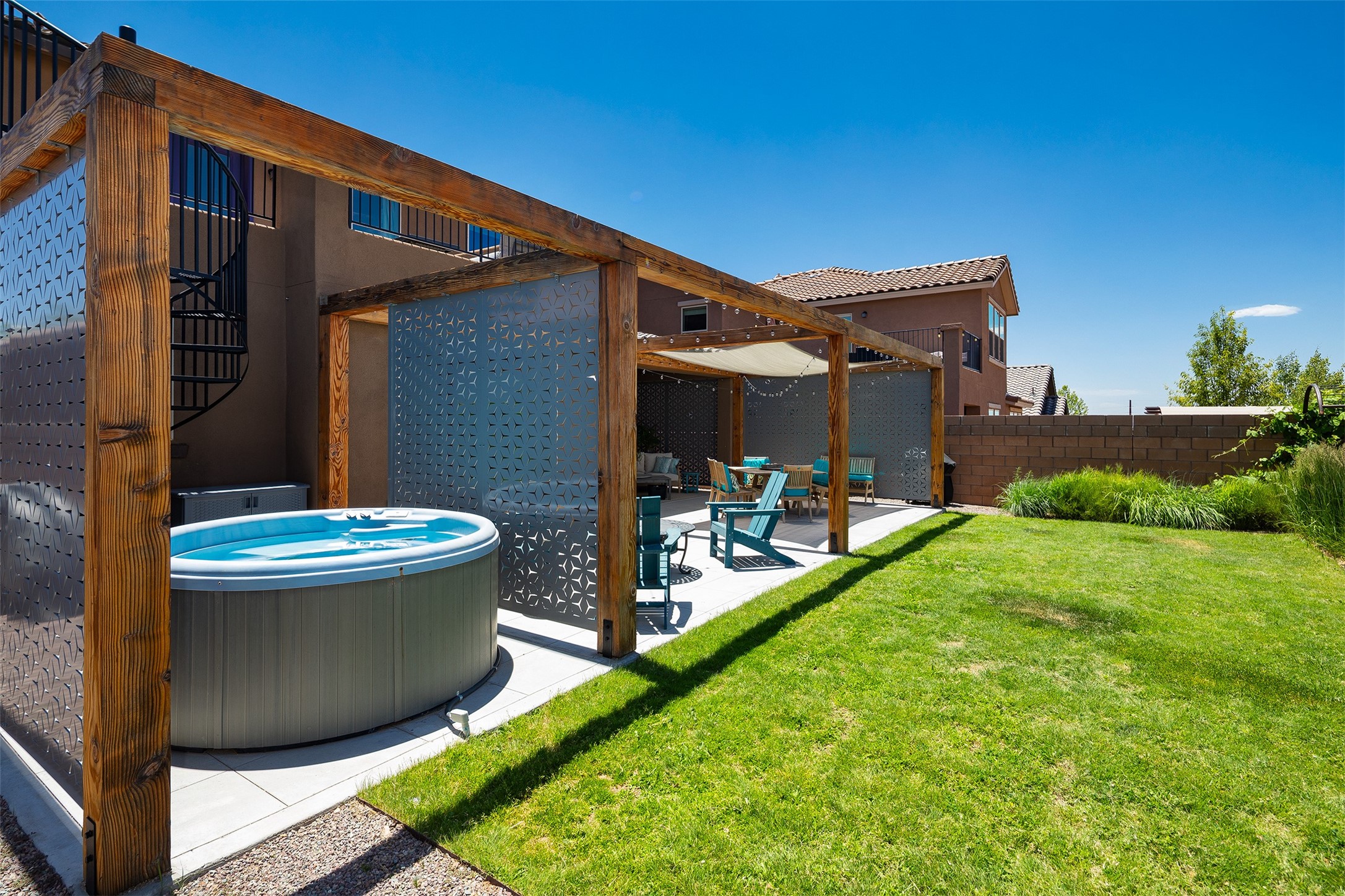 This fine home dazzles under the sure hand of its designer owner. The floorplan is a deft blend of elegance and comfort. Its light, open feel includes defined yet versatile spaces that serve a range of lifestyle needs. On the first floor is a bedroom with ensuite bath. The handsome Cook's Kitchen, with quartz countertops, stainless steel appliances, and adjacent Butler's pantry/office, overlooks the chic living area, with fireplace. The dining room feels at once spacious and intimate. Both living and dining rooms open to the splendid backyard with arching grape vines, a trellised wall of trumpet vines, sprays of ornamental grass, a stretch of turf, raised beds and a newer hot tub. A spiral staircase connects this enchanting oasis with the upper deck, off the Primary Bedroom, with long range views of several mountain ranges. The second story's flexible layout includes a large den or office, a sizable craft room, and two additional bedrooms. Come experience this inviting Las Soleras home, conveniently located close to Presbyterian Hospital, shopping, restaurants and major transportation routes.