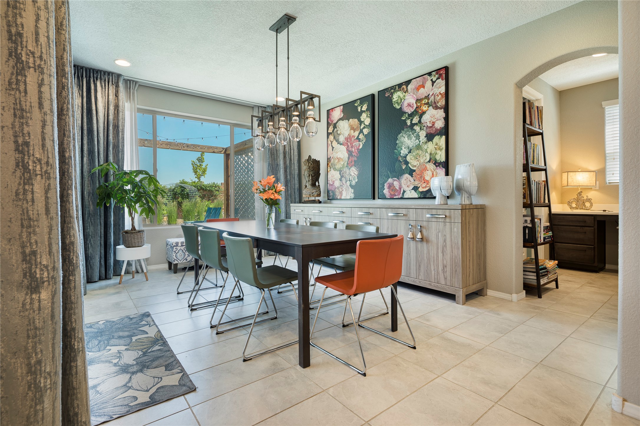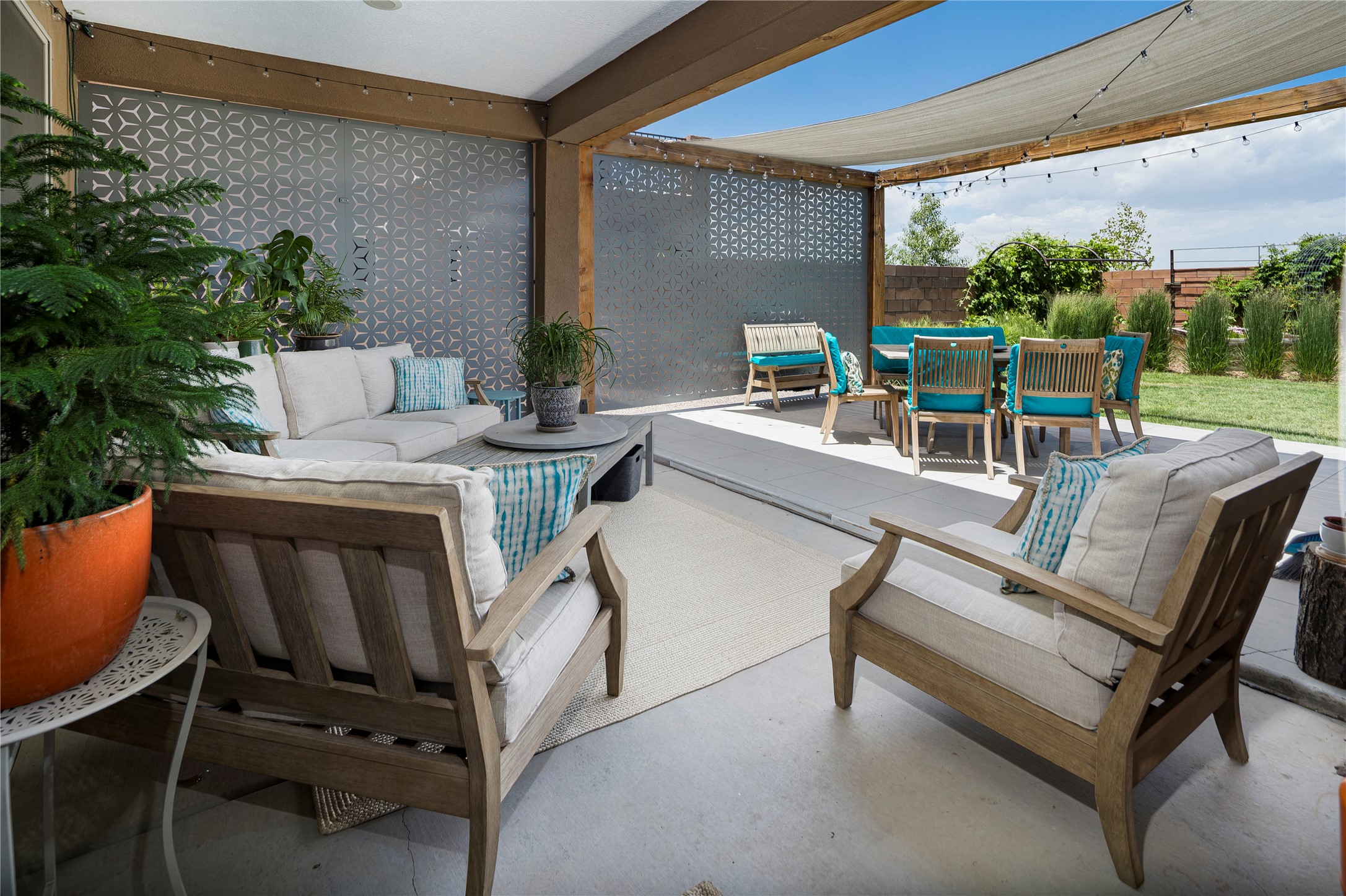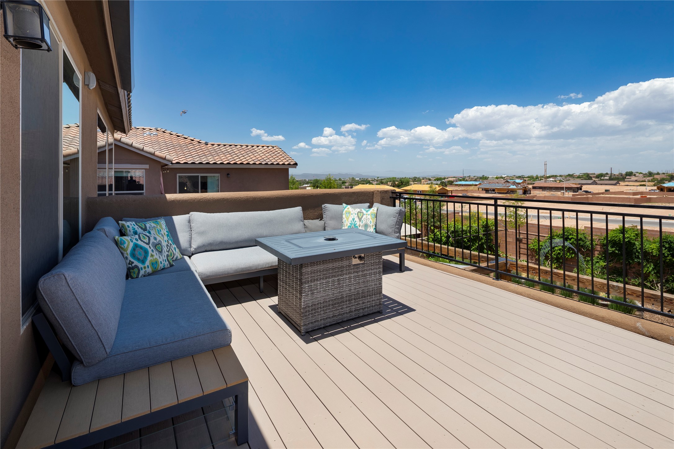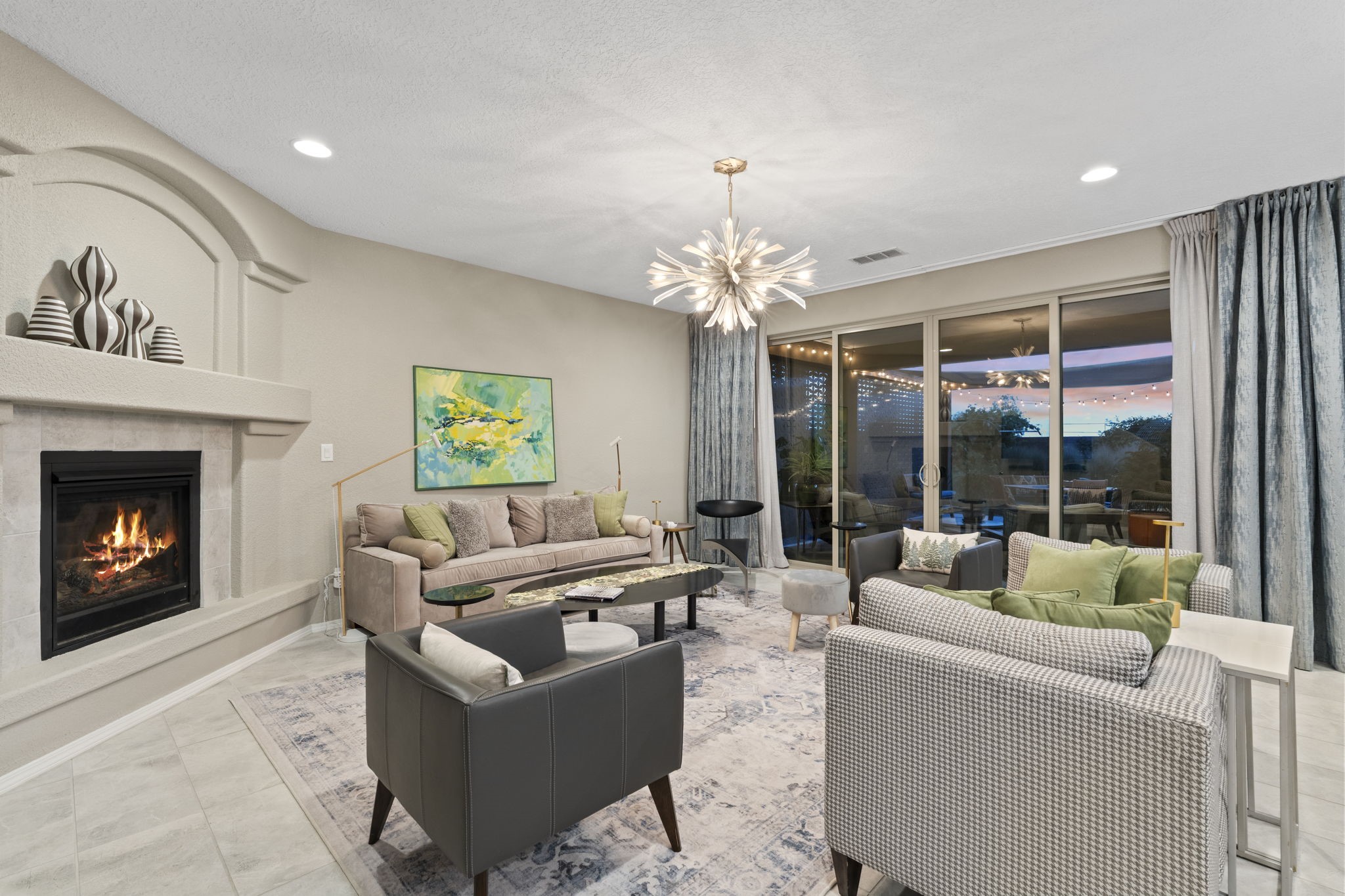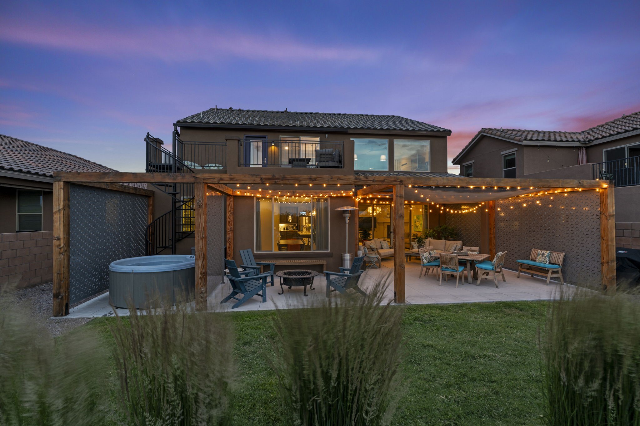 This fine home dazzles under the sure hand of its designer owner. The floorplan is a deft blend of elegance and comfort. Its light, open feel includes defined yet versatile spaces that serve a range of lifestyle needs. On the first floor is a bedroom with ensuite bath. The handsome Cook's Kitchen, with quartz countertops, stainless steel appliances, and adjacent Butler's pantry/office, overlooks the chic living area, with fireplace. The dining room feels at once spacious and intimate. Both living and dining rooms open to the splendid backyard with arching grape vines, a trellised wall of trumpet vines, sprays of ornamental grass, a stretch of turf, raised beds and a newer hot tub. A spiral staircase connects this enchanting oasis with the upper deck, off the Primary Bedroom, with long range views of several mountain ranges. The second story's flexible layout includes a large den or office, a sizable craft room, and two additional bedrooms. Come experience this inviting Las Soleras home, conveniently located close to Presbyterian Hospital, shopping, restaurants and major transportation routes.