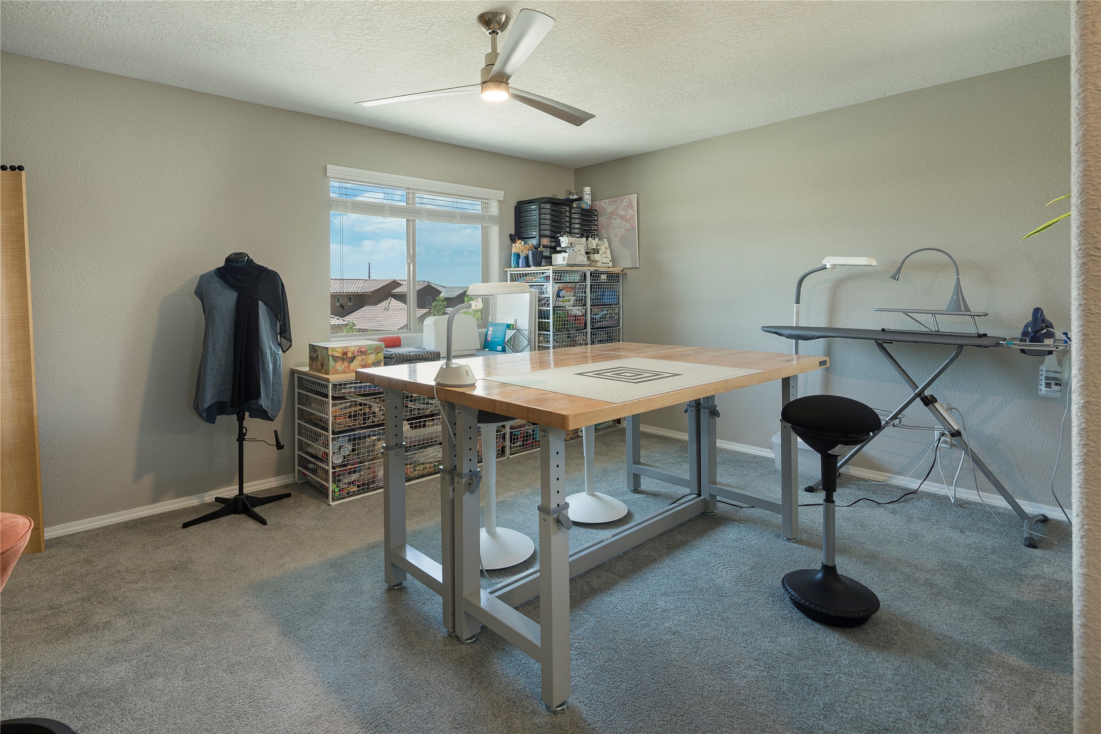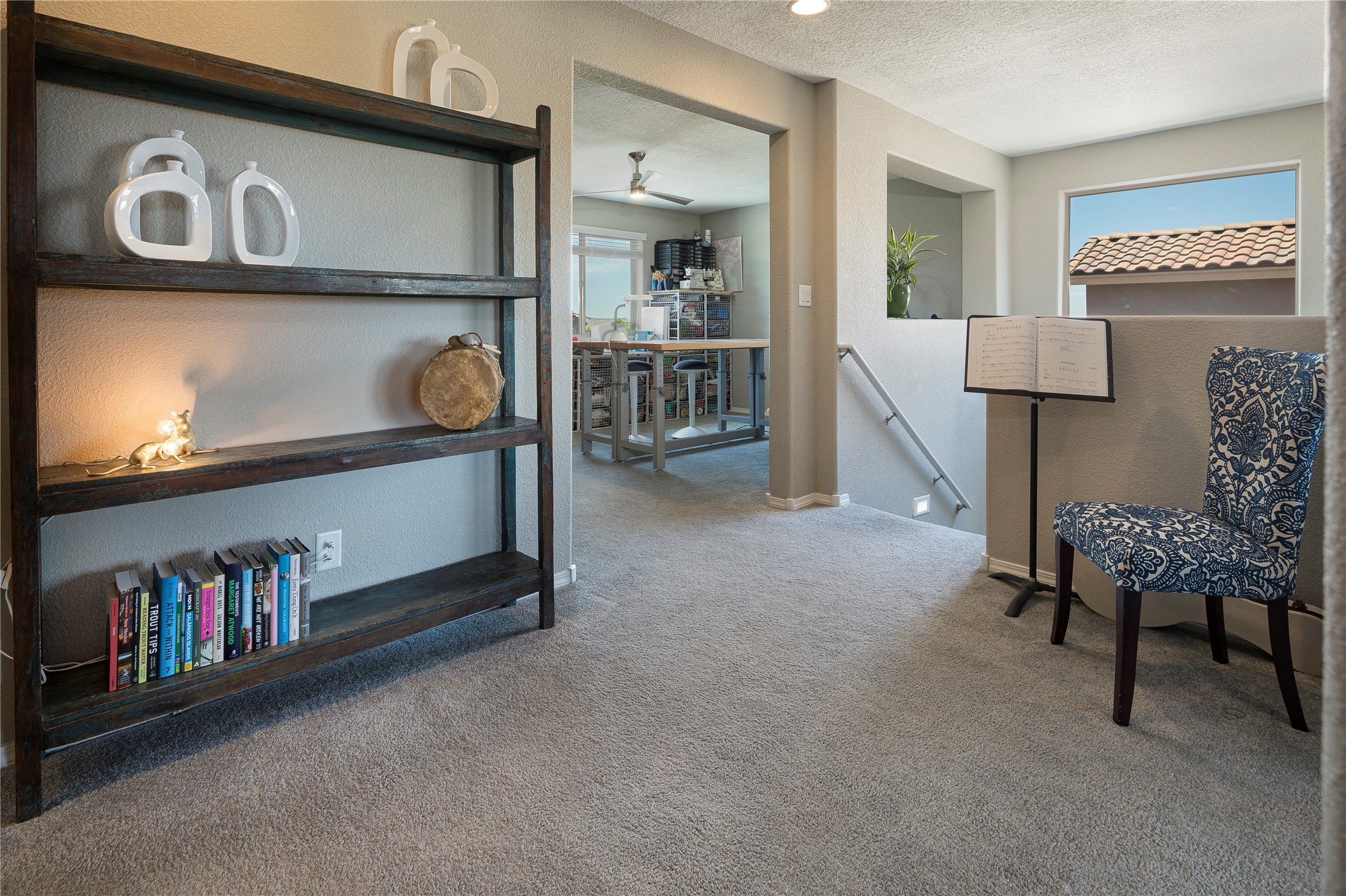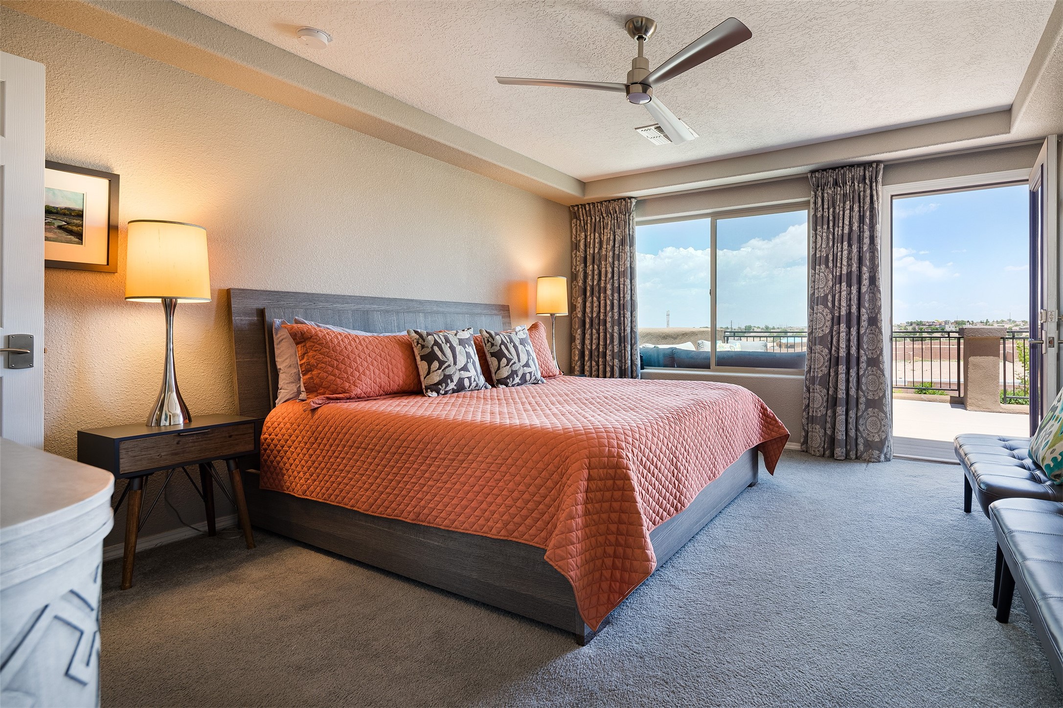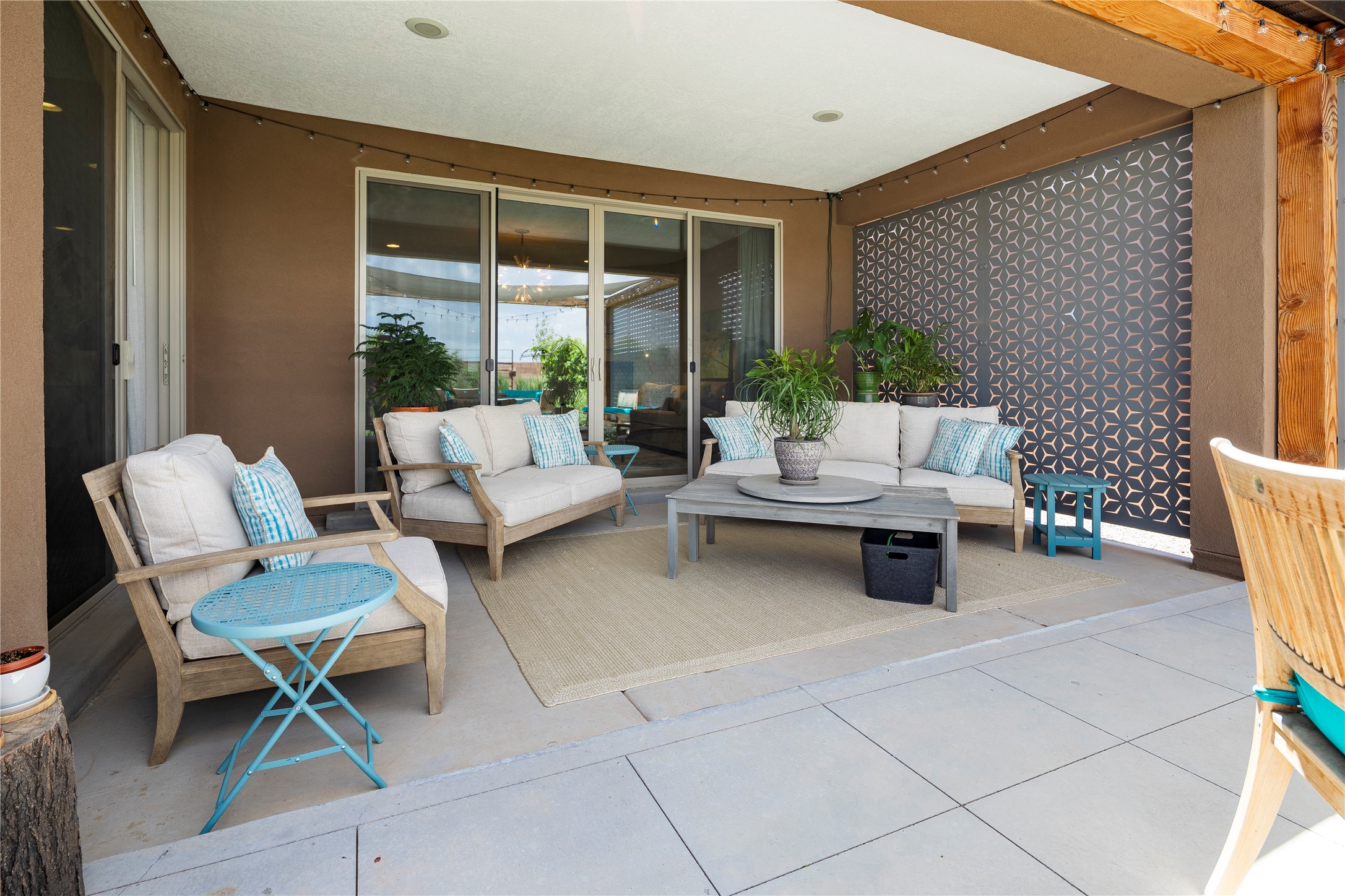 This fine home dazzles under the sure hand of its designer owner. The floorplan is a deft blend of elegance and comfort. Its light, open feel includes defined yet versatile spaces that serve a range of lifestyle needs. On the first floor is a bedroom with ensuite bath. The handsome Cook's Kitchen, with quartz countertops, stainless steel appliances, and adjacent Butler's pantry/office, overlooks the chic living area, with fireplace. The dining room feels at once spacious and intimate. Both living and dining rooms open to the splendid backyard with arching grape vines, a trellised wall of trumpet vines, sprays of ornamental grass, a stretch of turf, raised beds and a newer hot tub. A spiral staircase connects this enchanting oasis with the upper deck, off the Primary Bedroom, with long range views of several mountain ranges. The second story's flexible layout includes a large den or office, a sizable craft room, and two additional bedrooms. Come experience this inviting Las Soleras home, conveniently located close to Presbyterian Hospital, shopping, restaurants and major transportation routes.