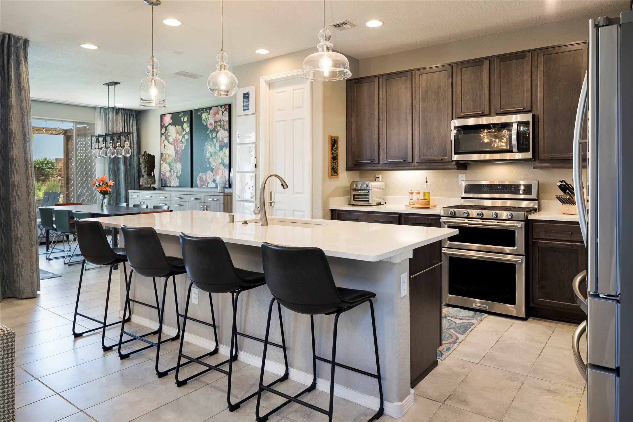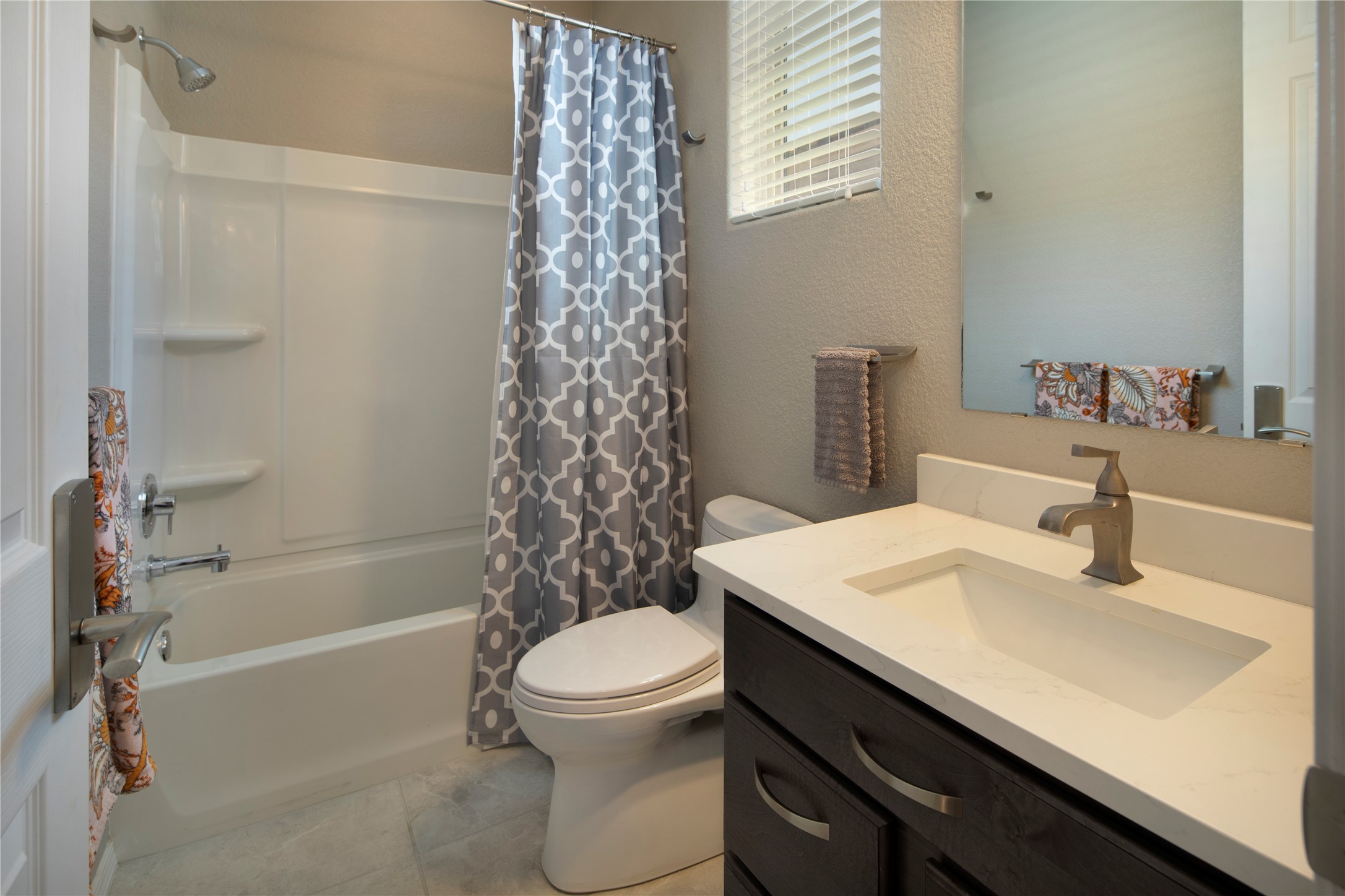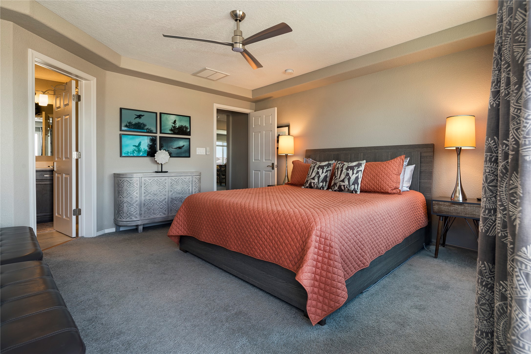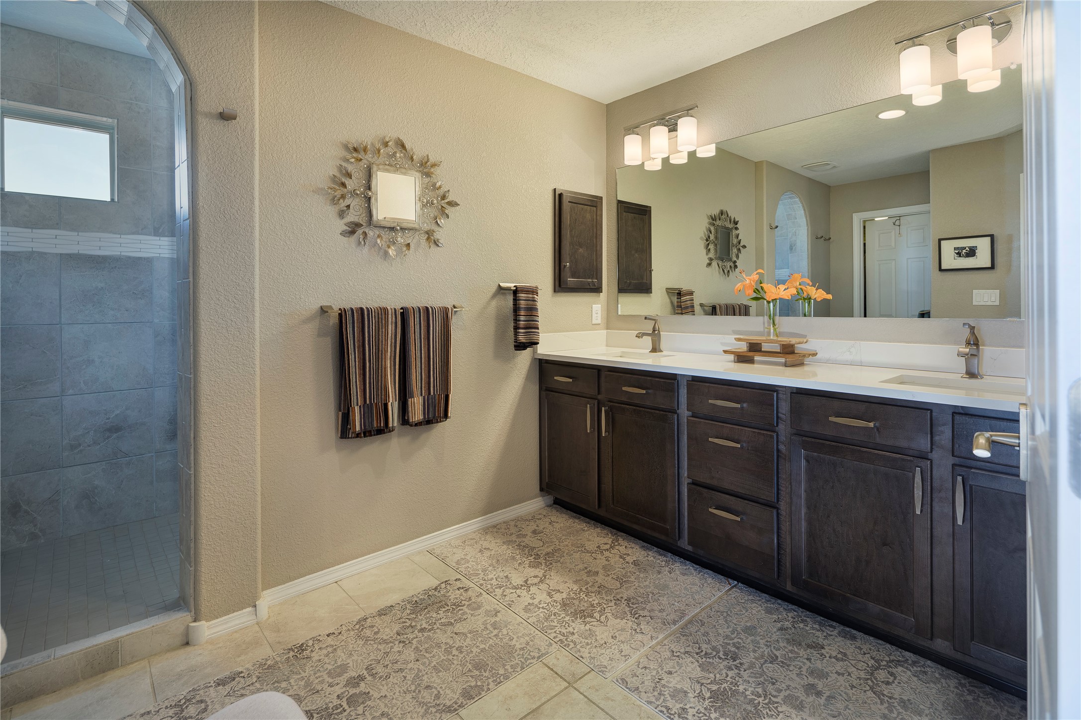 This fine home dazzles under the sure hand of its designer owner. The floorplan is a deft blend of elegance and comfort. Its light, open feel includes defined yet versatile spaces that serve a range of lifestyle needs. On the first floor is a bedroom with ensuite bath. The handsome Cook's Kitchen, with quartz countertops, stainless steel appliances, and adjacent Butler's pantry/office, overlooks the chic living area, with fireplace. The dining room feels at once spacious and intimate. Both living and dining rooms open to the splendid backyard with arching grape vines, a trellised wall of trumpet vines, sprays of ornamental grass, a stretch of turf, raised beds and a newer hot tub. A spiral staircase connects this enchanting oasis with the upper deck, off the Primary Bedroom, with long range views of several mountain ranges. The second story's flexible layout includes a large den or office, a sizable craft room, and two additional bedrooms. Come experience this inviting Las Soleras home, conveniently located close to Presbyterian Hospital, shopping, restaurants and major transportation routes.