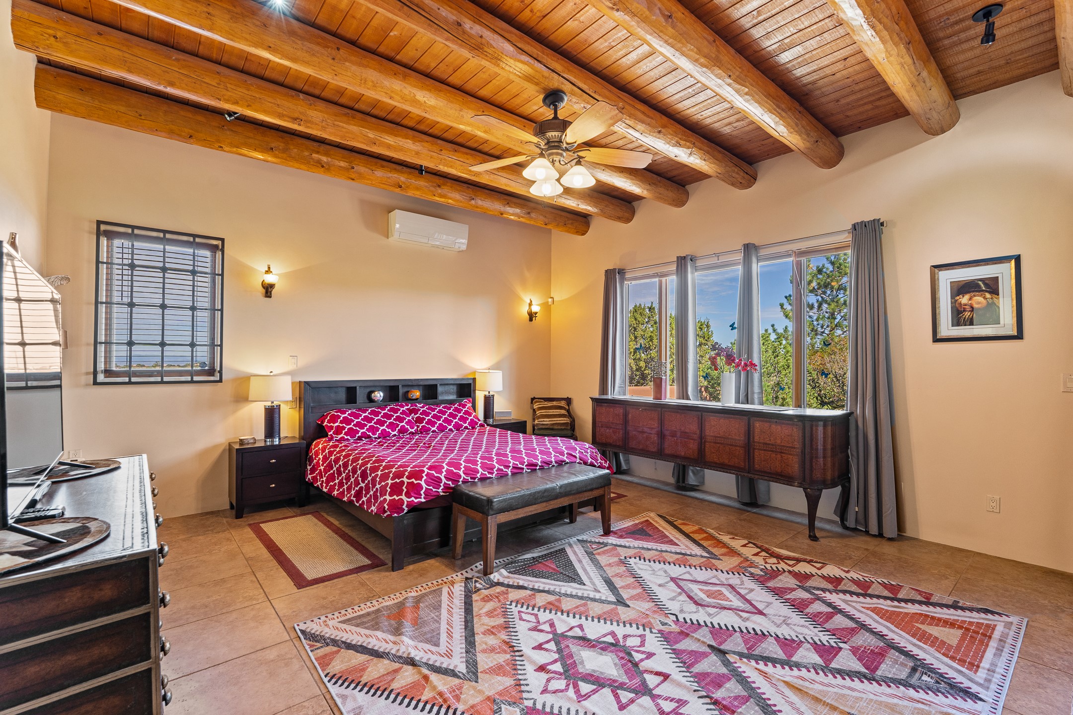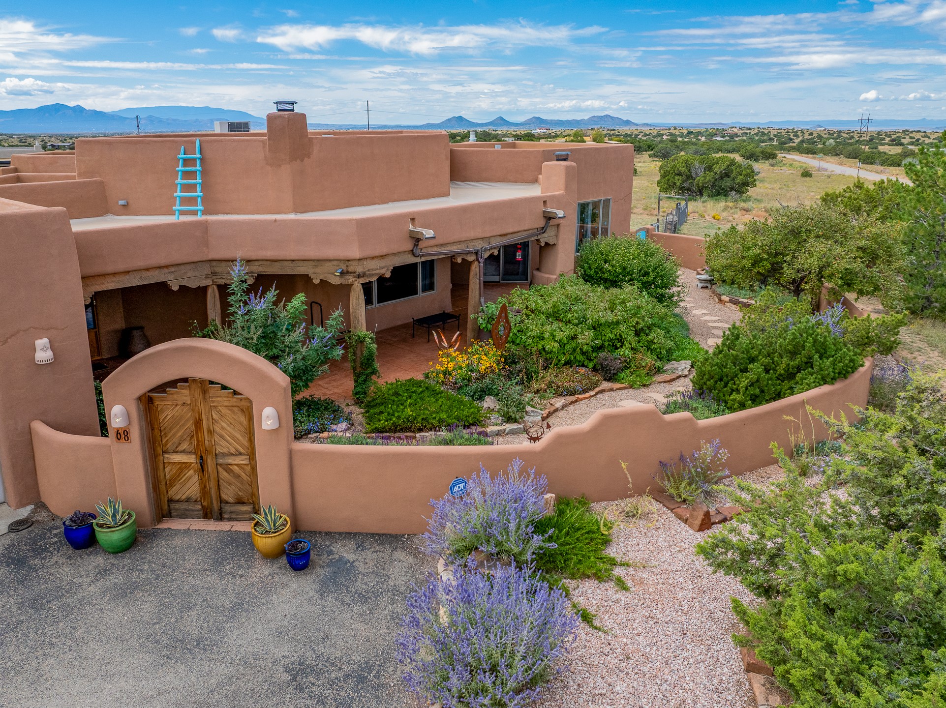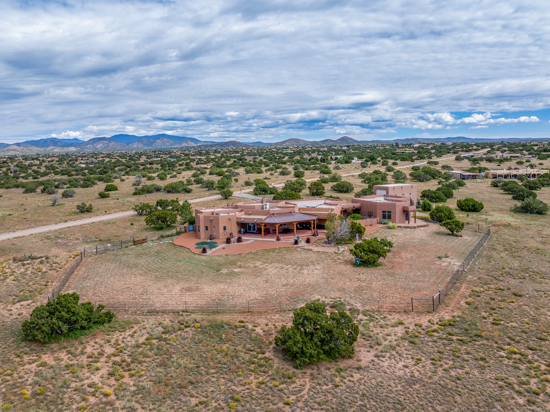 Wishing for a HOUSE/GUESTHOUSE/and a 5-CAR GARAGE with an additional RV GARAGE on 5 acres? Your wish has been granted! Just 20 minutes from downtown Santa Fe, this beautifully sited single-level property offers sweeping mountain views, abundant garage space, and classic regional charm. The 5-acre parcel (with acre fenced) includes a 2,548 sq. ft. 3BD/2.5BA main residence and a connected 698 sq. ft. 1BD/1BA guest house--ideal for guests and flexible use.The property features an attached/heated 3-car garage, an attached 2-car garage (connected to the guest house), and a heated/cooled RV garage, perfect for a hobbyist, car enthusiast or artist! The main residence captures expansive views of the Sangre de Cristo, Jemez, and Ortiz mountain ranges from a deep East-facing portal and a new 900 sq. ft. West-facing portal. The living room features a custom plastered and hand-painted kiva fireplace and beautifully hand-carved corbels. The kitchen is outfitted with granite countertops, a 6-burner Wolf range with a potfiller, two ovens (one convection microwave), warming drawer, a KitchenAid refrigerator, and an extra dual temp beverage refrigerator. The kitchen island has a second sink and seating for three. The breakfast bar with seating for 2 or 3 persons, creates an open flow to the dining area. The private primary suite enjoys a sitting area, east portal access, two walk-in closets, a soaking tub beside a gas fireplace, and a walk-in shower. The 2 guest bedrooms share a bathroom and have excellent separation from the main living areas. A breezeway connects the guest house, which enjoys its own patio and a beautifully maintained vegetable garden--perfect for those wanting to grow fresh greens. Additional features include in-floor radiant heating, natural gas, 8 mini-splits, Eldorado community water. Horses are also allowed. A rare opportunity for peaceful country living with city conveniences--this home blends beauty, functionality, and flexibility in one stunning package.