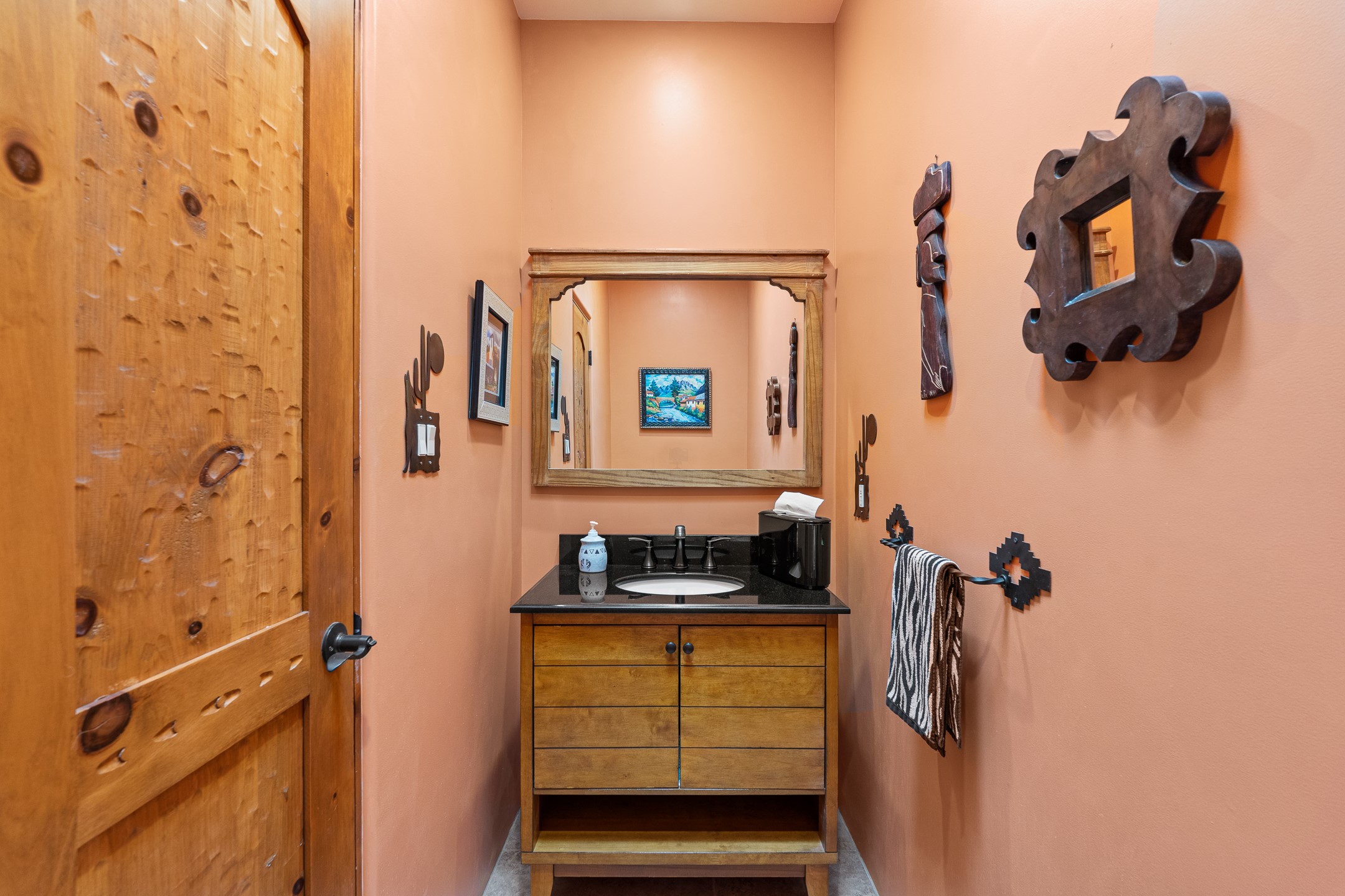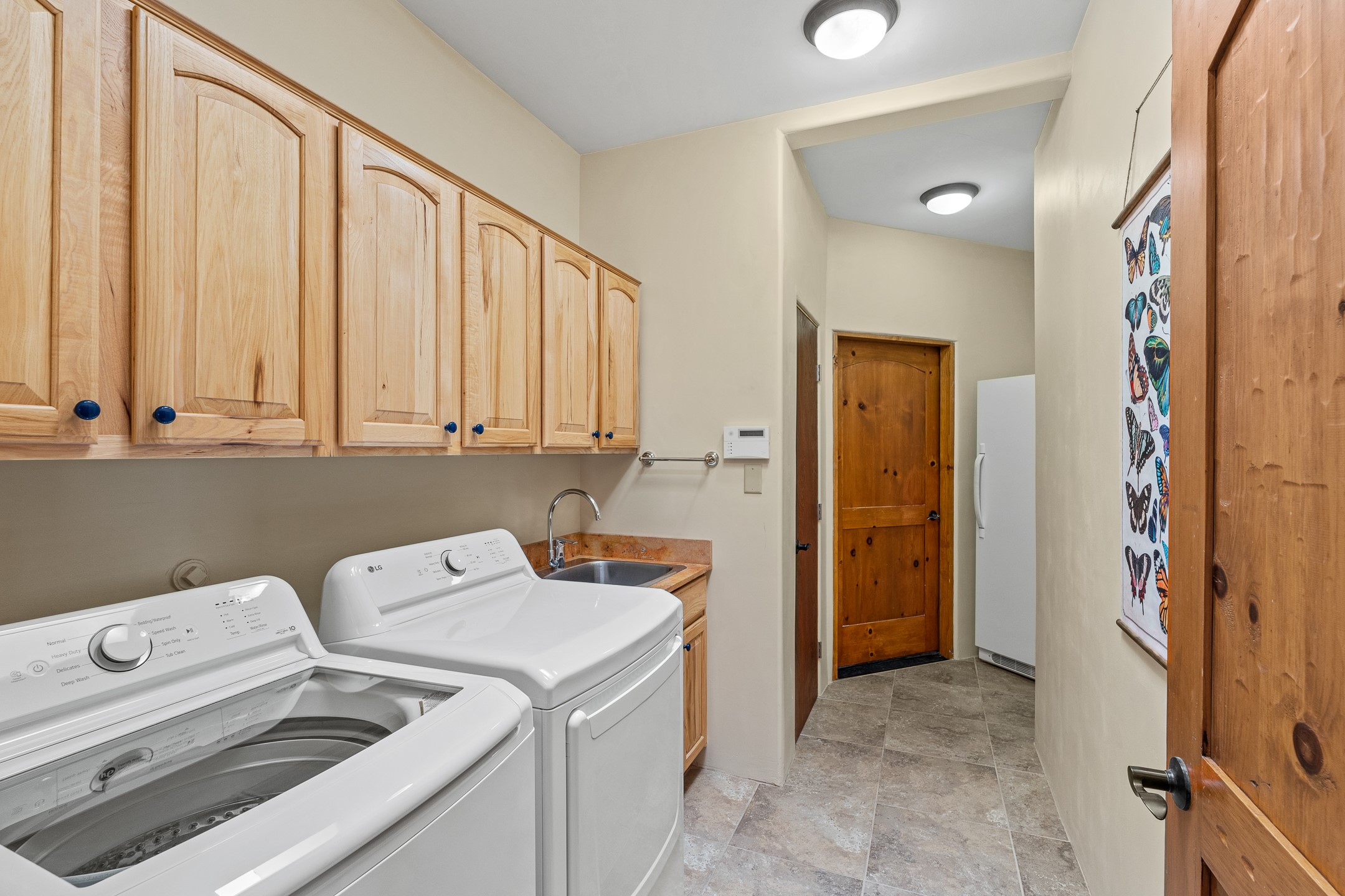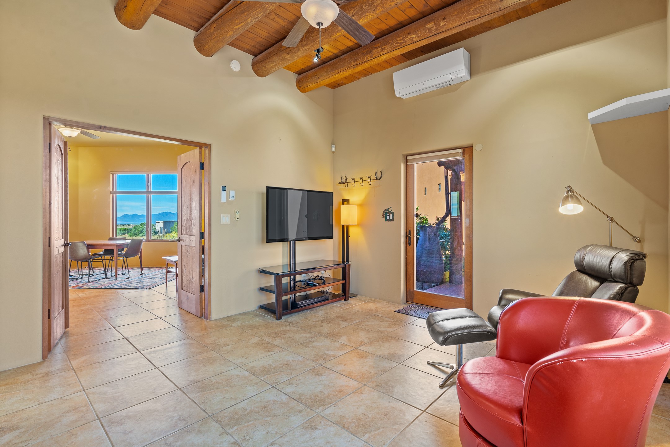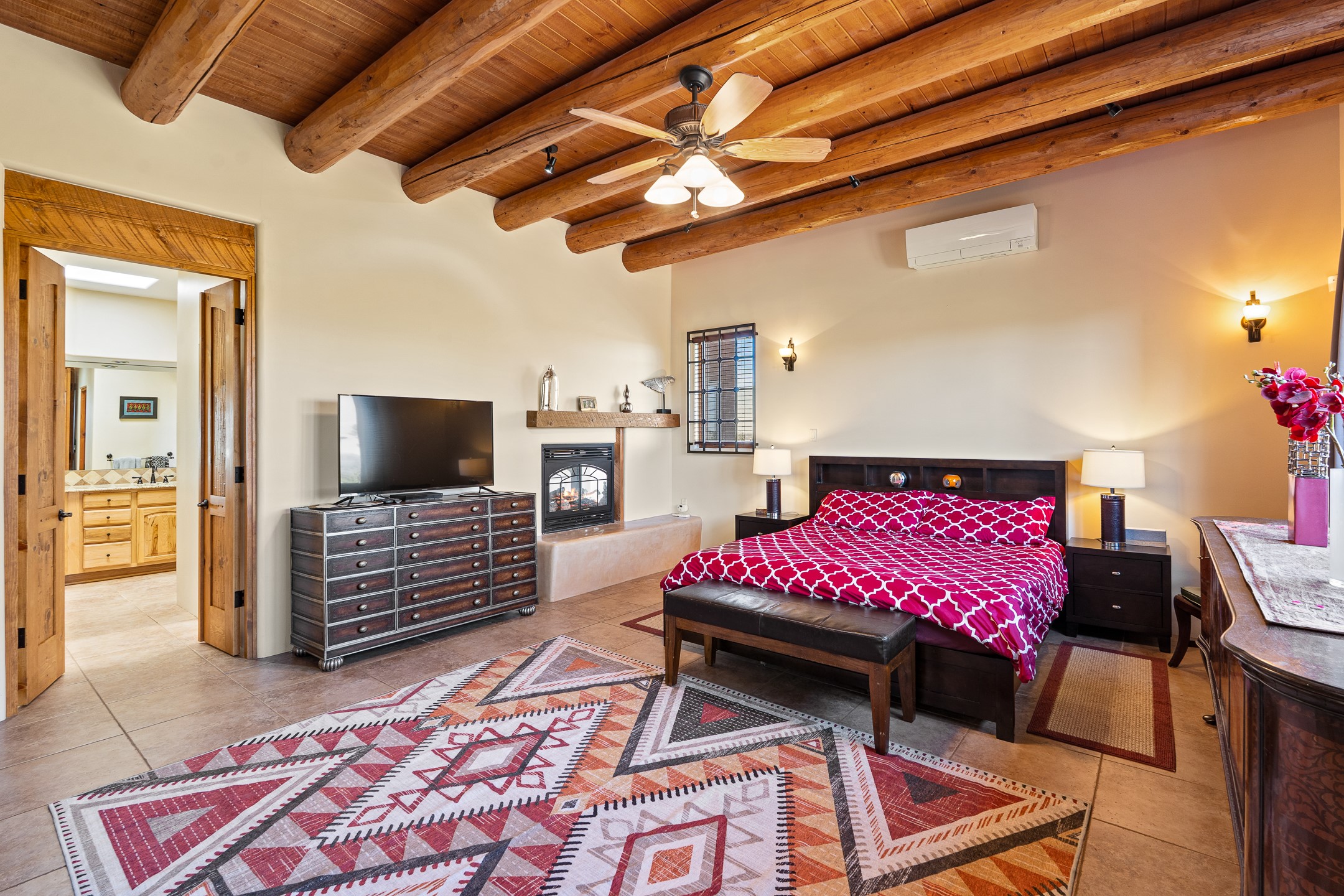Wishing for a HOUSE/GUESTHOUSE/and a 5-CAR GARAGE with an additional RV GARAGE on 5 acres? Your wish has been granted! Just 20 minutes from downtown Santa Fe, this beautifully sited single-level property offers sweeping mountain views, abundant garage space, and classic regional charm. The 5-acre parcel (with acre fenced) includes a 2,548 sq. ft. 3BD/2.5BA main residence and a connected 698 sq. ft. 1BD/1BA guest house--ideal for guests and flexible use.The property features an attached/heated 3-car garage, an attached 2-car garage (connected to the guest house), and a heated/cooled RV garage, perfect for a hobbyist, car enthusiast or artist! The main residence captures expansive views of the Sangre de Cristo, Jemez, and Ortiz mountain ranges from a deep East-facing portal and a new 900 sq. ft. West-facing portal. The living room features a custom plastered and hand-painted kiva fireplace and beautifully hand-carved corbels. The kitchen is outfitted with granite countertops, a 6-burner Wolf range with a potfiller, two ovens (one convection microwave), warming drawer, a KitchenAid refrigerator, and an extra dual temp beverage refrigerator. The kitchen island has a second sink and seating for three. The breakfast bar with seating for 2 or 3 persons, creates an open flow to the dining area. The private primary suite enjoys a sitting area, east portal access, two walk-in closets, a soaking tub beside a gas fireplace, and a walk-in shower. The 2 guest bedrooms share a bathroom and have excellent separation from the main living areas. A breezeway connects the guest house, which enjoys its own patio and a beautifully maintained vegetable garden--perfect for those wanting to grow fresh greens. Additional features include in-floor radiant heating, natural gas, 8 mini-splits, Eldorado community water. Horses are also allowed. A rare opportunity for peaceful country living with city conveniences--this home blends beauty, functionality, and flexibility in one stunning package.