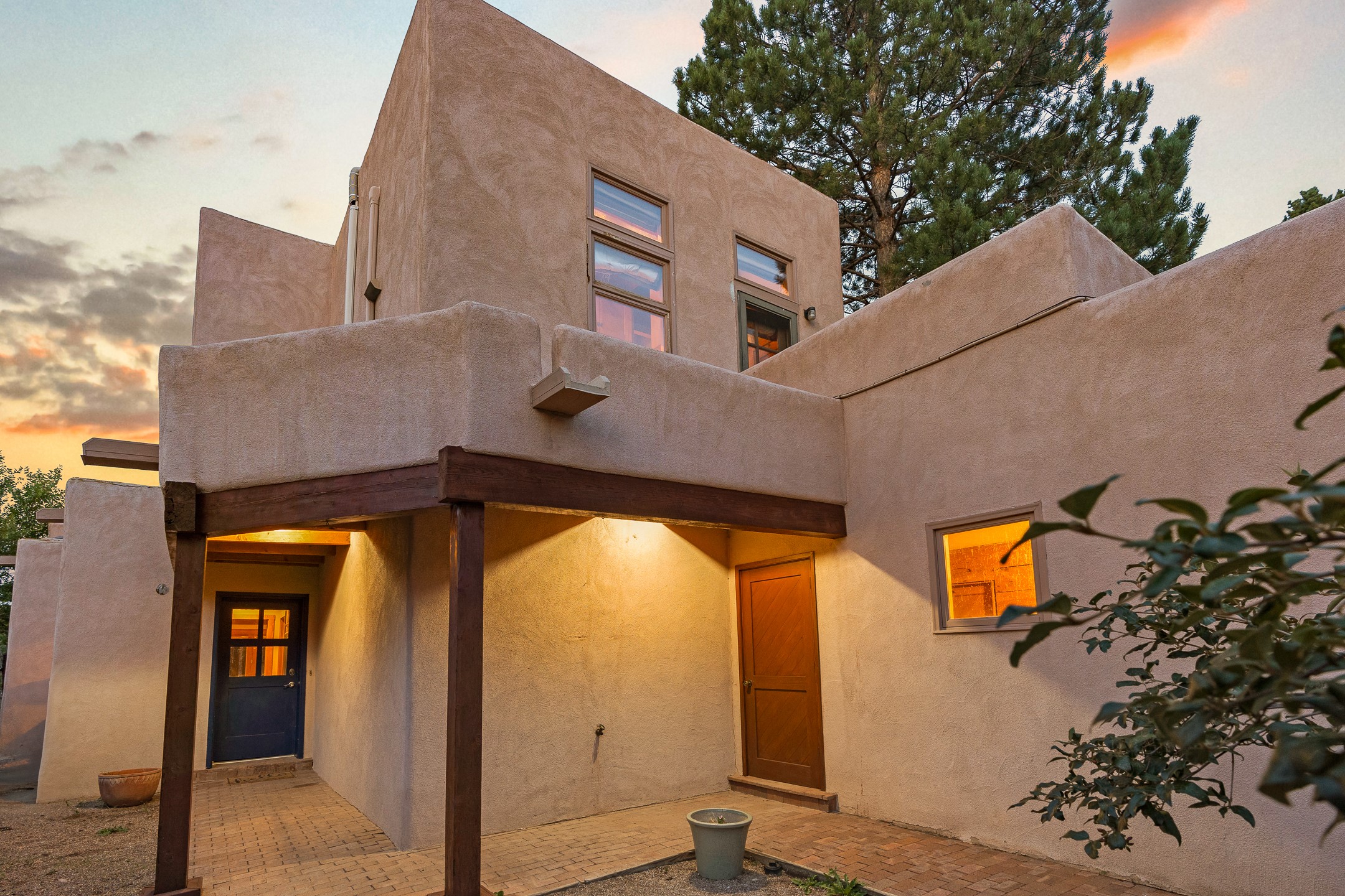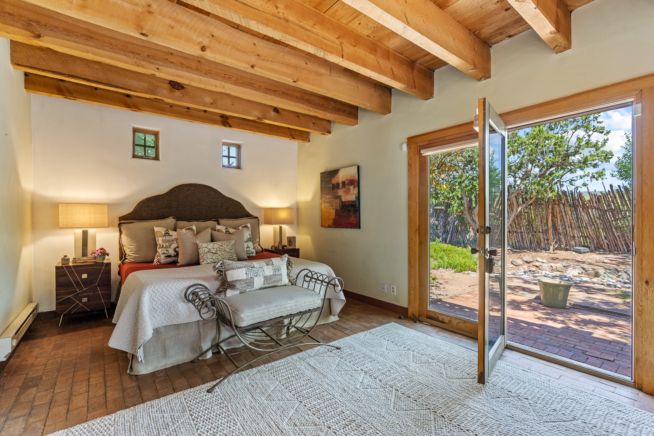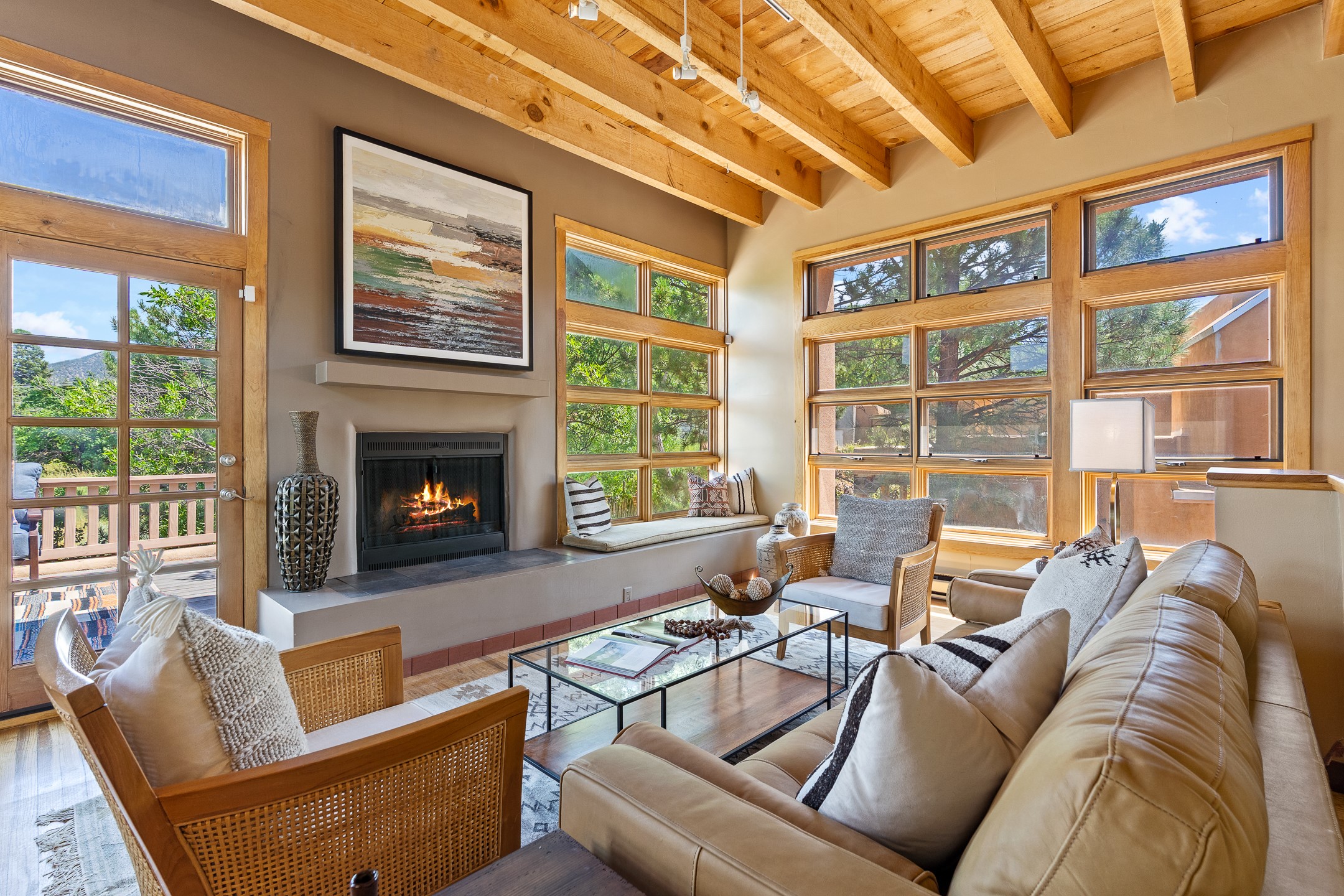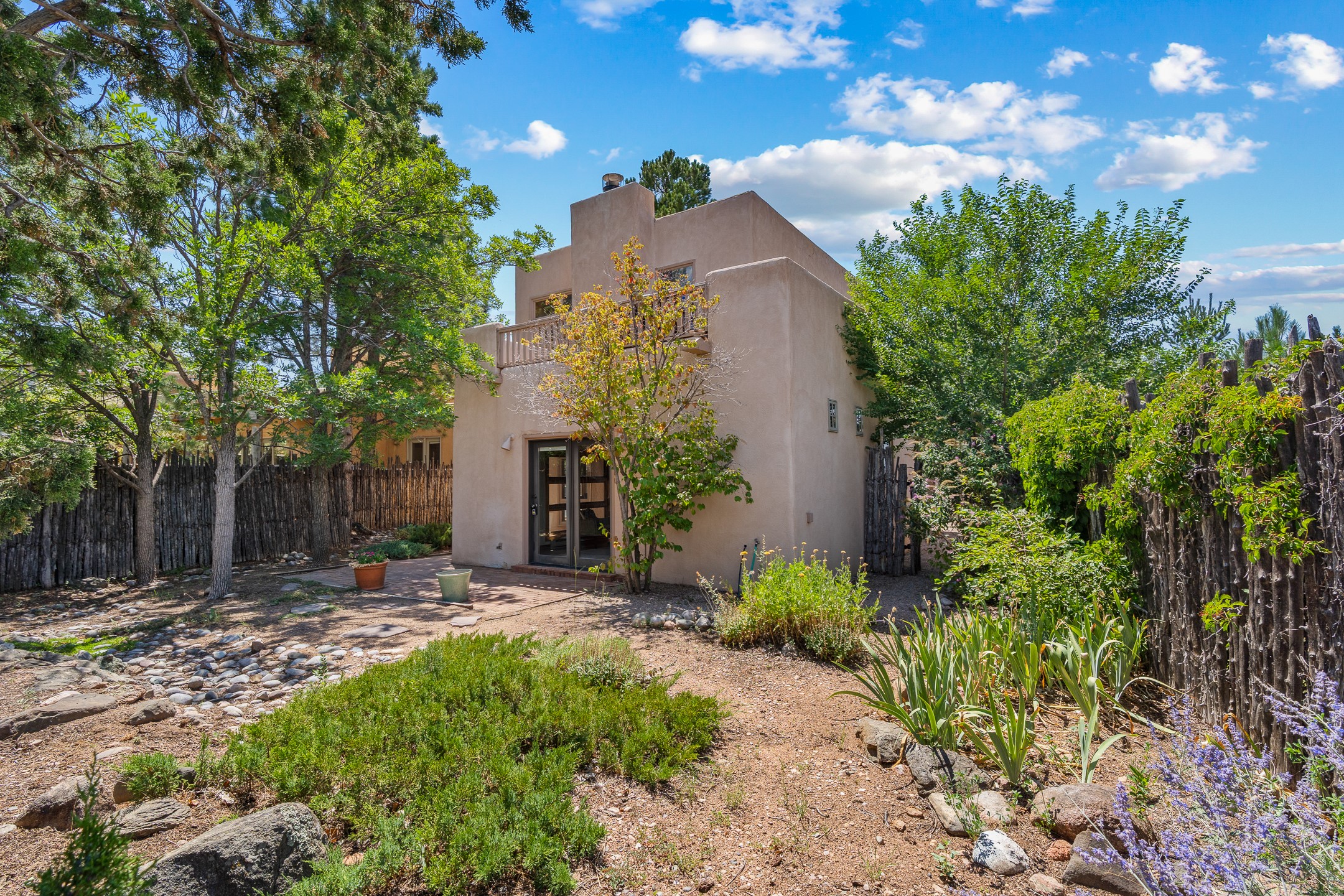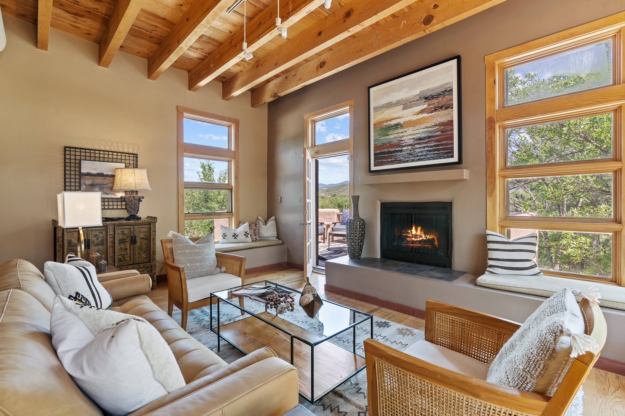 Located down a little lane in Santa Fe's Historic Eastside! With walking easement to Canyon Road, is this beautiful 2145 sq. ft. 3-bedroom, 2 1/2-bath light filled home. Architectural features are floor to ceiling windows of both East and West views featuring Picacho peak, trees and garden views, wood floors, beams, authentic talavera tile, and brick floors. Upstairs, a sunlit living area flows seamlessly into a dining room and kitchen, complete with custom cabinets, stone tile, stainless appliances, stunning wood floors and a half bath. Two decks provide serene views, while a central wood-burning fireplace and cushioned bancos create a lovely environment to entertain. All bedrooms are on the main level, including the primary suite showcasing a wall of windows facing East with private patio access, a sitting area, and tumbled travertine bath. The expansive guest bedroom also with an ensuite bathroom enjoys South facing windows and access to private gardens. While the third bedroom is currently used as a home office also with lots of South facing windows and its own entrance. Rich brick floors enhance the home's warm, enduring character throughout.Thoughtful amenities include a two-car garage with covered brick walkway and gated courtyard entrance. This residence combines artisanal finishes, historic charm, and a prime Eastside location just steps from galleries, restaurants, and cultural landmarks. A rare opportunity to enjoy privacy, quality construction and views. The perfect Santa Fe lifestyle.