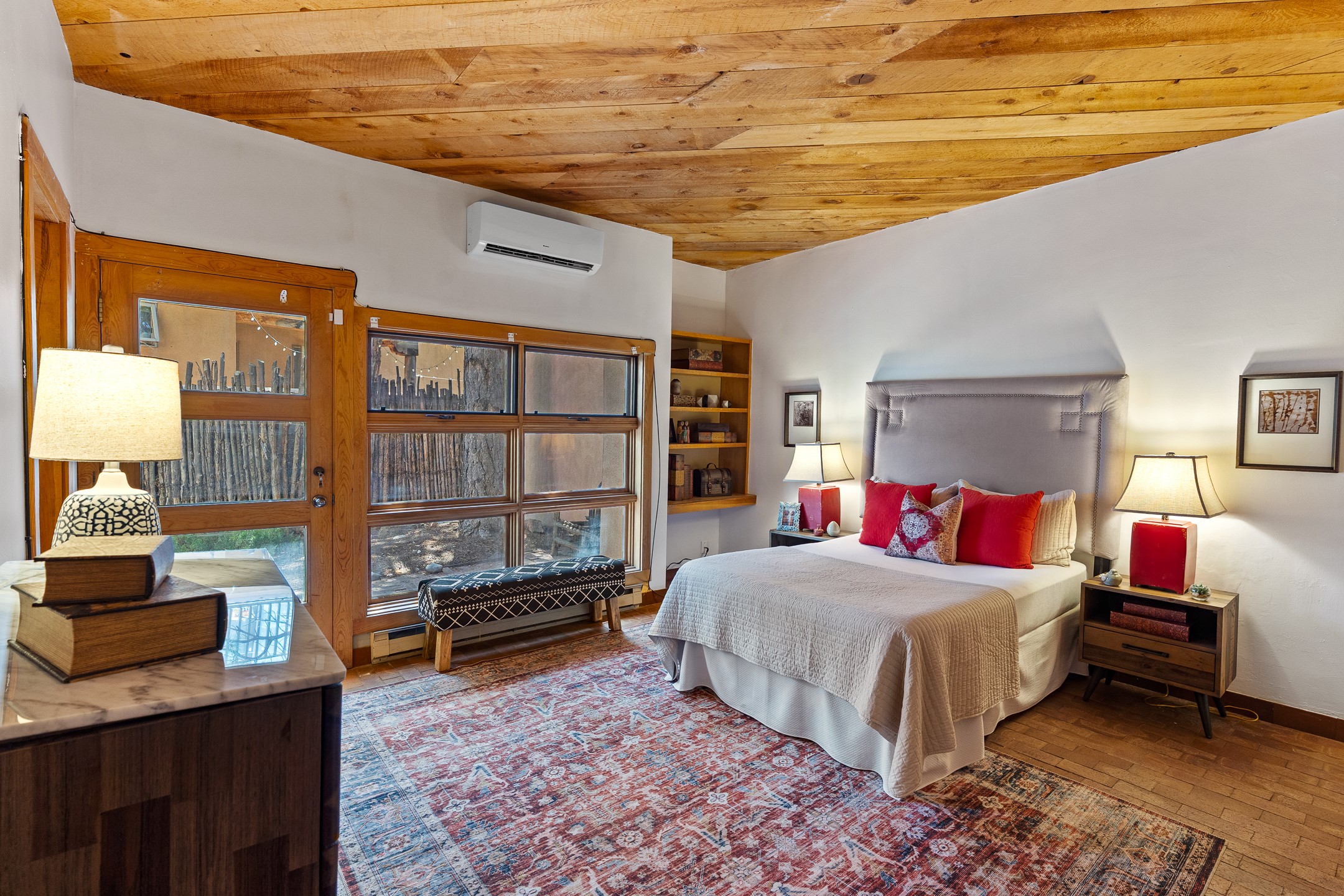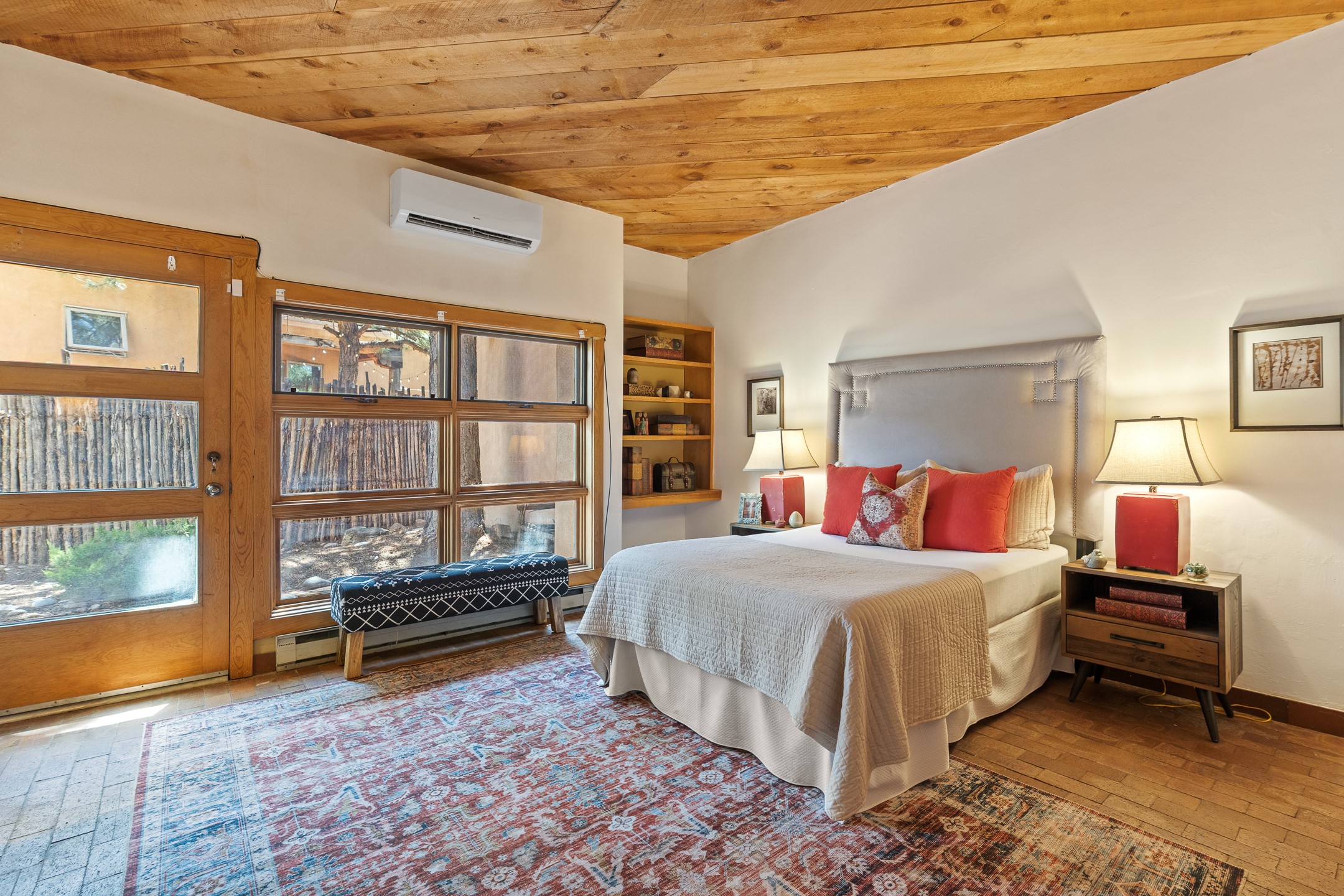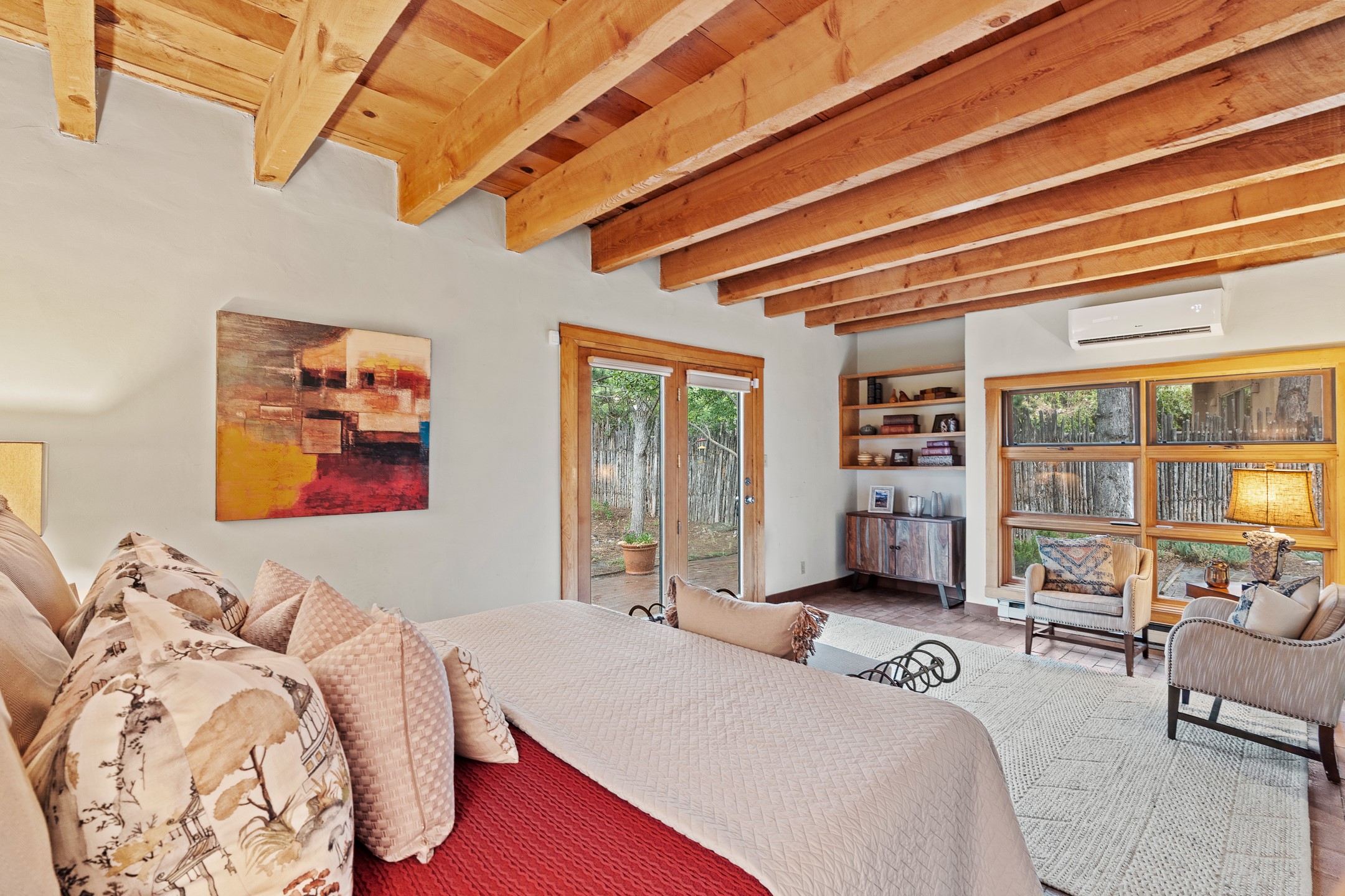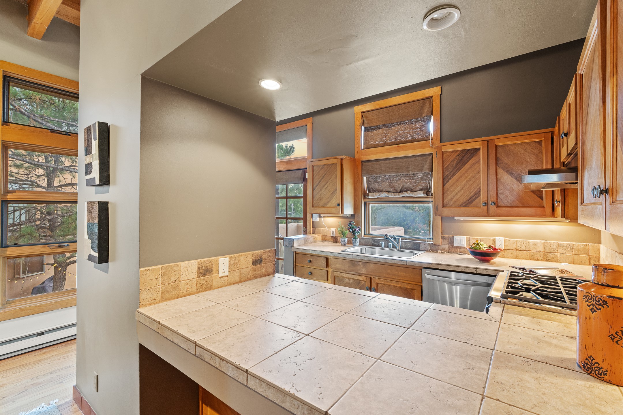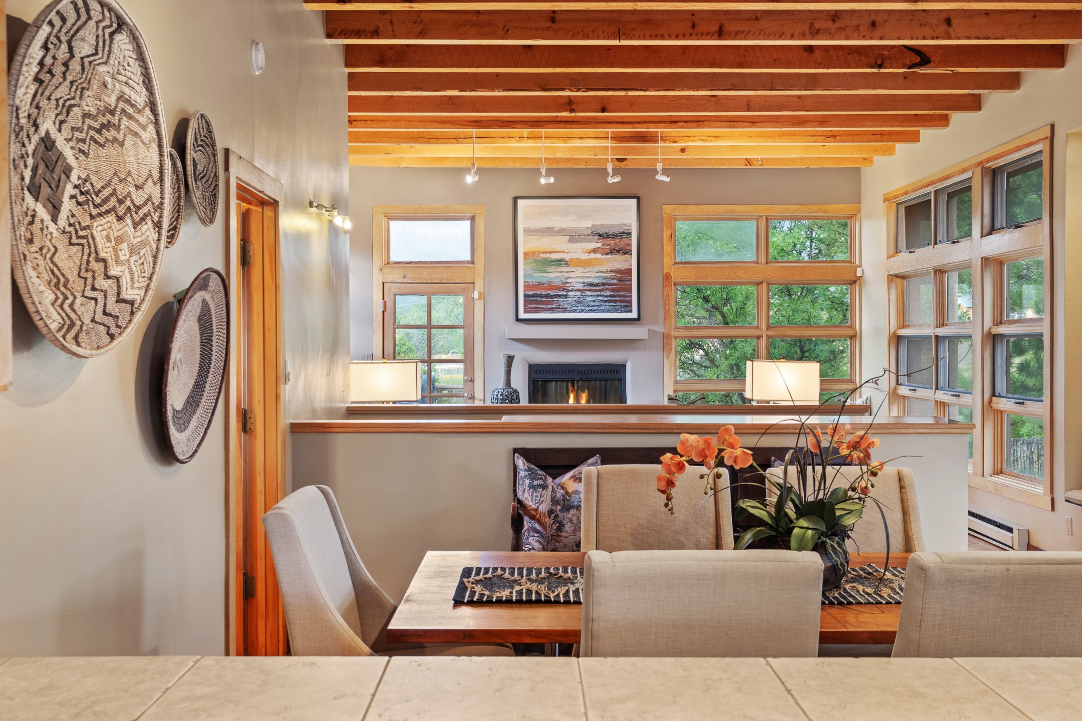 Located down a little lane in Santa Fe's Historic Eastside! With walking easement to Canyon Road, is this beautiful 2145 sq. ft. 3-bedroom, 2 1/2-bath light filled home. Architectural features are floor to ceiling windows of both East and West views featuring Picacho peak, trees and garden views, wood floors, beams, authentic talavera tile, and brick floors. Upstairs, a sunlit living area flows seamlessly into a dining room and kitchen, complete with custom cabinets, stone tile, stainless appliances, stunning wood floors and a half bath. Two decks provide serene views, while a central wood-burning fireplace and cushioned bancos create a lovely environment to entertain. All bedrooms are on the main level, including the primary suite showcasing a wall of windows facing East with private patio access, a sitting area, and tumbled travertine bath. The expansive guest bedroom also with an ensuite bathroom enjoys South facing windows and access to private gardens. While the third bedroom is currently used as a home office also with lots of South facing windows and its own entrance. Rich brick floors enhance the home's warm, enduring character throughout.Thoughtful amenities include a two-car garage with covered brick walkway and gated courtyard entrance. This residence combines artisanal finishes, historic charm, and a prime Eastside location just steps from galleries, restaurants, and cultural landmarks. A rare opportunity to enjoy privacy, quality construction and views. The perfect Santa Fe lifestyle.