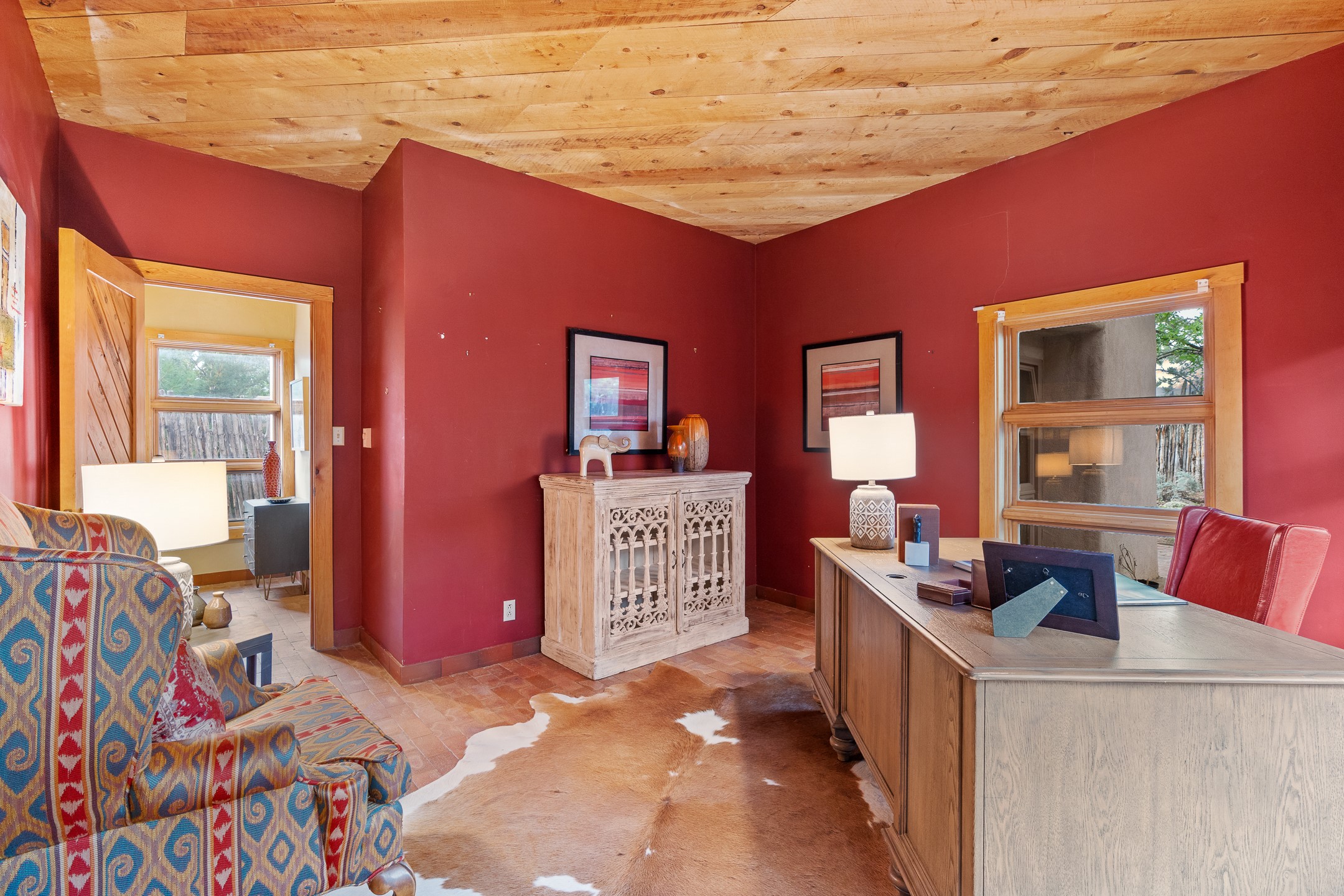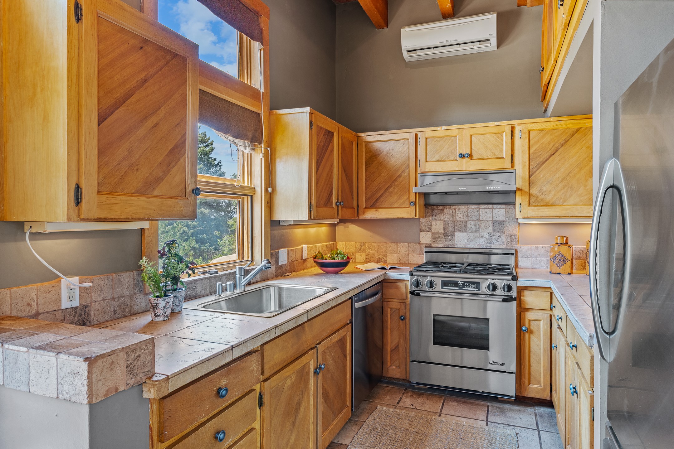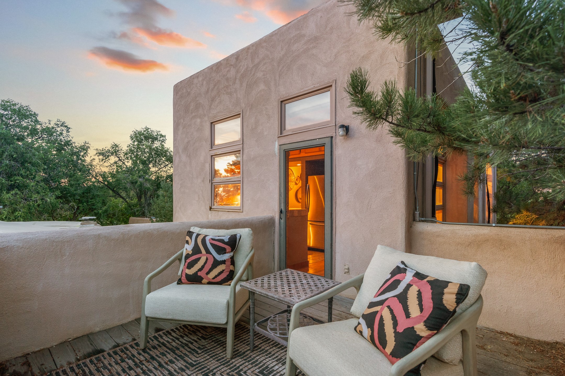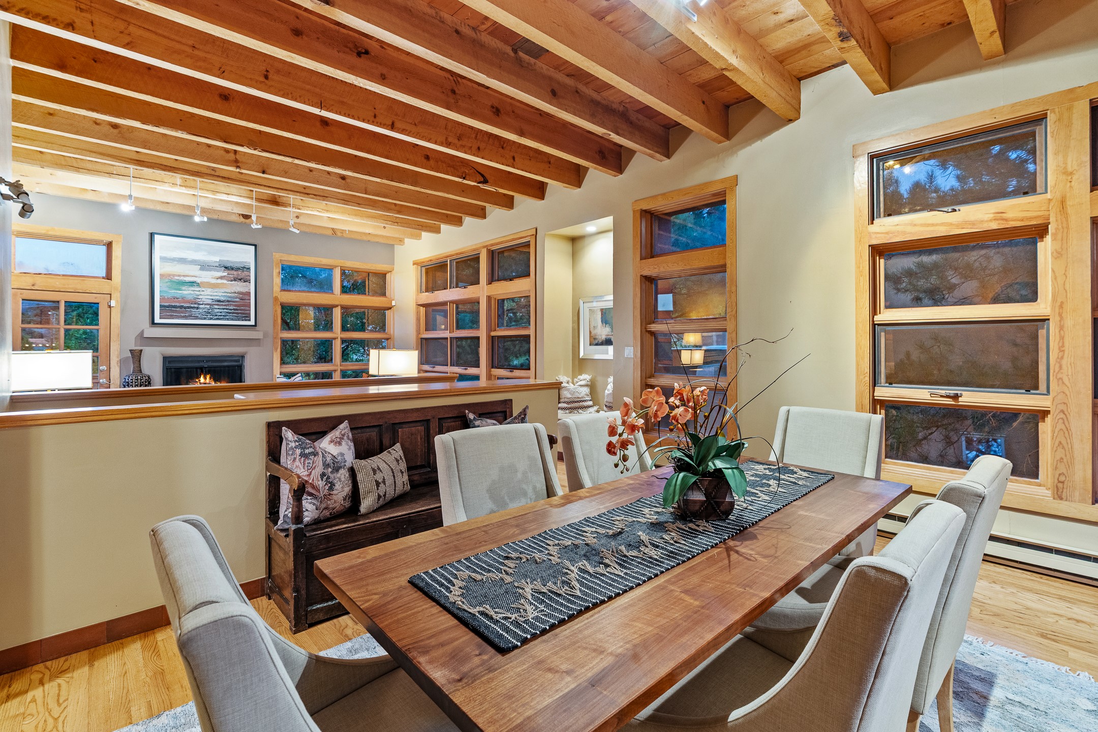 Located down a little lane in Santa Fe's Historic Eastside! With walking easement to Canyon Road, is this beautiful 2145 sq. ft. 3-bedroom, 2 1/2-bath light filled home. Architectural features are floor to ceiling windows of both East and West views featuring Picacho peak, trees and garden views, wood floors, beams, authentic talavera tile, and brick floors. Upstairs, a sunlit living area flows seamlessly into a dining room and kitchen, complete with custom cabinets, stone tile, stainless appliances, stunning wood floors and a half bath. Two decks provide serene views, while a central wood-burning fireplace and cushioned bancos create a lovely environment to entertain. All bedrooms are on the main level, including the primary suite showcasing a wall of windows facing East with private patio access, a sitting area, and tumbled travertine bath. The expansive guest bedroom also with an ensuite bathroom enjoys South facing windows and access to private gardens. While the third bedroom is currently used as a home office also with lots of South facing windows and its own entrance. Rich brick floors enhance the home's warm, enduring character throughout.Thoughtful amenities include a two-car garage with covered brick walkway and gated courtyard entrance. This residence combines artisanal finishes, historic charm, and a prime Eastside location just steps from galleries, restaurants, and cultural landmarks. A rare opportunity to enjoy privacy, quality construction and views. The perfect Santa Fe lifestyle.