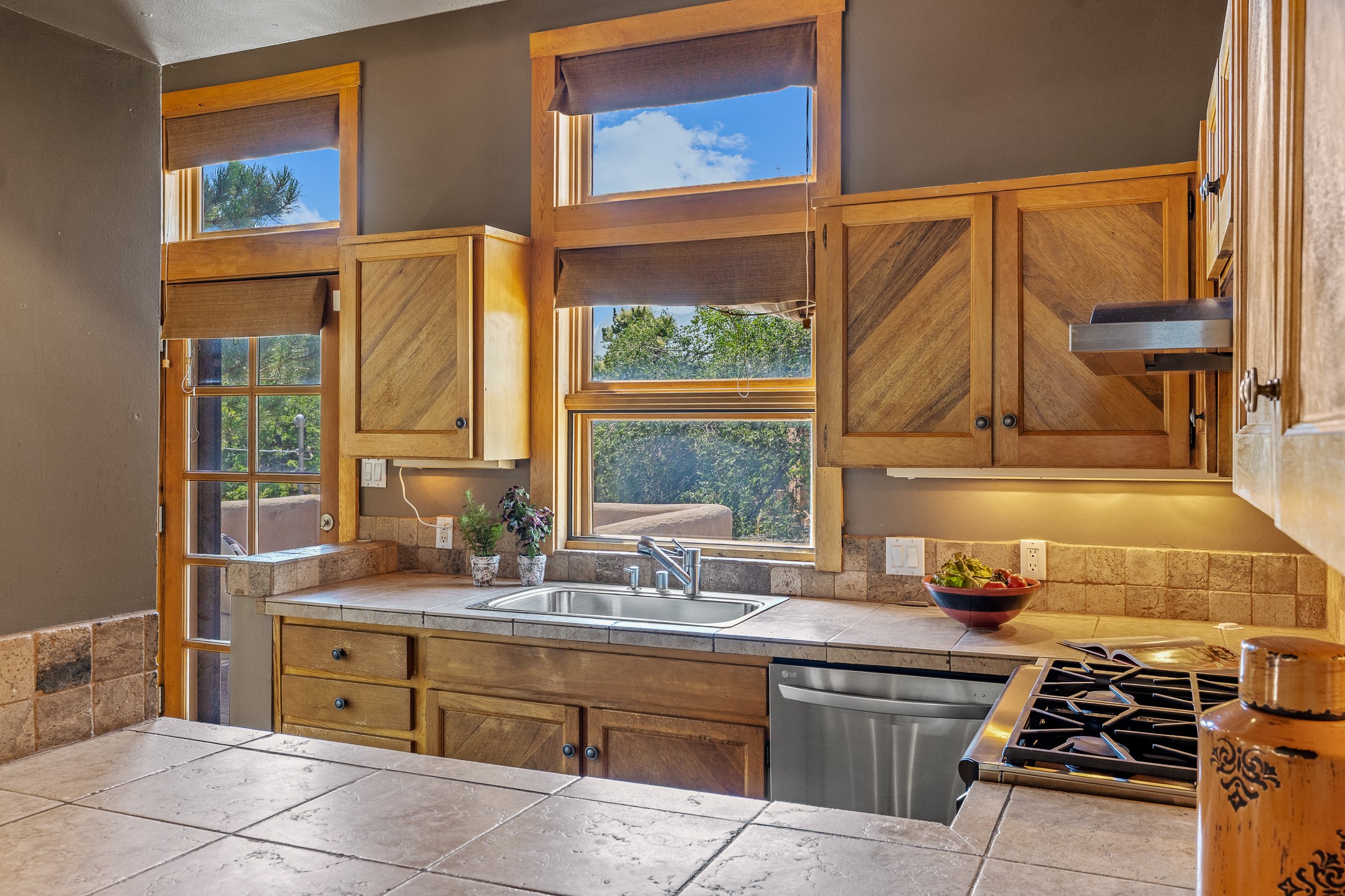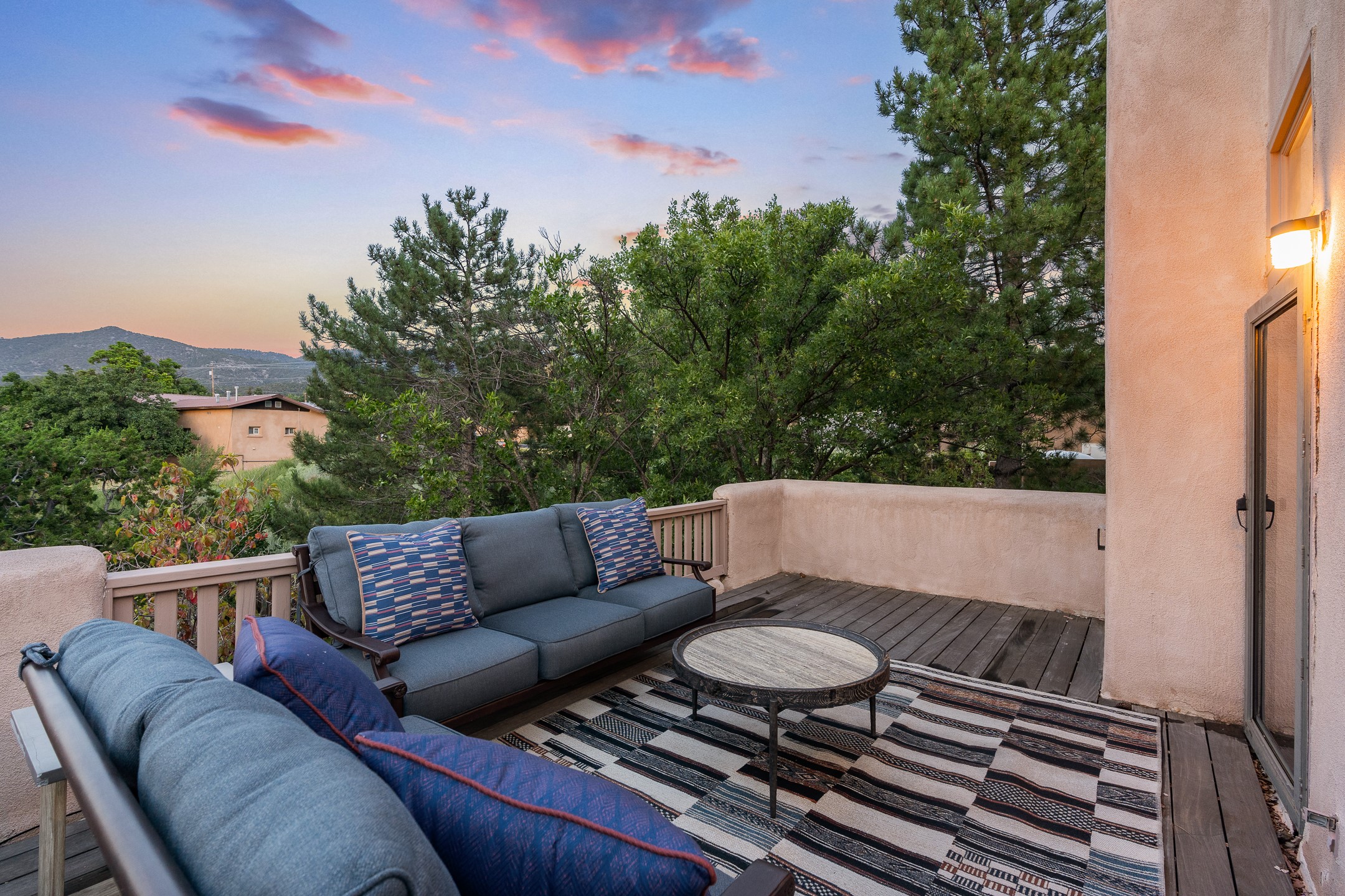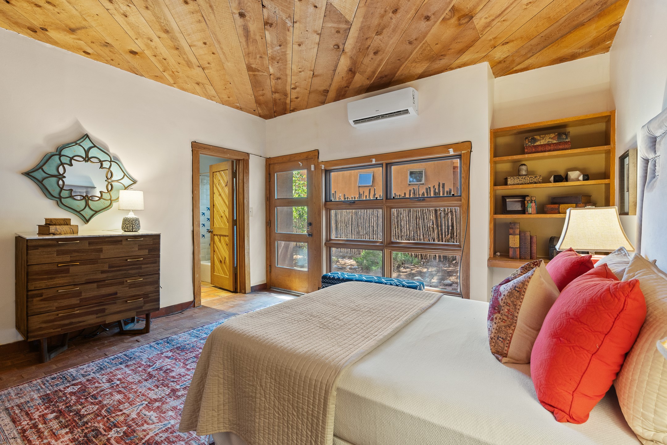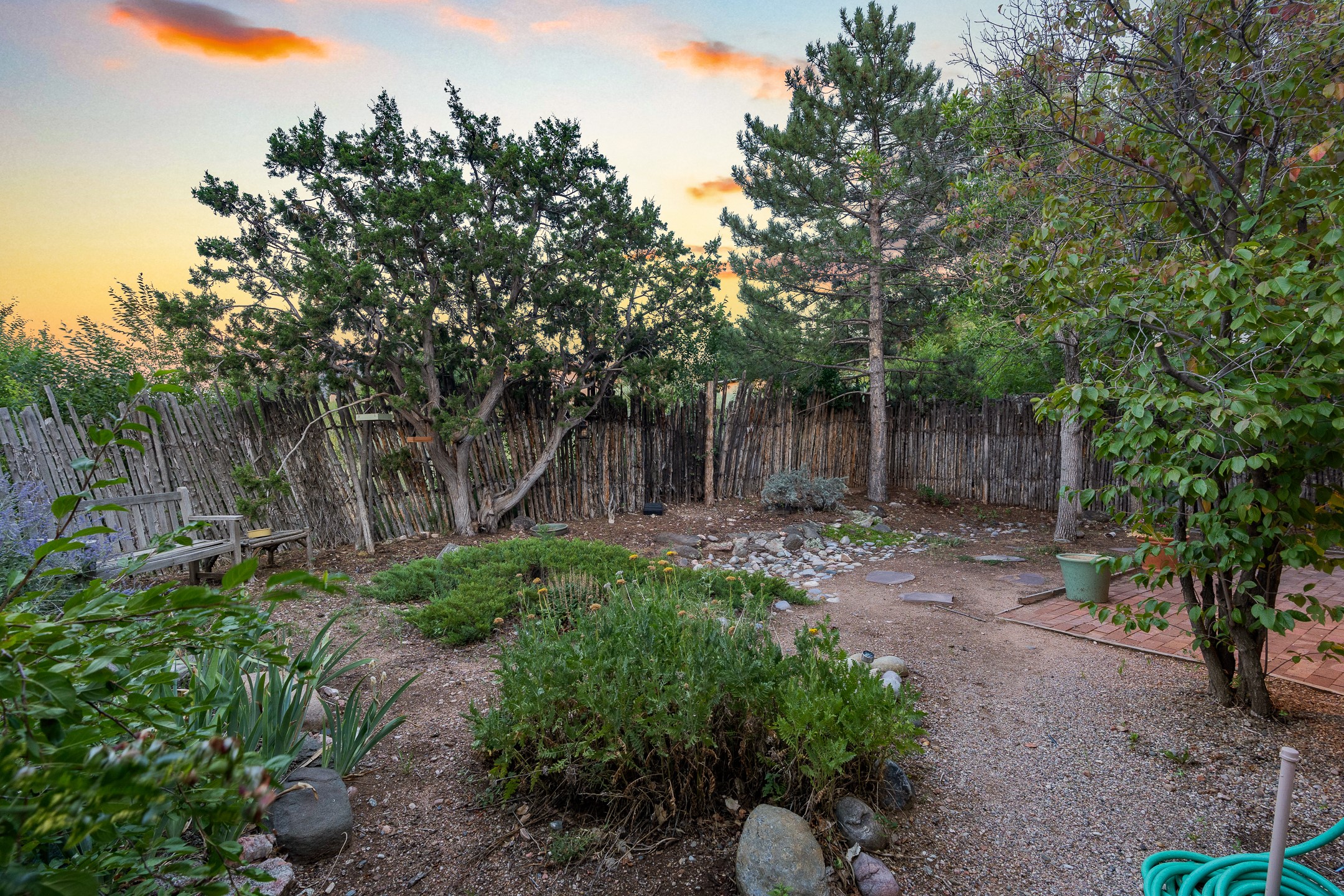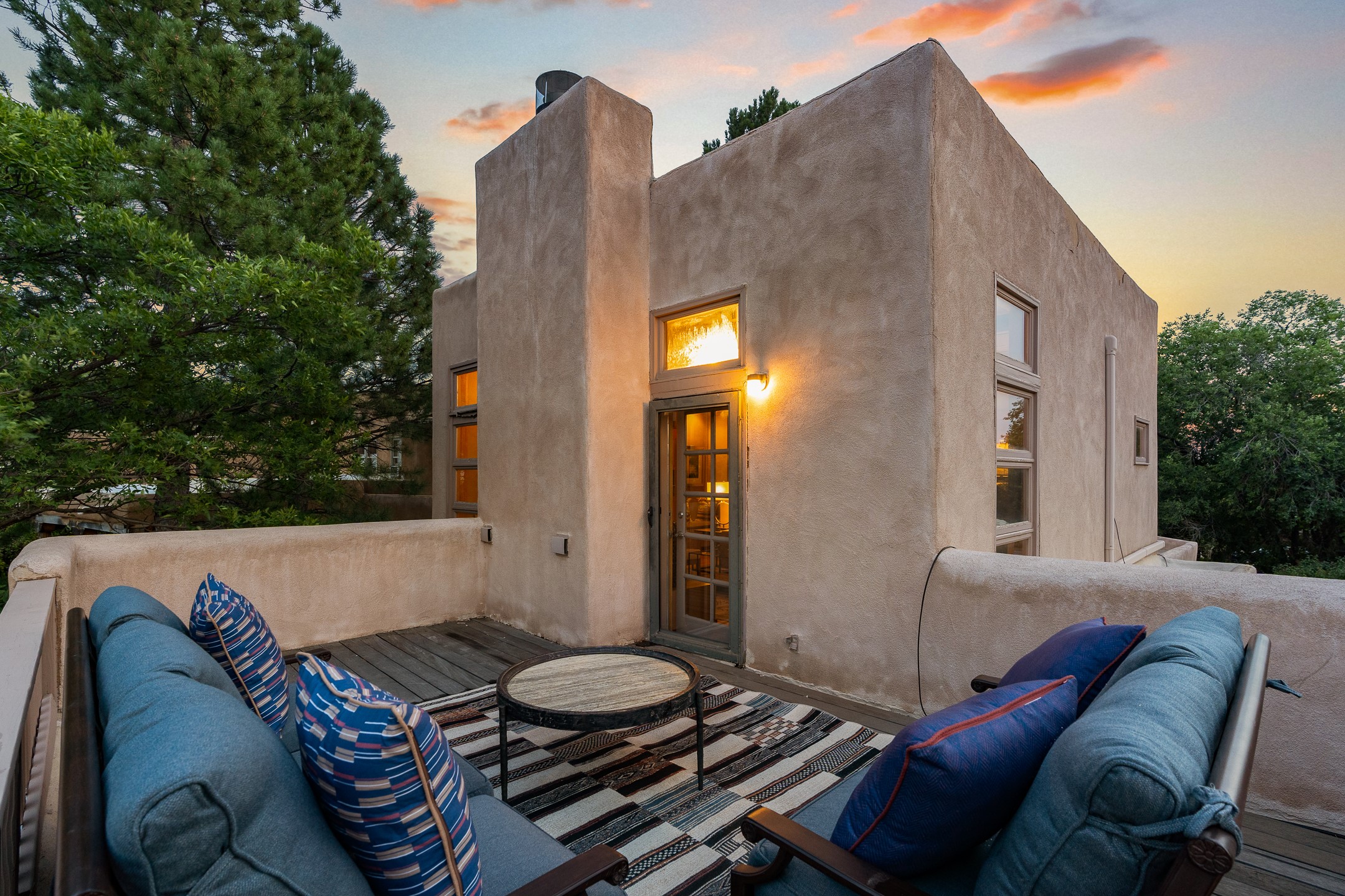 Located down a little lane in Santa Fe's Historic Eastside! With walking easement to Canyon Road, is this beautiful 2145 sq. ft. 3-bedroom, 2 1/2-bath light filled home. Architectural features are floor to ceiling windows of both East and West views featuring Picacho peak, trees and garden views, wood floors, beams, authentic talavera tile, and brick floors. Upstairs, a sunlit living area flows seamlessly into a dining room and kitchen, complete with custom cabinets, stone tile, stainless appliances, stunning wood floors and a half bath. Two decks provide serene views, while a central wood-burning fireplace and cushioned bancos create a lovely environment to entertain. All bedrooms are on the main level, including the primary suite showcasing a wall of windows facing East with private patio access, a sitting area, and tumbled travertine bath. The expansive guest bedroom also with an ensuite bathroom enjoys South facing windows and access to private gardens. While the third bedroom is currently used as a home office also with lots of South facing windows and its own entrance. Rich brick floors enhance the home's warm, enduring character throughout.Thoughtful amenities include a two-car garage with covered brick walkway and gated courtyard entrance. This residence combines artisanal finishes, historic charm, and a prime Eastside location just steps from galleries, restaurants, and cultural landmarks. A rare opportunity to enjoy privacy, quality construction and views. The perfect Santa Fe lifestyle.