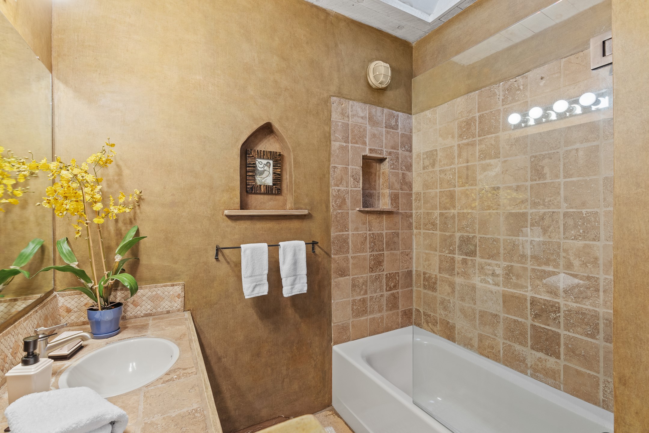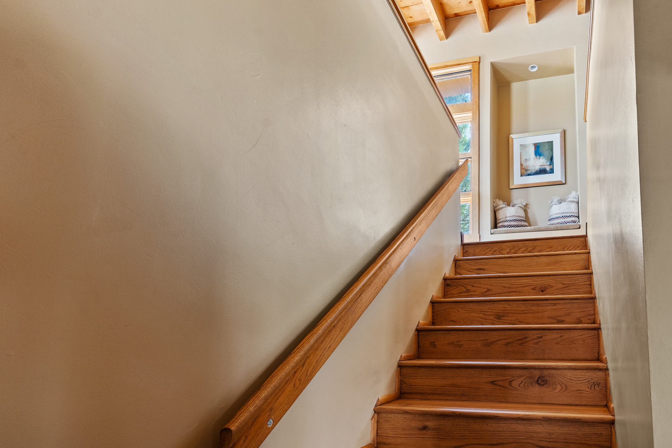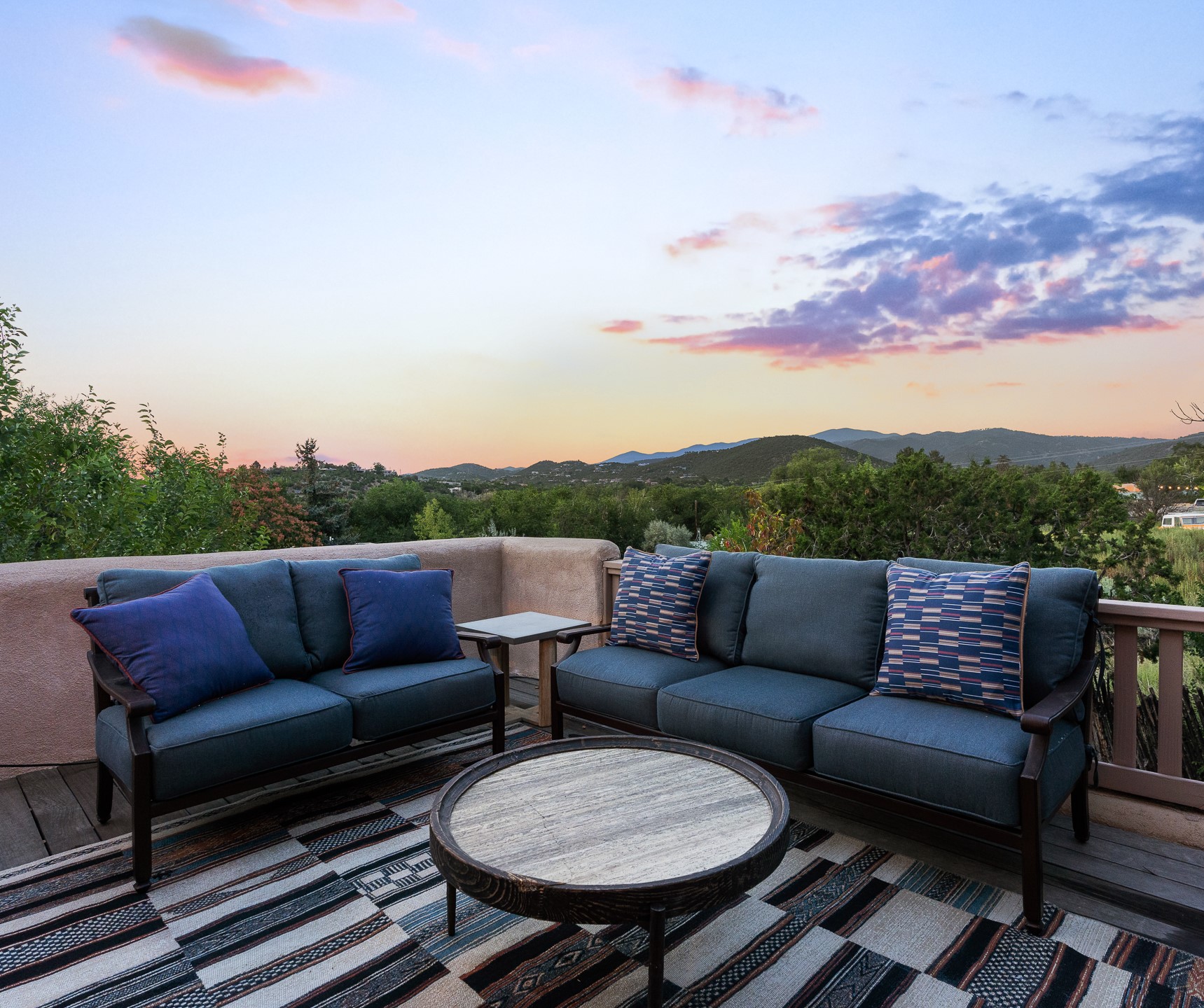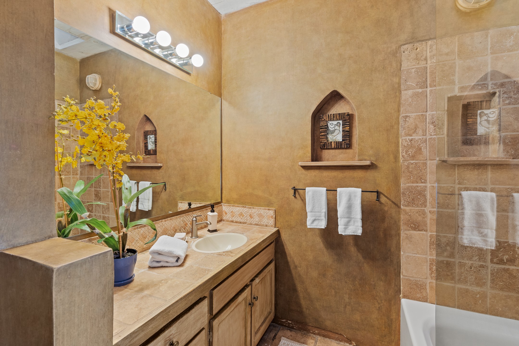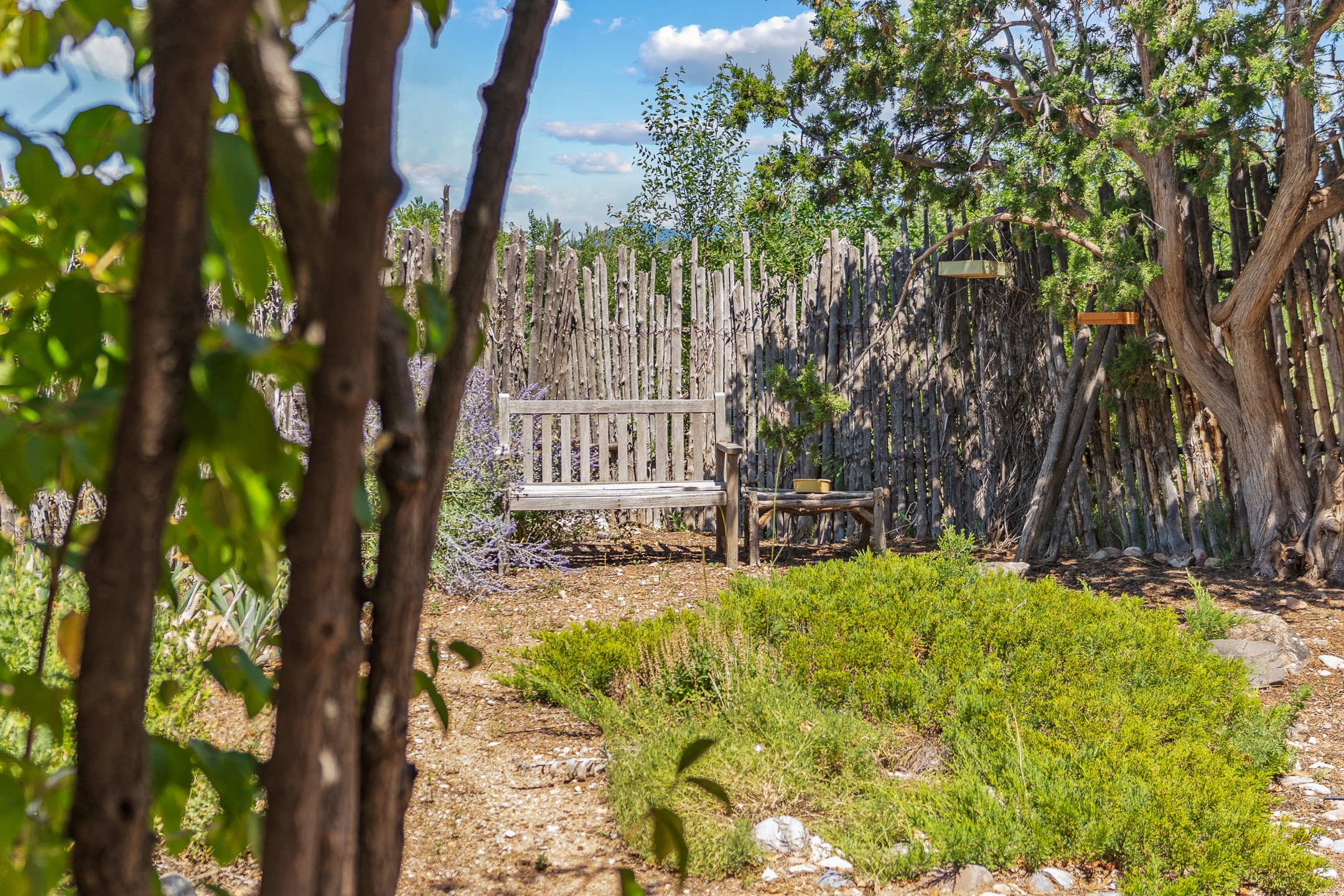 Located down a little lane in Santa Fe's Historic Eastside! With walking easement to Canyon Road, is this beautiful 2145 sq. ft. 3-bedroom, 2 1/2-bath light filled home. Architectural features are floor to ceiling windows of both East and West views featuring Picacho peak, trees and garden views, wood floors, beams, authentic talavera tile, and brick floors. Upstairs, a sunlit living area flows seamlessly into a dining room and kitchen, complete with custom cabinets, stone tile, stainless appliances, stunning wood floors and a half bath. Two decks provide serene views, while a central wood-burning fireplace and cushioned bancos create a lovely environment to entertain. All bedrooms are on the main level, including the primary suite showcasing a wall of windows facing East with private patio access, a sitting area, and tumbled travertine bath. The expansive guest bedroom also with an ensuite bathroom enjoys South facing windows and access to private gardens. While the third bedroom is currently used as a home office also with lots of South facing windows and its own entrance. Rich brick floors enhance the home's warm, enduring character throughout.Thoughtful amenities include a two-car garage with covered brick walkway and gated courtyard entrance. This residence combines artisanal finishes, historic charm, and a prime Eastside location just steps from galleries, restaurants, and cultural landmarks. A rare opportunity to enjoy privacy, quality construction and views. The perfect Santa Fe lifestyle.