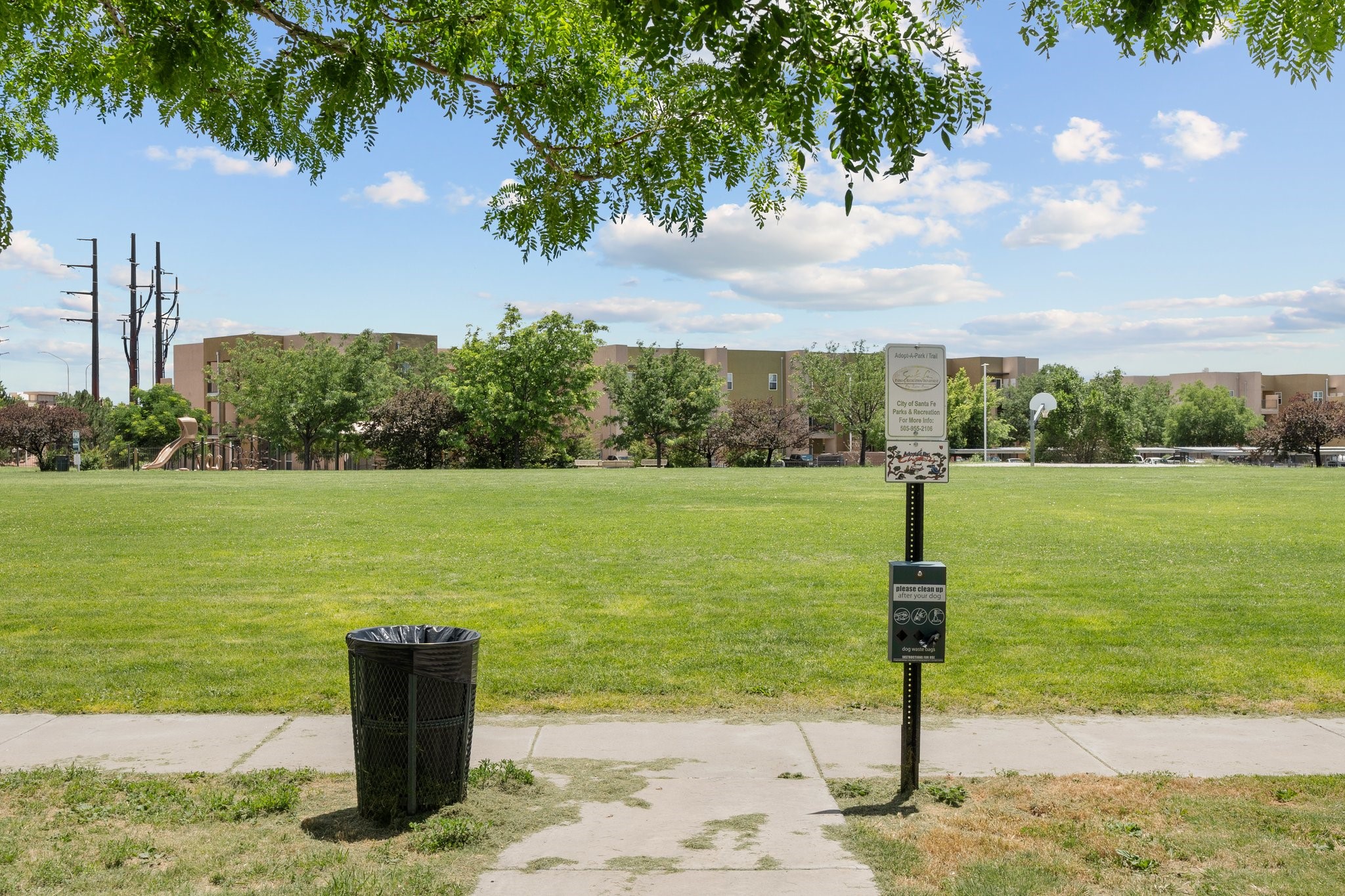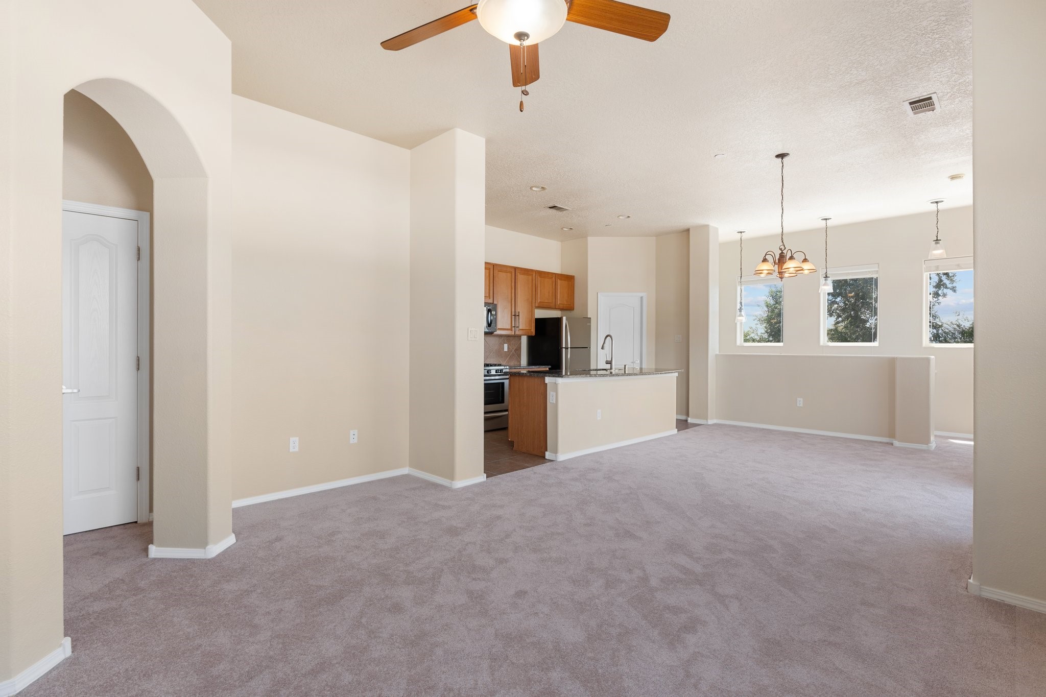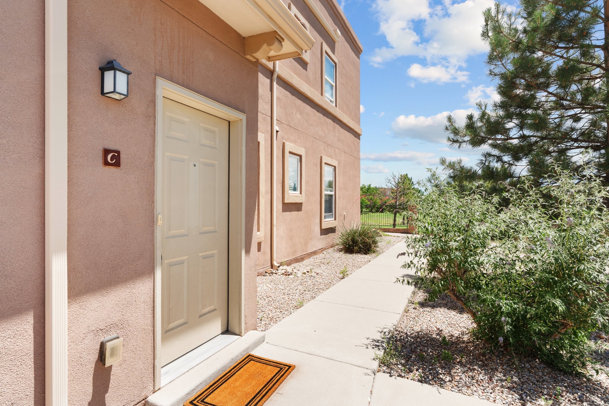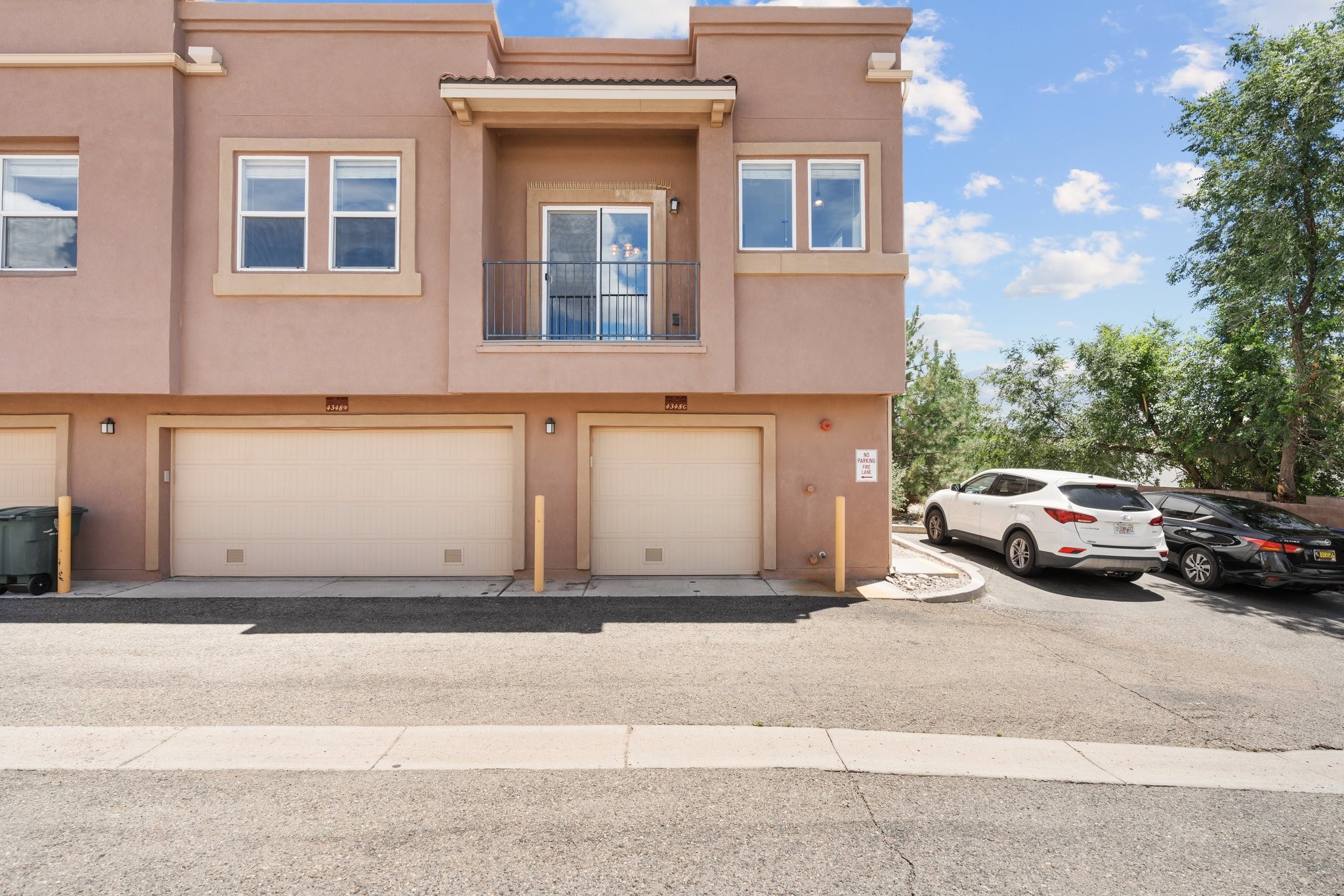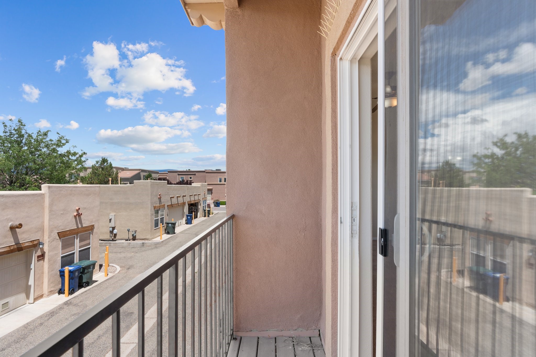 Bright, Spacious Condo with Park Access & Sunset Views! This beautifully maintained 2-bedroom, 2-bath upstairs condo offers stylish comfort, thoughtful design, and a prime location. Once upstairs, you'll find a spacious single-level layout with soaring ceilings and an abundance of natural light throughout. The heart of the home is the open-concept living, dining, and kitchen area, perfect for everyday living and entertaining. The kitchen features generous counter space, a large walk-in pantry, and an adjacent laundry room for added convenience.The primary suite is a peaceful retreat, complete with a walk-in closet and an ensuite bath that includes a soaking tub and double vanity. The guest bedroom is also nicely sized with large closets, ideal for visitors, home office use, or extra storage. Step on to the private balcony and enjoy sunset views, or explore the adjacent San Isidro Village Park, offering a jogging trail, basketball court, and playground--right next door. Additional features include new carpet, fresh paint, new HVAC (2023), updated appliances, and an attached 1-car garage with brand new opener. With a central location close to shopping and easy access to Santa Fe, Albuquerque, and Los Alamos, this turnkey home checks all the boxes for convenience, comfort, and lifestyle.