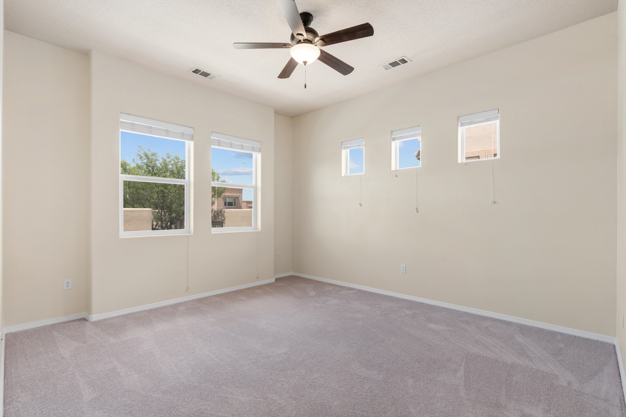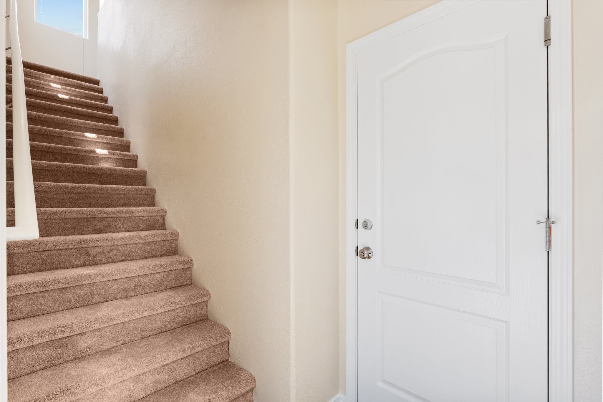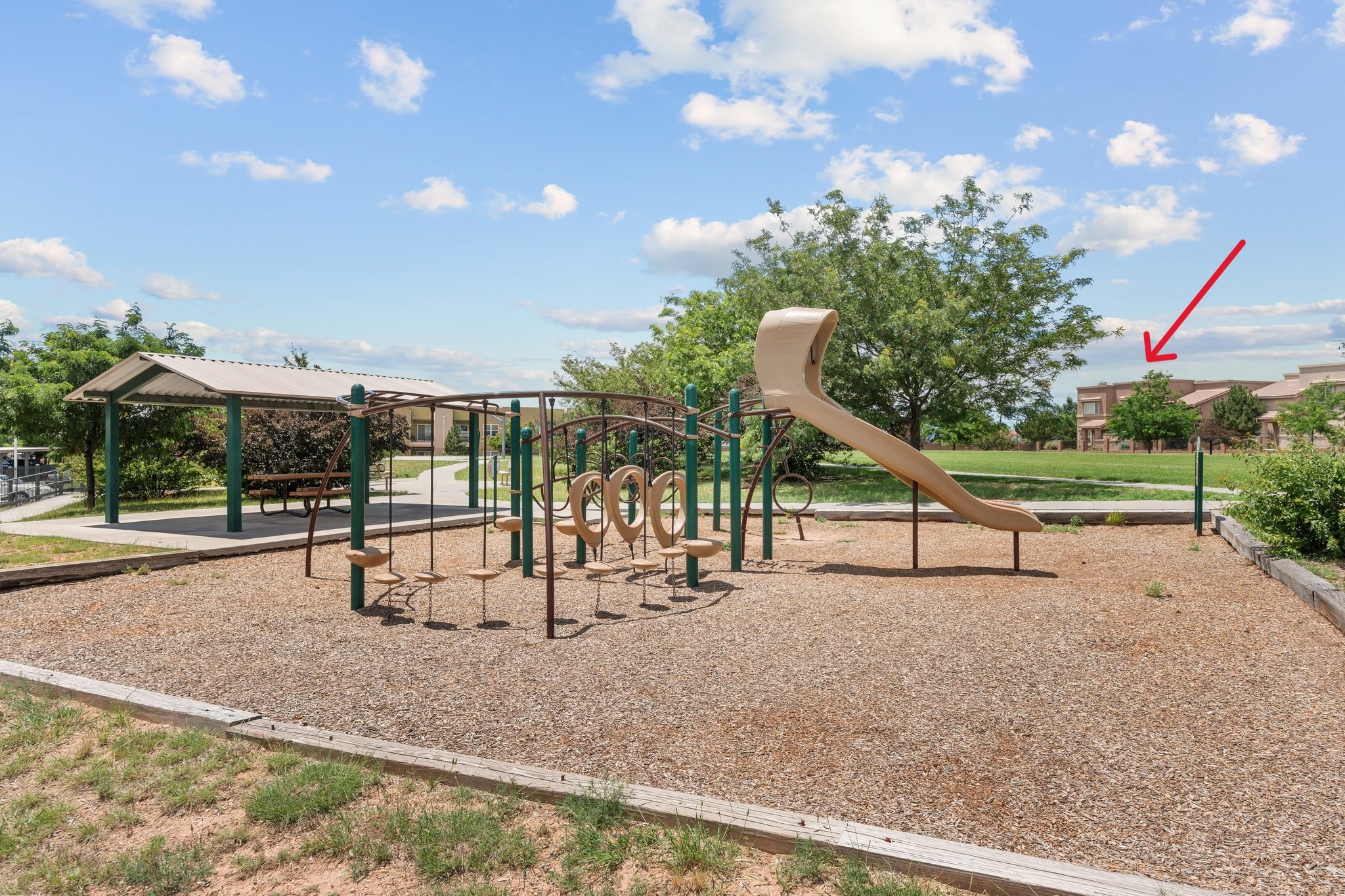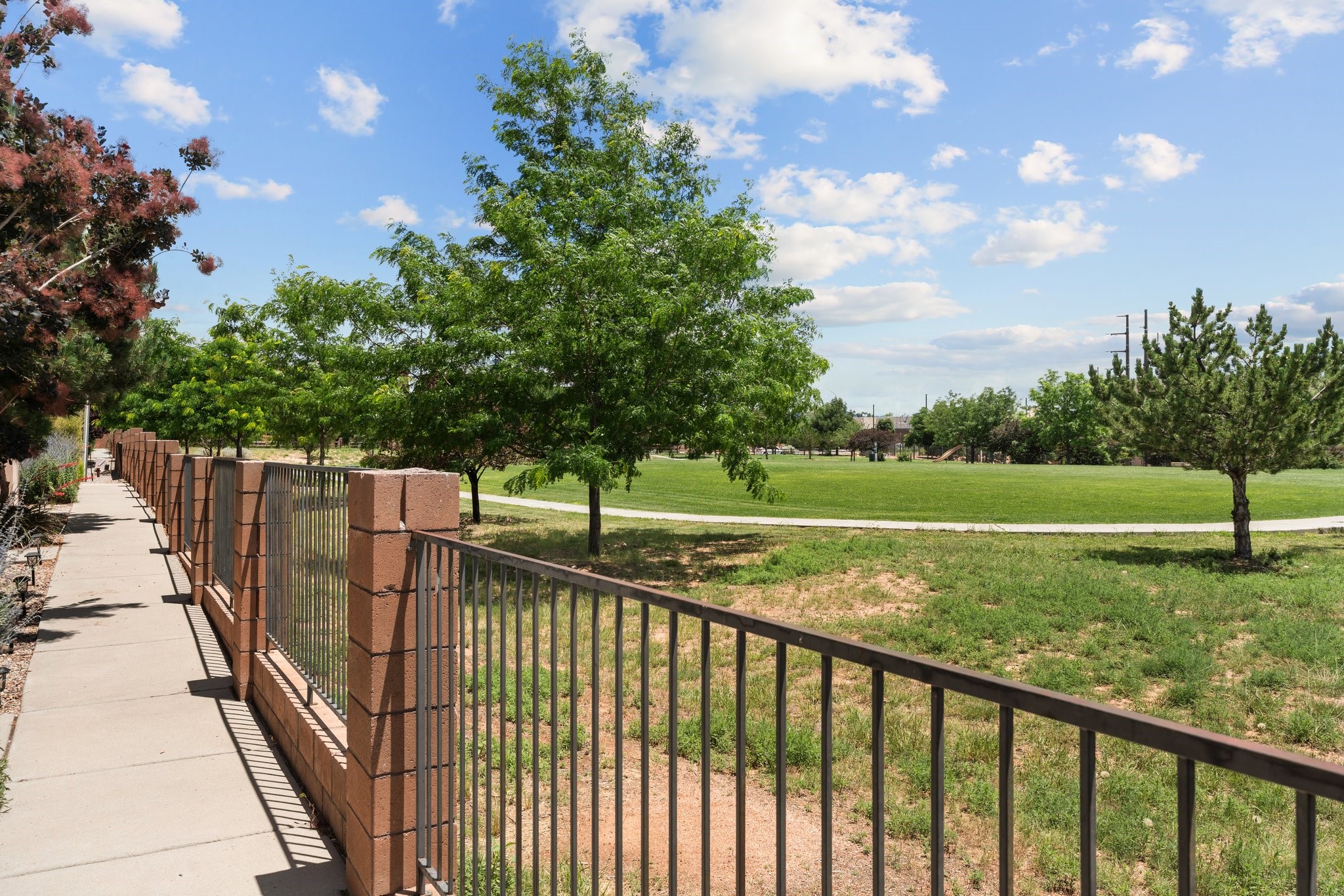 Bright, Spacious Condo with Park Access & Sunset Views! This beautifully maintained 2-bedroom, 2-bath upstairs condo offers stylish comfort, thoughtful design, and a prime location. Once upstairs, you'll find a spacious single-level layout with soaring ceilings and an abundance of natural light throughout. The heart of the home is the open-concept living, dining, and kitchen area, perfect for everyday living and entertaining. The kitchen features generous counter space, a large walk-in pantry, and an adjacent laundry room for added convenience.The primary suite is a peaceful retreat, complete with a walk-in closet and an ensuite bath that includes a soaking tub and double vanity. The guest bedroom is also nicely sized with large closets, ideal for visitors, home office use, or extra storage. Step on to the private balcony and enjoy sunset views, or explore the adjacent San Isidro Village Park, offering a jogging trail, basketball court, and playground--right next door. Additional features include new carpet, fresh paint, new HVAC (2023), updated appliances, and an attached 1-car garage with brand new opener. With a central location close to shopping and easy access to Santa Fe, Albuquerque, and Los Alamos, this turnkey home checks all the boxes for convenience, comfort, and lifestyle.