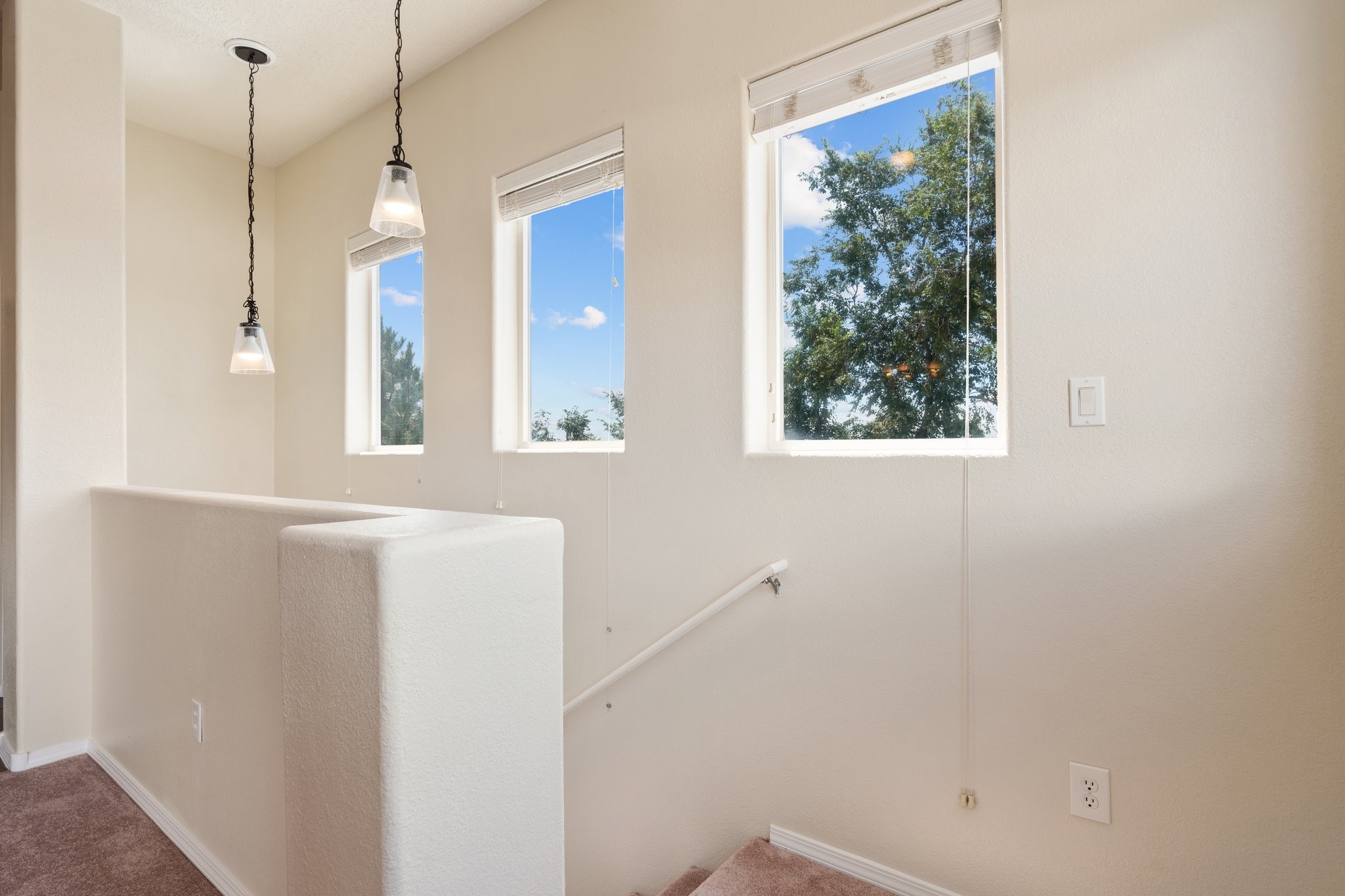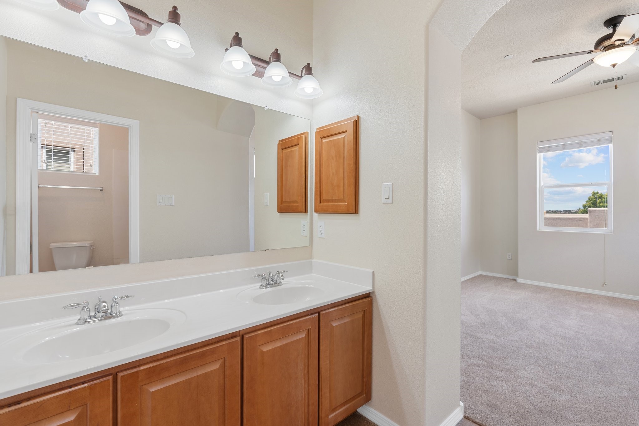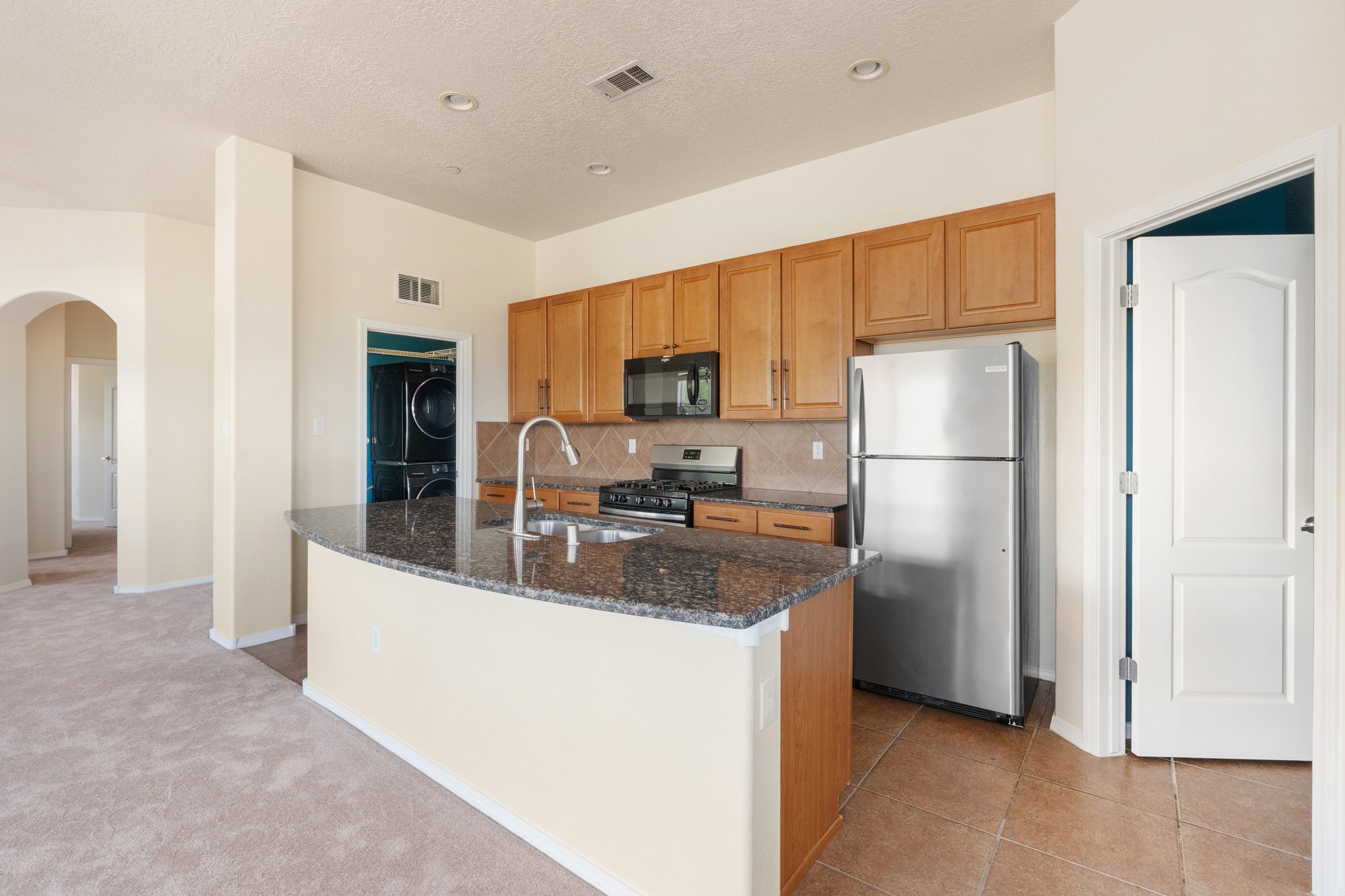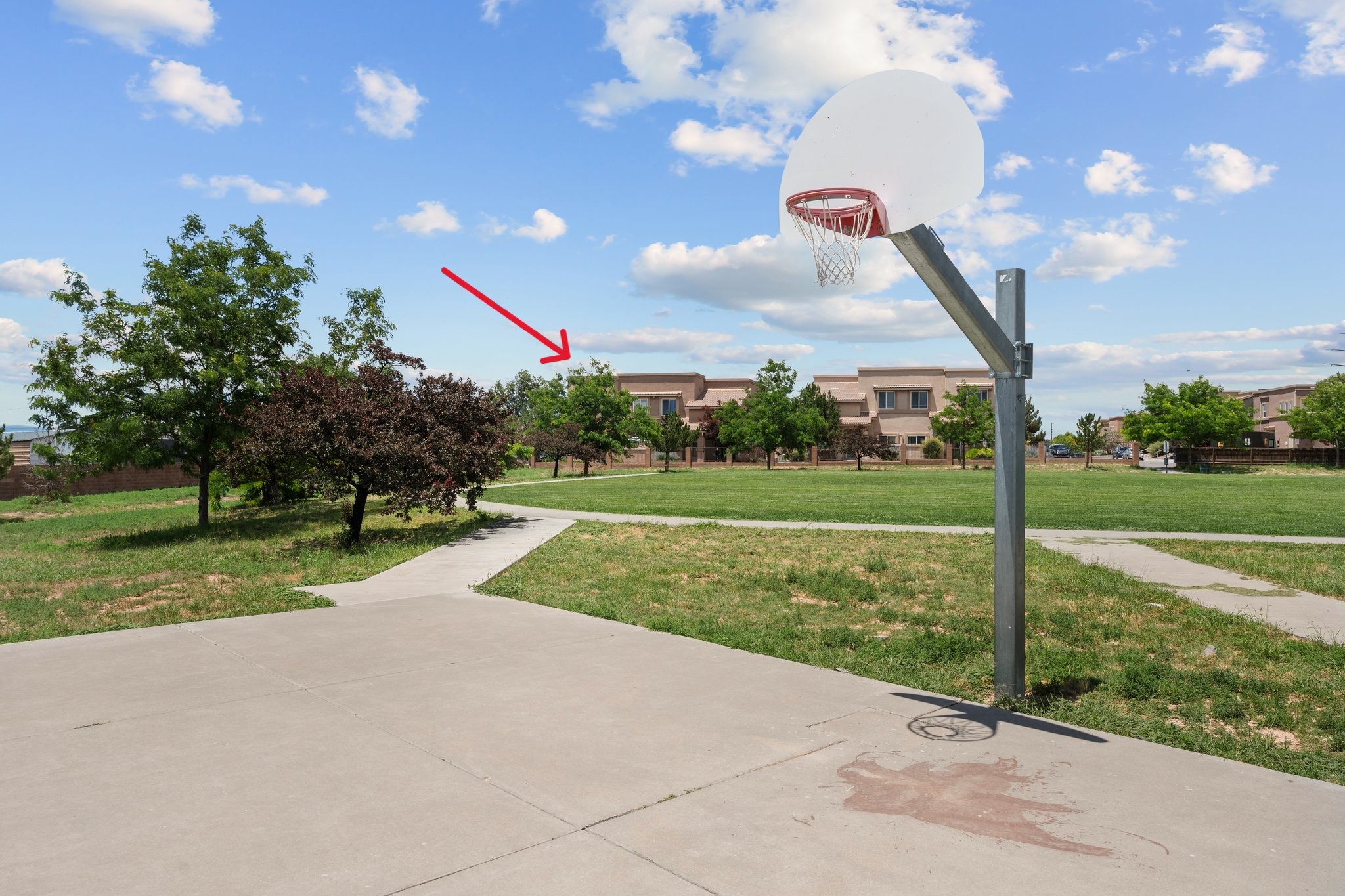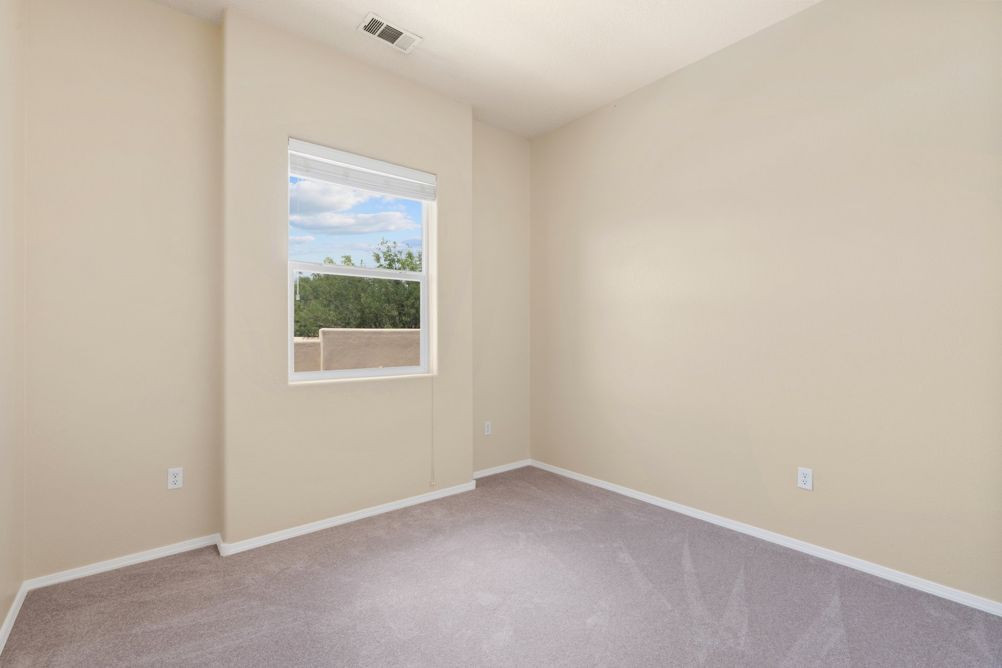 Bright, Spacious Condo with Park Access & Sunset Views! This beautifully maintained 2-bedroom, 2-bath upstairs condo offers stylish comfort, thoughtful design, and a prime location. Once upstairs, you'll find a spacious single-level layout with soaring ceilings and an abundance of natural light throughout. The heart of the home is the open-concept living, dining, and kitchen area, perfect for everyday living and entertaining. The kitchen features generous counter space, a large walk-in pantry, and an adjacent laundry room for added convenience.The primary suite is a peaceful retreat, complete with a walk-in closet and an ensuite bath that includes a soaking tub and double vanity. The guest bedroom is also nicely sized with large closets, ideal for visitors, home office use, or extra storage. Step on to the private balcony and enjoy sunset views, or explore the adjacent San Isidro Village Park, offering a jogging trail, basketball court, and playground--right next door. Additional features include new carpet, fresh paint, new HVAC (2023), updated appliances, and an attached 1-car garage with brand new opener. With a central location close to shopping and easy access to Santa Fe, Albuquerque, and Los Alamos, this turnkey home checks all the boxes for convenience, comfort, and lifestyle.