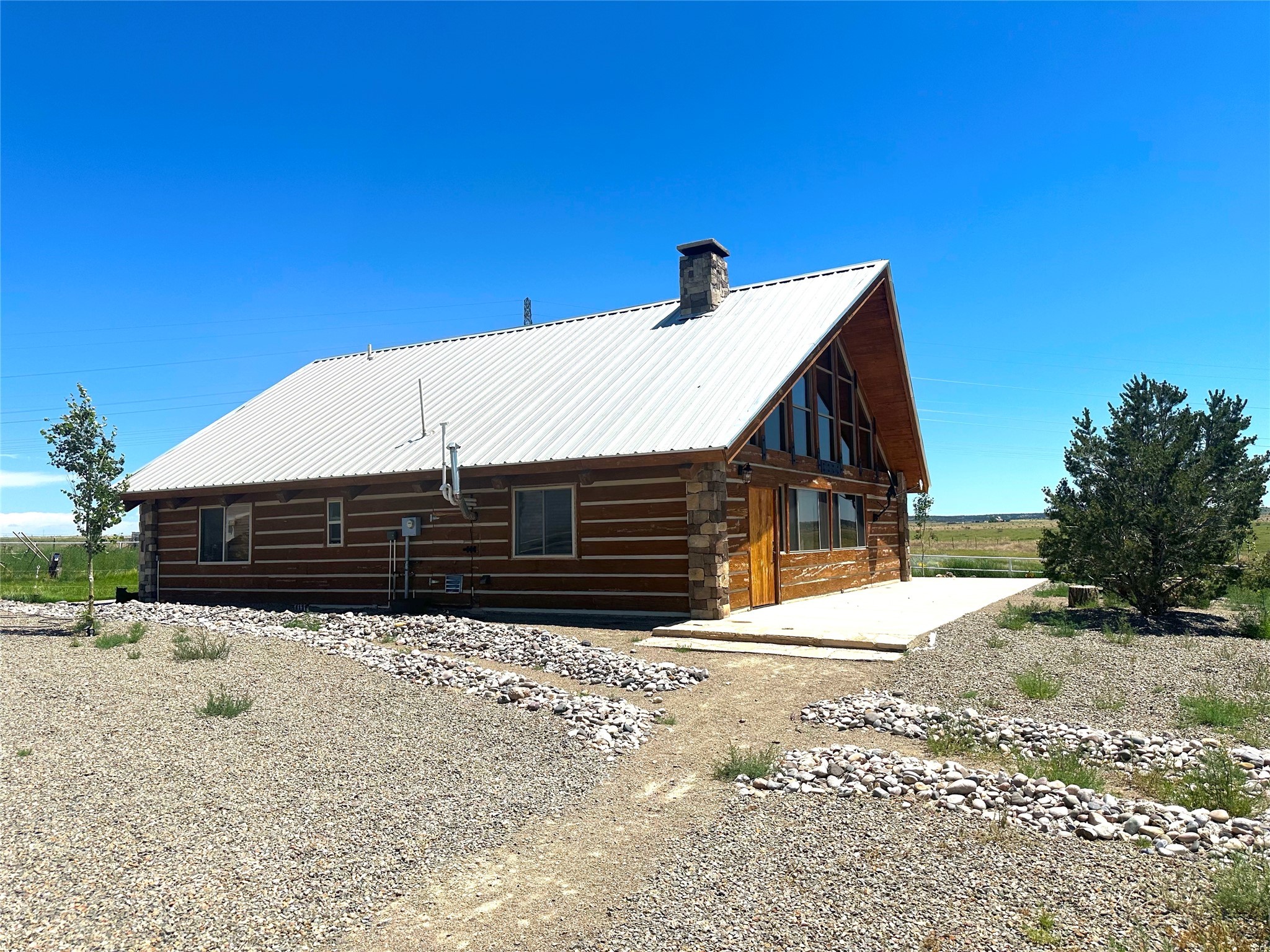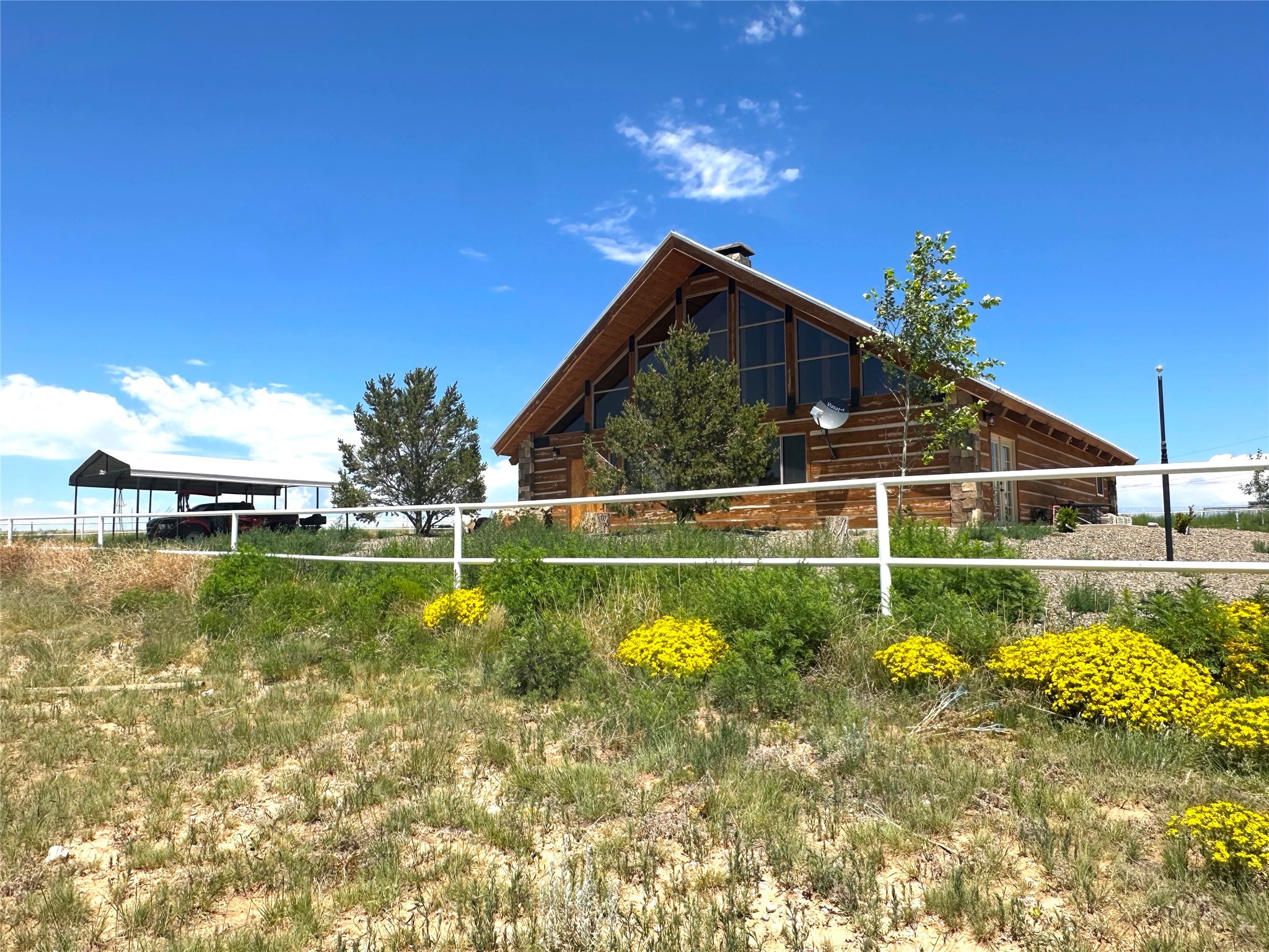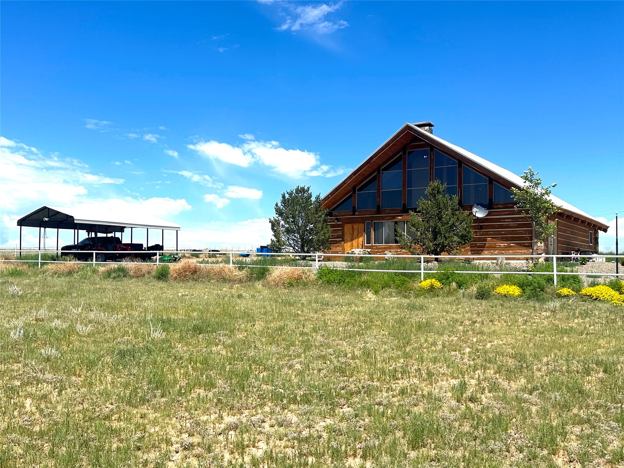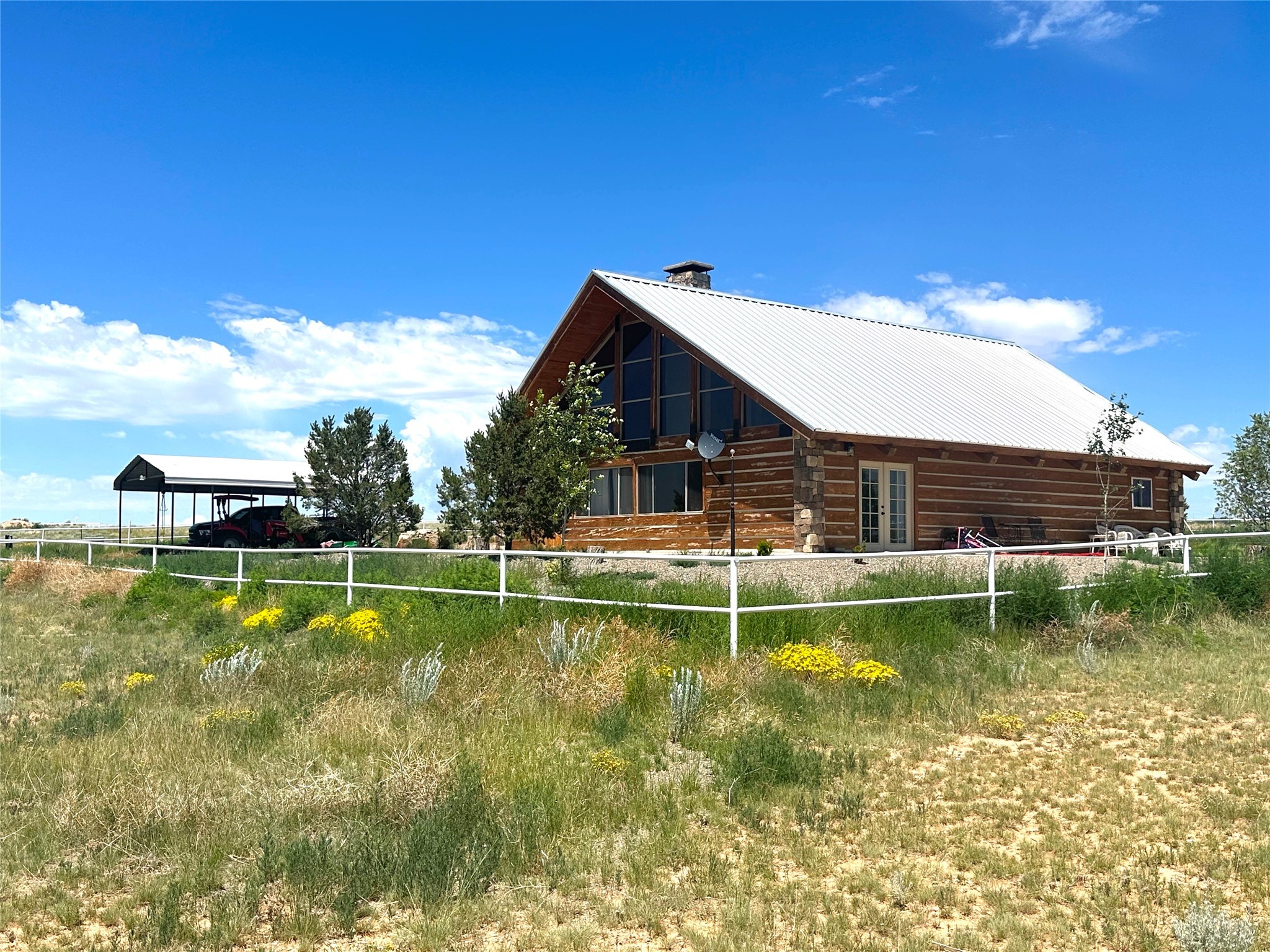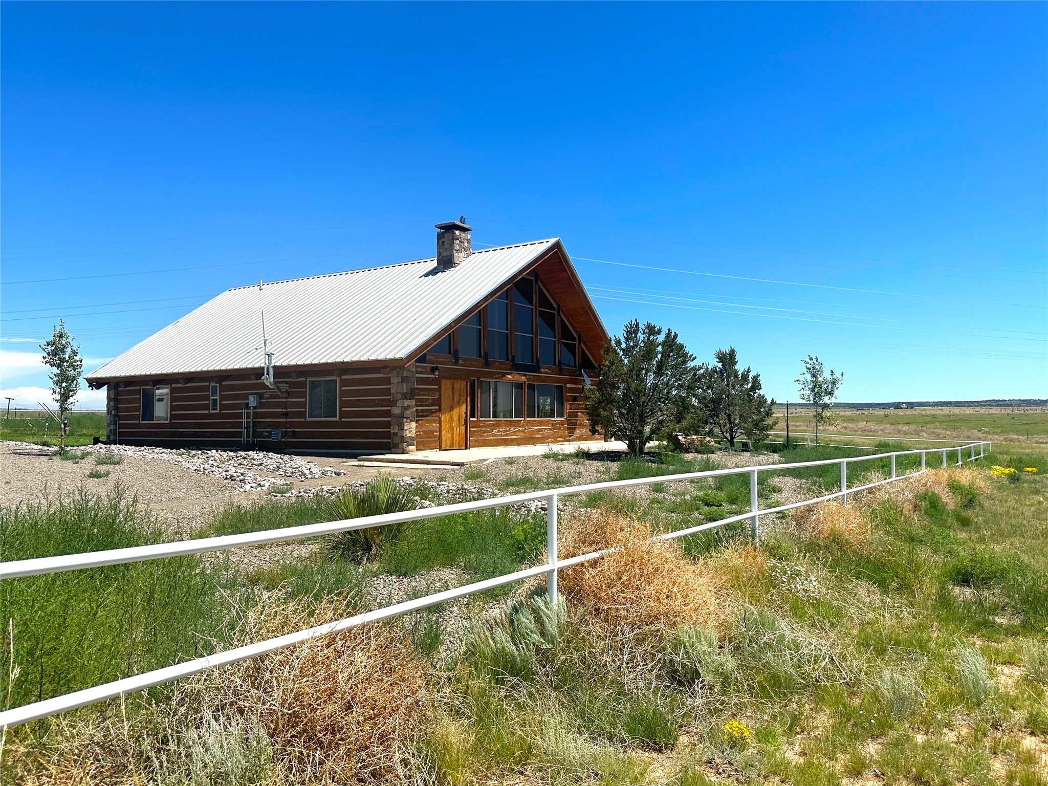 This two-story, 2,477 sq ft log cabin sits on 10 flat, usable acres in the open grasslands of Stanley, just 50 minutes from Santa Fe. The home features vaulted ceilings, modern finishes, and a practical layout with 3 bedrooms and 3 full bathrooms. The main level includes a primary suite with ensuite bath, a second full guest bath, an updated kitchen, and a central living area with a two-way fireplace and radiant floor heating. South-facing windows provide abundant natural light and support passive solar. Upstairs, a loft-style landing leads to two additional bedrooms and a full bathroom. A covered carport offers sheltered parking and extra storage. The surrounding acreage is open and accessible, with wide-ranging views in every direction. Whether you're looking for a full-time residence or a comfortable retreat from the city, this property is ready to welcome you home.