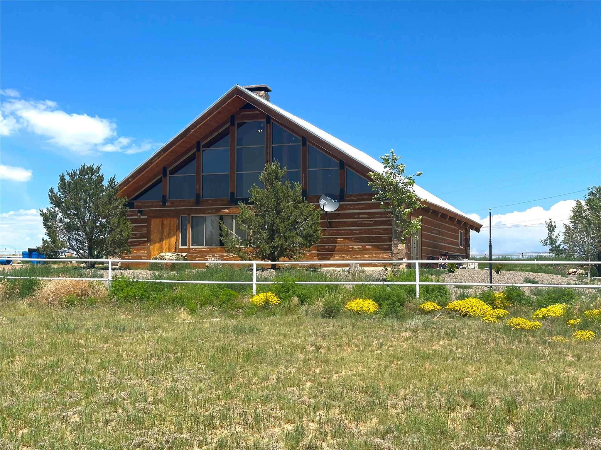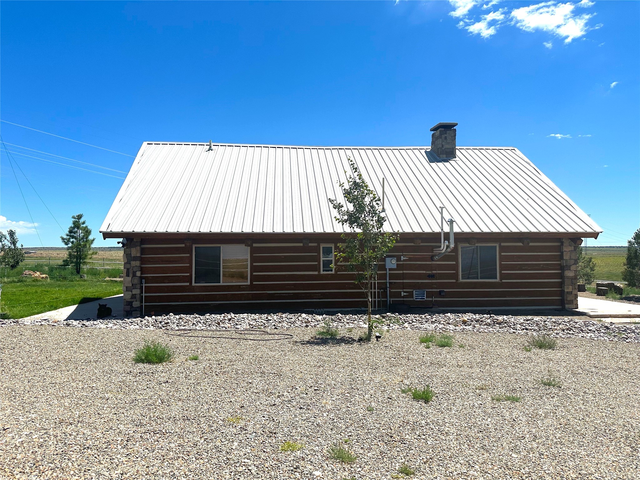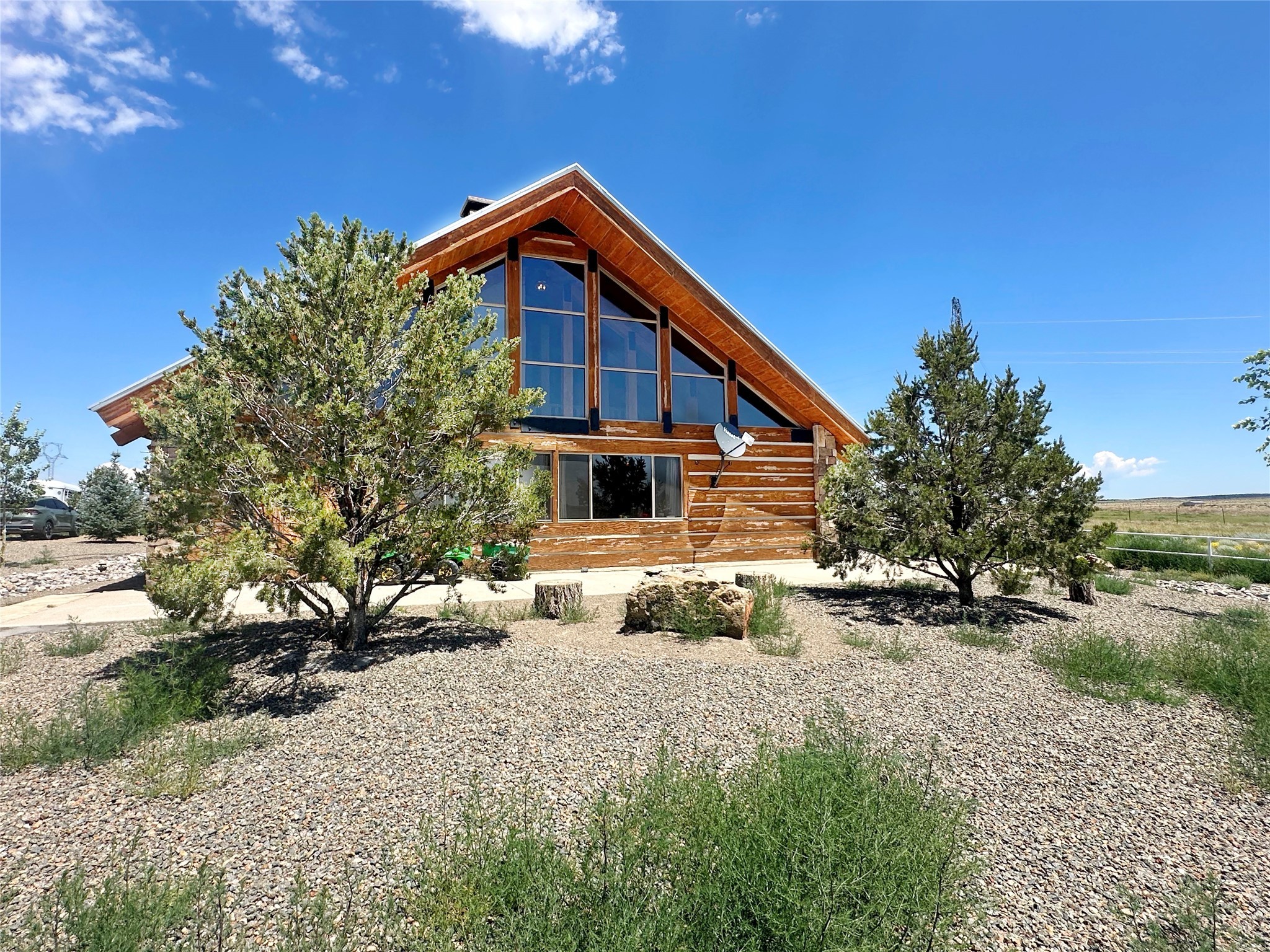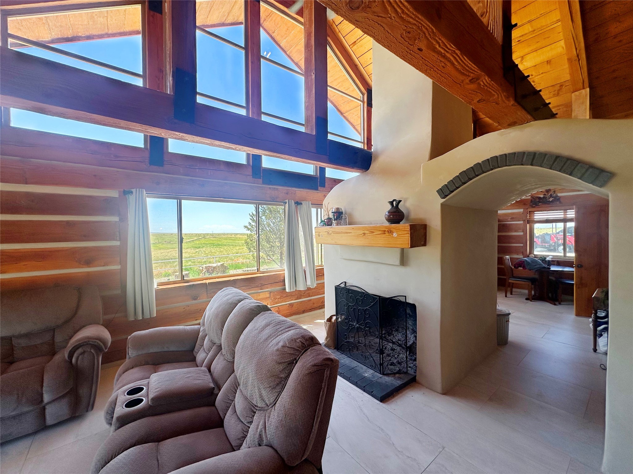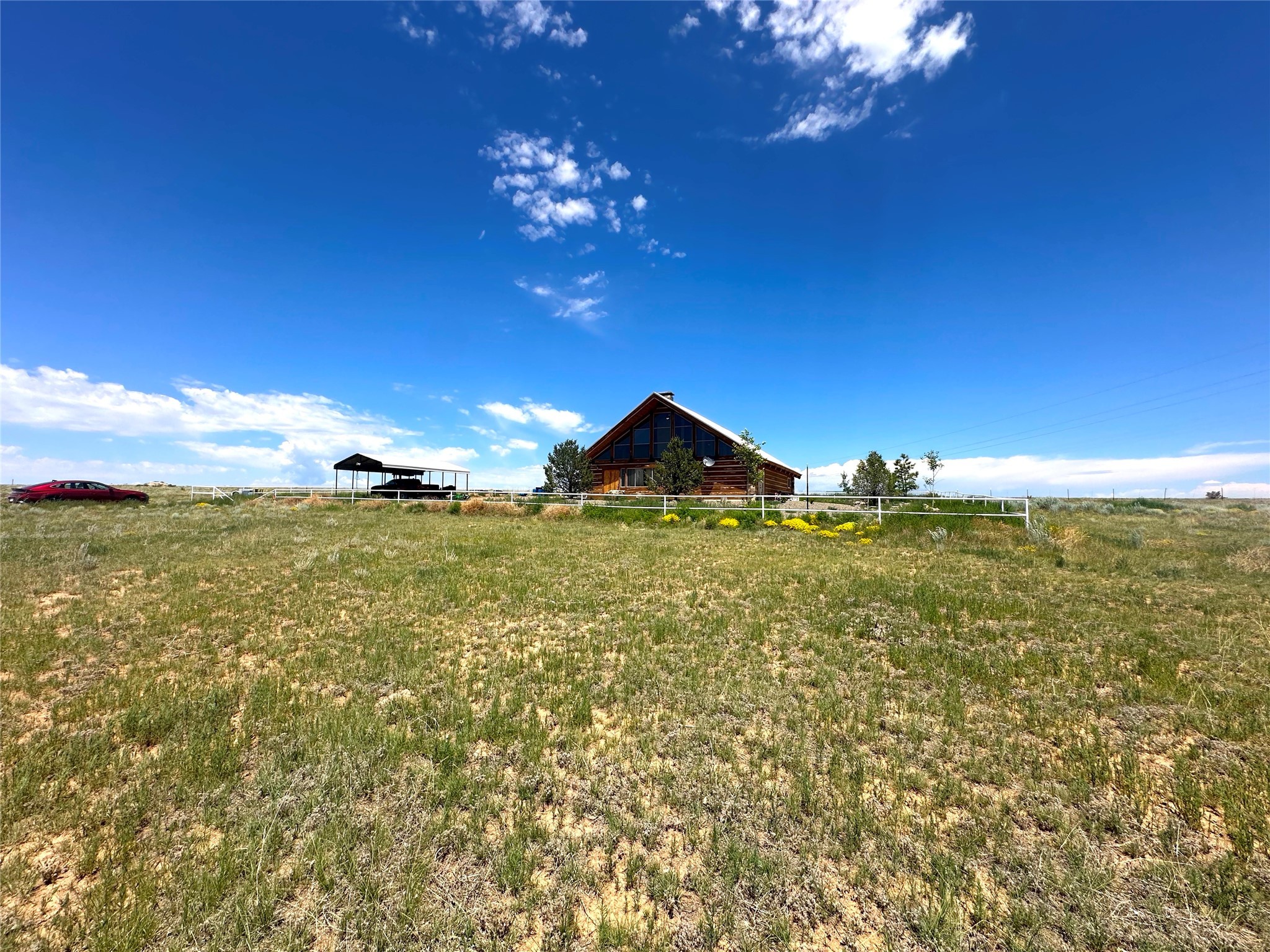 This two-story, 2,477 sq ft log cabin sits on 10 flat, usable acres in the open grasslands of Stanley, just 50 minutes from Santa Fe. The home features vaulted ceilings, modern finishes, and a practical layout with 3 bedrooms and 3 full bathrooms. The main level includes a primary suite with ensuite bath, a second full guest bath, an updated kitchen, and a central living area with a two-way fireplace and radiant floor heating. South-facing windows provide abundant natural light and support passive solar. Upstairs, a loft-style landing leads to two additional bedrooms and a full bathroom. A covered carport offers sheltered parking and extra storage. The surrounding acreage is open and accessible, with wide-ranging views in every direction. Whether you're looking for a full-time residence or a comfortable retreat from the city, this property is ready to welcome you home.