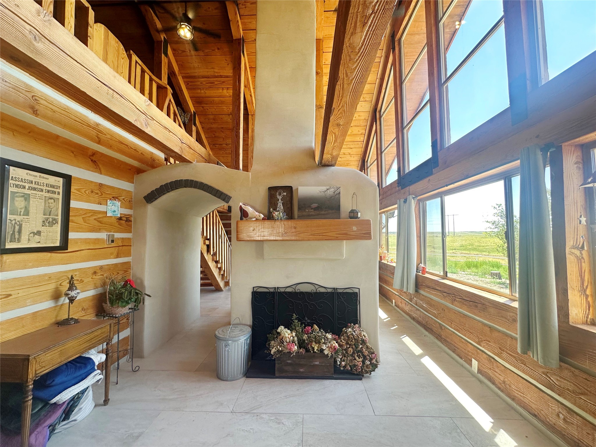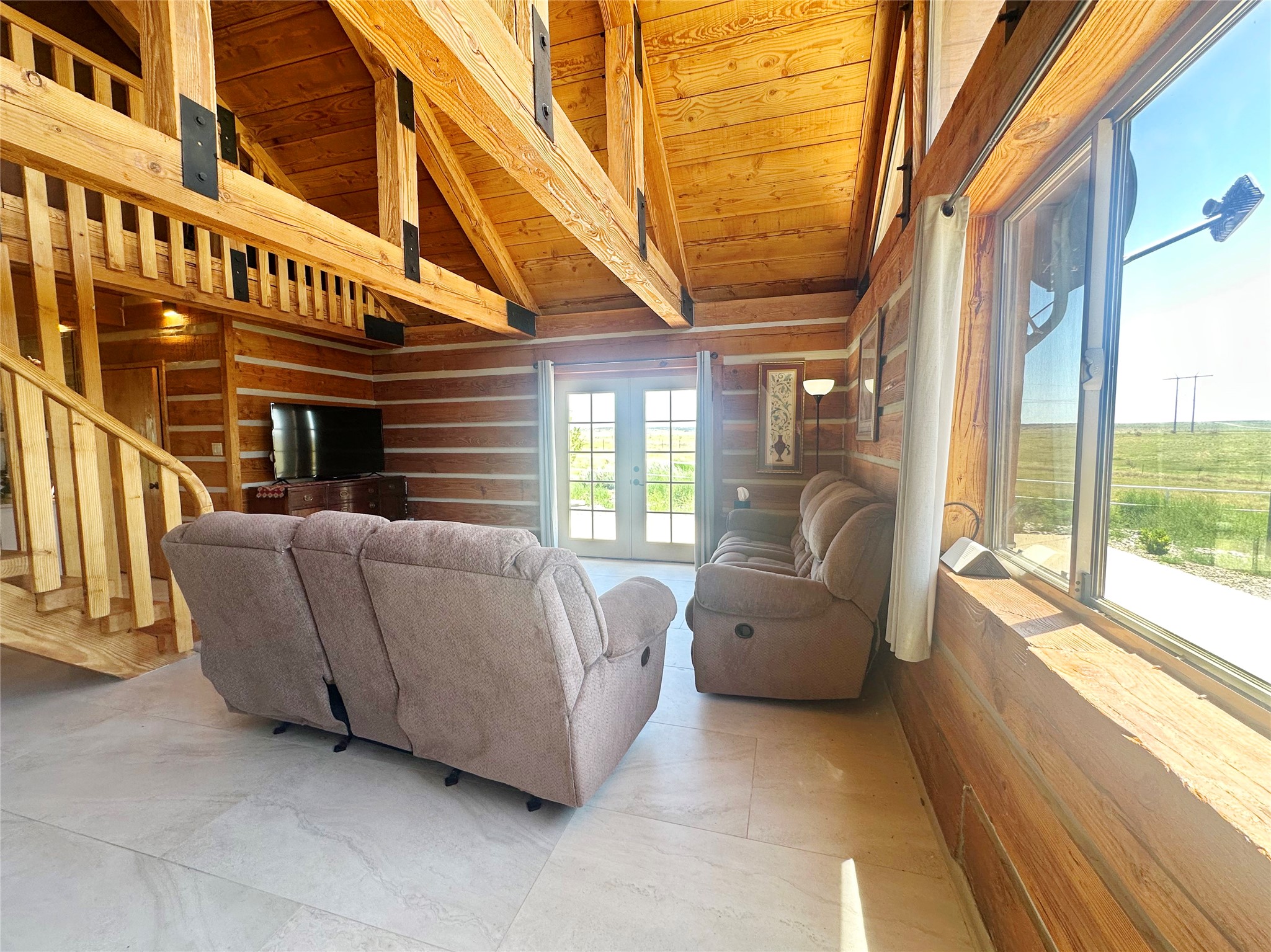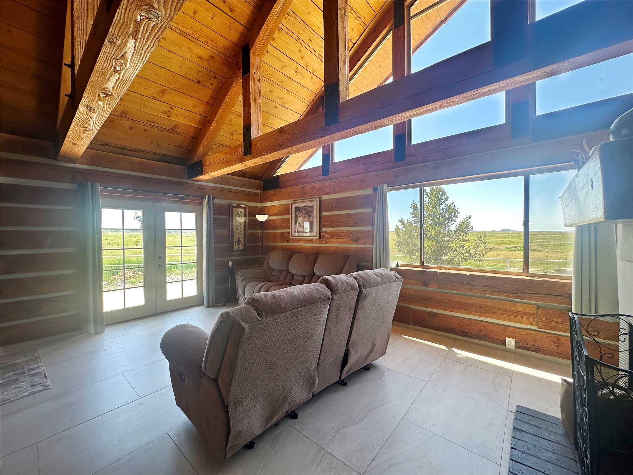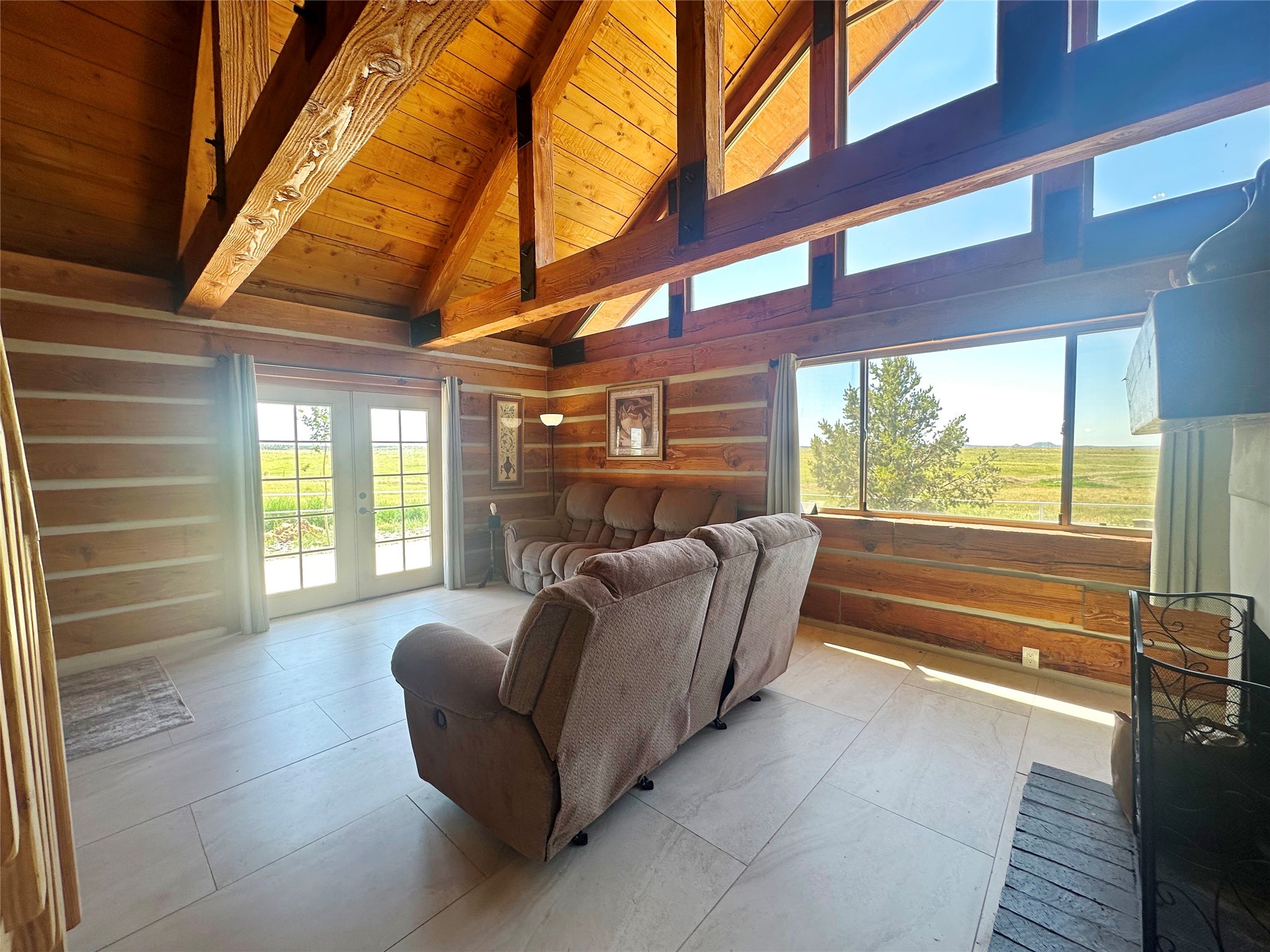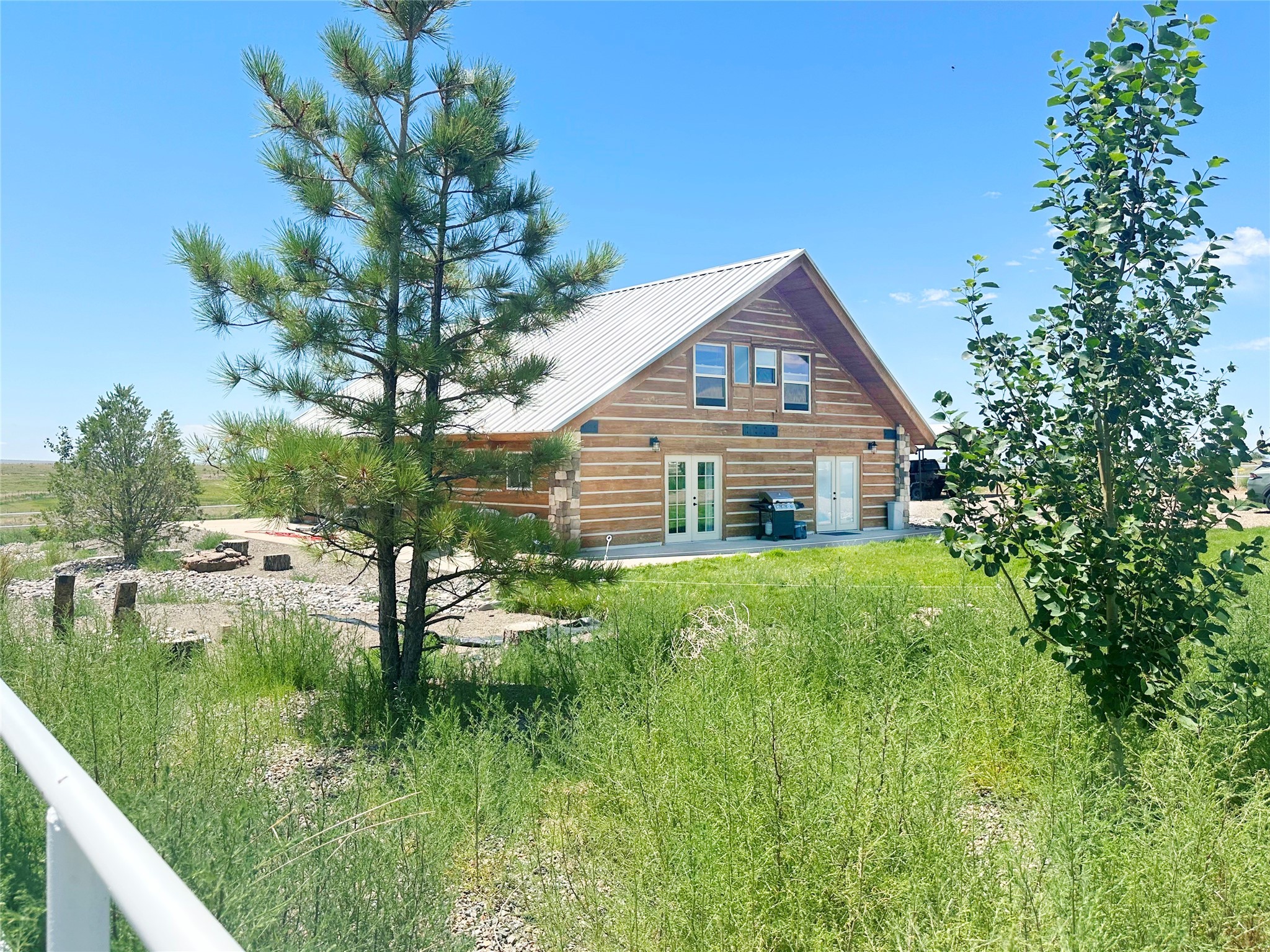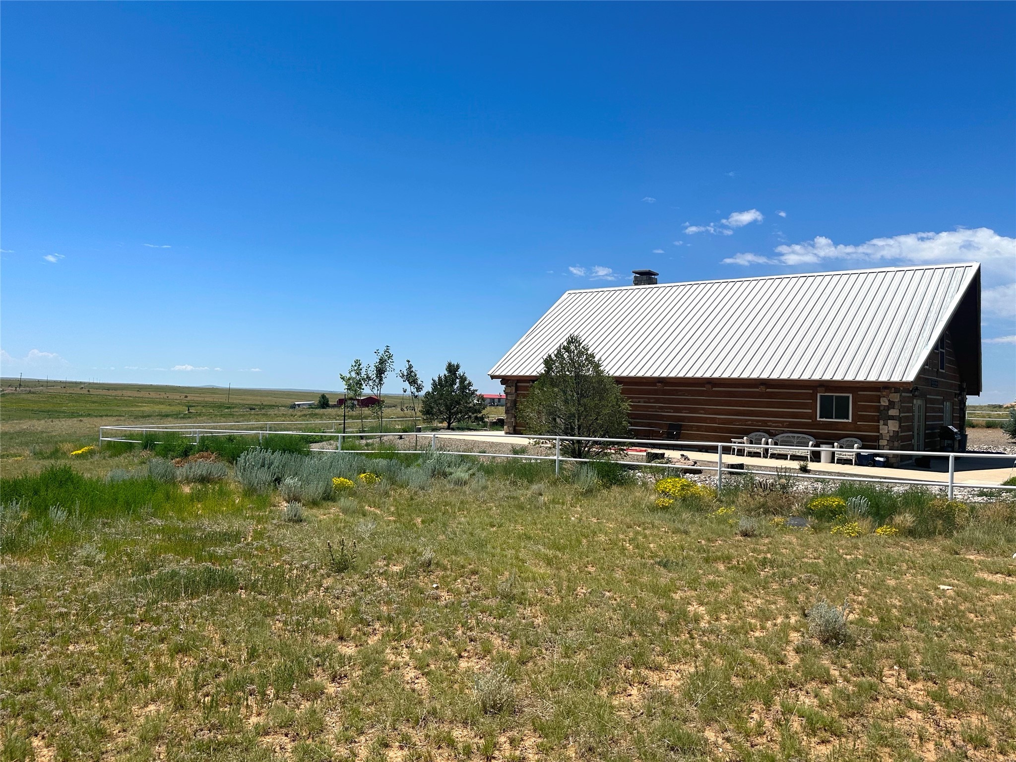 This two-story, 2,477 sq ft log cabin sits on 10 flat, usable acres in the open grasslands of Stanley, just 50 minutes from Santa Fe. The home features vaulted ceilings, modern finishes, and a practical layout with 3 bedrooms and 3 full bathrooms. The main level includes a primary suite with ensuite bath, a second full guest bath, an updated kitchen, and a central living area with a two-way fireplace and radiant floor heating. South-facing windows provide abundant natural light and support passive solar. Upstairs, a loft-style landing leads to two additional bedrooms and a full bathroom. A covered carport offers sheltered parking and extra storage. The surrounding acreage is open and accessible, with wide-ranging views in every direction. Whether you're looking for a full-time residence or a comfortable retreat from the city, this property is ready to welcome you home.