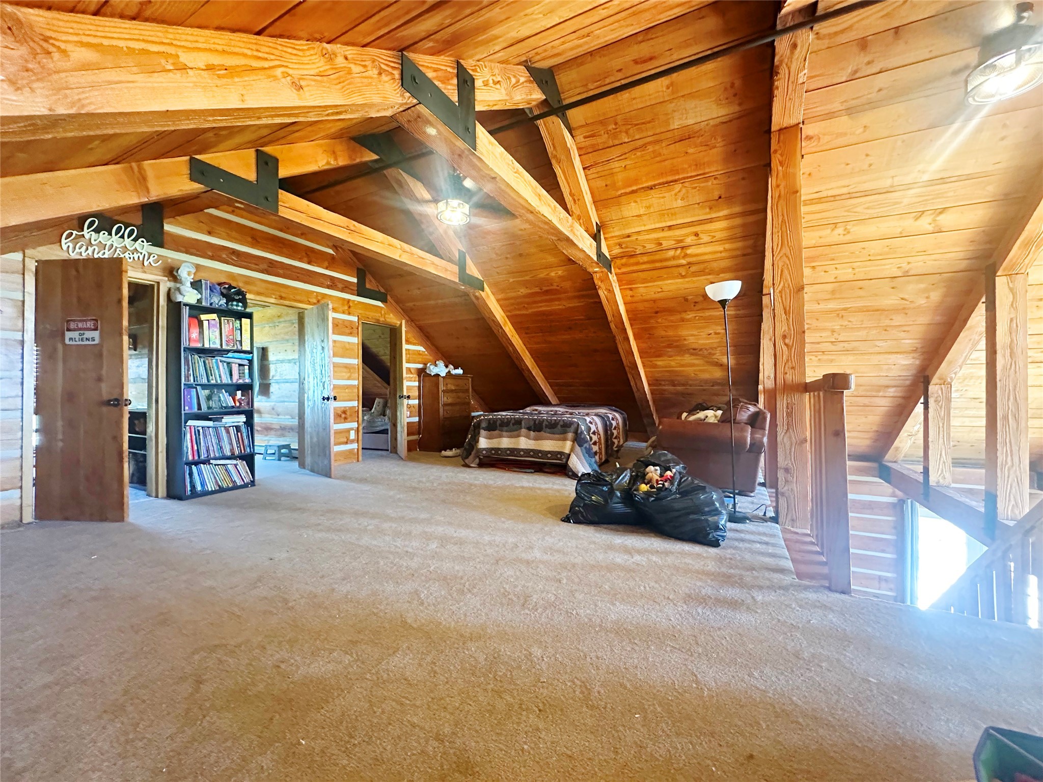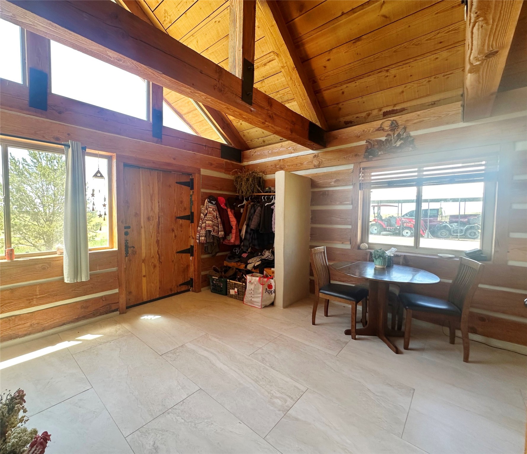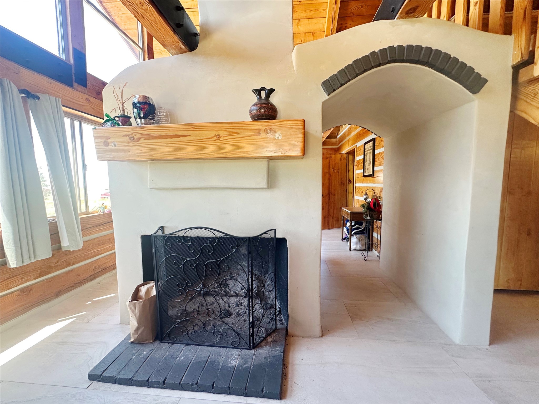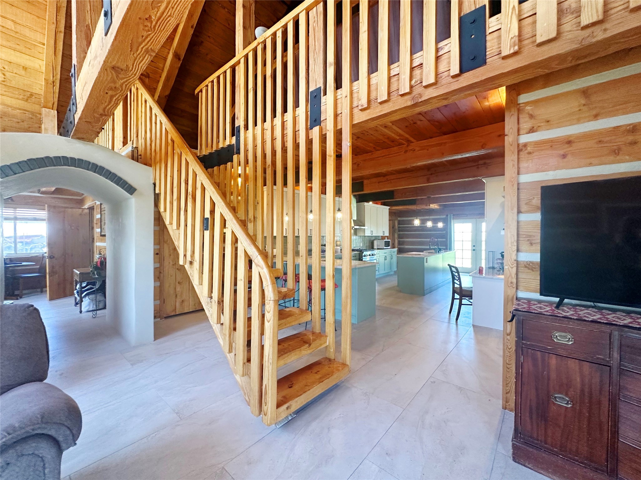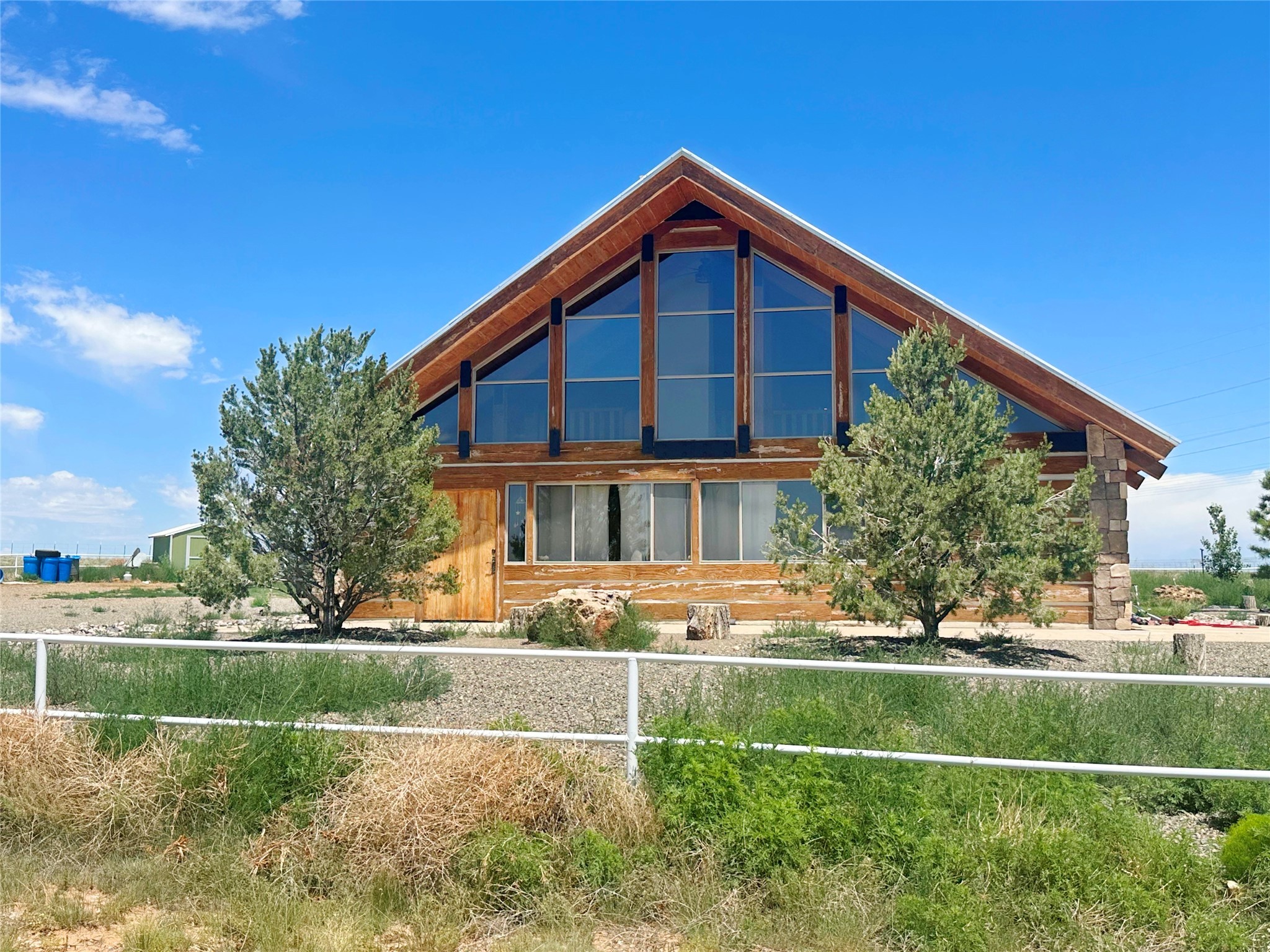 This two-story, 2,477 sq ft log cabin sits on 10 flat, usable acres in the open grasslands of Stanley, just 50 minutes from Santa Fe. The home features vaulted ceilings, modern finishes, and a practical layout with 3 bedrooms and 3 full bathrooms. The main level includes a primary suite with ensuite bath, a second full guest bath, an updated kitchen, and a central living area with a two-way fireplace and radiant floor heating. South-facing windows provide abundant natural light and support passive solar. Upstairs, a loft-style landing leads to two additional bedrooms and a full bathroom. A covered carport offers sheltered parking and extra storage. The surrounding acreage is open and accessible, with wide-ranging views in every direction. Whether you're looking for a full-time residence or a comfortable retreat from the city, this property is ready to welcome you home.