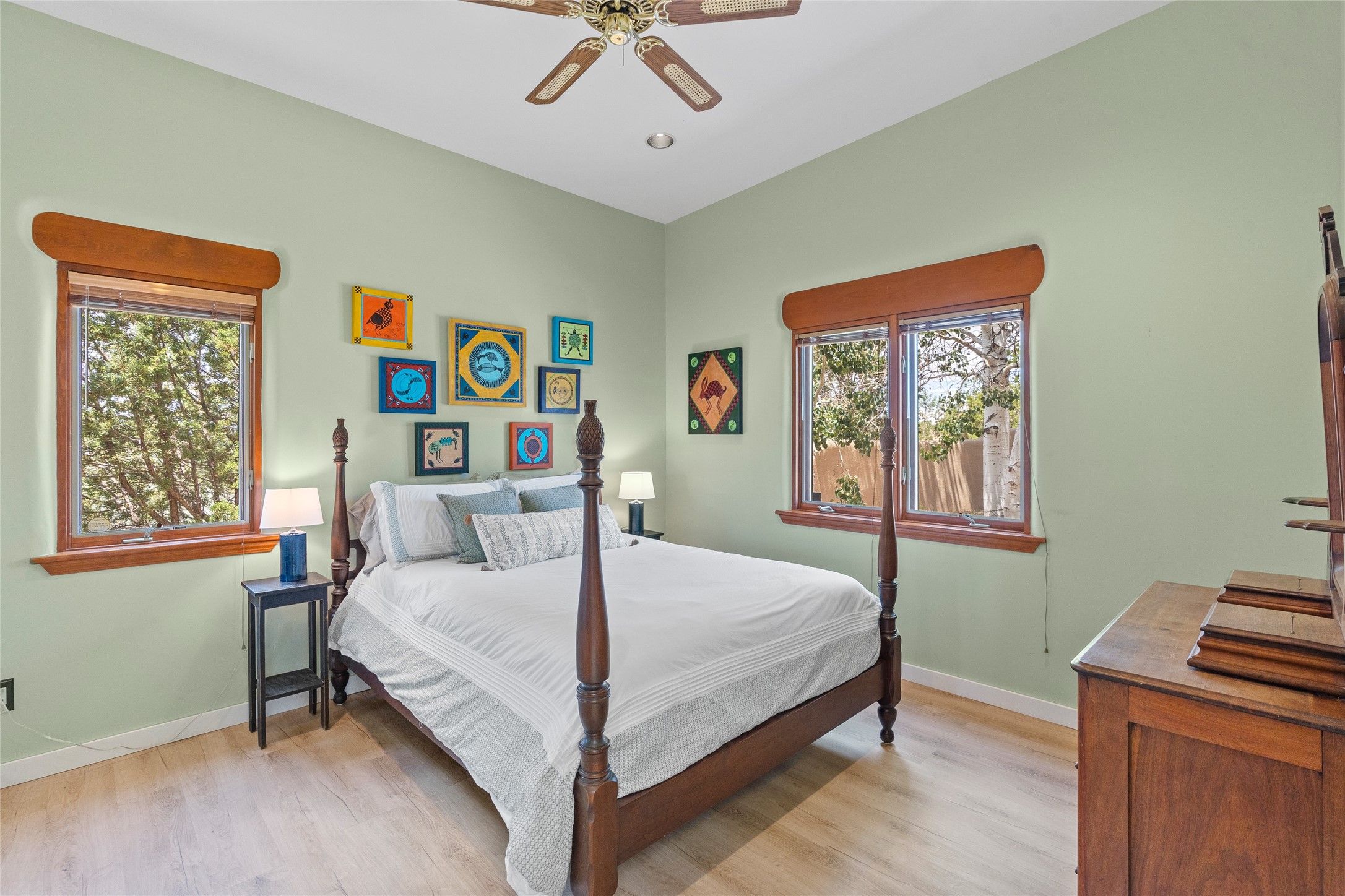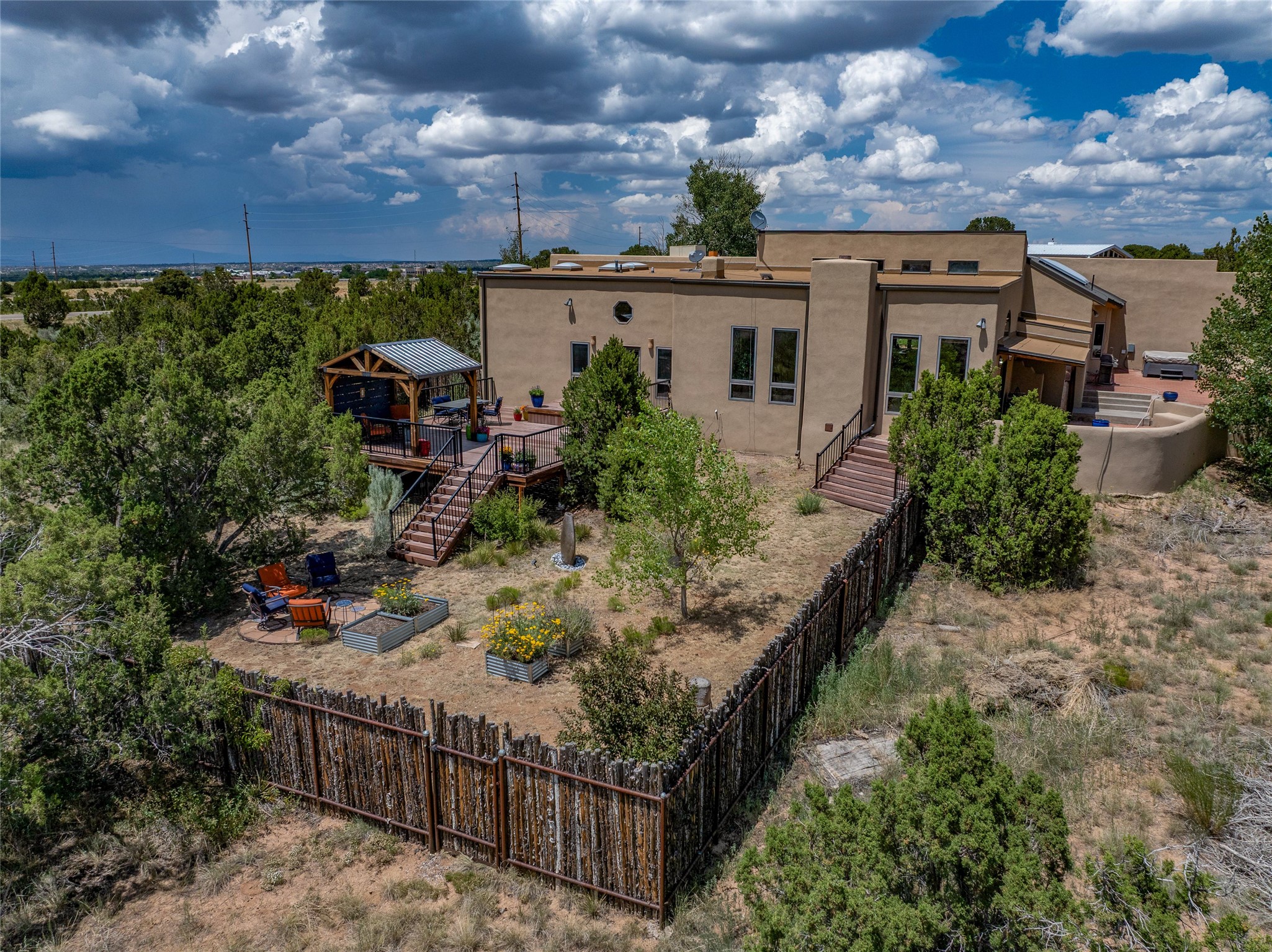 Just 10 minutes from downtown Santa Fe, this 3,255 sq. ft. 4-bedroom, 2.5-bath home on 2.5 acres offers the perfect blend of country living and city convenience. With a private well, a 3-car garage plus storage area, and rich Southwestern character, this one-of-a-kind property is a peaceful retreat with personality and presence. Step inside to soaring spaces and abundant natural light. The open-concept living, kitchen, and dining areas are unified yet distinct, each defined by vaulted ceilings and architectural detail. The main living room--anchored by a striking fireplace--features 14-foot viga ceilings and generous windows that fill the space with natural light. The formal dining room, with its vaulted ceiling of vigas and latillas, is illuminated by dramatic clerestory windows. A raised kiva fireplace creates a warm connection between the dining room and kitchen. The kitchen is both vibrant and functional, featuring a vaulted, beamed ceiling, extensive countertops, a central cooking island with bar seating, and a colorful half-circle stained glass window that echoes the kitchen's playful palette. A connected breakfast nook offers the perfect spot for casual dining. The spacious primary suite is a private sanctuary with soaring ceilings, a floor-to-ceiling kiva fireplace, and a 650 sq. ft. private deck with a cozy gazebo for relaxing outdoors. The ensuite bath features high ceilings, vivid blue tile, and a dramatic walk-in shower that feels like a personal spa. The guest wing offers three additional bedrooms--one currently serving as a game room with a pool table--and a beautifully updated full bathroom.With privacy, style, and unmistakable Southwestern charm, this exceptional property is a rare opportunity just minutes from the heart of Santa Fe.