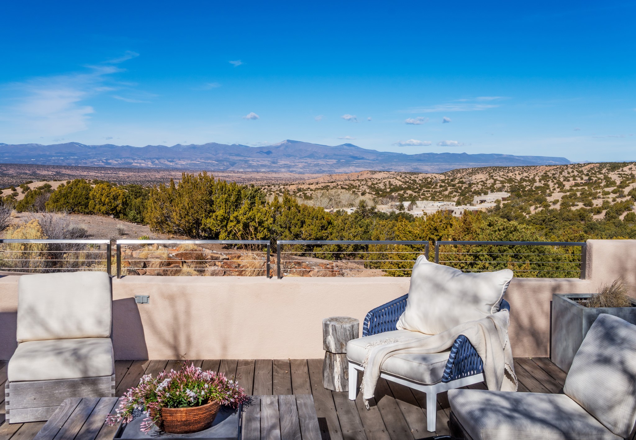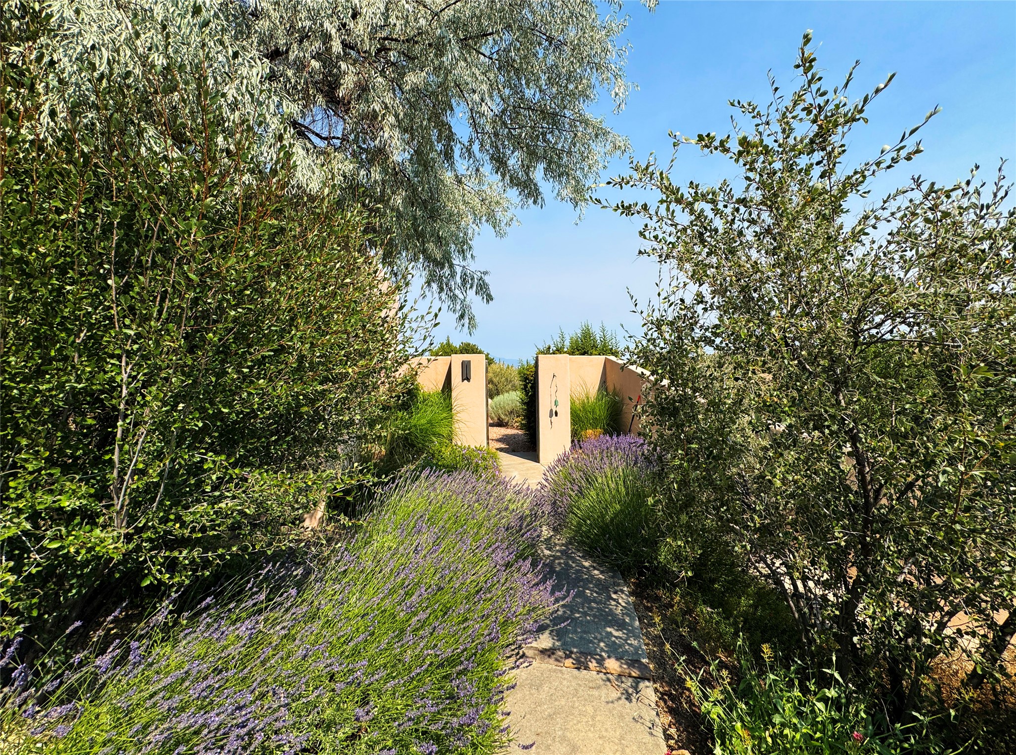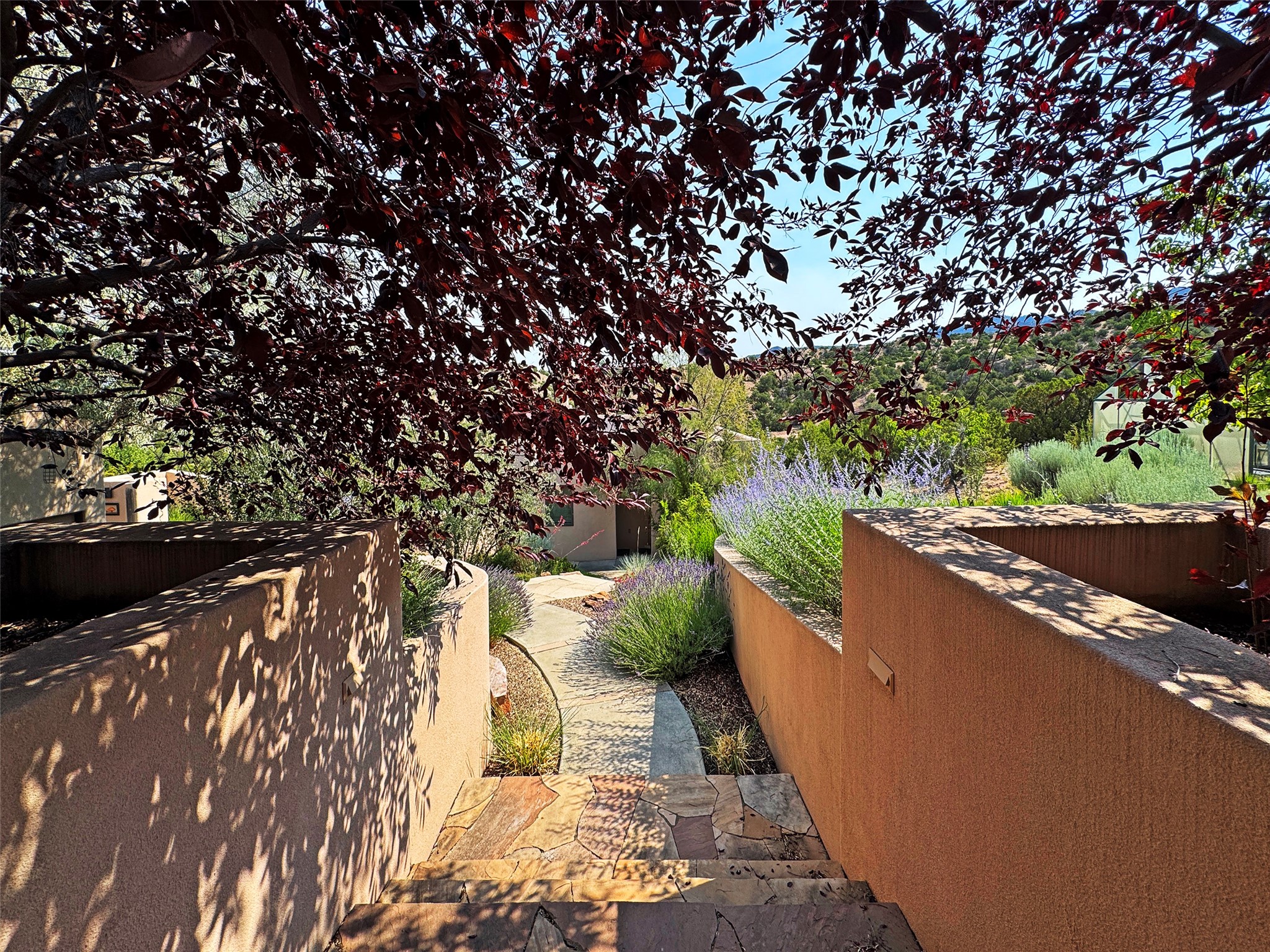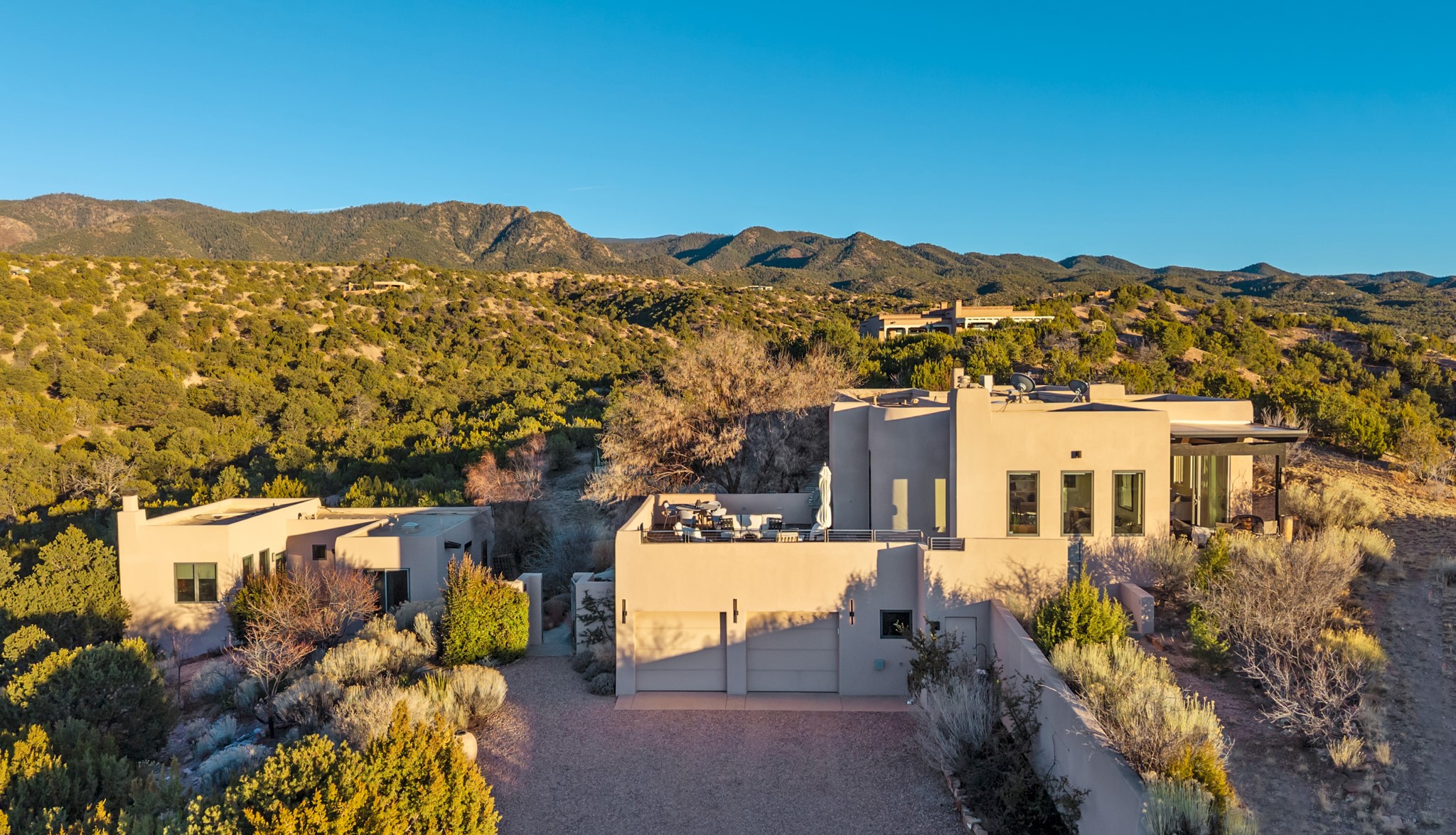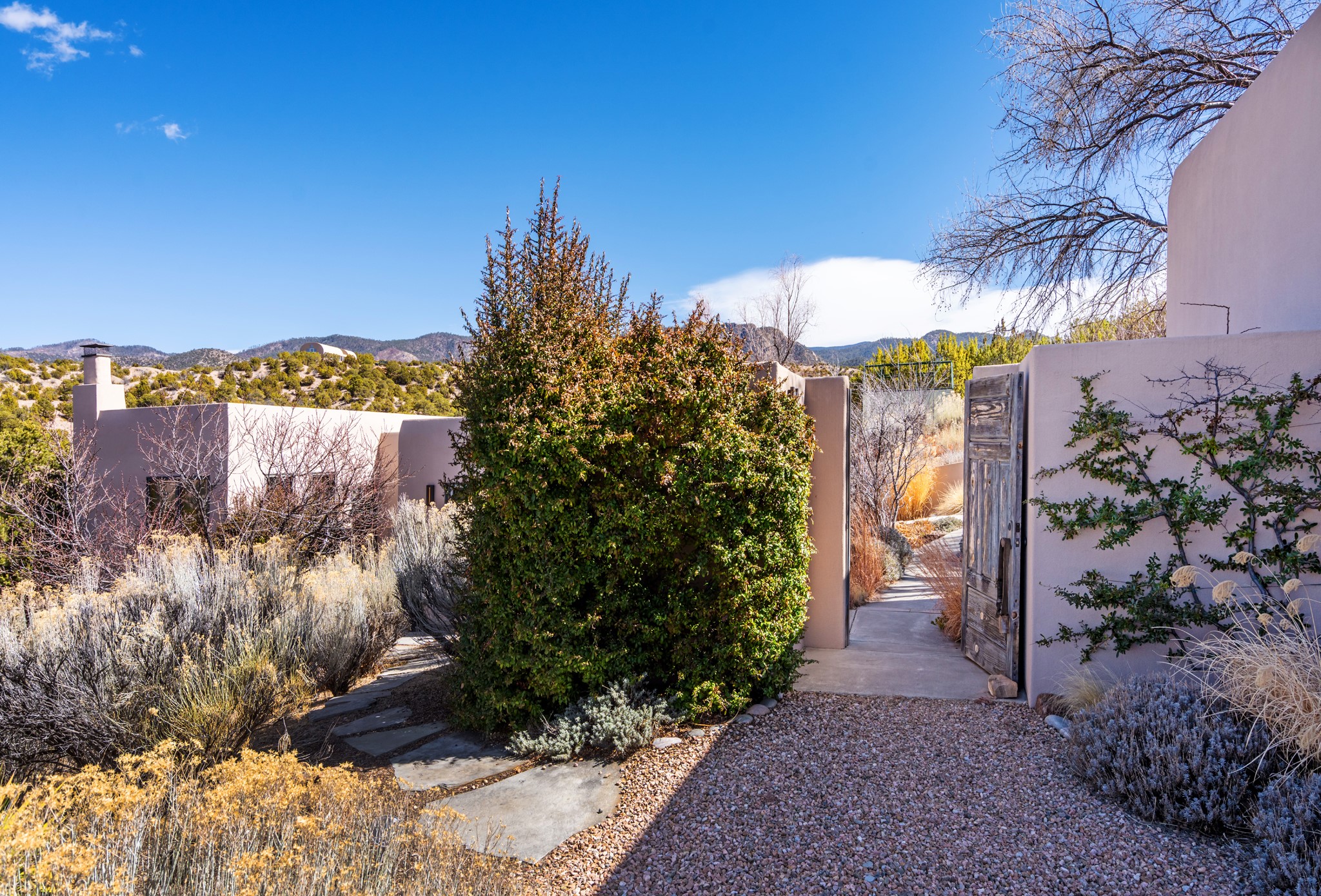 This refined main house and privatecasitais set high in the rolling Tesuque foothills of the Sangre de Cristo Mountains.Extensively re-designed and guided by Feng Shui principles so that energy moves smoothly, the main house creates an immediatesense of calm and well-being, with cherrywoodfloors, rich surfaces and fine details.A quiet retreat with serene spaces sets youinside the landscape of atmospheric views that stay with you. Three patios offer a choice of light and spacethroughout the day. Effortless indoor-outdoor living can be enjoyed from sunrise to sunset--this home welcomesbothquiet reflection andgreat hosting.The kitchen cabinetry and other custom pieces were milled and hand made from a single walnut tree from Oregon by alocal artisan.The great room and den offer warmth and light, with curated views, and each open directly ontoits own outdoor space. The calming primary bedroom flows into a restorative, spa-like experience: From soaking tub to sauna toshower, then stepping outdoors to the hot tub for star gazing--an outdoor shower completes the experience. Next, thecharming 2-bedroom, 2-bath guest house, which is separated by gorgeous native plantings and fruit trees, has its own entrance and parking toprovide exceptional privacy and flexibility for guests. This home offers a rare balance of seclusion and access--equally suited as a lock-and-leave retreat or a primary residence. Serene and immersed in nature, yet minutes from The Four Seasons,Tesuque Village Market, El Nido, andapp. 15 minutes to the Plaza and the Santa Fe Opera. Gated Los Caminitos comprises 573-acres with mapped trails for residents, a clubhouse, pool, tennis and pickleball. There is a staircase from the garage to main level.