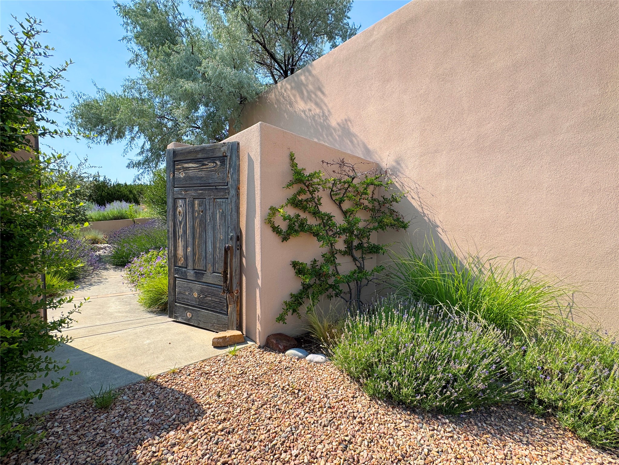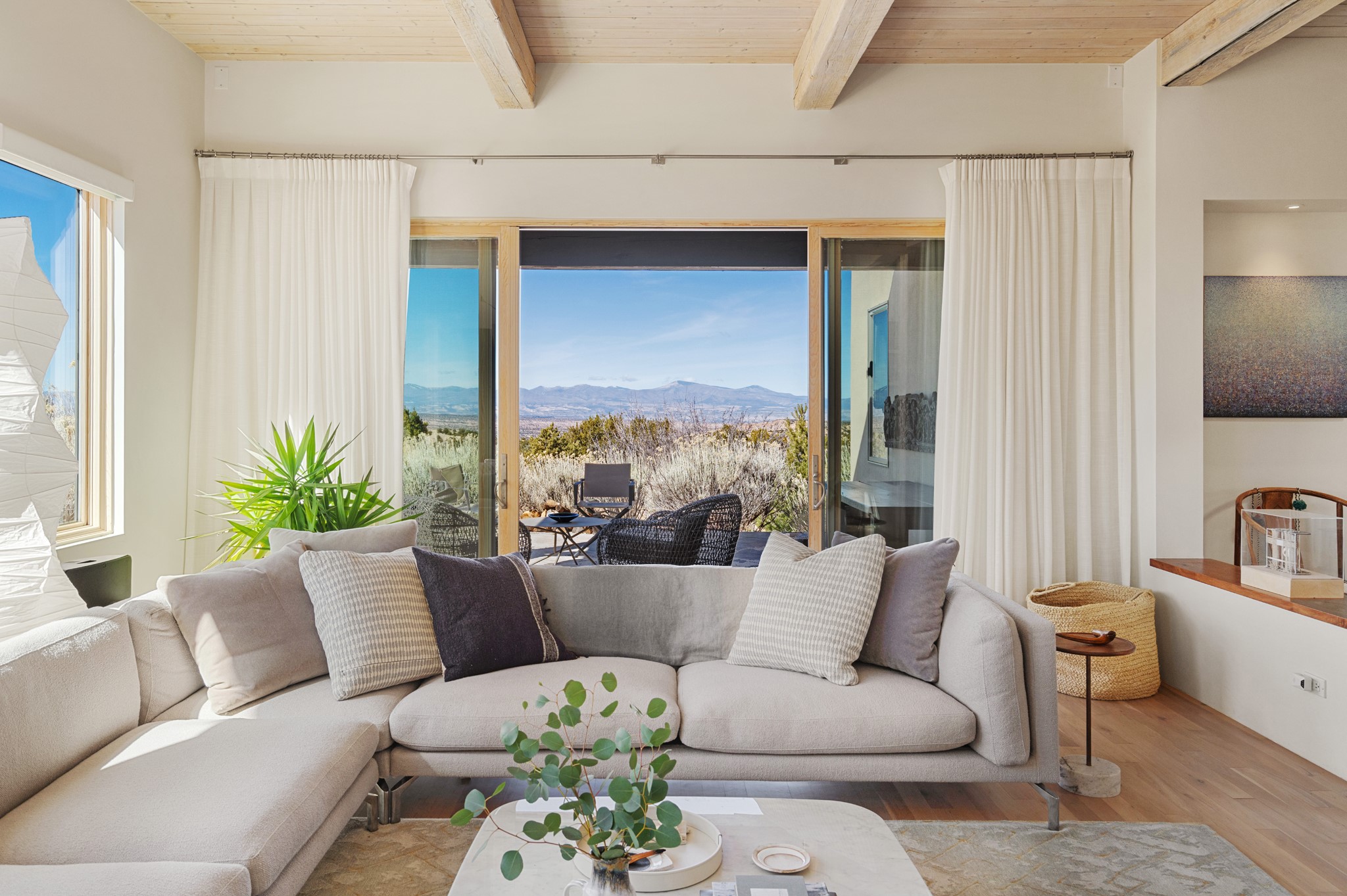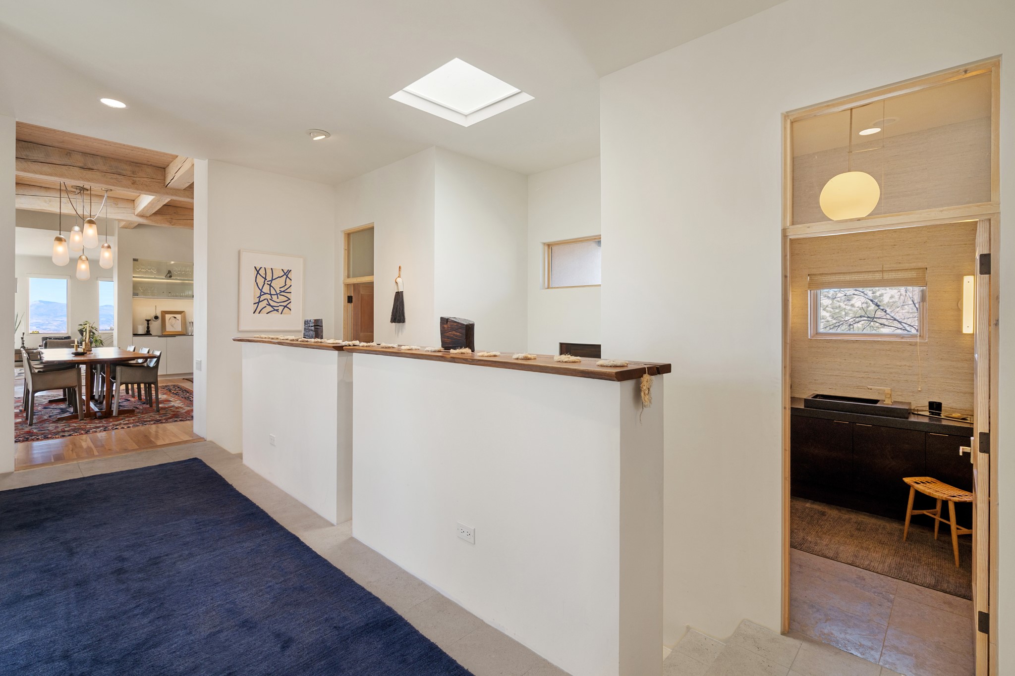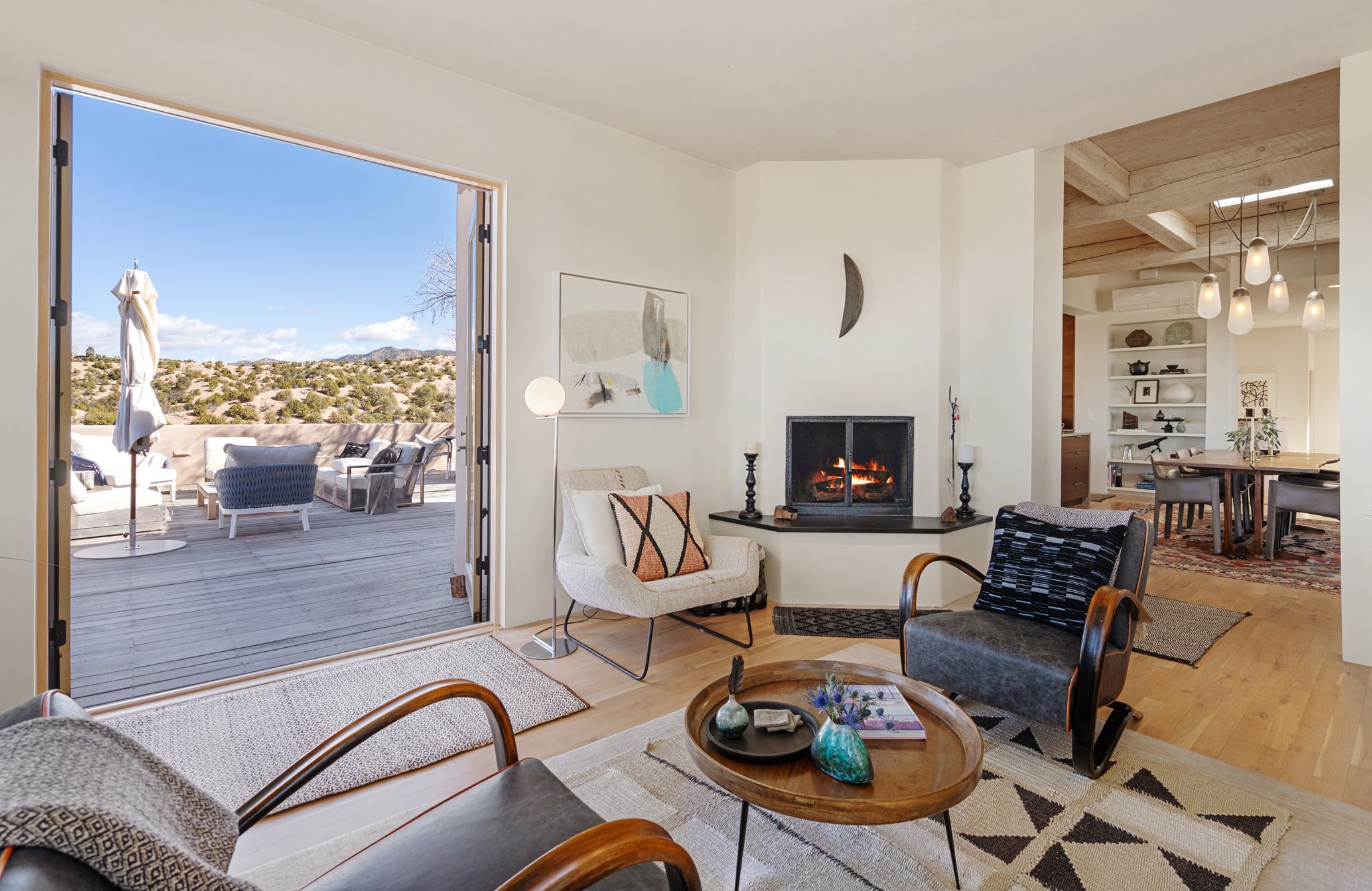 This refined main house and privatecasitais set high in the rolling Tesuque foothills of the Sangre de Cristo Mountains.Extensively re-designed and guided by Feng Shui principles so that energy moves smoothly, the main house creates an immediatesense of calm and well-being, with cherrywoodfloors, rich surfaces and fine details.A quiet retreat with serene spaces sets youinside the landscape of atmospheric views that stay with you. Three patios offer a choice of light and spacethroughout the day. Effortless indoor-outdoor living can be enjoyed from sunrise to sunset--this home welcomesbothquiet reflection andgreat hosting.The kitchen cabinetry and other custom pieces were milled and hand made from a single walnut tree from Oregon by alocal artisan.The great room and den offer warmth and light, with curated views, and each open directly ontoits own outdoor space. The calming primary bedroom flows into a restorative, spa-like experience: From soaking tub to sauna toshower, then stepping outdoors to the hot tub for star gazing--an outdoor shower completes the experience. Next, thecharming 2-bedroom, 2-bath guest house, which is separated by gorgeous native plantings and fruit trees, has its own entrance and parking toprovide exceptional privacy and flexibility for guests. This home offers a rare balance of seclusion and access--equally suited as a lock-and-leave retreat or a primary residence. Serene and immersed in nature, yet minutes from The Four Seasons,Tesuque Village Market, El Nido, andapp. 15 minutes to the Plaza and the Santa Fe Opera. Gated Los Caminitos comprises 573-acres with mapped trails for residents, a clubhouse, pool, tennis and pickleball. There is a staircase from the garage to main level.