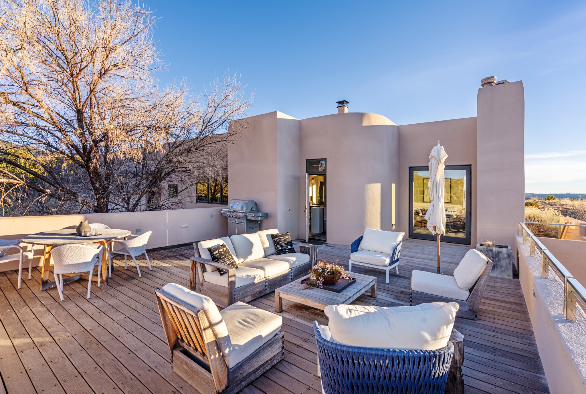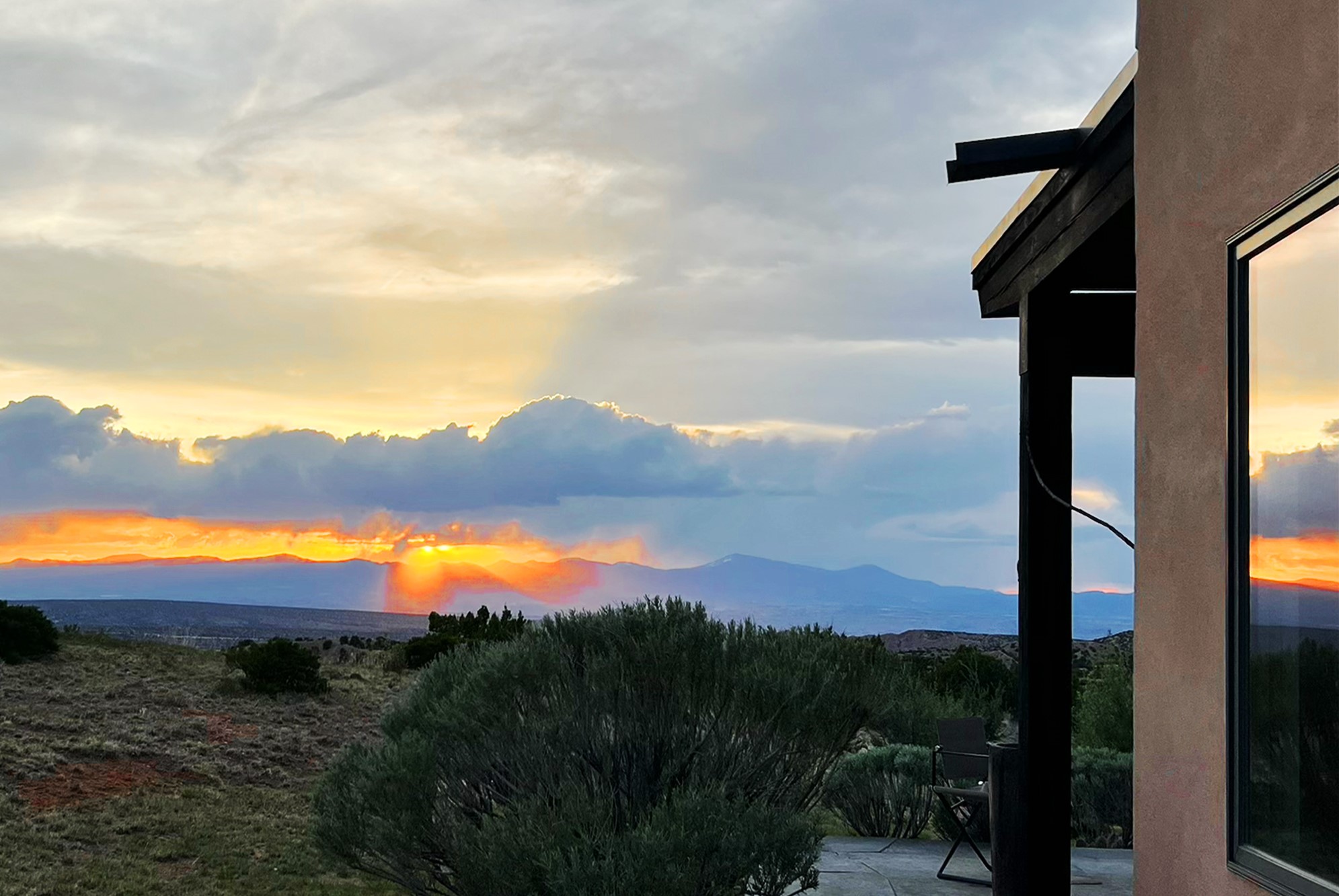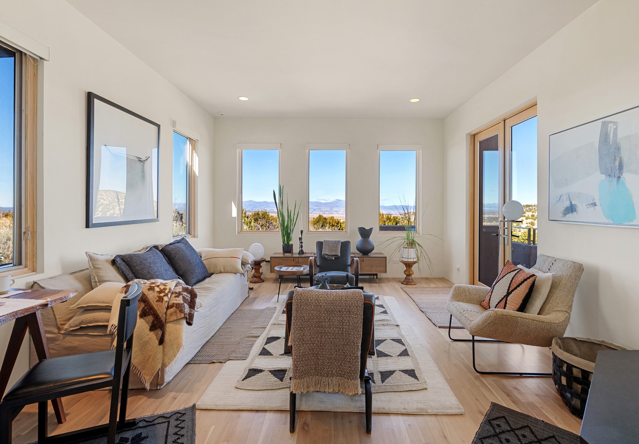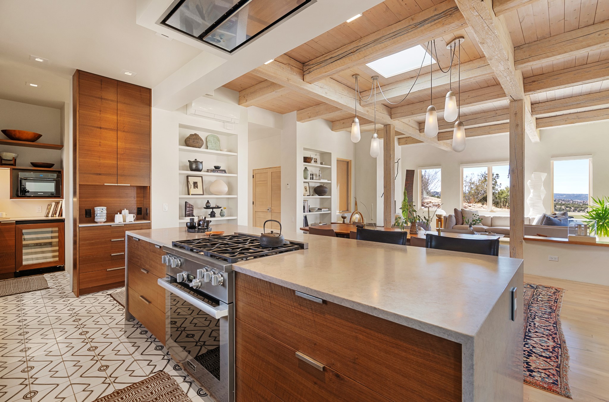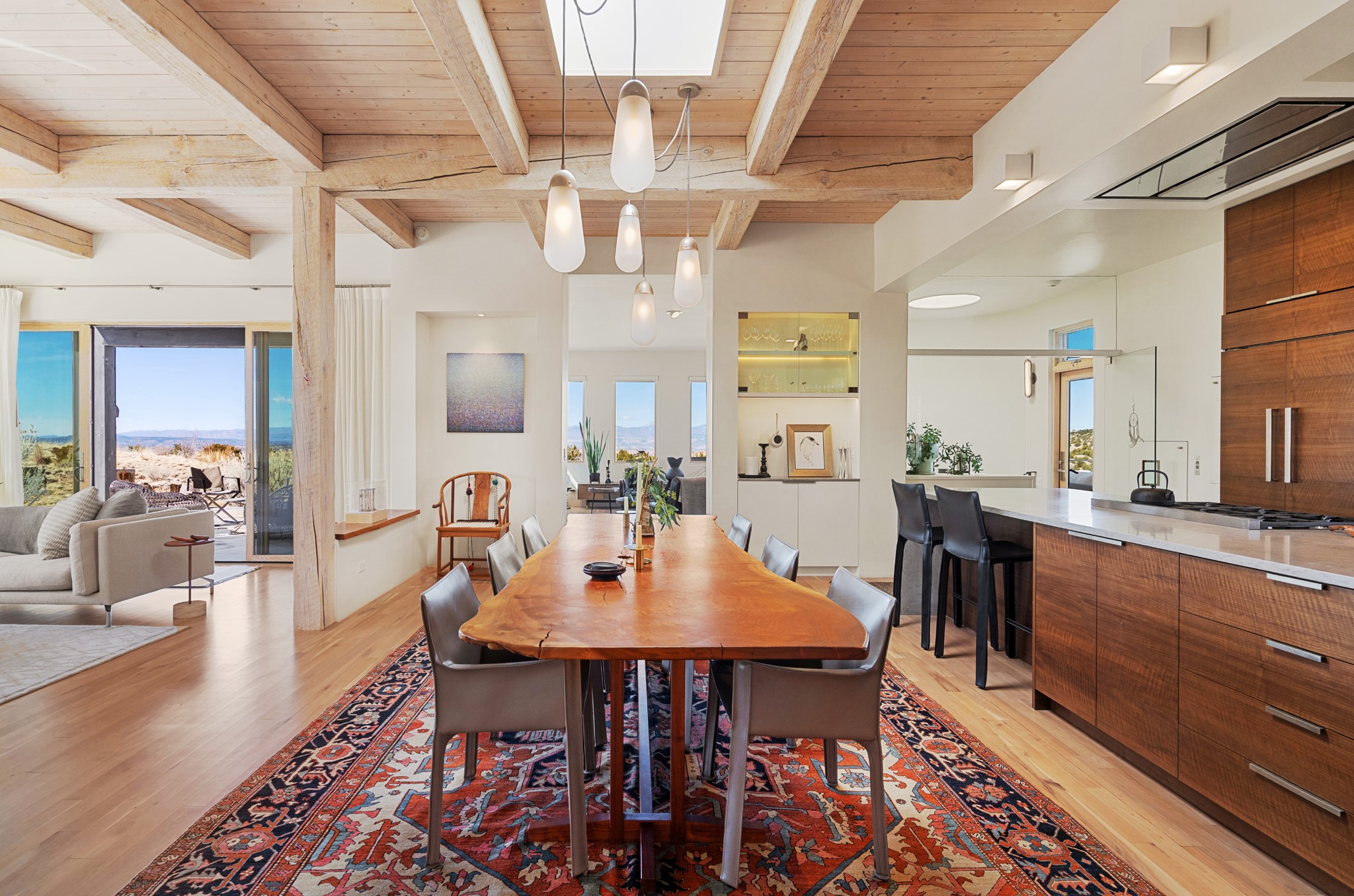 This refined main house and privatecasitais set high in the rolling Tesuque foothills of the Sangre de Cristo Mountains.Extensively re-designed and guided by Feng Shui principles so that energy moves smoothly, the main house creates an immediatesense of calm and well-being, with cherrywoodfloors, rich surfaces and fine details.A quiet retreat with serene spaces sets youinside the landscape of atmospheric views that stay with you. Three patios offer a choice of light and spacethroughout the day. Effortless indoor-outdoor living can be enjoyed from sunrise to sunset--this home welcomesbothquiet reflection andgreat hosting.The kitchen cabinetry and other custom pieces were milled and hand made from a single walnut tree from Oregon by alocal artisan.The great room and den offer warmth and light, with curated views, and each open directly ontoits own outdoor space. The calming primary bedroom flows into a restorative, spa-like experience: From soaking tub to sauna toshower, then stepping outdoors to the hot tub for star gazing--an outdoor shower completes the experience. Next, thecharming 2-bedroom, 2-bath guest house, which is separated by gorgeous native plantings and fruit trees, has its own entrance and parking toprovide exceptional privacy and flexibility for guests. This home offers a rare balance of seclusion and access--equally suited as a lock-and-leave retreat or a primary residence. Serene and immersed in nature, yet minutes from The Four Seasons,Tesuque Village Market, El Nido, andapp. 15 minutes to the Plaza and the Santa Fe Opera. Gated Los Caminitos comprises 573-acres with mapped trails for residents, a clubhouse, pool, tennis and pickleball. There is a staircase from the garage to main level.