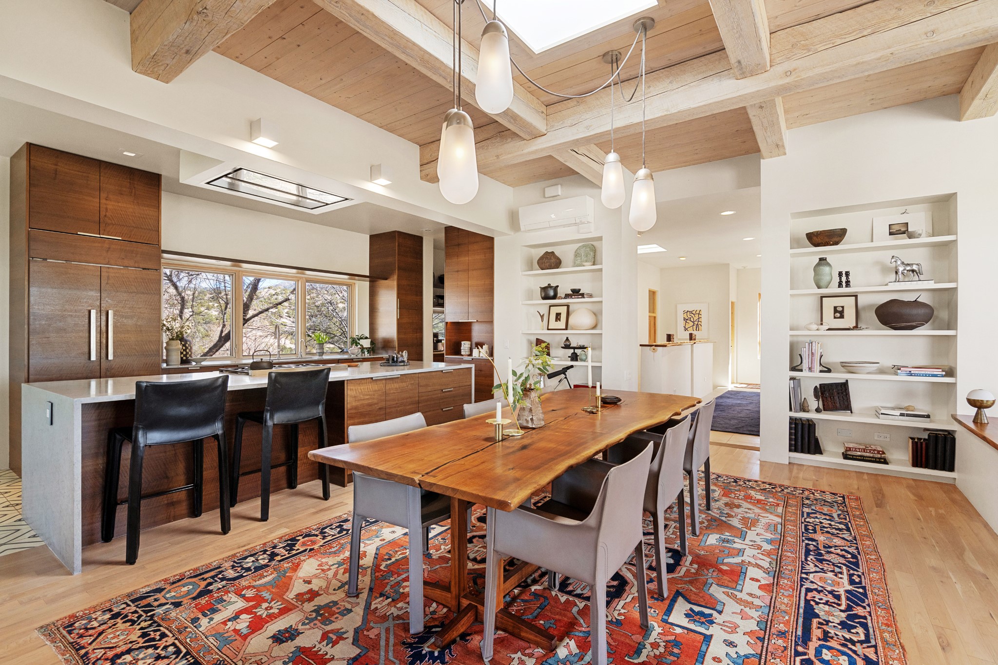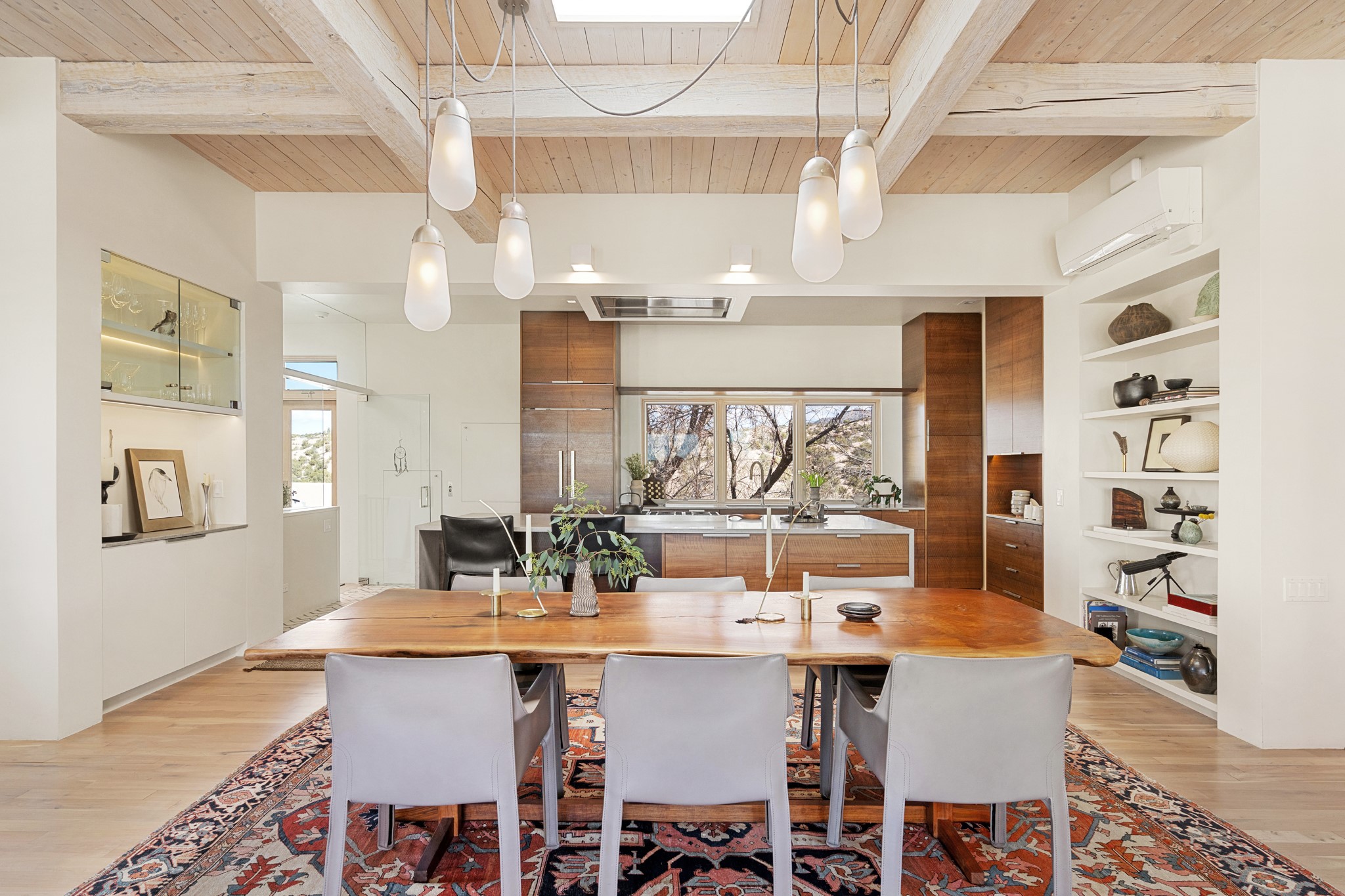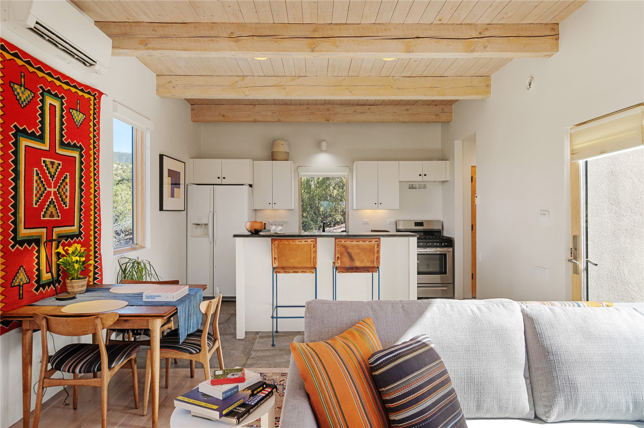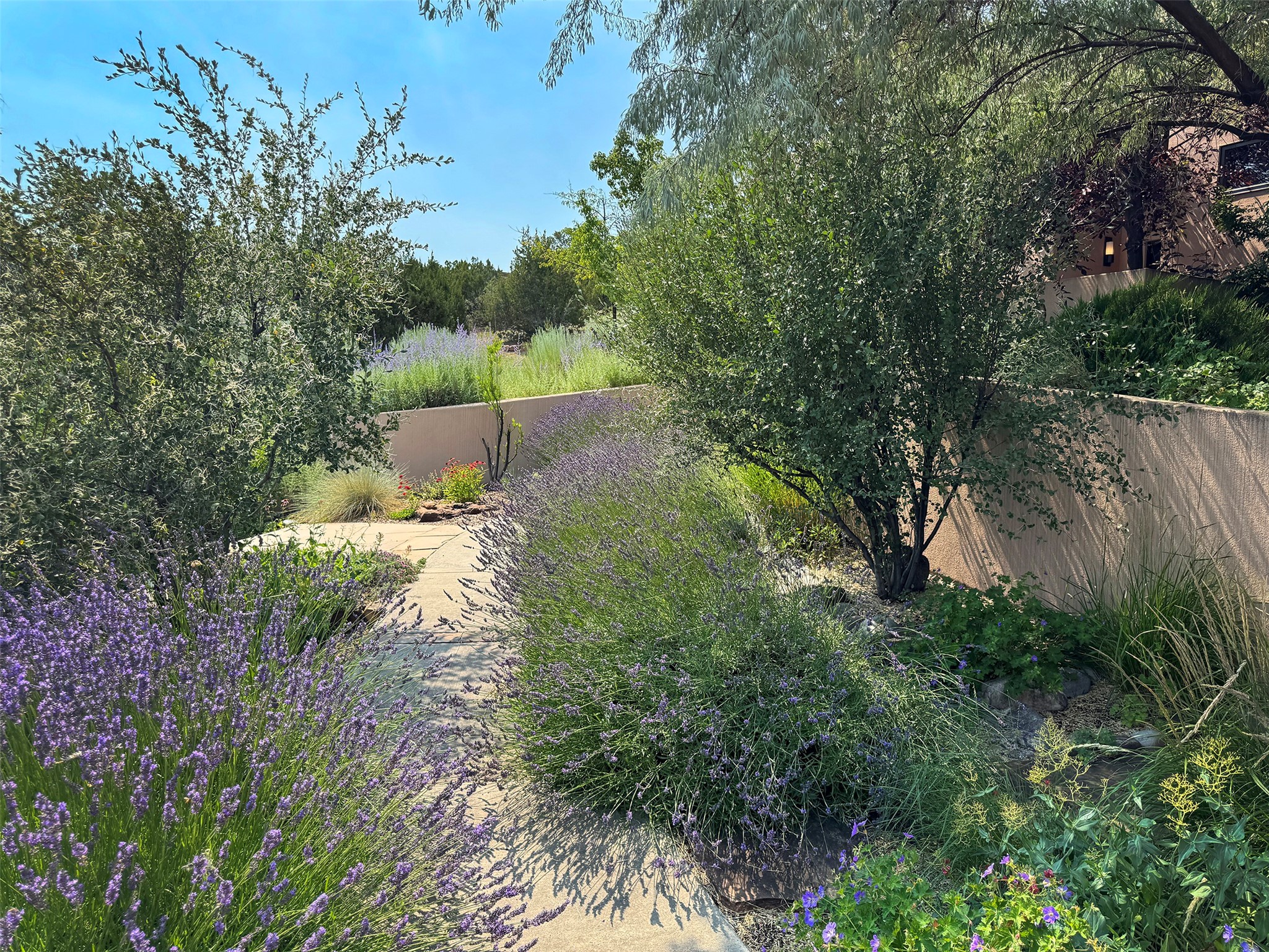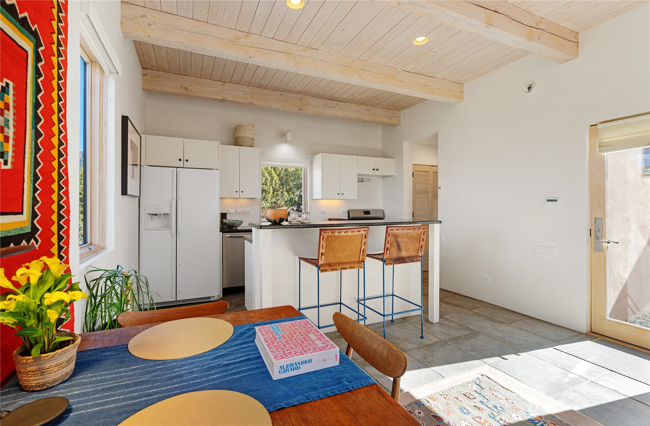 This refined main house and privatecasitais set high in the rolling Tesuque foothills of the Sangre de Cristo Mountains.Extensively re-designed and guided by Feng Shui principles so that energy moves smoothly, the main house creates an immediatesense of calm and well-being, with cherrywoodfloors, rich surfaces and fine details.A quiet retreat with serene spaces sets youinside the landscape of atmospheric views that stay with you. Three patios offer a choice of light and spacethroughout the day. Effortless indoor-outdoor living can be enjoyed from sunrise to sunset--this home welcomesbothquiet reflection andgreat hosting.The kitchen cabinetry and other custom pieces were milled and hand made from a single walnut tree from Oregon by alocal artisan.The great room and den offer warmth and light, with curated views, and each open directly ontoits own outdoor space. The calming primary bedroom flows into a restorative, spa-like experience: From soaking tub to sauna toshower, then stepping outdoors to the hot tub for star gazing--an outdoor shower completes the experience. Next, thecharming 2-bedroom, 2-bath guest house, which is separated by gorgeous native plantings and fruit trees, has its own entrance and parking toprovide exceptional privacy and flexibility for guests. This home offers a rare balance of seclusion and access--equally suited as a lock-and-leave retreat or a primary residence. Serene and immersed in nature, yet minutes from The Four Seasons,Tesuque Village Market, El Nido, andapp. 15 minutes to the Plaza and the Santa Fe Opera. Gated Los Caminitos comprises 573-acres with mapped trails for residents, a clubhouse, pool, tennis and pickleball. There is a staircase from the garage to main level.