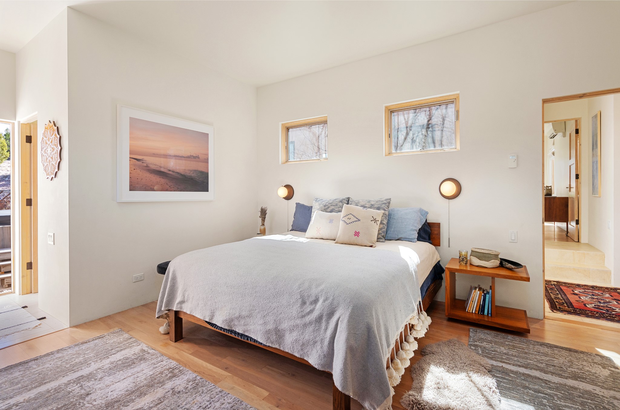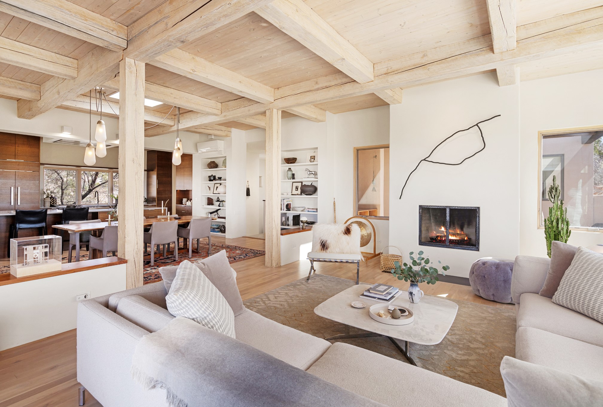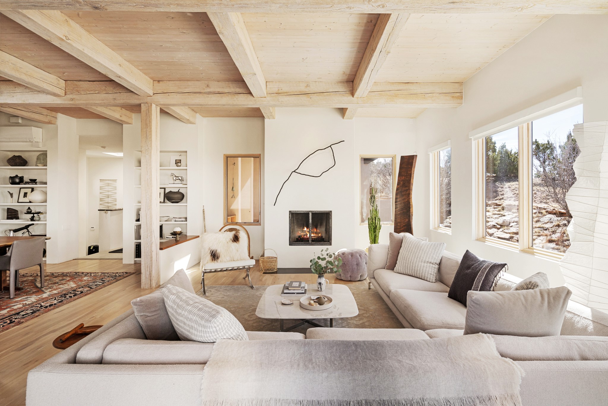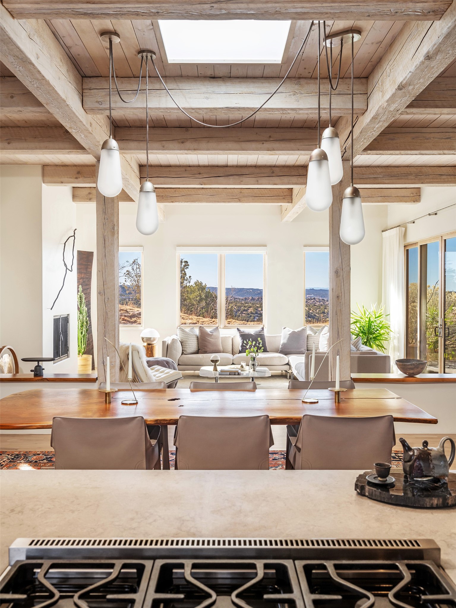 This refined main house and privatecasitais set high in the rolling Tesuque foothills of the Sangre de Cristo Mountains.Extensively re-designed and guided by Feng Shui principles so that energy moves smoothly, the main house creates an immediatesense of calm and well-being, with cherrywoodfloors, rich surfaces and fine details.A quiet retreat with serene spaces sets youinside the landscape of atmospheric views that stay with you. Three patios offer a choice of light and spacethroughout the day. Effortless indoor-outdoor living can be enjoyed from sunrise to sunset--this home welcomesbothquiet reflection andgreat hosting.The kitchen cabinetry and other custom pieces were milled and hand made from a single walnut tree from Oregon by alocal artisan.The great room and den offer warmth and light, with curated views, and each open directly ontoits own outdoor space. The calming primary bedroom flows into a restorative, spa-like experience: From soaking tub to sauna toshower, then stepping outdoors to the hot tub for star gazing--an outdoor shower completes the experience. Next, thecharming 2-bedroom, 2-bath guest house, which is separated by gorgeous native plantings and fruit trees, has its own entrance and parking toprovide exceptional privacy and flexibility for guests. This home offers a rare balance of seclusion and access--equally suited as a lock-and-leave retreat or a primary residence. Serene and immersed in nature, yet minutes from The Four Seasons,Tesuque Village Market, El Nido, andapp. 15 minutes to the Plaza and the Santa Fe Opera. Gated Los Caminitos comprises 573-acres with mapped trails for residents, a clubhouse, pool, tennis and pickleball. There is a staircase from the garage to main level.