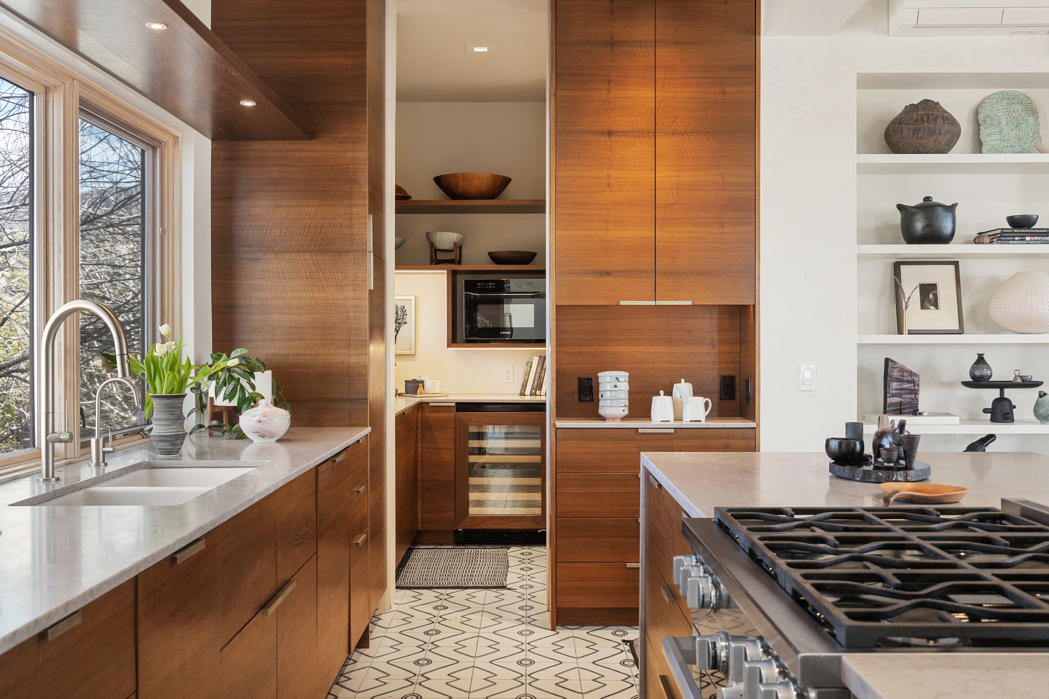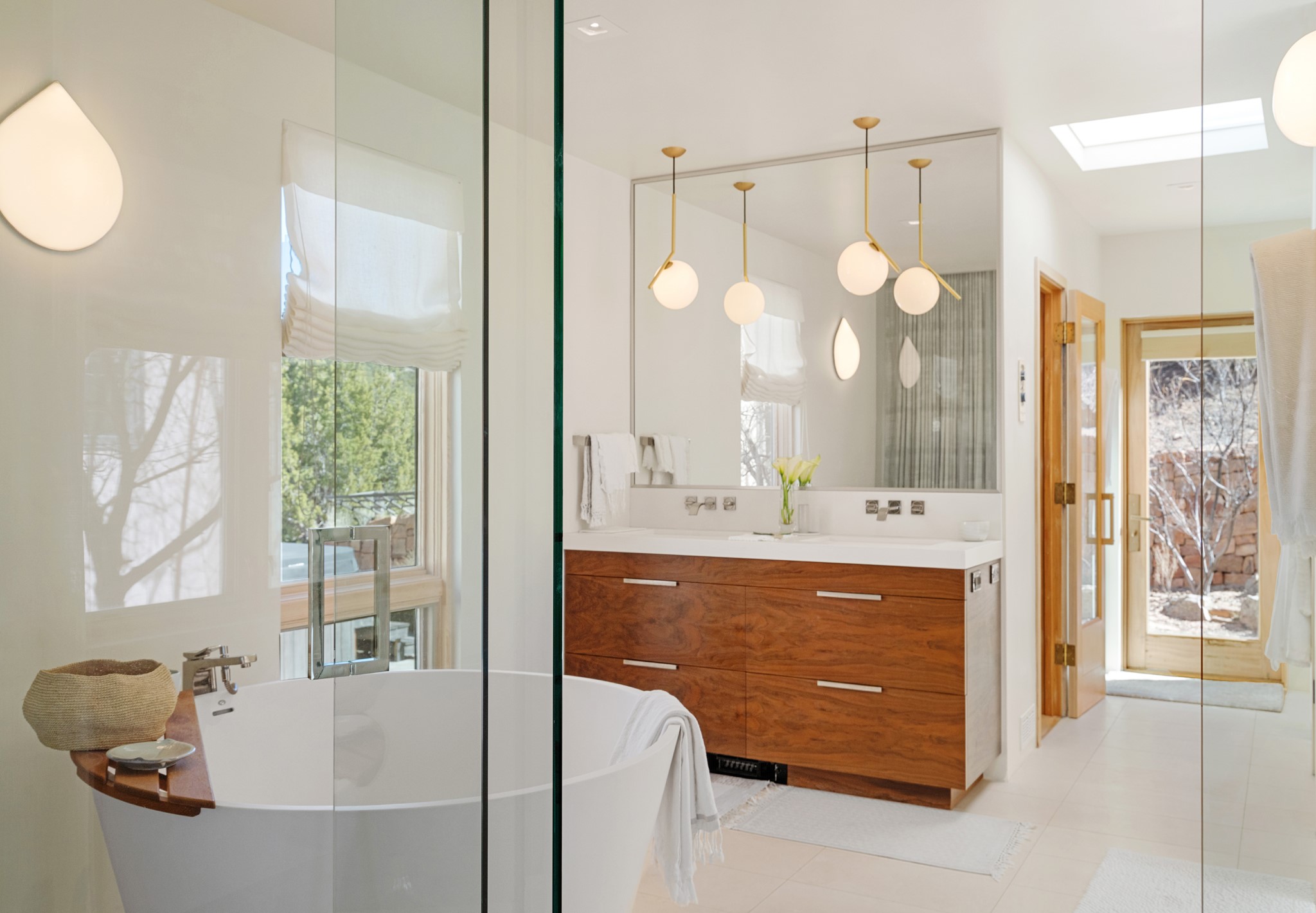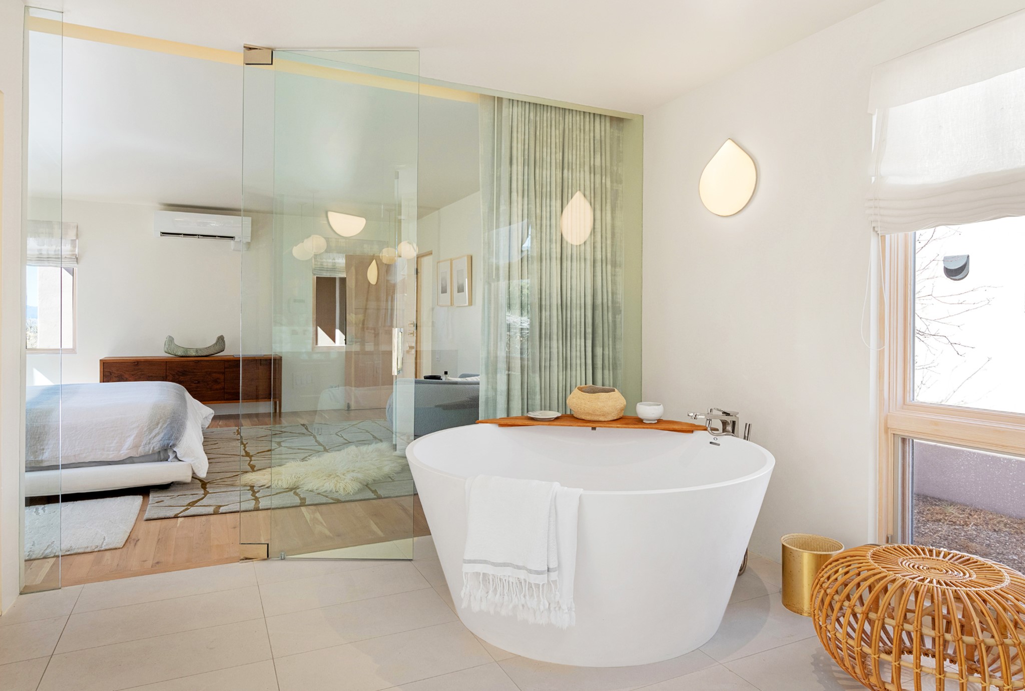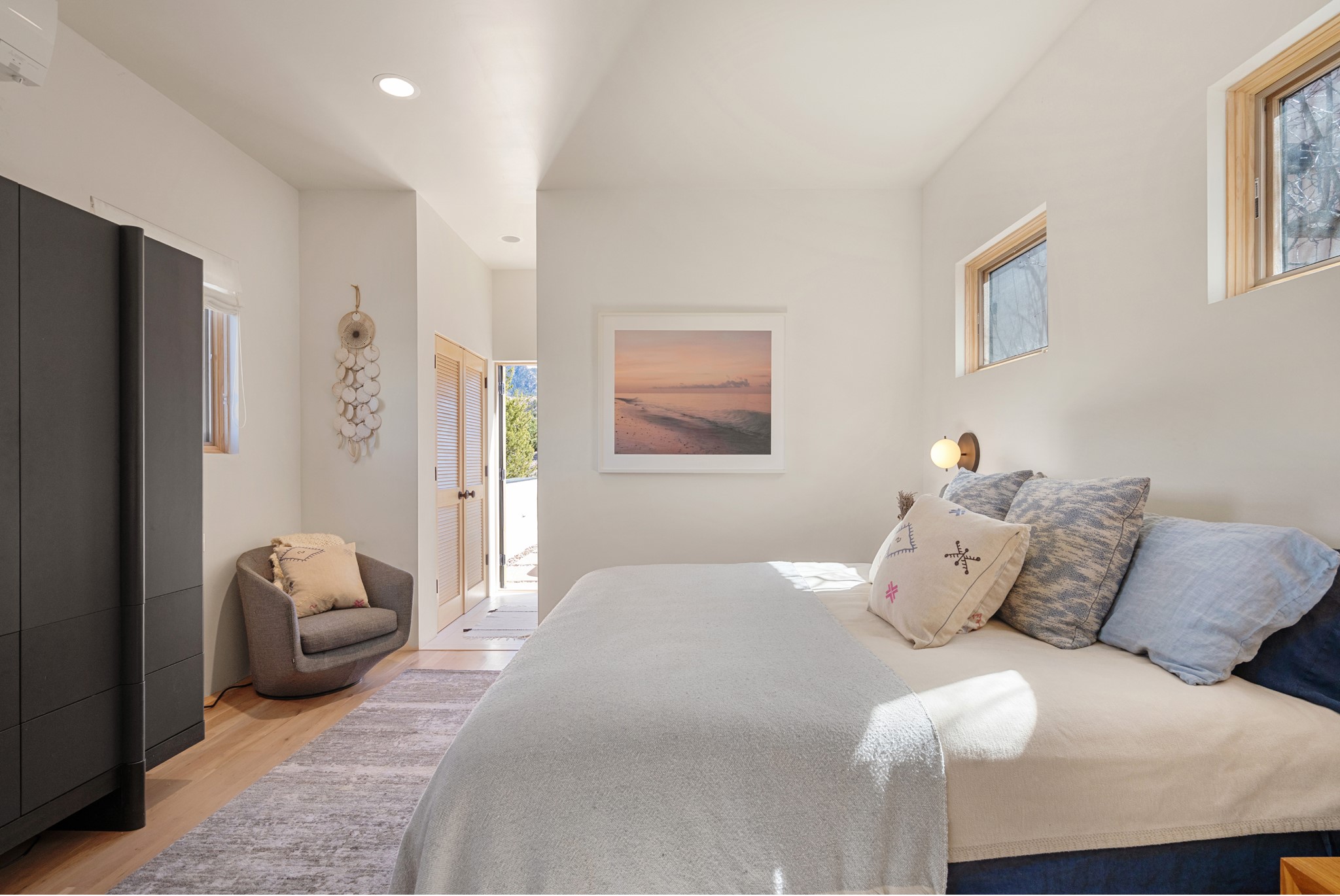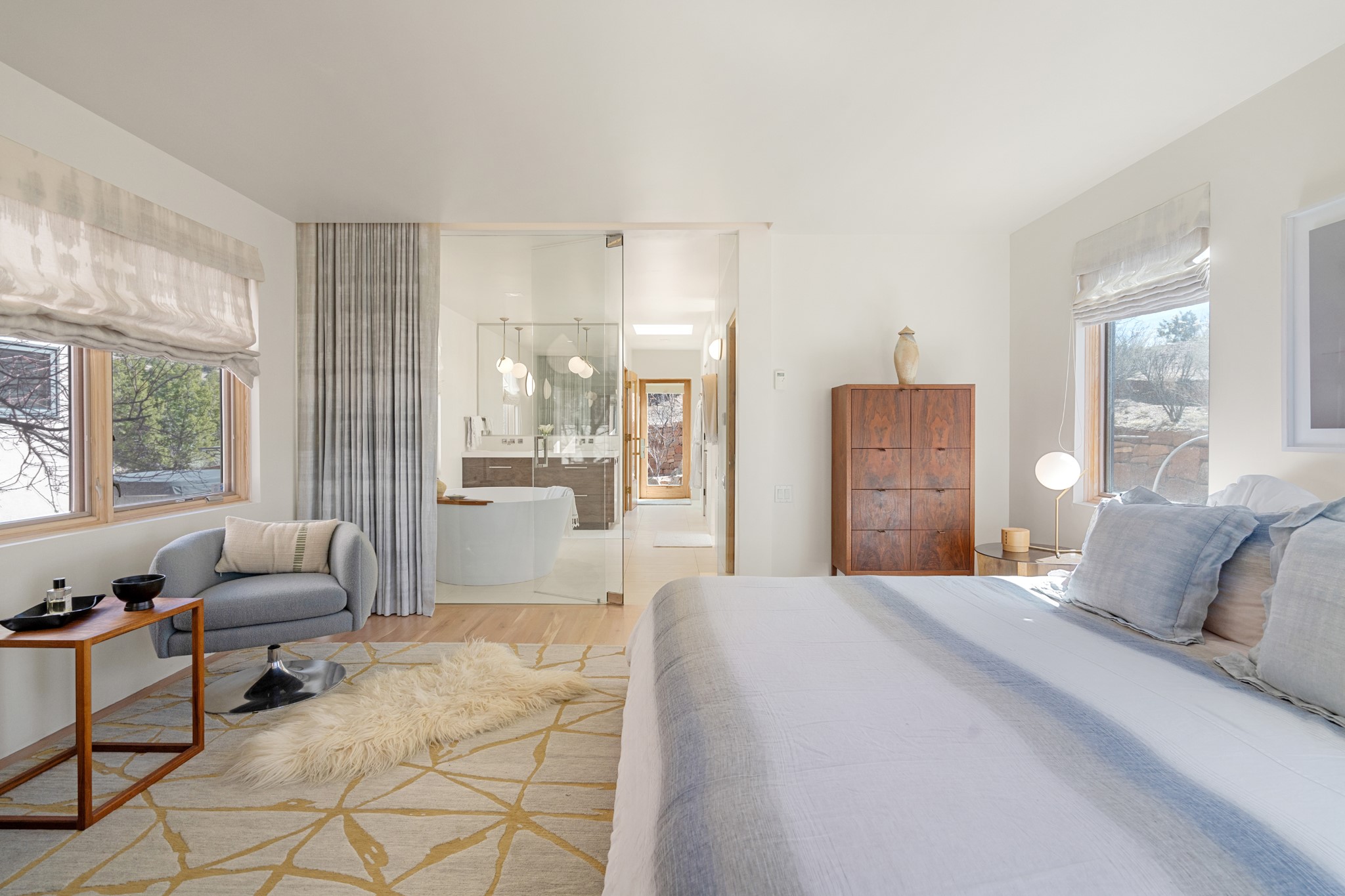 This refined main house and privatecasitais set high in the rolling Tesuque foothills of the Sangre de Cristo Mountains.Extensively re-designed and guided by Feng Shui principles so that energy moves smoothly, the main house creates an immediatesense of calm and well-being, with cherrywoodfloors, rich surfaces and fine details.A quiet retreat with serene spaces sets youinside the landscape of atmospheric views that stay with you. Three patios offer a choice of light and spacethroughout the day. Effortless indoor-outdoor living can be enjoyed from sunrise to sunset--this home welcomesbothquiet reflection andgreat hosting.The kitchen cabinetry and other custom pieces were milled and hand made from a single walnut tree from Oregon by alocal artisan.The great room and den offer warmth and light, with curated views, and each open directly ontoits own outdoor space. The calming primary bedroom flows into a restorative, spa-like experience: From soaking tub to sauna toshower, then stepping outdoors to the hot tub for star gazing--an outdoor shower completes the experience. Next, thecharming 2-bedroom, 2-bath guest house, which is separated by gorgeous native plantings and fruit trees, has its own entrance and parking toprovide exceptional privacy and flexibility for guests. This home offers a rare balance of seclusion and access--equally suited as a lock-and-leave retreat or a primary residence. Serene and immersed in nature, yet minutes from The Four Seasons,Tesuque Village Market, El Nido, andapp. 15 minutes to the Plaza and the Santa Fe Opera. Gated Los Caminitos comprises 573-acres with mapped trails for residents, a clubhouse, pool, tennis and pickleball. There is a staircase from the garage to main level.