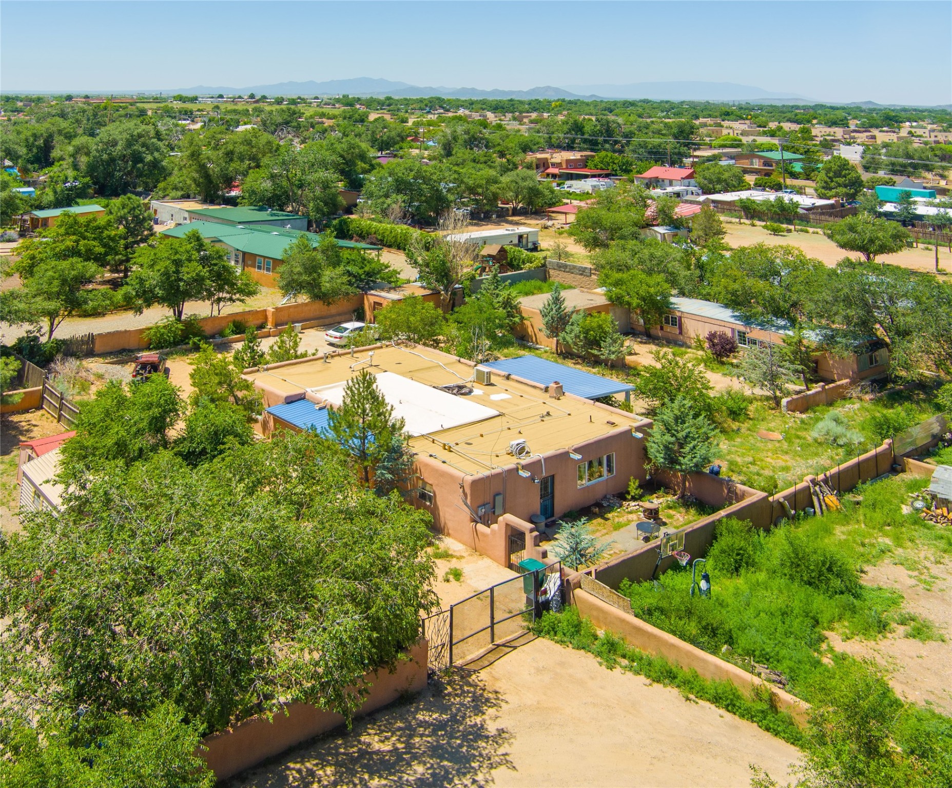 Welcome to 2918 Santeros Road--a serene and beautifully maintained home that blends classic Santa Fe charm with modern comfort. This 3-bedroom, 1 1/2-bath residence offers approximately 2098 sq ft of living space featuring traditional Southwestern elements such as adobe construction, vigas, a kiva fireplace, and plastered walls. The open-concept kitchen/dining area is perfect for entertaining. Outside, enjoy private patios, mature native landscaping, and a peaceful courtyard ideal for relaxing or dining al fresco. Located minutes from shopping, schools, biking trails, and the Santa Fe airport. This property combines tranquility with convenience. Easy access to Hwy 599. As an added bonus there are also multiple out buildings and a single wide mobile home that can be used as storage or upgraded to livable space. There is also plenty of space to expand on the 0.4 acre lot! Upgrades within the last year include: Minisplit AC/Heaters; windows in the living room, primary bed, mud room, and 1 guest bedroom; new electric circuit panel and grounding rods; soaking tub and rain shower in main bathroom. Sellers have also installed a City Water Meter it just needs to be connected if Buyer wants that option.
