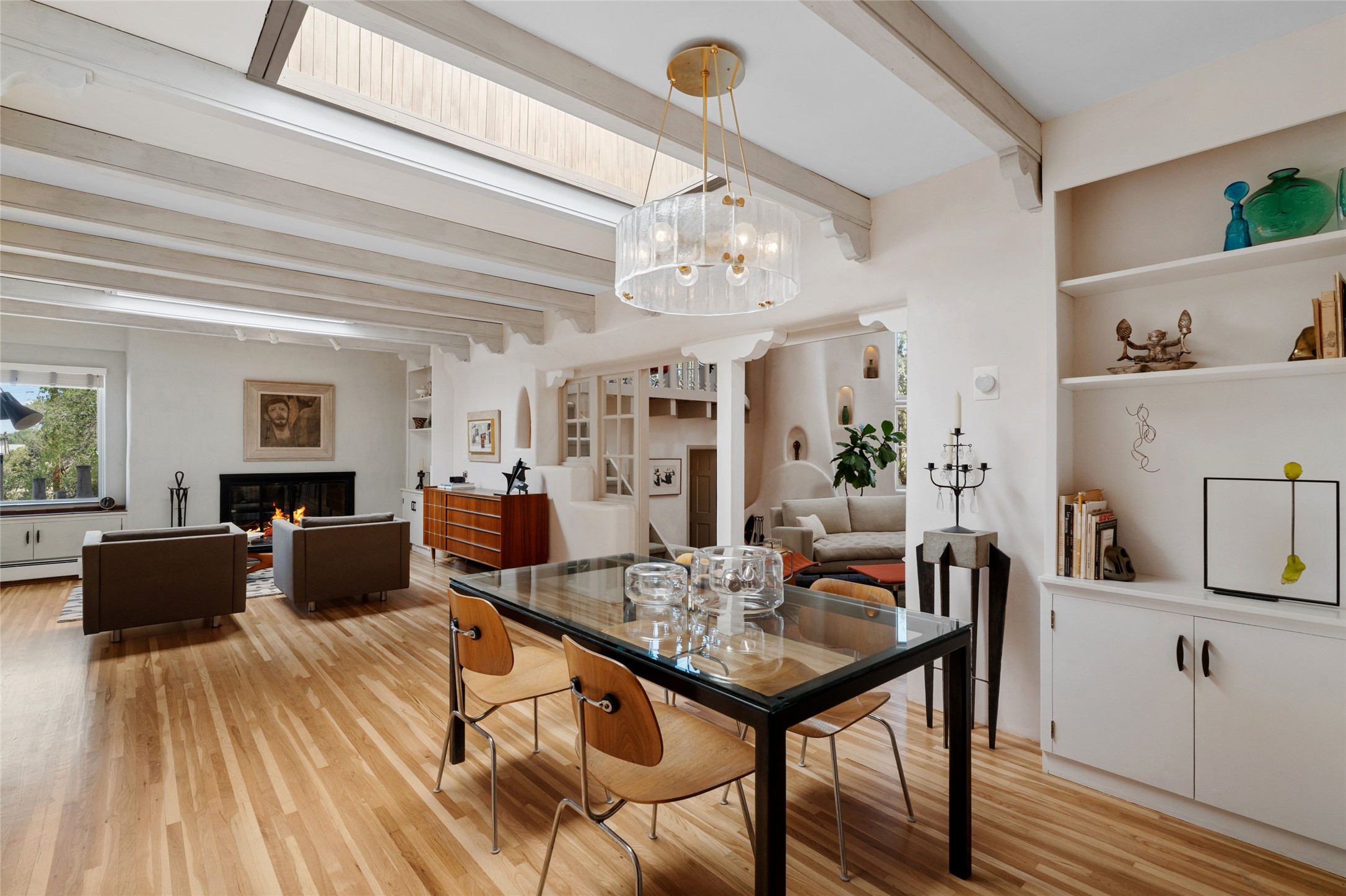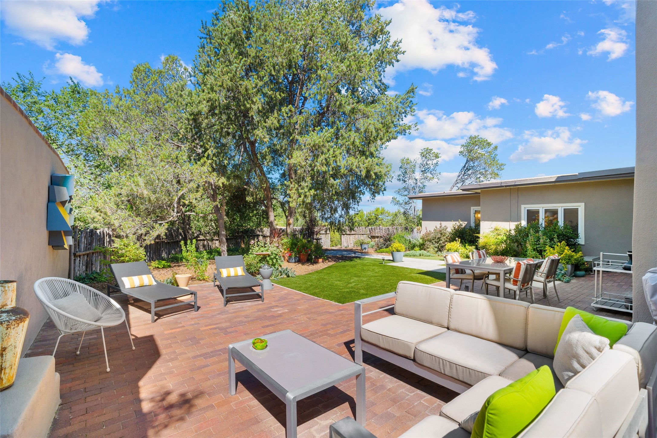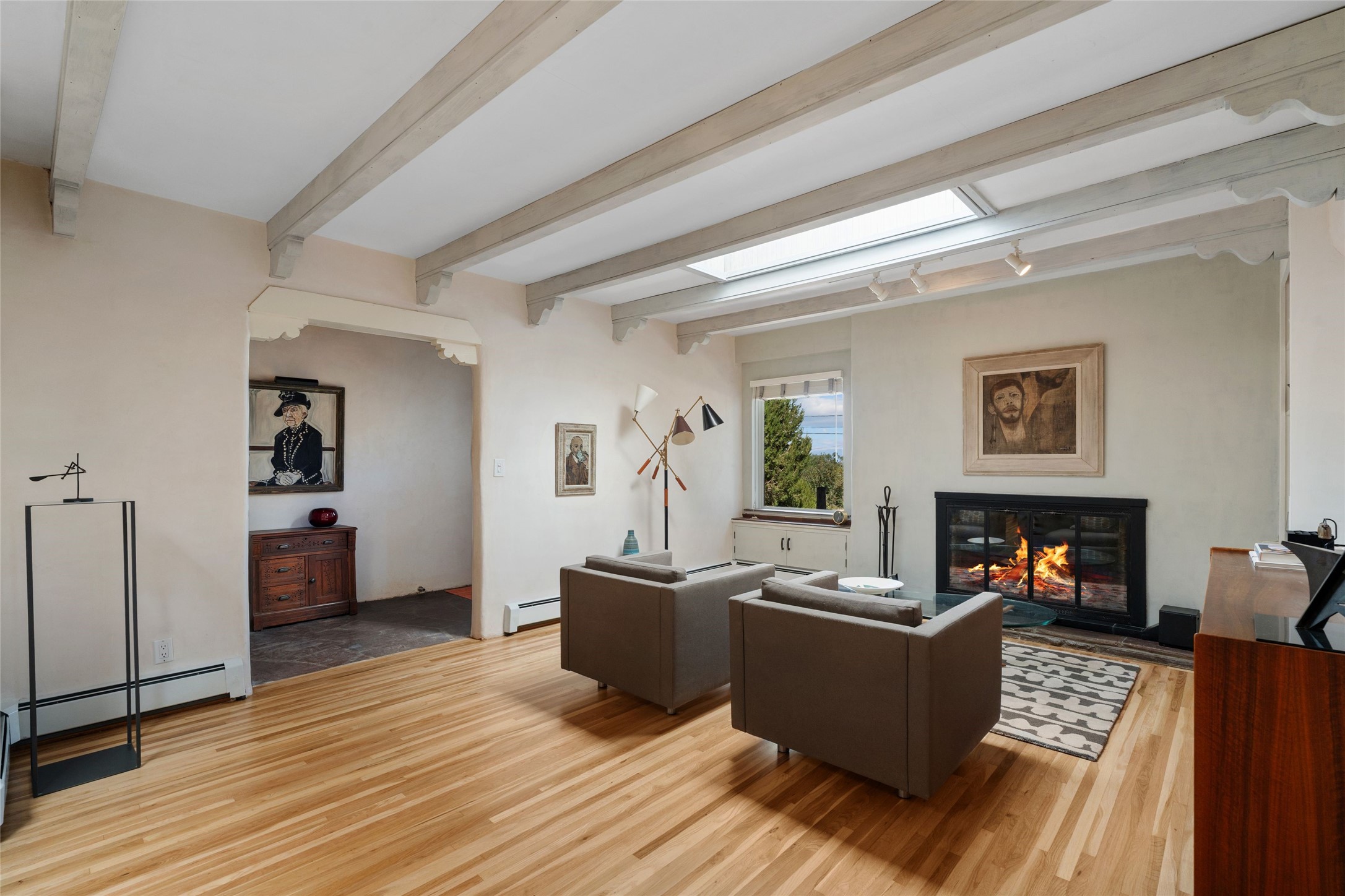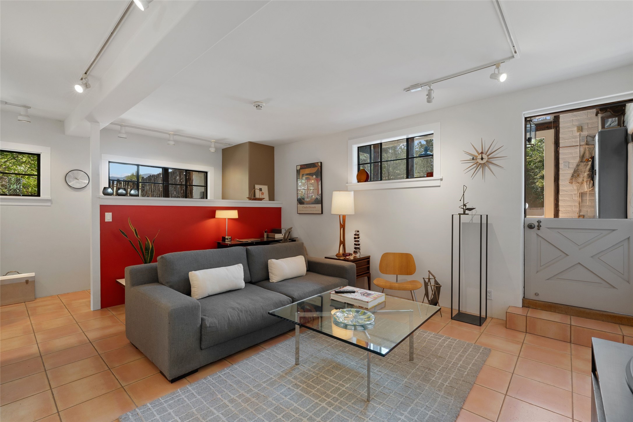 A truly inspired mid-century home like this cannot be found anywhere but Santa Fe and is ideally located where South Capitol meets Museum Hill. Designed & built in 1955, with a dramatic expansion in 1975, this home has evolved into unique & stunning! The mid-century conversation pit, large rooms & soaring ceilings are invigorated with elements of Santa Fe style: an iconic Kiva fireplace, double arrow carved details, customized latilla ceilings, nichos & vigas. Bespoke in so many ways by teams of craftsmen, you will appreciate hand plastered walls, narrow oak flooring that harks back to the 50s but looks brand new, other floors are brick, flagstone, & tile. The full acre property offers 3 distinctive outdoor areas: one is shady, tree-filled and comes alive at dusk with cool vintage lights. Off the studio is a sunny fenced yard with pear tree. Third & largest is a grand gathering space for parties, sit-down dinners, fireplace chats - surrounded by lush gardens. Sprawling across the main floor you will find entertainment-ready public spaces like a lofted great room, sitting, media, dining rooms plus eat-in kitchen. The bedroom wing is set apart with the primary bedroom en-suite plus 2 large bedrooms that share the main bath. The public 1/2 bath & laundry are part of the large media room area. The bonus is upstairs: an attached guest suite with private entrance, OR, second en-suite primary bedroom. Unexpected highlights: a 17' tall glass-walled art studio/gym, a "treasure room" or library, heated 2 car garage wired for 240 + separate workshop OR storage room. This property is flush with flexibility: if you seek a home office retreat there are many options. You will love the practicalty of this "Santa Fe Central" location where the 2 closest grocery stores are Trader Joe's & Whole Foods, the 2 closest restaurants are Museum Hill & Clafoutis. This is a rare opportunity to experience "design magazine modern" with Santa Fe spirit! Virtual tour + Video Link online