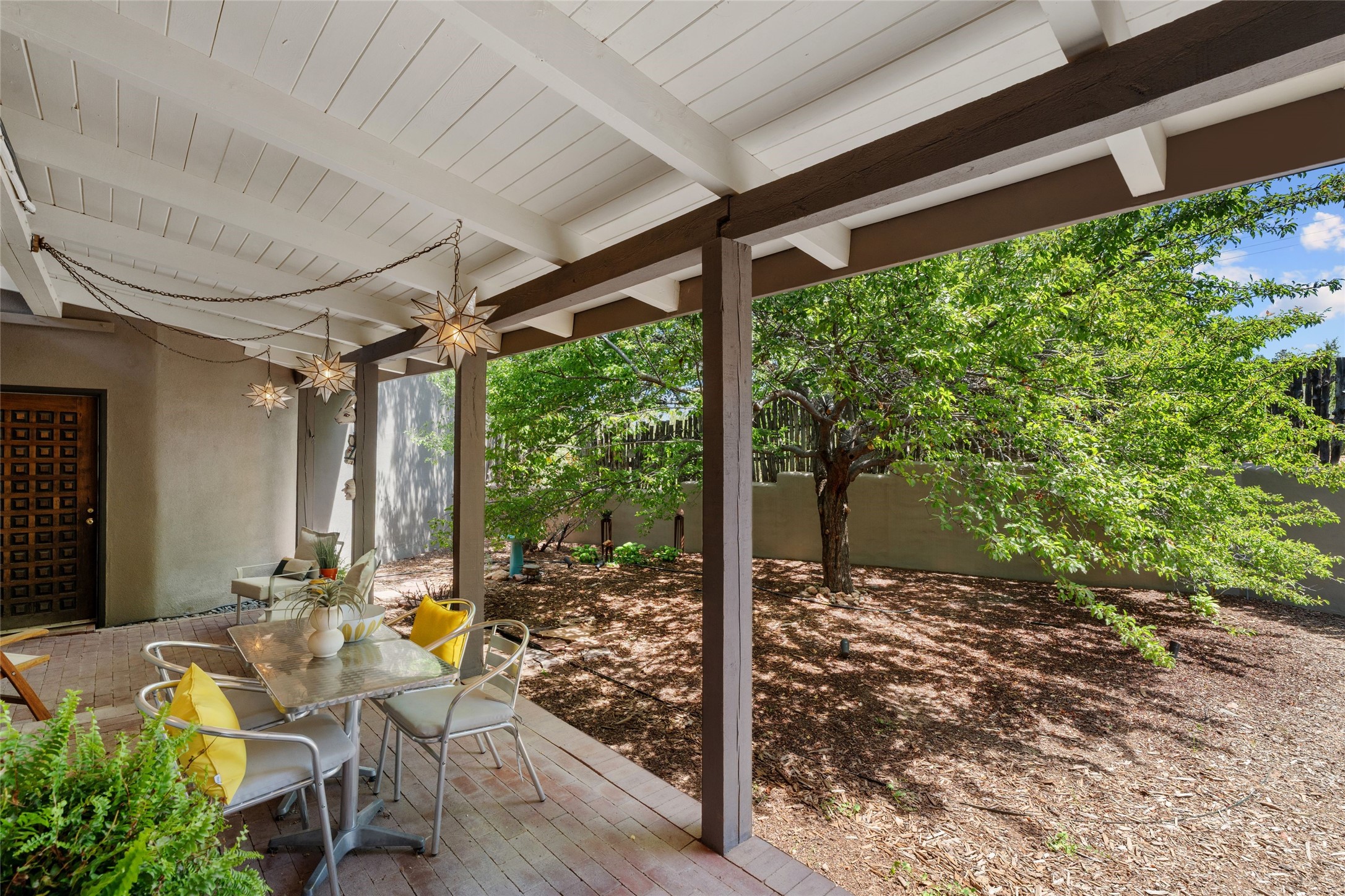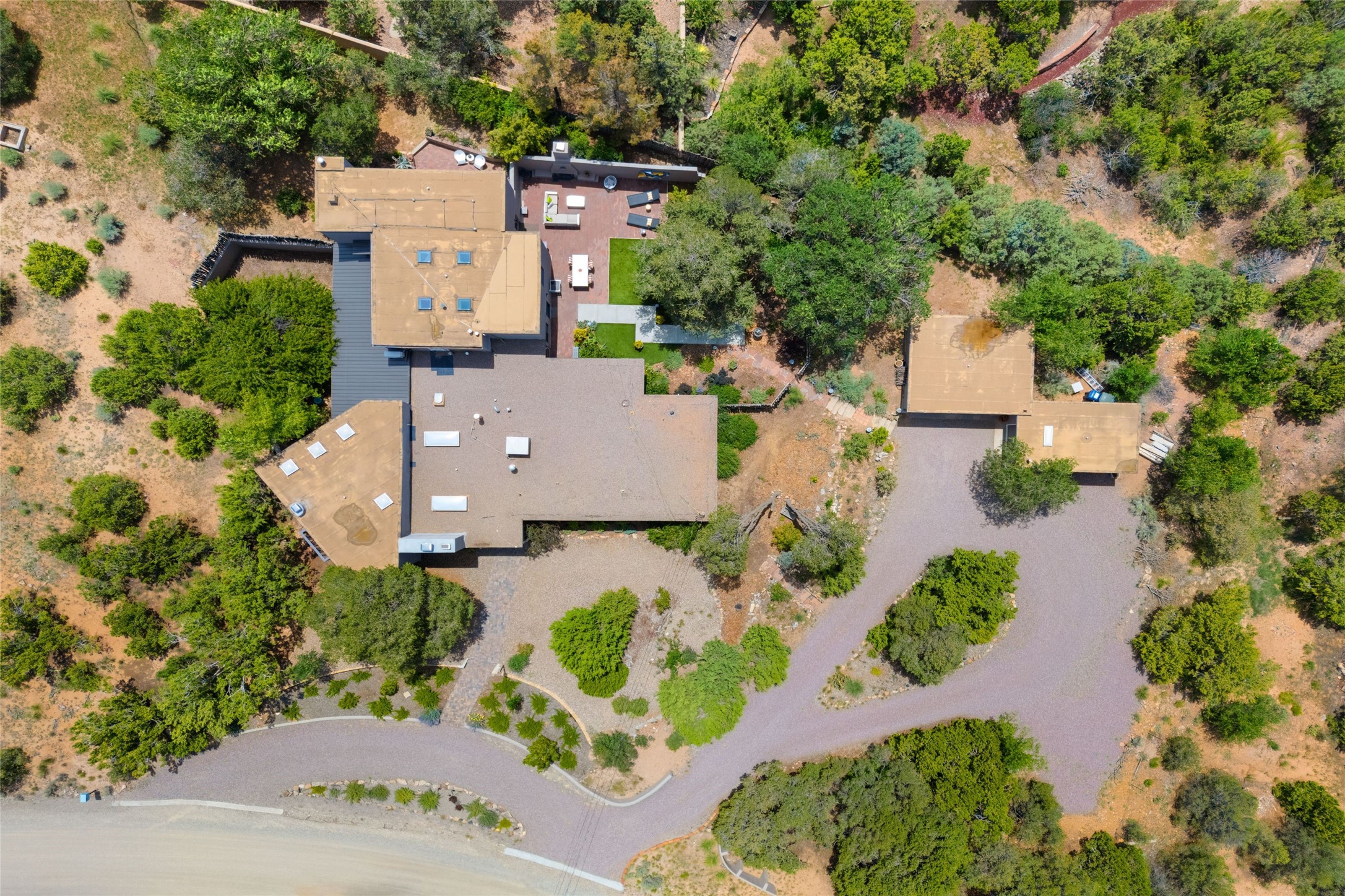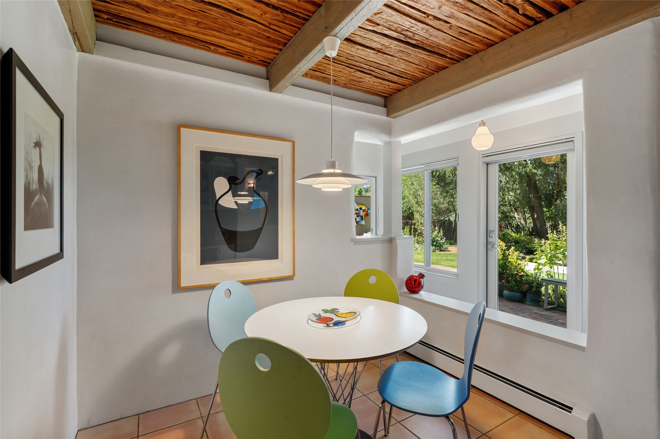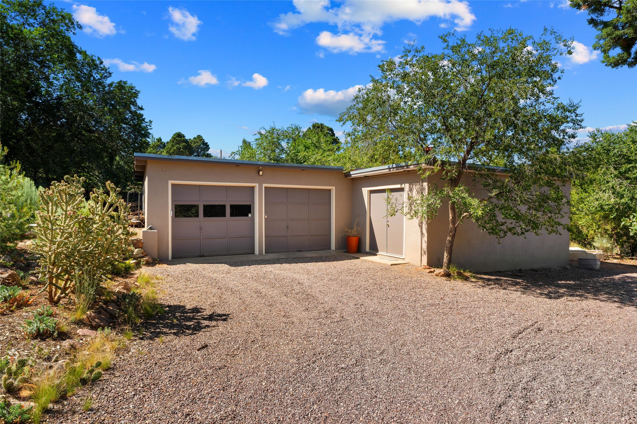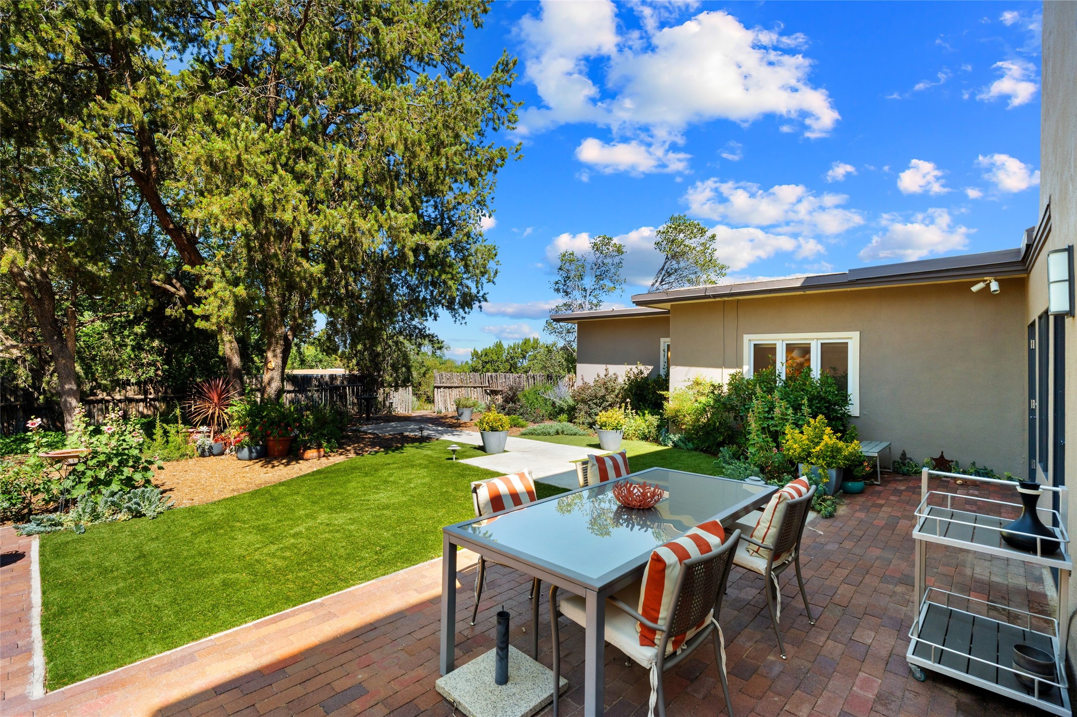 A truly inspired mid-century home like this cannot be found anywhere but Santa Fe and is ideally located where South Capitol meets Museum Hill. Designed & built in 1955, with a dramatic expansion in 1975, this home has evolved into unique & stunning! The mid-century conversation pit, large rooms & soaring ceilings are invigorated with elements of Santa Fe style: an iconic Kiva fireplace, double arrow carved details, customized latilla ceilings, nichos & vigas. Bespoke in so many ways by teams of craftsmen, you will appreciate hand plastered walls, narrow oak flooring that harks back to the 50s but looks brand new, other floors are brick, flagstone, & tile. The full acre property offers 3 distinctive outdoor areas: one is shady, tree-filled and comes alive at dusk with cool vintage lights. Off the studio is a sunny fenced yard with pear tree. Third & largest is a grand gathering space for parties, sit-down dinners, fireplace chats - surrounded by lush gardens. Sprawling across the main floor you will find entertainment-ready public spaces like a lofted great room, sitting, media, dining rooms plus eat-in kitchen. The bedroom wing is set apart with the primary bedroom en-suite plus 2 large bedrooms that share the main bath. The public 1/2 bath & laundry are part of the large media room area. The bonus is upstairs: an attached guest suite with private entrance, OR, second en-suite primary bedroom. Unexpected highlights: a 17' tall glass-walled art studio/gym, a "treasure room" or library, heated 2 car garage wired for 240 + separate workshop OR storage room. This property is flush with flexibility: if you seek a home office retreat there are many options. You will love the practicalty of this "Santa Fe Central" location where the 2 closest grocery stores are Trader Joe's & Whole Foods, the 2 closest restaurants are Museum Hill & Clafoutis. This is a rare opportunity to experience "design magazine modern" with Santa Fe spirit! Virtual tour + Video Link online