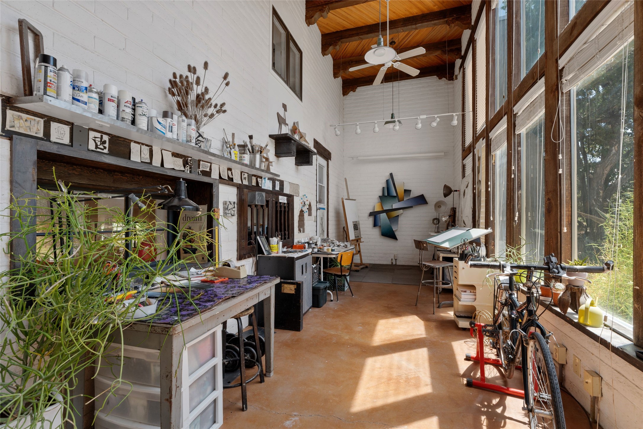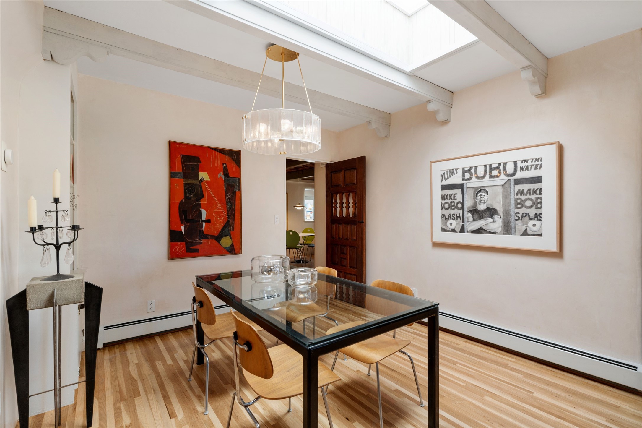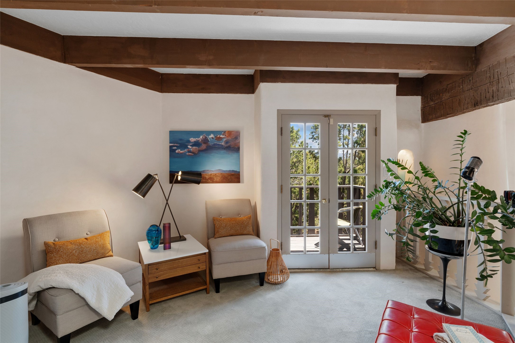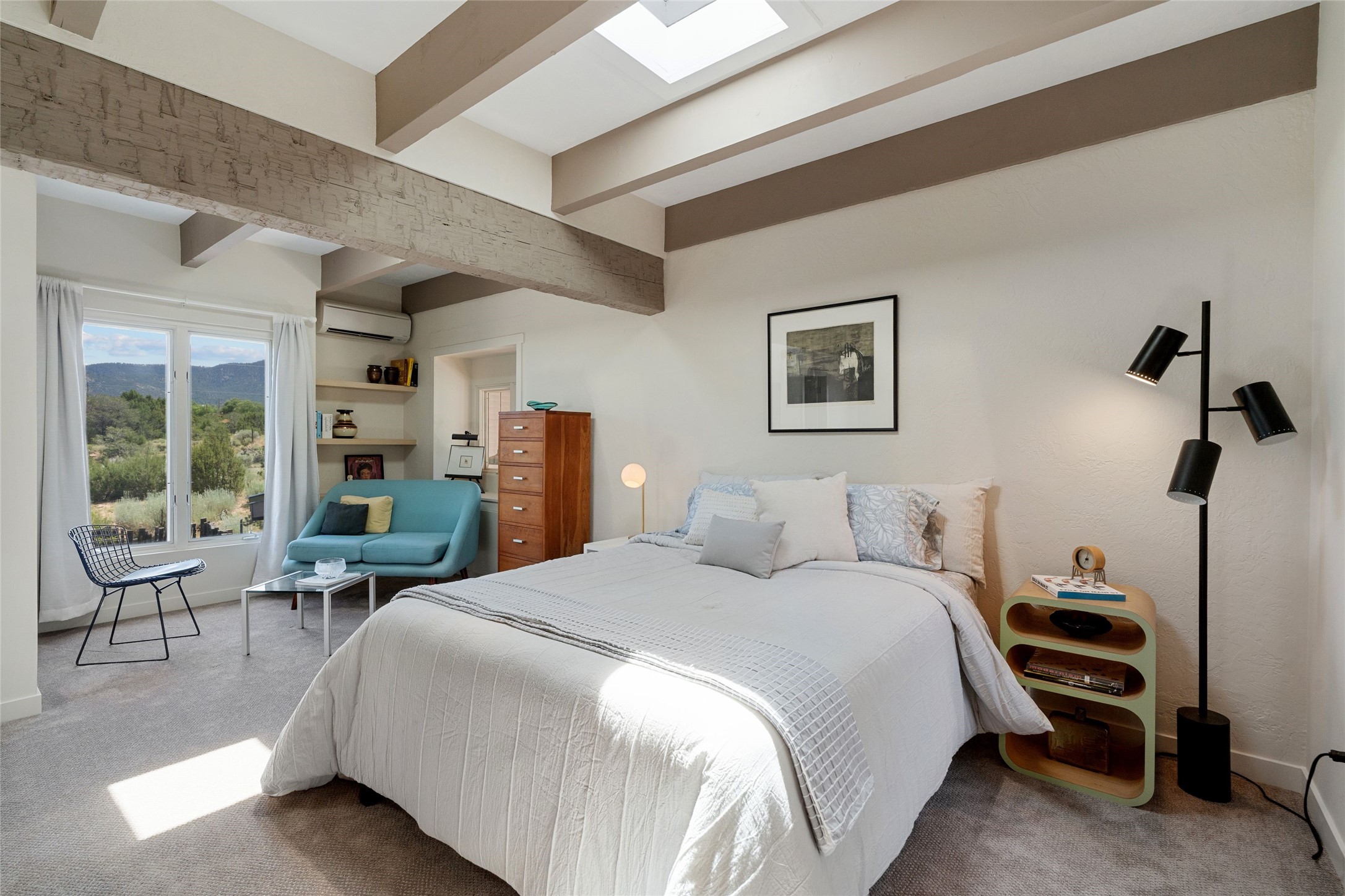 A truly inspired mid-century home like this cannot be found anywhere but Santa Fe and is ideally located where South Capitol meets Museum Hill. Designed & built in 1955, with a dramatic expansion in 1975, this home has evolved into unique & stunning! The mid-century conversation pit, large rooms & soaring ceilings are invigorated with elements of Santa Fe style: an iconic Kiva fireplace, double arrow carved details, customized latilla ceilings, nichos & vigas. Bespoke in so many ways by teams of craftsmen, you will appreciate hand plastered walls, narrow oak flooring that harks back to the 50s but looks brand new, other floors are brick, flagstone, & tile. The full acre property offers 3 distinctive outdoor areas: one is shady, tree-filled and comes alive at dusk with cool vintage lights. Off the studio is a sunny fenced yard with pear tree. Third & largest is a grand gathering space for parties, sit-down dinners, fireplace chats - surrounded by lush gardens. Sprawling across the main floor you will find entertainment-ready public spaces like a lofted great room, sitting, media, dining rooms plus eat-in kitchen. The bedroom wing is set apart with the primary bedroom en-suite plus 2 large bedrooms that share the main bath. The public 1/2 bath & laundry are part of the large media room area. The bonus is upstairs: an attached guest suite with private entrance, OR, second en-suite primary bedroom. Unexpected highlights: a 17' tall glass-walled art studio/gym, a "treasure room" or library, heated 2 car garage wired for 240 + separate workshop OR storage room. This property is flush with flexibility: if you seek a home office retreat there are many options. You will love the practicalty of this "Santa Fe Central" location where the 2 closest grocery stores are Trader Joe's & Whole Foods, the 2 closest restaurants are Museum Hill & Clafoutis. This is a rare opportunity to experience "design magazine modern" with Santa Fe spirit! Virtual tour + Video Link online