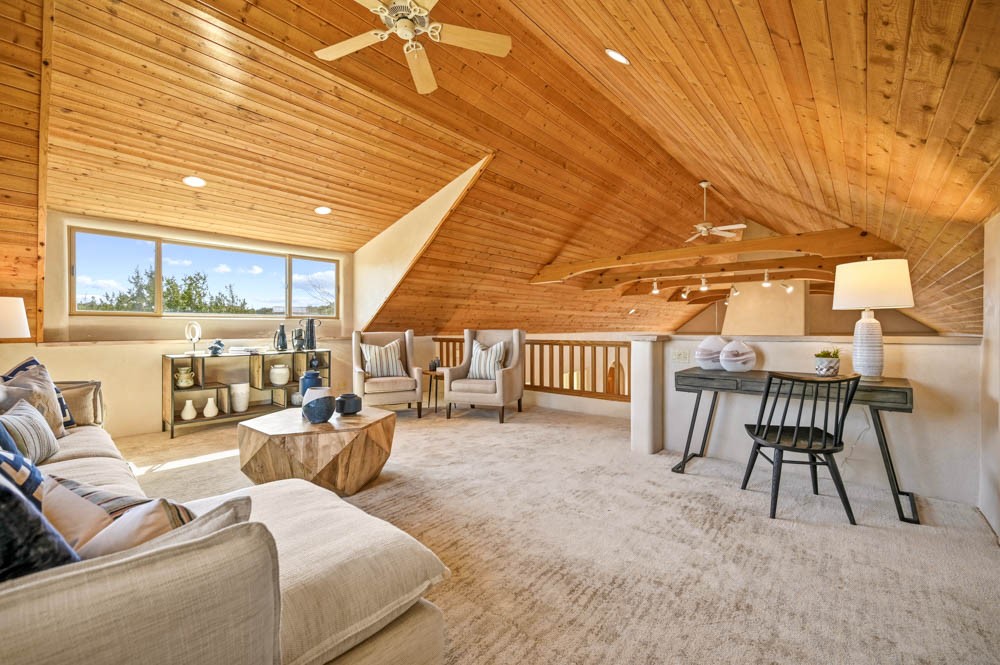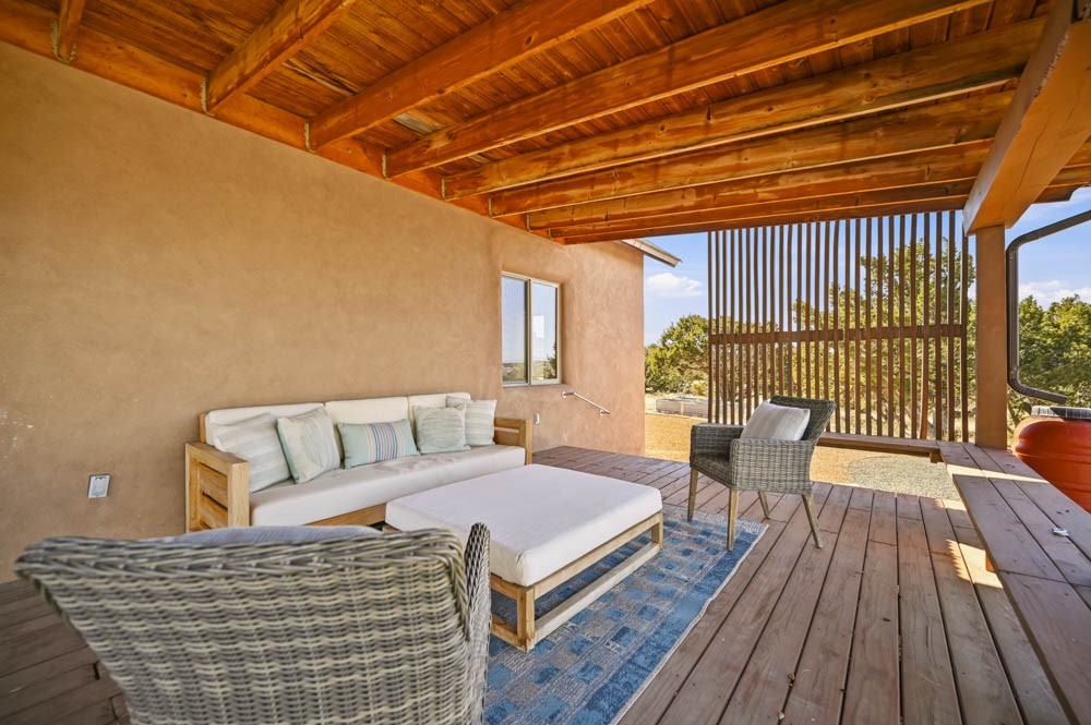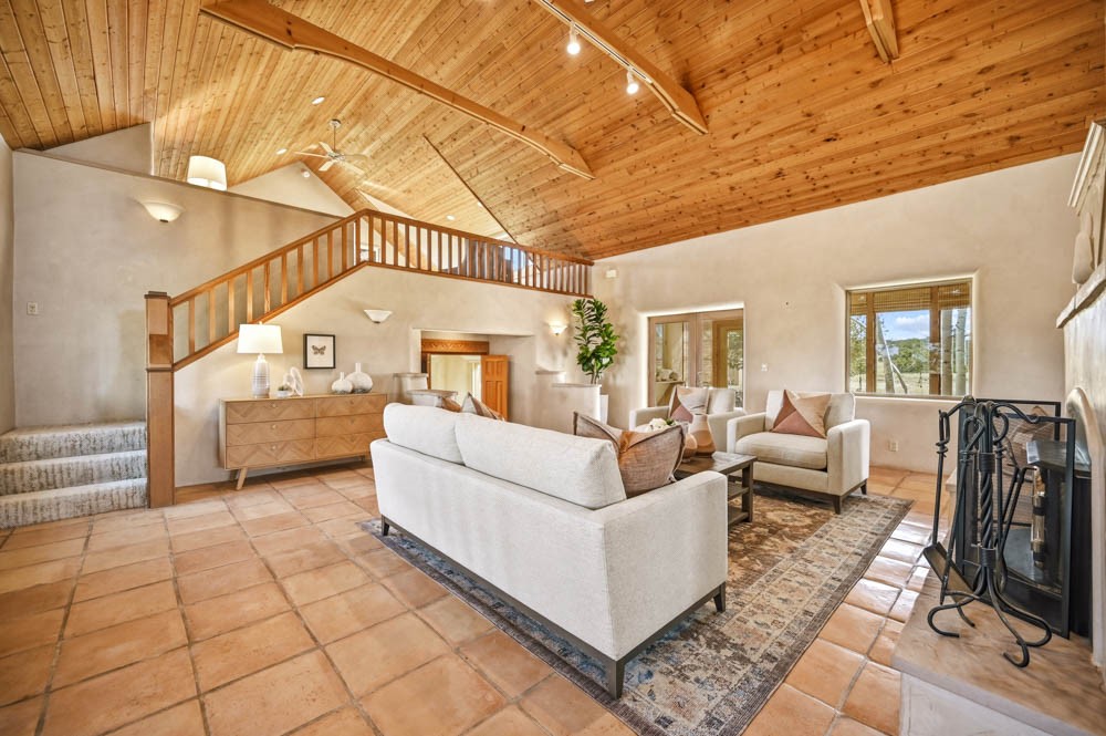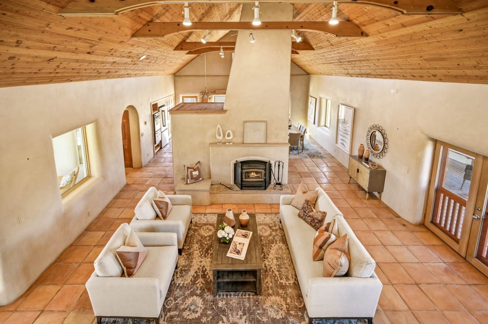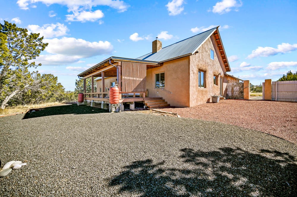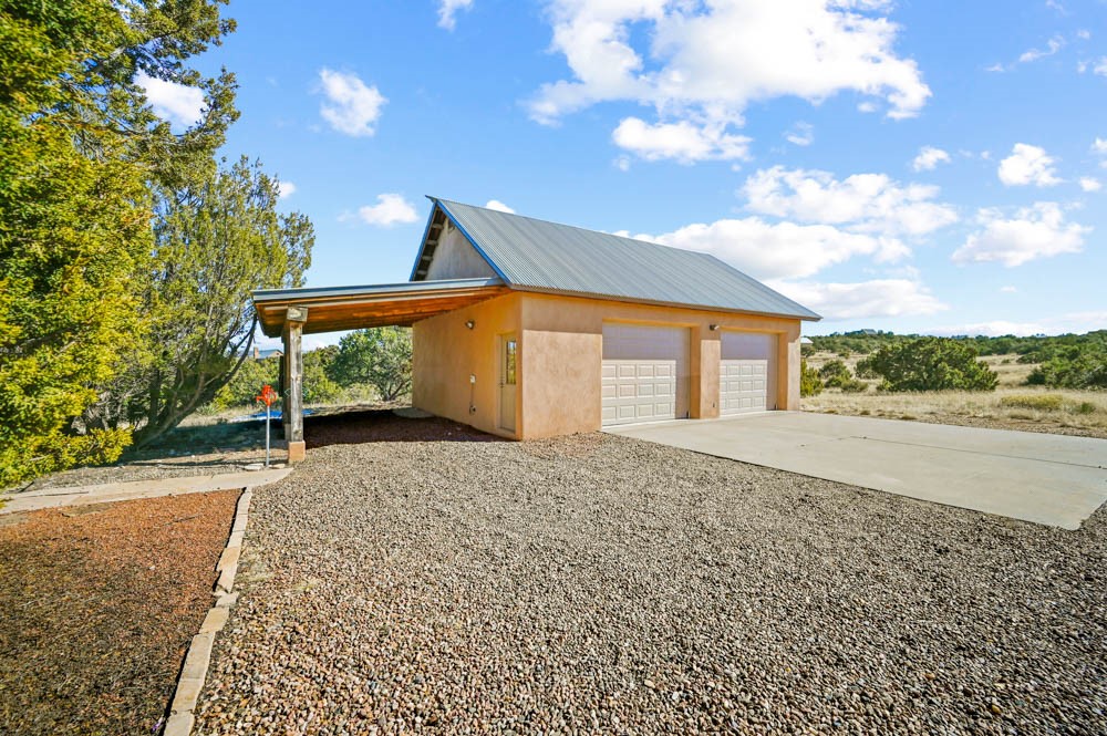 Nestled in the sought-after Art Barns area of Lamy, just a scenic 20-minute drive from Santa Fe, this distinctive 2-bedroom, 2-bath home offers a rare blend of privacy, character, and sweeping mountain views on 5.86 acres. Spanning 2,563 square feet, the residence features beautiful Saltillo tile flooring, comfortable in-floor radiant heating, and a flexible loft space ideal for a home office or family room. A pitched roof and classic Southwestern styling complement the surrounding landscape, while recent 2025 updates--including a new boiler, stucco repairs on the home, and brand-new stucco on the detached oversized 2-car garage--provide peace of mind. With expansive outdoor space, stunning vistas, and easy access to Eldorado's shopping and Santa Fe's amenities, this property is an exceptional opportunity to enjoy serene high-desert living at its finest.