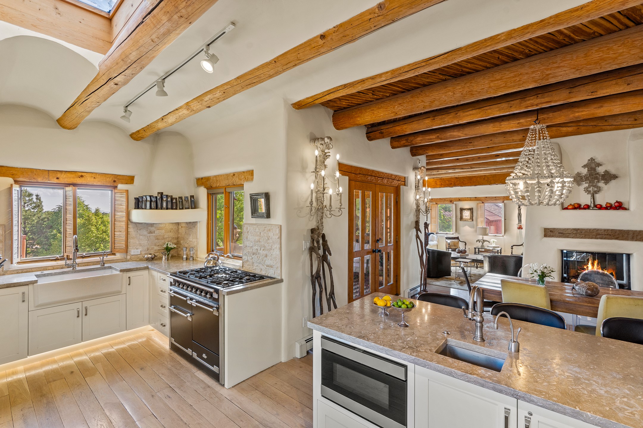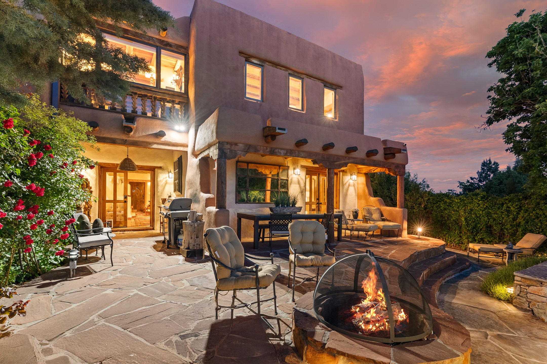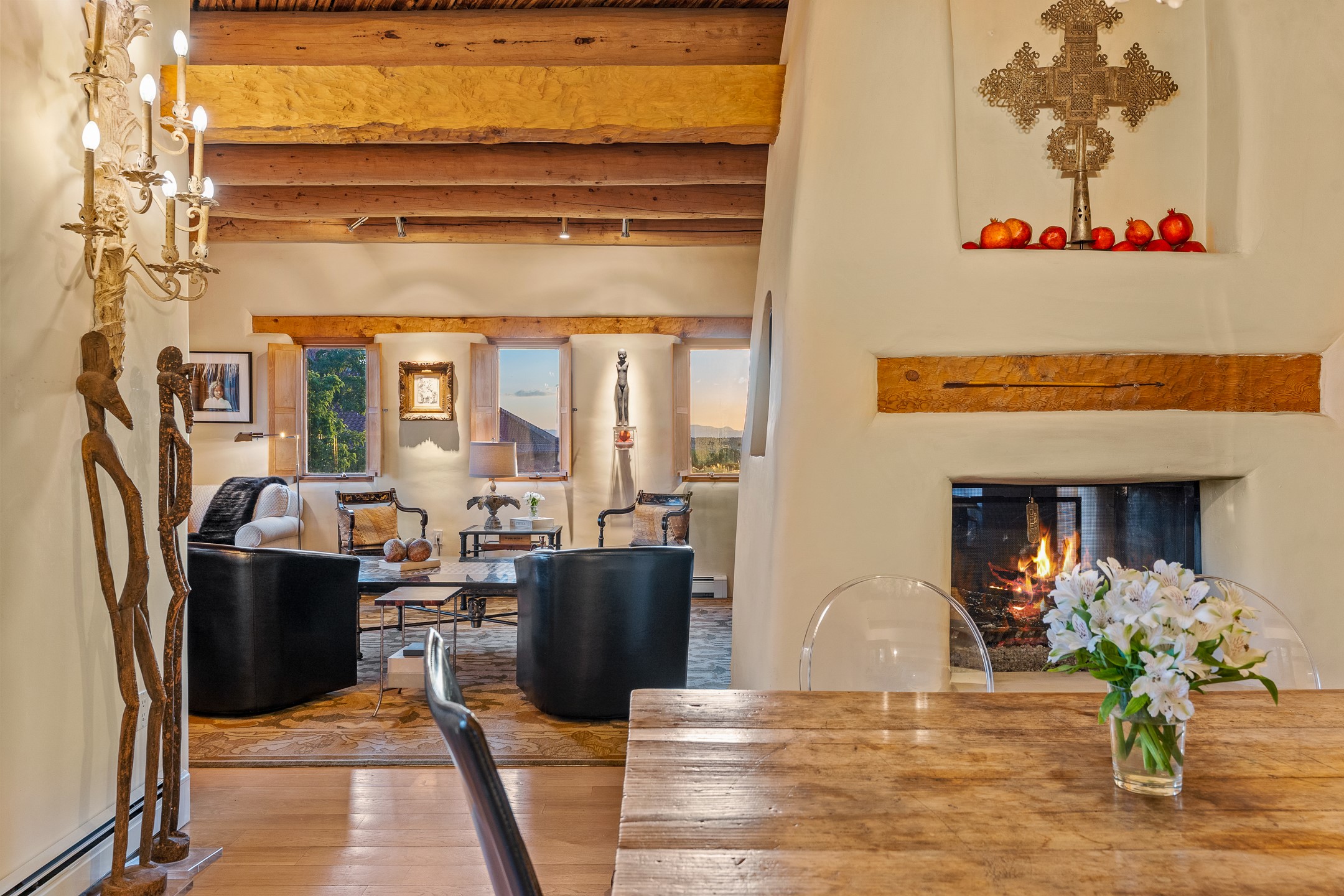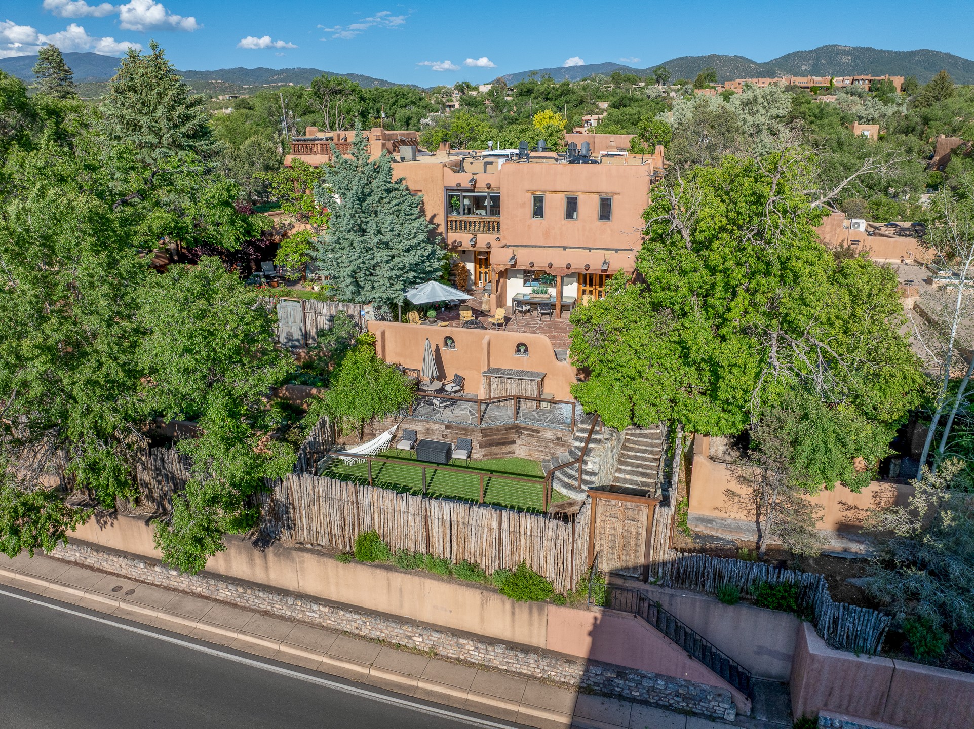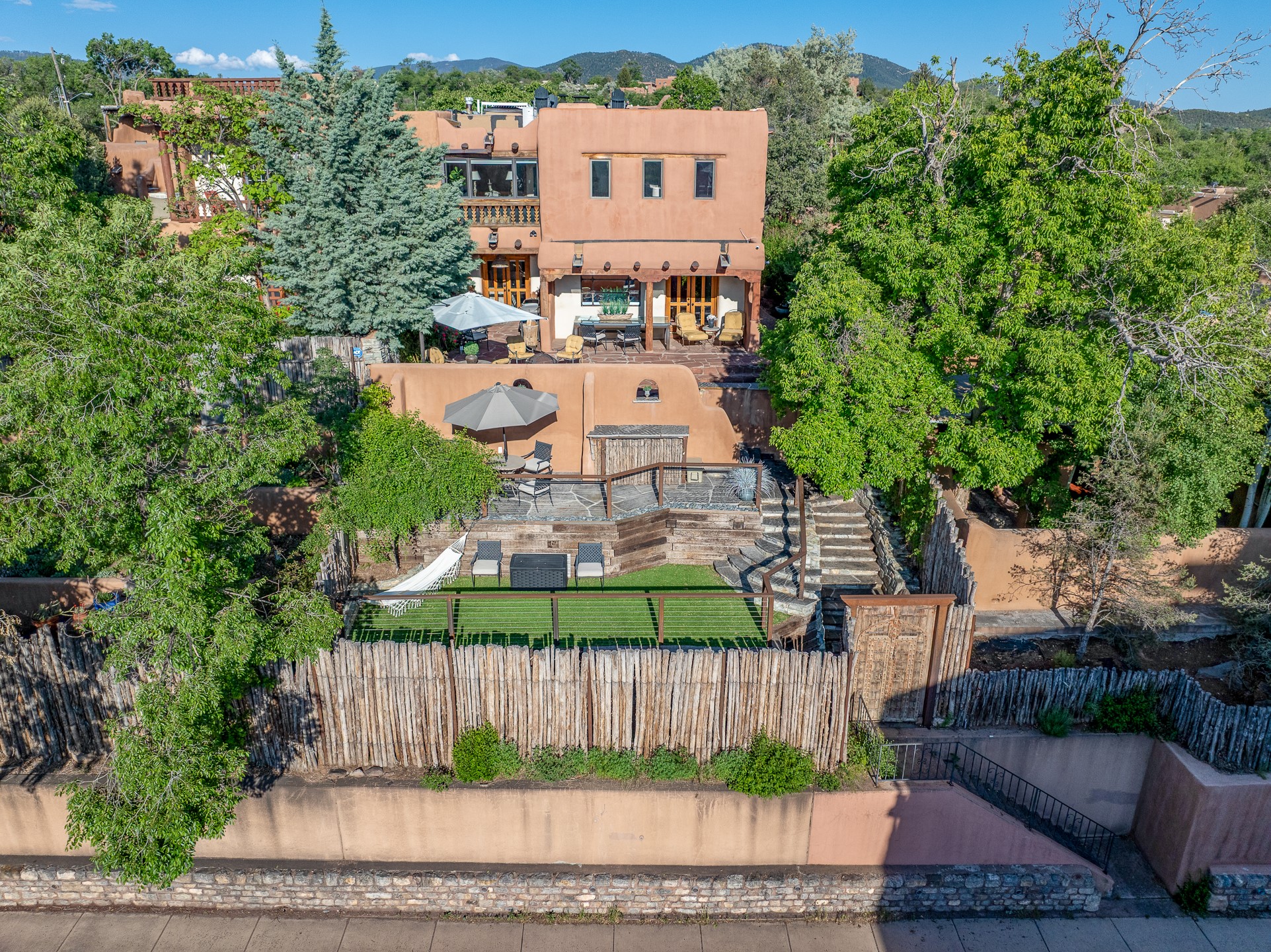 Where the Charm of San Miguel de Allende Meets the Magic of Santa Fe. Perched just above Bishop's Lodge Rd in the Historic district--only one block from the beloved SantaCaf and Market Street Steakhouse--this extraordinary adobe sanctuary offers a magical blend of romance, drama, and sweeping views. From sunsets over the Jemez to the sparkling city lights below, every angle reveals another layer of enchantment. This is a home that speaks in texture, light, and soul--a true Santa Fe treasure infused with old-world elegance. The 2,600 sq. ft. 2 bedroom, 2 bath home has been reimagined with refined artistry and attention to detail. The primary bath is a serene retreat with floor-to-ceiling river rock walls and a 4" deep white onyx double vanity lit from below, allowing the onyx geode sinks to glow. The primary bedroom has French doors that open to a private patio sanctuary, where tiered terraces and lush landscaping offer expansive Jemez mountain views and beautiful Santa Fe sunsets. A curved stone stairway lined with 10 ft stone walls lead down to dramatic antique Indian elephant doors, offering a secret, storybook passage to The Plaza. The foyer opens up to a 22 ft atrium and a wooden carved staircase. The second floor retreat is an open-concept kitchen/living/dining design. The space is anchored by a double-sided wood-burning fireplace that connects the dining and living rooms, adding warmth and ambiance to this exceptional space. The chef's kitchen has been completely renovated with embedded shell limestone honed countertops, a $15,000 AGA Elise gas stove with a wok burner, a chiseled brick cream limestone backsplash, and custom cream cabinetry--offering both elegance and functionality. The dining area opens onto a covered portal with sweeping views of Santa Fe's mountains and downtown skyline. In the living room, romantic shuttered windows frame a bird's-eye view of the city with views of the Ortiz mountains, Sun and Moon mountains, the Jemez Mountains and the city lights. 333 Magdalena - An extraordinary residence where timeless design, natural beauty, and an unbeatable location converge.