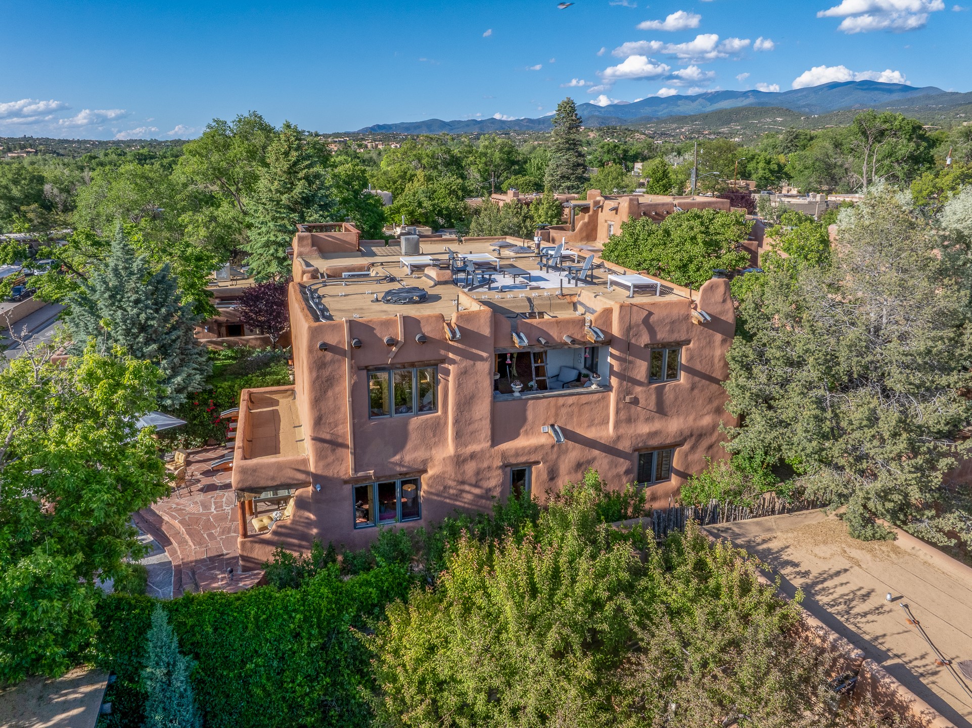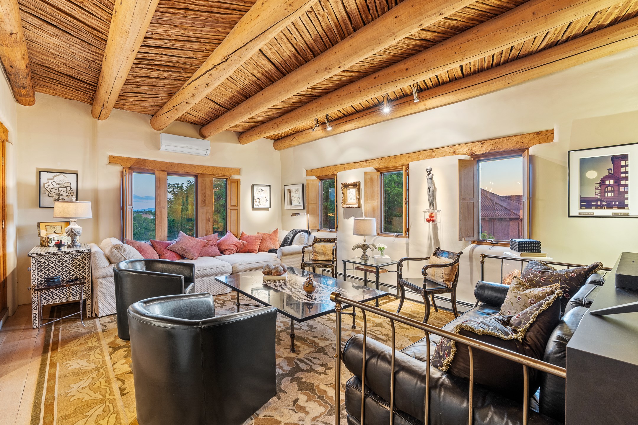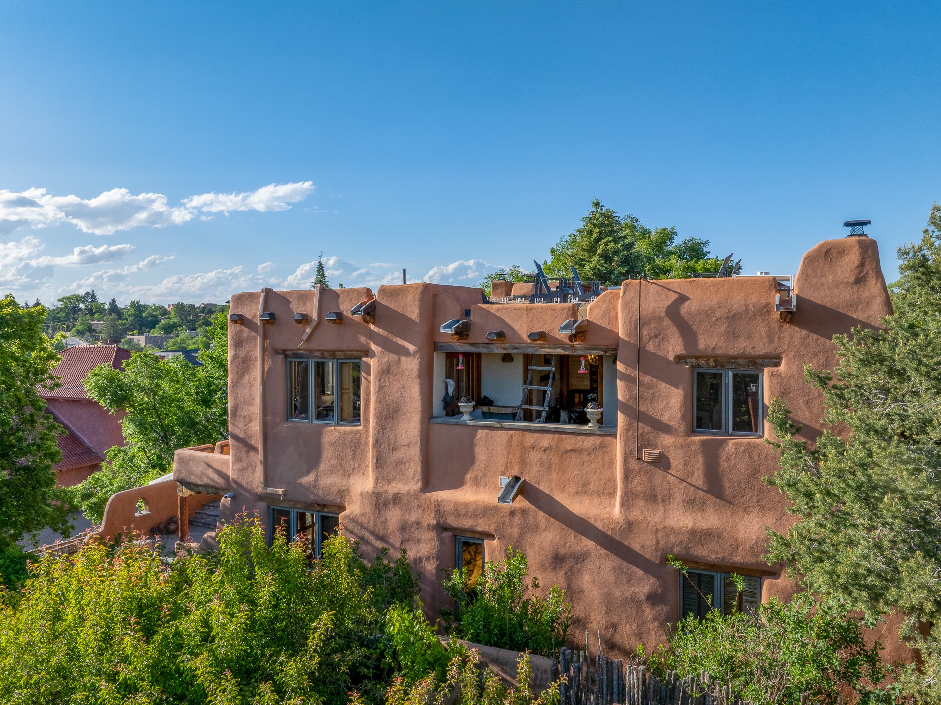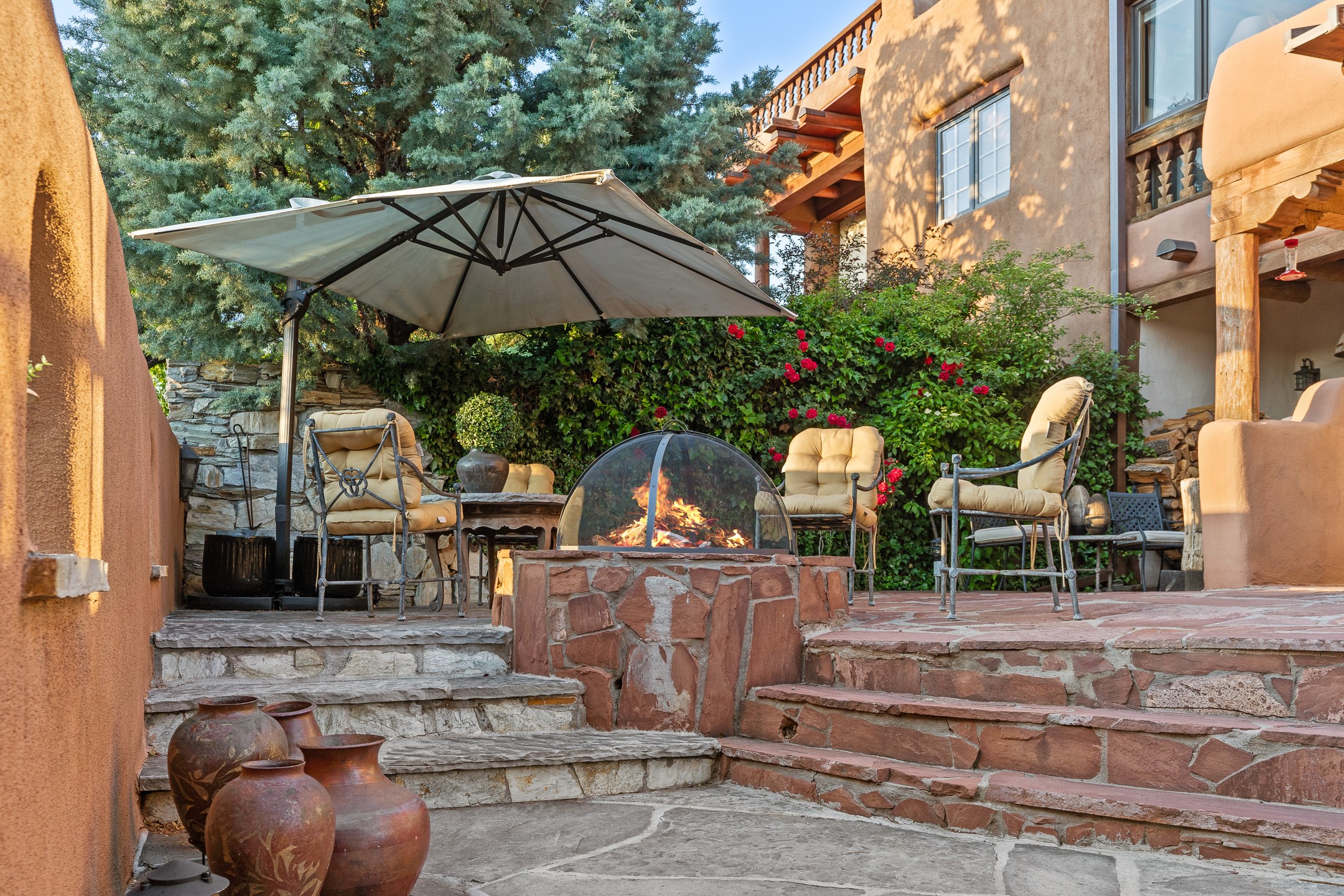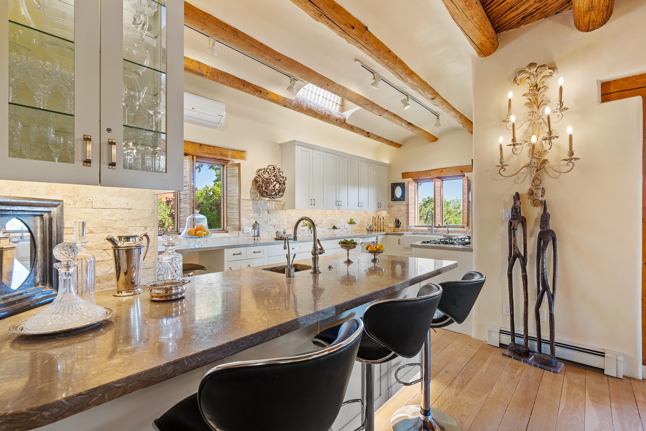 Where the Charm of San Miguel de Allende Meets the Magic of Santa Fe. Perched just above Bishop's Lodge Rd in the Historic district--only one block from the beloved SantaCaf and Market Street Steakhouse--this extraordinary adobe sanctuary offers a magical blend of romance, drama, and sweeping views. From sunsets over the Jemez to the sparkling city lights below, every angle reveals another layer of enchantment. This is a home that speaks in texture, light, and soul--a true Santa Fe treasure infused with old-world elegance. The 2,600 sq. ft. 2 bedroom, 2 bath home has been reimagined with refined artistry and attention to detail. The primary bath is a serene retreat with floor-to-ceiling river rock walls and a 4" deep white onyx double vanity lit from below, allowing the onyx geode sinks to glow. The primary bedroom has French doors that open to a private patio sanctuary, where tiered terraces and lush landscaping offer expansive Jemez mountain views and beautiful Santa Fe sunsets. A curved stone stairway lined with 10 ft stone walls lead down to dramatic antique Indian elephant doors, offering a secret, storybook passage to The Plaza. The foyer opens up to a 22 ft atrium and a wooden carved staircase. The second floor retreat is an open-concept kitchen/living/dining design. The space is anchored by a double-sided wood-burning fireplace that connects the dining and living rooms, adding warmth and ambiance to this exceptional space. The chef's kitchen has been completely renovated with embedded shell limestone honed countertops, a $15,000 AGA Elise gas stove with a wok burner, a chiseled brick cream limestone backsplash, and custom cream cabinetry--offering both elegance and functionality. The dining area opens onto a covered portal with sweeping views of Santa Fe's mountains and downtown skyline. In the living room, romantic shuttered windows frame a bird's-eye view of the city with views of the Ortiz mountains, Sun and Moon mountains, the Jemez Mountains and the city lights. 333 Magdalena - An extraordinary residence where timeless design, natural beauty, and an unbeatable location converge.