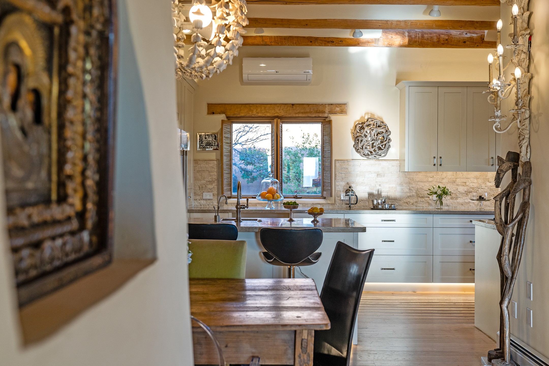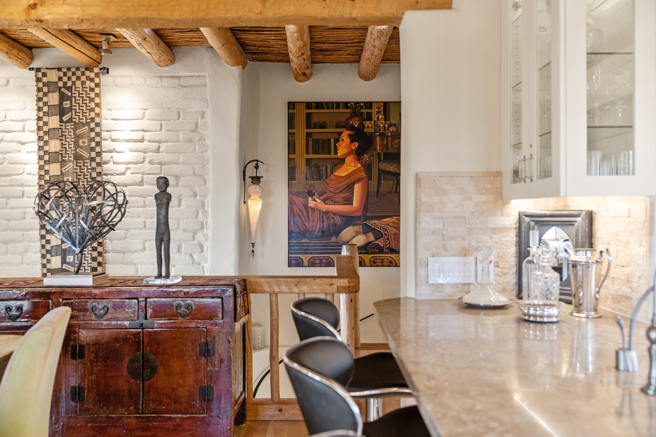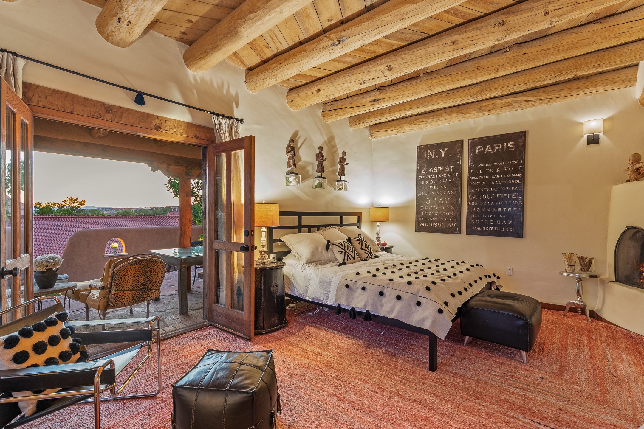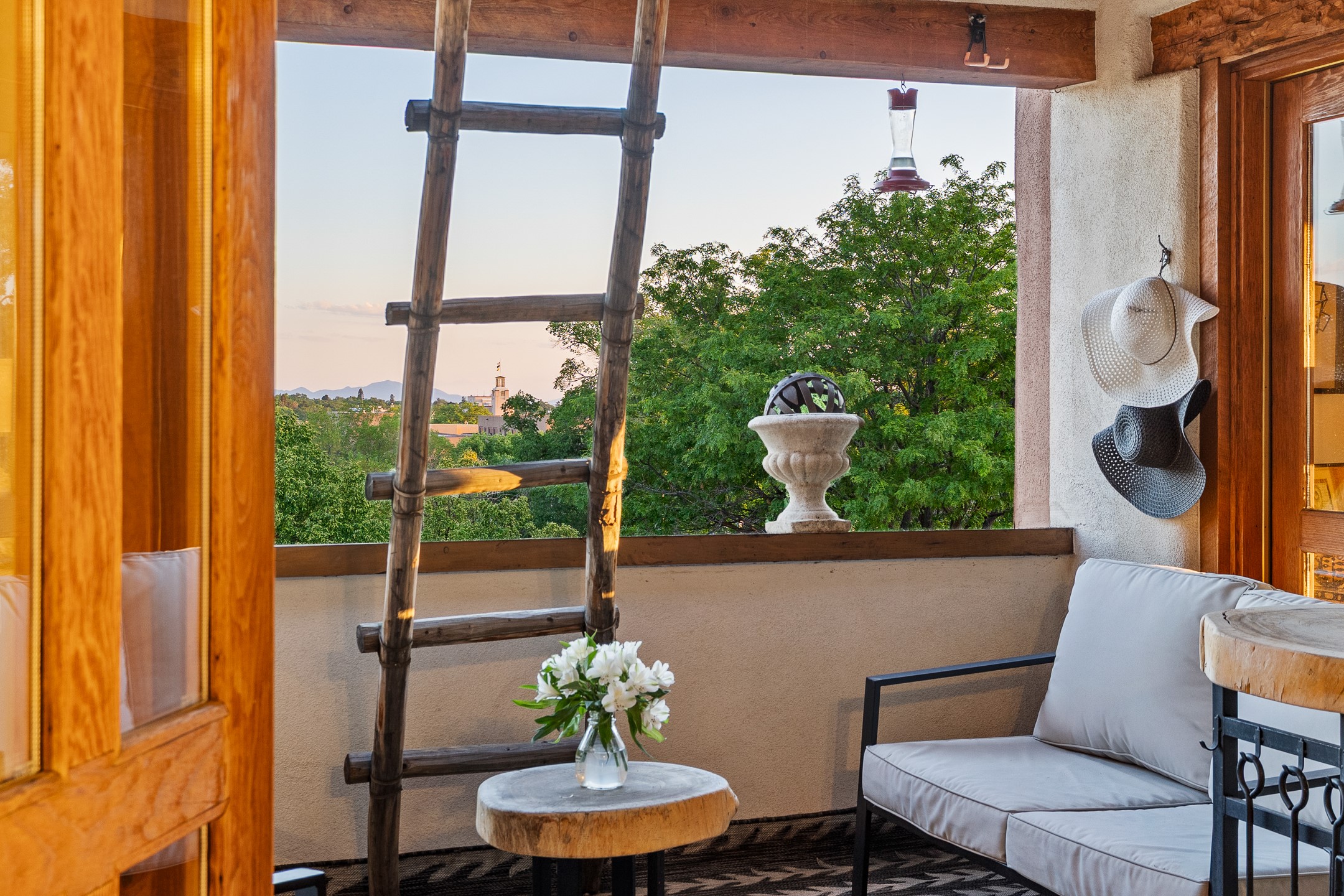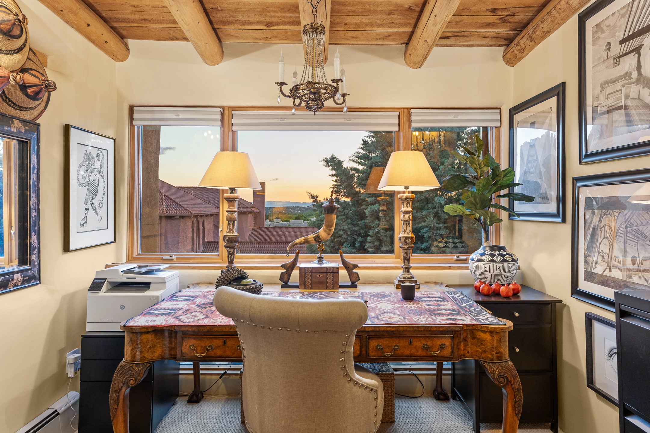 Where the Charm of San Miguel de Allende Meets the Magic of Santa Fe. Perched just above Bishop's Lodge Rd in the Historic district--only one block from the beloved SantaCaf and Market Street Steakhouse--this extraordinary adobe sanctuary offers a magical blend of romance, drama, and sweeping views. From sunsets over the Jemez to the sparkling city lights below, every angle reveals another layer of enchantment. This is a home that speaks in texture, light, and soul--a true Santa Fe treasure infused with old-world elegance. The 2,600 sq. ft. 2 bedroom, 2 bath home has been reimagined with refined artistry and attention to detail. The primary bath is a serene retreat with floor-to-ceiling river rock walls and a 4" deep white onyx double vanity lit from below, allowing the onyx geode sinks to glow. The primary bedroom has French doors that open to a private patio sanctuary, where tiered terraces and lush landscaping offer expansive Jemez mountain views and beautiful Santa Fe sunsets. A curved stone stairway lined with 10 ft stone walls lead down to dramatic antique Indian elephant doors, offering a secret, storybook passage to The Plaza. The foyer opens up to a 22 ft atrium and a wooden carved staircase. The second floor retreat is an open-concept kitchen/living/dining design. The space is anchored by a double-sided wood-burning fireplace that connects the dining and living rooms, adding warmth and ambiance to this exceptional space. The chef's kitchen has been completely renovated with embedded shell limestone honed countertops, a $15,000 AGA Elise gas stove with a wok burner, a chiseled brick cream limestone backsplash, and custom cream cabinetry--offering both elegance and functionality. The dining area opens onto a covered portal with sweeping views of Santa Fe's mountains and downtown skyline. In the living room, romantic shuttered windows frame a bird's-eye view of the city with views of the Ortiz mountains, Sun and Moon mountains, the Jemez Mountains and the city lights. 333 Magdalena - An extraordinary residence where timeless design, natural beauty, and an unbeatable location converge.