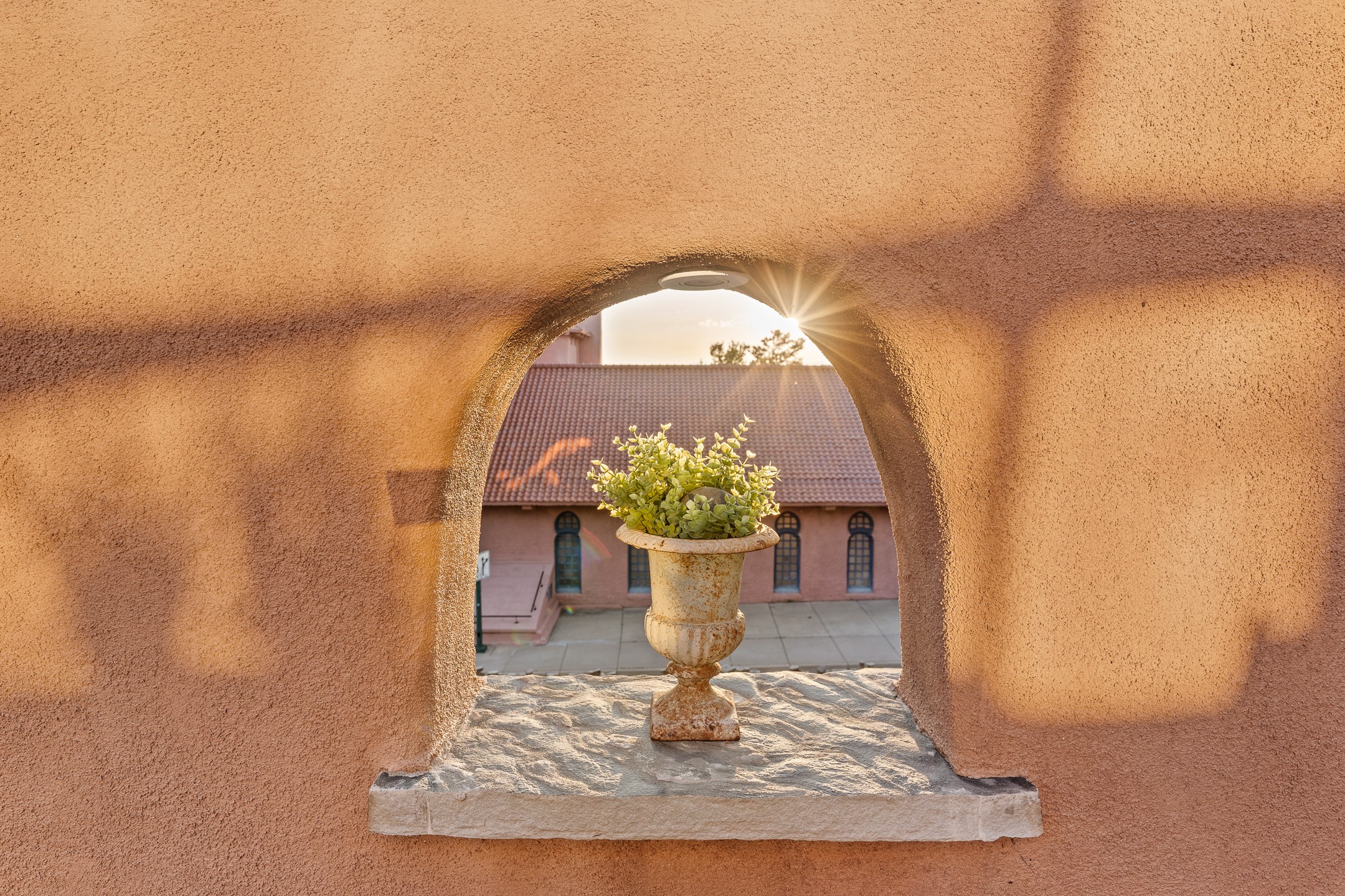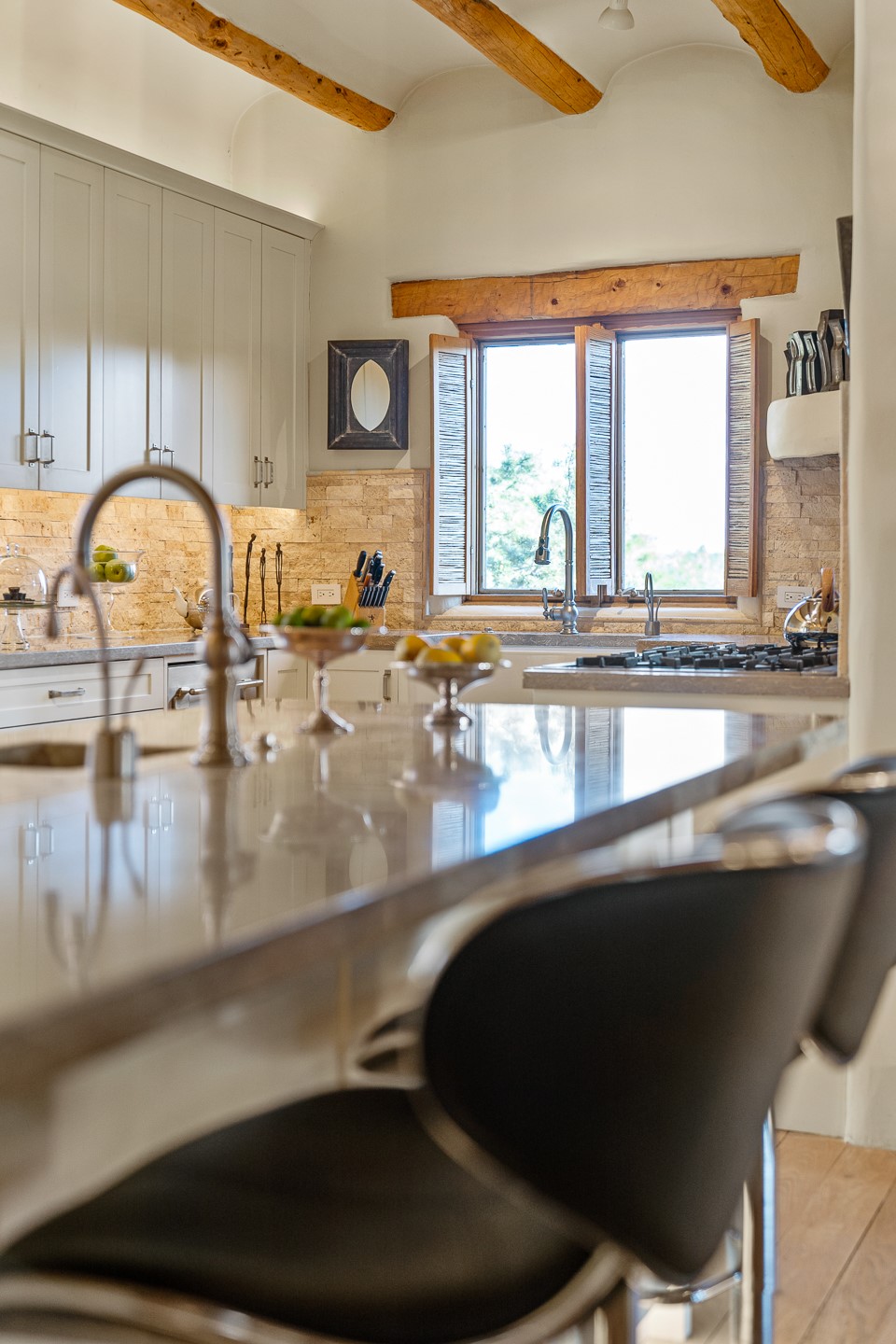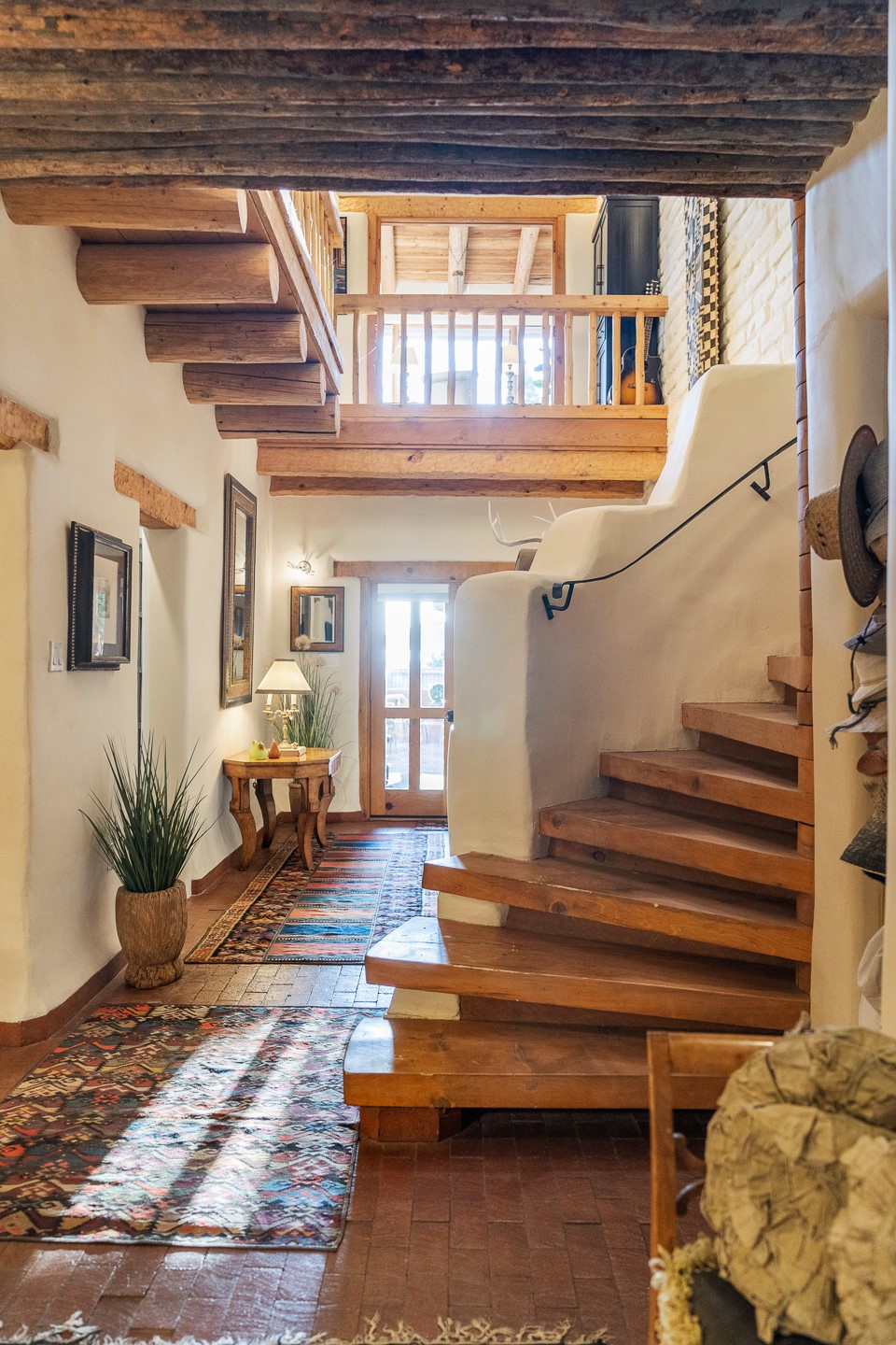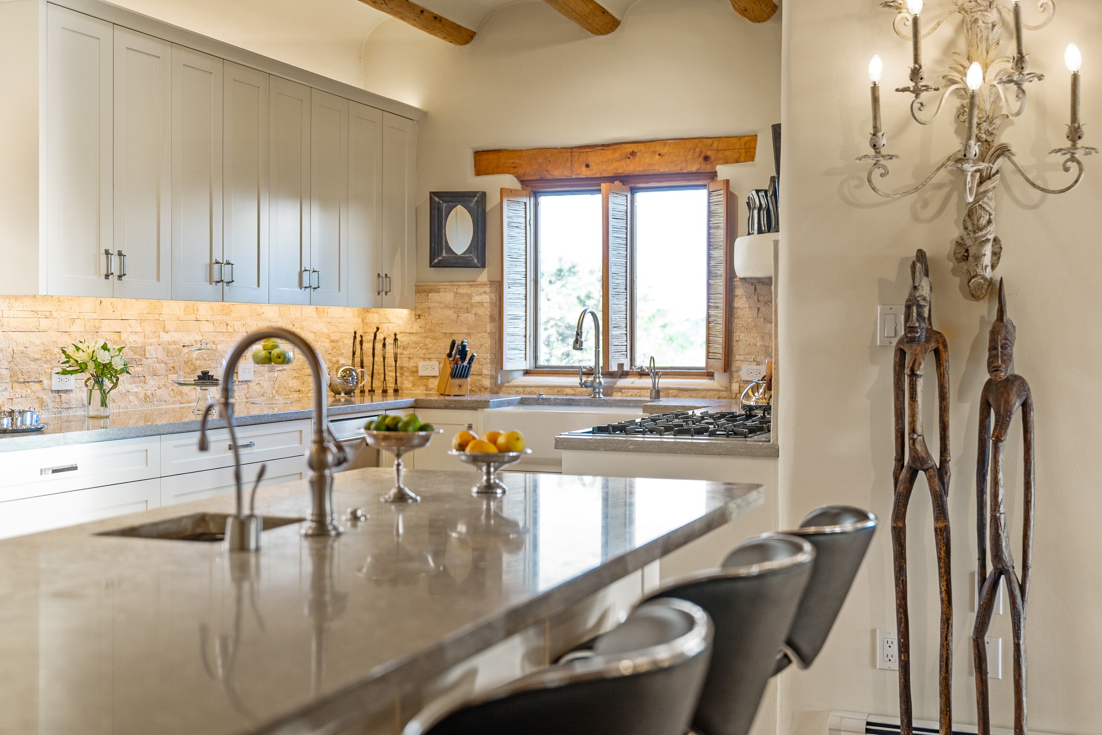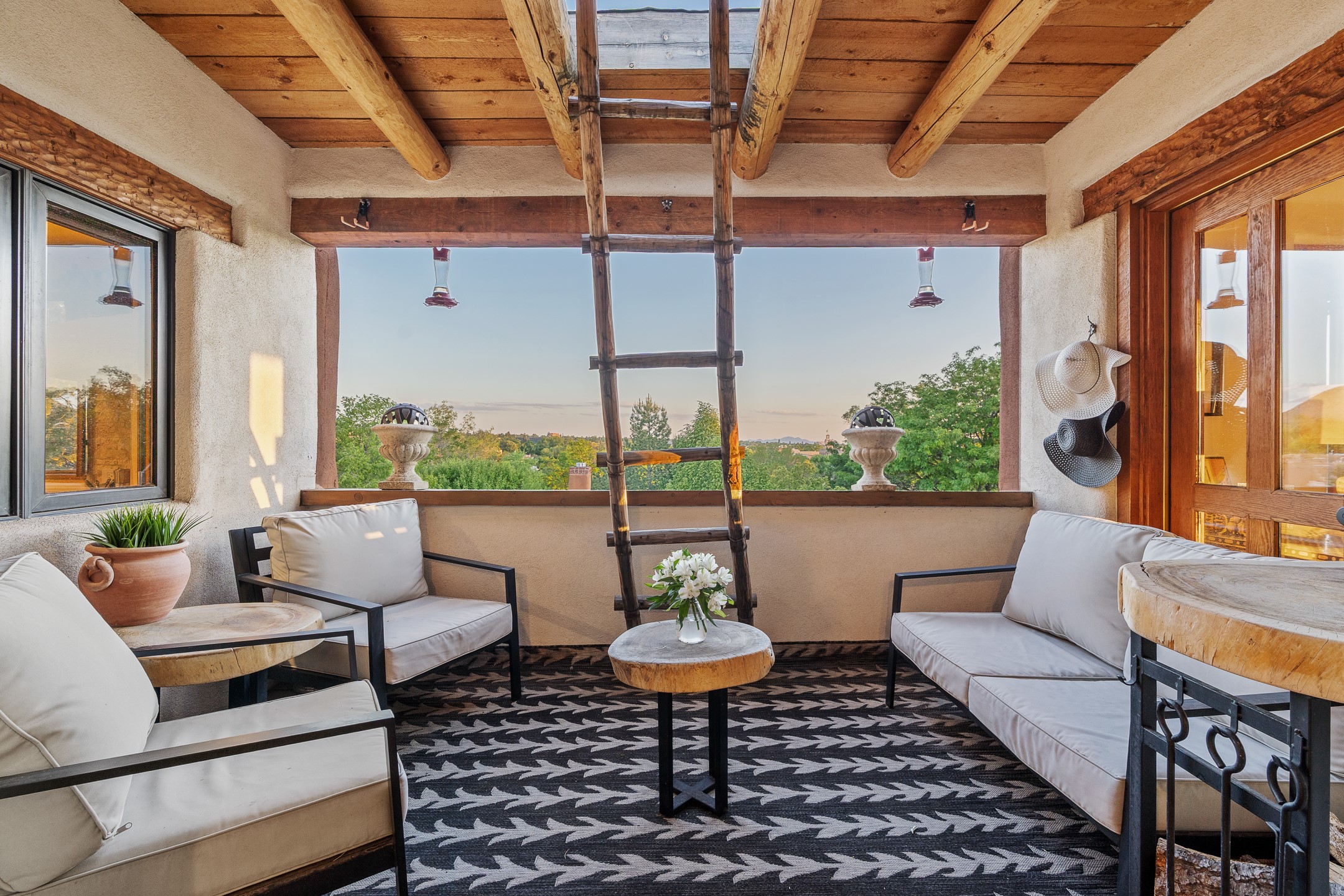 Where the Charm of San Miguel de Allende Meets the Magic of Santa Fe. Perched just above Bishop's Lodge Rd in the Historic district--only one block from the beloved SantaCaf and Market Street Steakhouse--this extraordinary adobe sanctuary offers a magical blend of romance, drama, and sweeping views. From sunsets over the Jemez to the sparkling city lights below, every angle reveals another layer of enchantment. This is a home that speaks in texture, light, and soul--a true Santa Fe treasure infused with old-world elegance. The 2,600 sq. ft. 2 bedroom, 2 bath home has been reimagined with refined artistry and attention to detail. The primary bath is a serene retreat with floor-to-ceiling river rock walls and a 4" deep white onyx double vanity lit from below, allowing the onyx geode sinks to glow. The primary bedroom has French doors that open to a private patio sanctuary, where tiered terraces and lush landscaping offer expansive Jemez mountain views and beautiful Santa Fe sunsets. A curved stone stairway lined with 10 ft stone walls lead down to dramatic antique Indian elephant doors, offering a secret, storybook passage to The Plaza. The foyer opens up to a 22 ft atrium and a wooden carved staircase. The second floor retreat is an open-concept kitchen/living/dining design. The space is anchored by a double-sided wood-burning fireplace that connects the dining and living rooms, adding warmth and ambiance to this exceptional space. The chef's kitchen has been completely renovated with embedded shell limestone honed countertops, a $15,000 AGA Elise gas stove with a wok burner, a chiseled brick cream limestone backsplash, and custom cream cabinetry--offering both elegance and functionality. The dining area opens onto a covered portal with sweeping views of Santa Fe's mountains and downtown skyline. In the living room, romantic shuttered windows frame a bird's-eye view of the city with views of the Ortiz mountains, Sun and Moon mountains, the Jemez Mountains and the city lights. 333 Magdalena - An extraordinary residence where timeless design, natural beauty, and an unbeatable location converge.