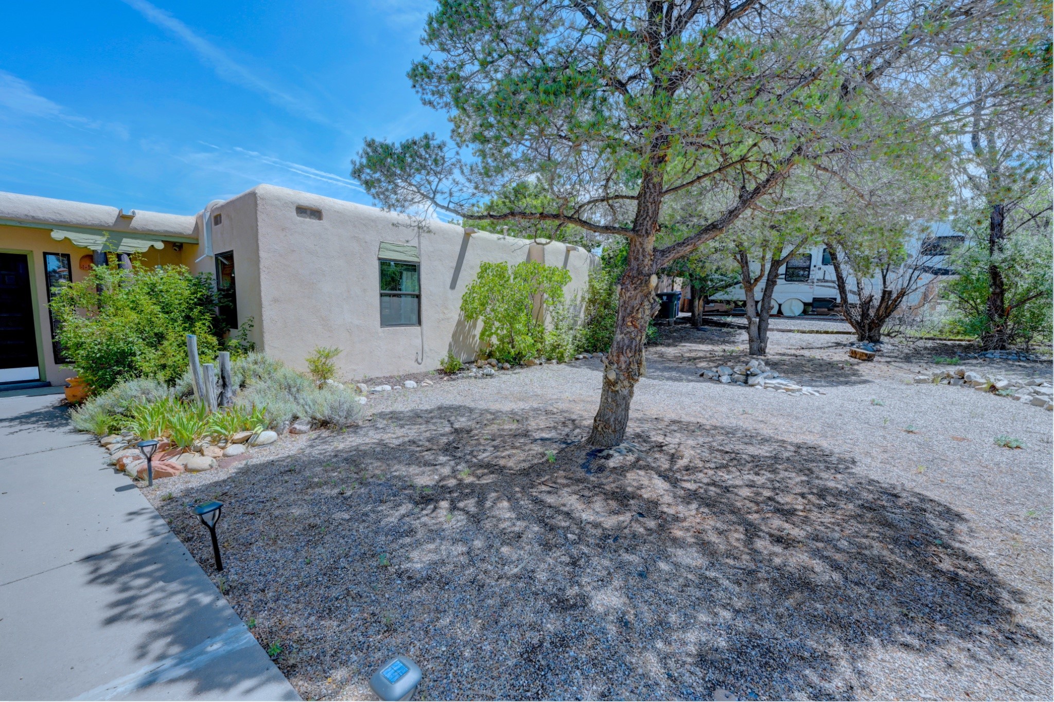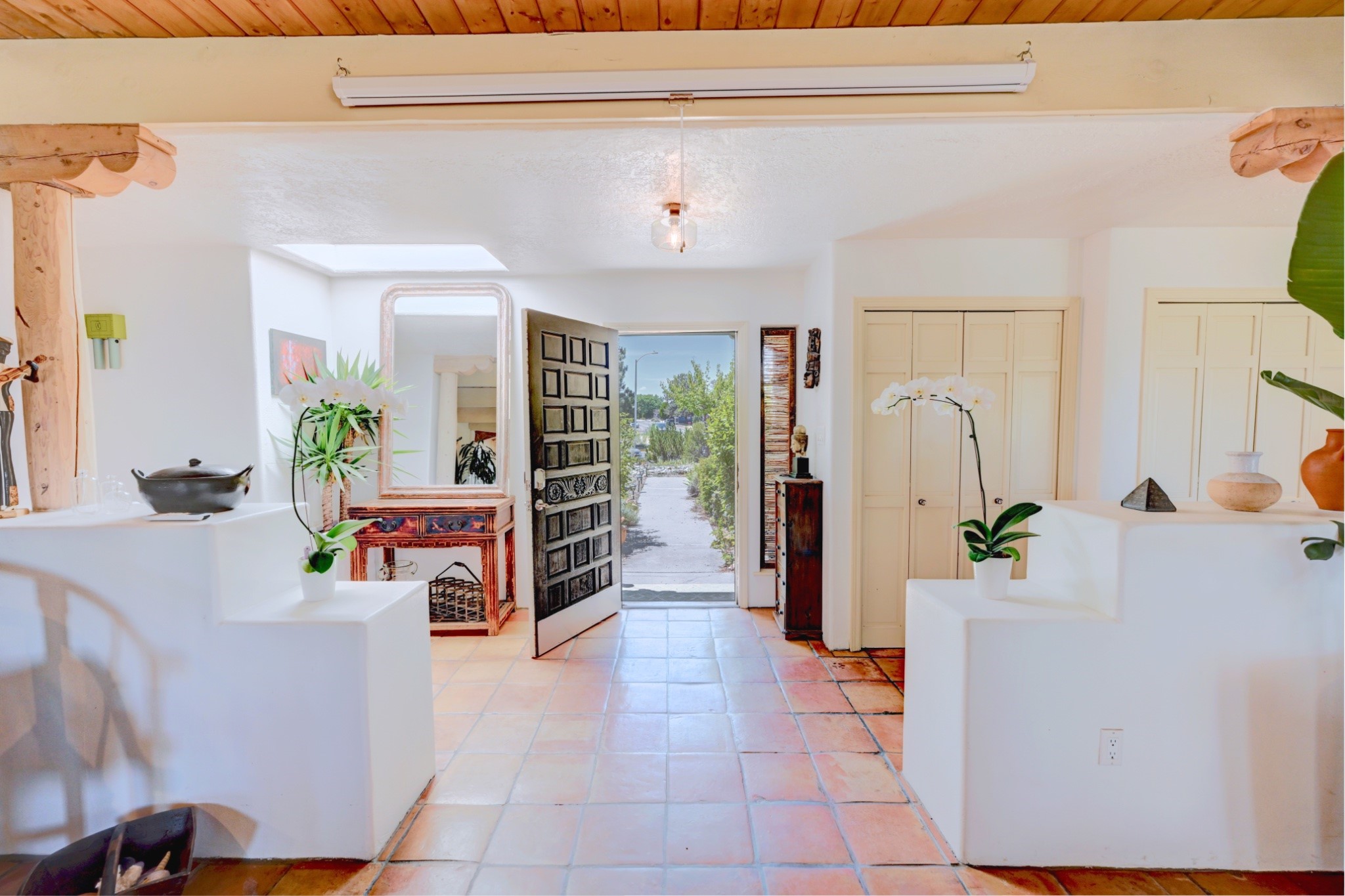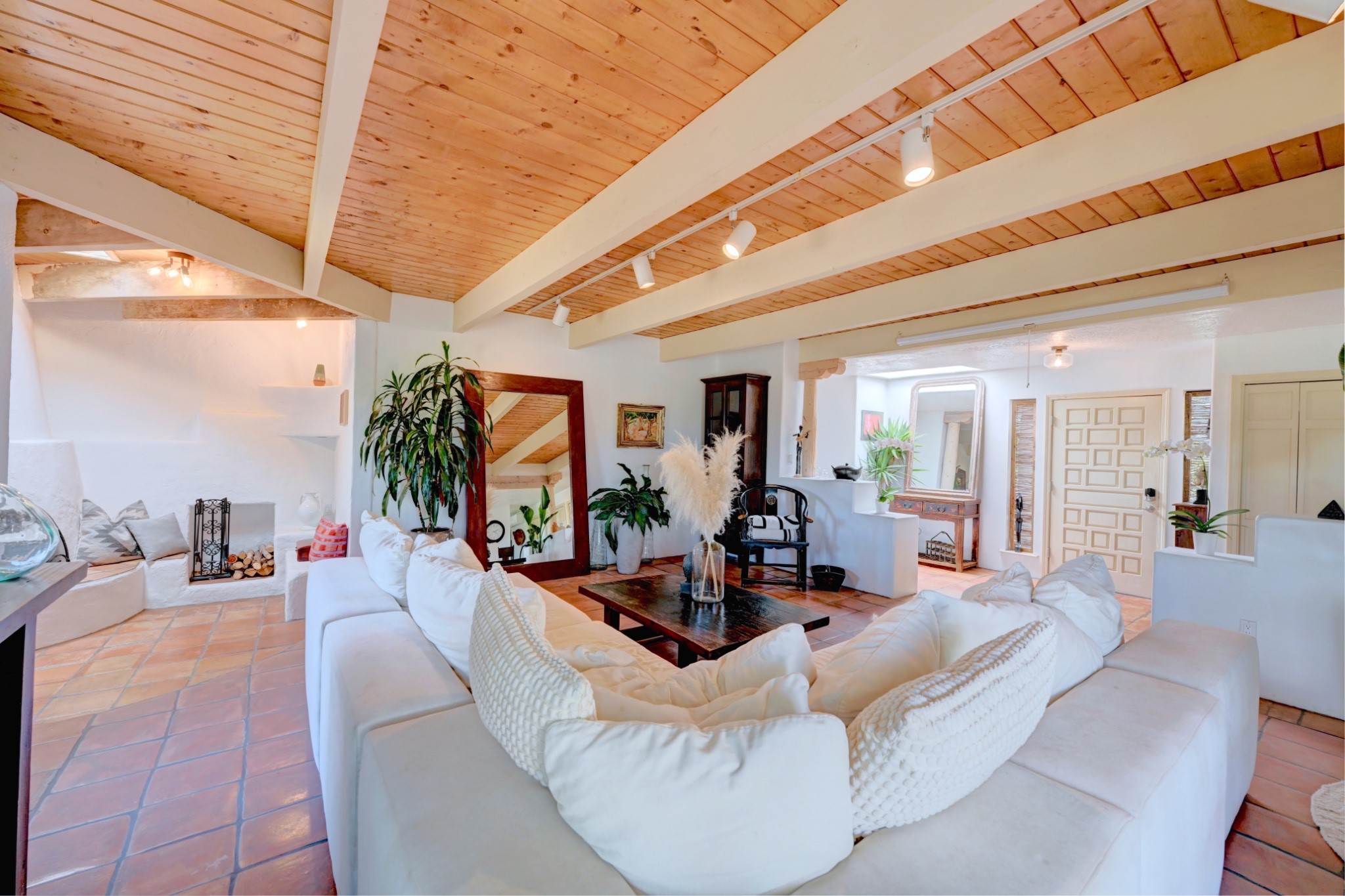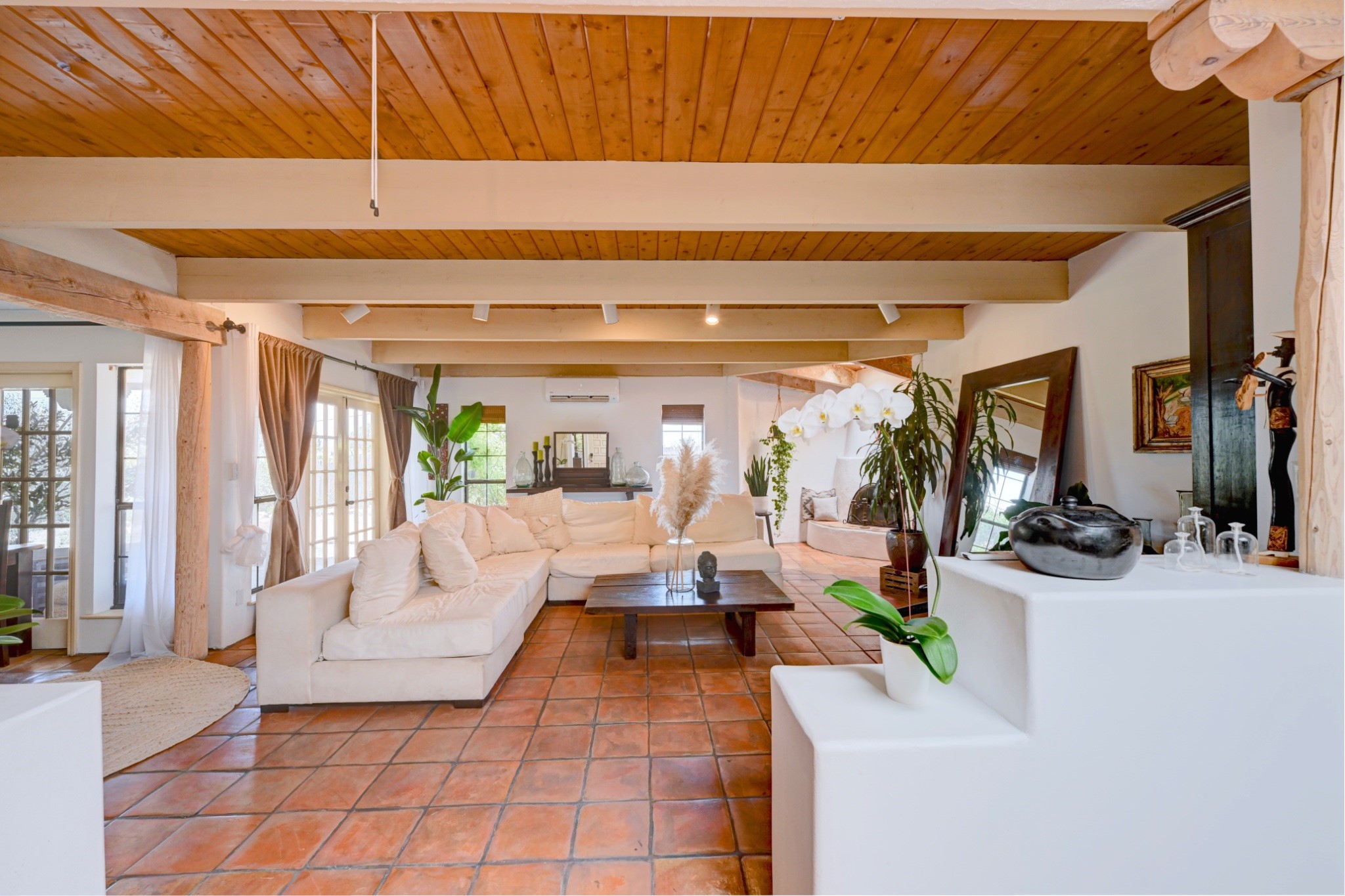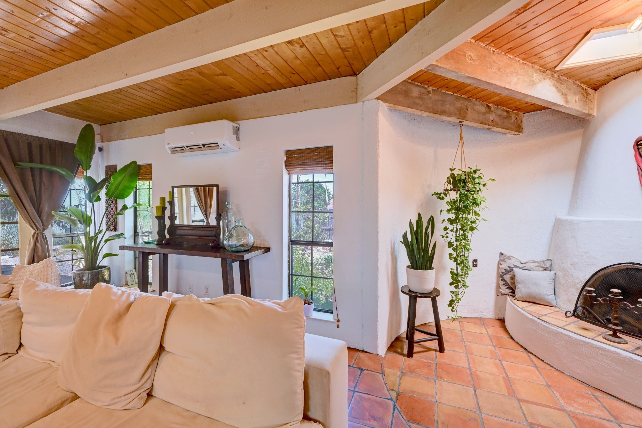Discover the perfect blend of Southwestern charm and modern convenience in this captivating 3-bedroom, 3-bathroom home spanning 2,376 square feet. This Santa Fe gem welcomes you with authentic Saltillo tiles and stunning exposed ceiling beams that create an atmosphere of rustic elegance throughout.The heart of the home features a beautiful Kiva-style fireplace with its own intimate sitting area, perfect for cozy evenings or entertaining guests. Stay comfortable year-round with five newly installed mini-split systems ensuring optimal climate control in every corner of your home.Recent upgrades include a new tankless water heater for endless hot water, a convenient garage door opener, and a completely redone driveway that enhances curb appeal. Two radon mitigation systems provide peace of mind with comprehensive coverage at both ends of the house.The generous lot offers ample outdoor space, including room for recreational vehicle parking - a rare find that adds tremendous value for adventure enthusiasts. The neighborhood perfectly balances tranquil residential living with urban convenience, placing you within walking distance of local shops and restaurants.Your daily commute is simplified with the Zia Road Rail Runner Station just minutes away, while El Paisano Supermarkets ensures grocery runs are quick and convenient. For outdoor recreation, Dr. Martin Luther King Jr. Park sits practically at your doorstep, offering green space for relaxation and activities.This thoughtfully maintained home combines authentic Santa Fe architectural elements with practical modern amenities, creating an ideal living environment in one of the city's most desirable neighborhoods.Don't forget to check out the 3-D virtual tour, as well as the drone flyover of the area.