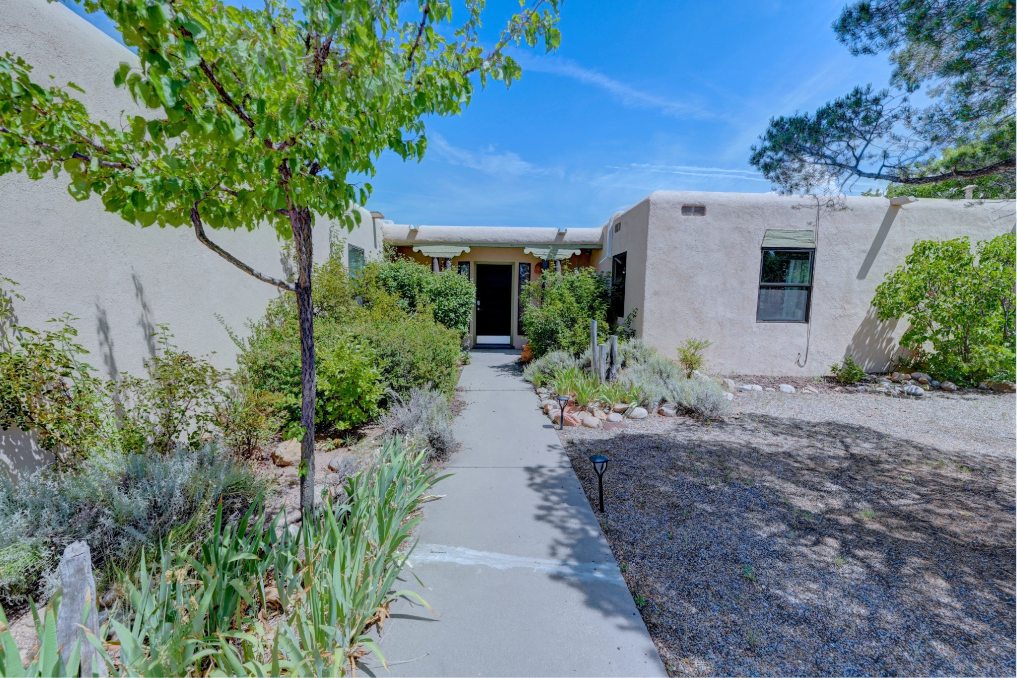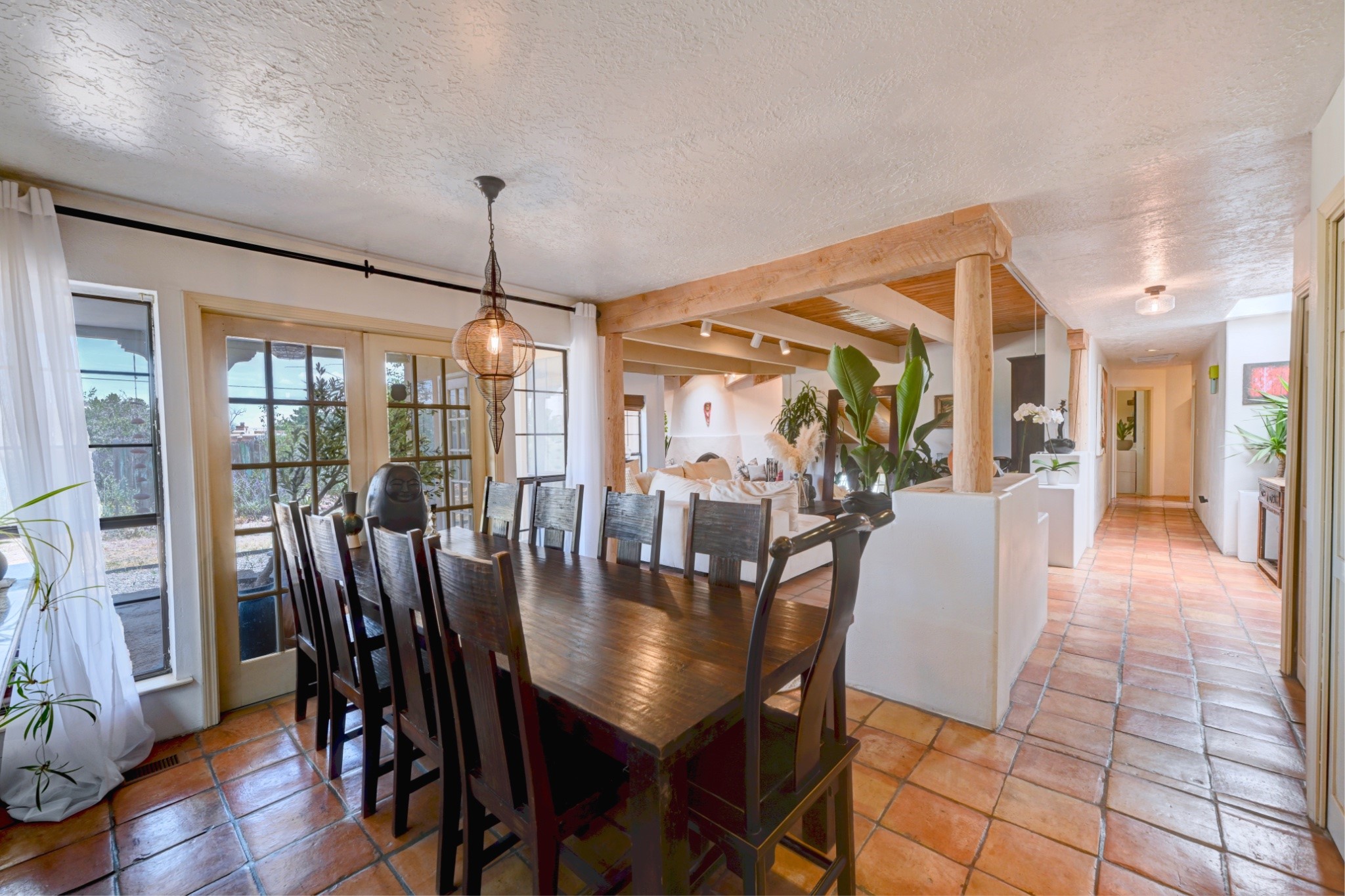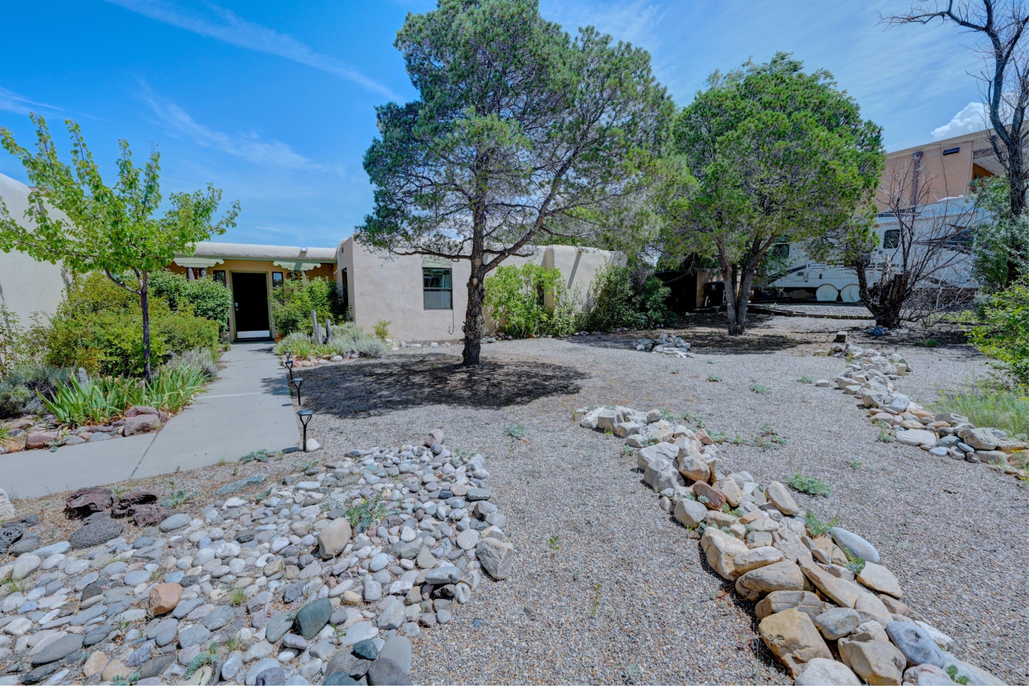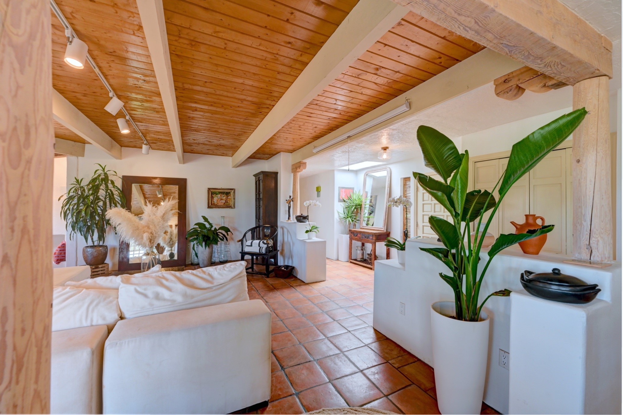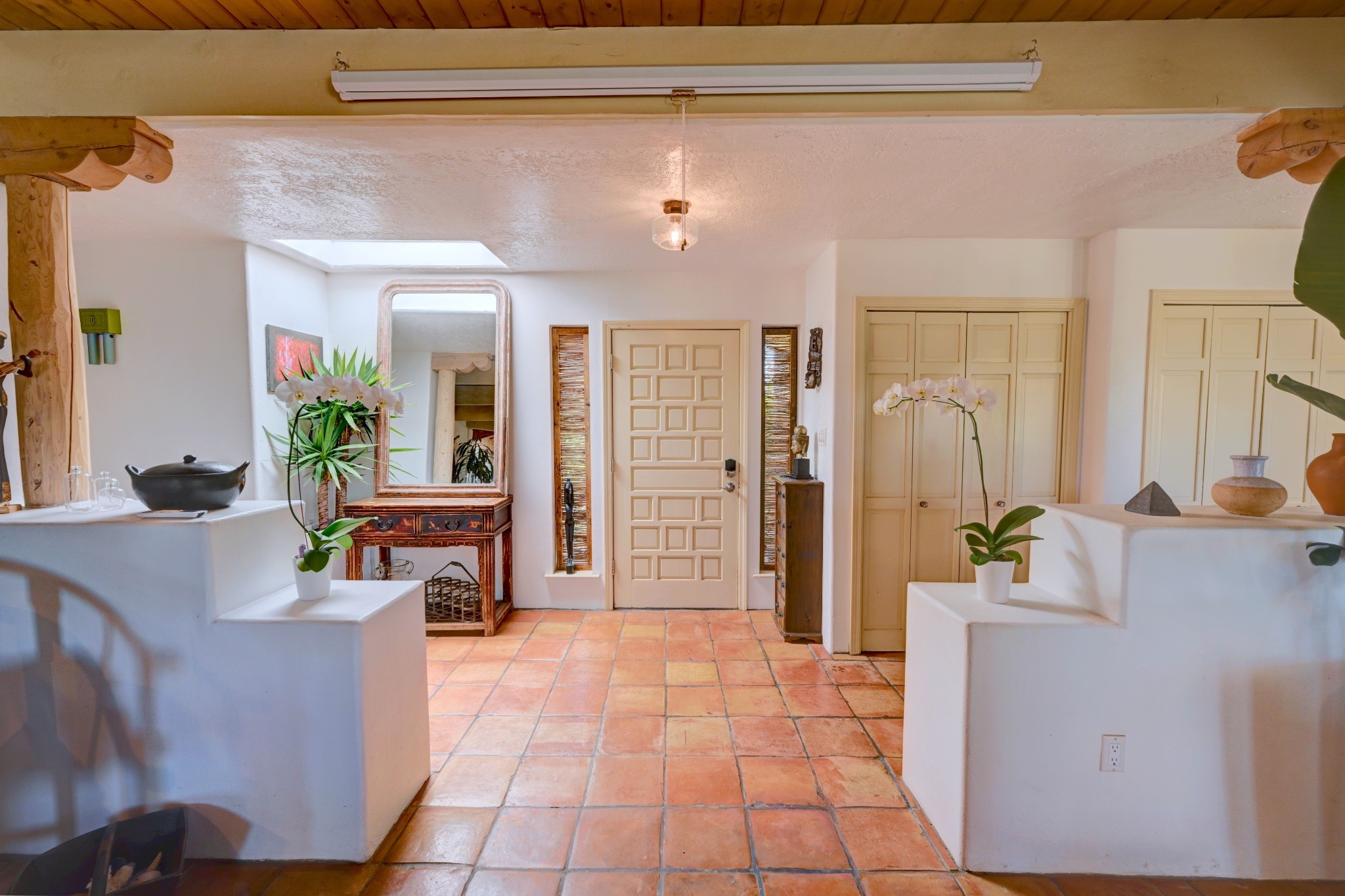 Discover the perfect blend of Southwestern charm and modern convenience in this captivating 3-bedroom, 3-bathroom home spanning 2,376 square feet. This Santa Fe gem welcomes you with authentic Saltillo tiles and stunning exposed ceiling beams that create an atmosphere of rustic elegance throughout.The heart of the home features a beautiful Kiva-style fireplace with its own intimate sitting area, perfect for cozy evenings or entertaining guests. Stay comfortable year-round with five newly installed mini-split systems ensuring optimal climate control in every corner of your home.Recent upgrades include a new tankless water heater for endless hot water, a convenient garage door opener, and a completely redone driveway that enhances curb appeal. Two radon mitigation systems provide peace of mind with comprehensive coverage at both ends of the house.The generous lot offers ample outdoor space, including room for recreational vehicle parking - a rare find that adds tremendous value for adventure enthusiasts. The neighborhood perfectly balances tranquil residential living with urban convenience, placing you within walking distance of local shops and restaurants.Your daily commute is simplified with the Zia Road Rail Runner Station just minutes away, while El Paisano Supermarkets ensures grocery runs are quick and convenient. For outdoor recreation, Dr. Martin Luther King Jr. Park sits practically at your doorstep, offering green space for relaxation and activities.This thoughtfully maintained home combines authentic Santa Fe architectural elements with practical modern amenities, creating an ideal living environment in one of the city's most desirable neighborhoods.Don't forget to check out the 3-D virtual tour, as well as the drone flyover of the area.