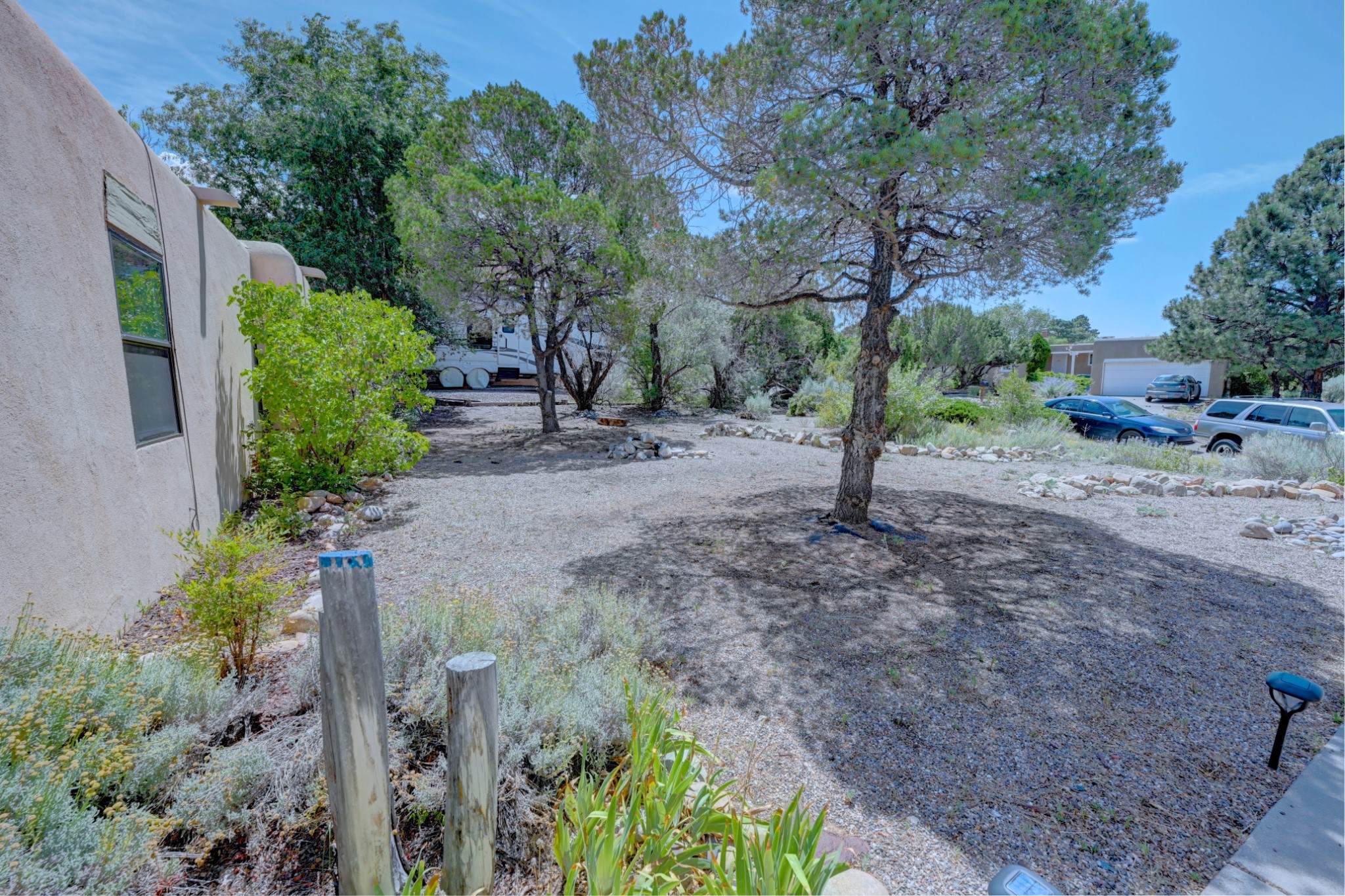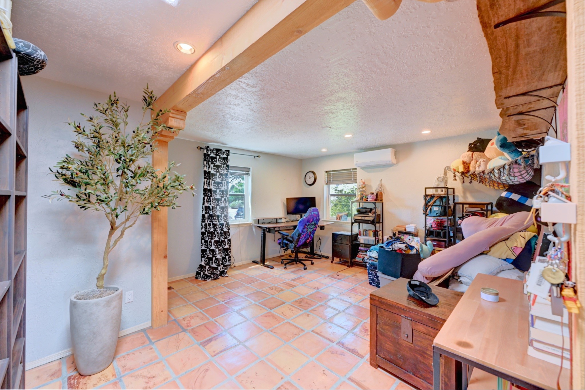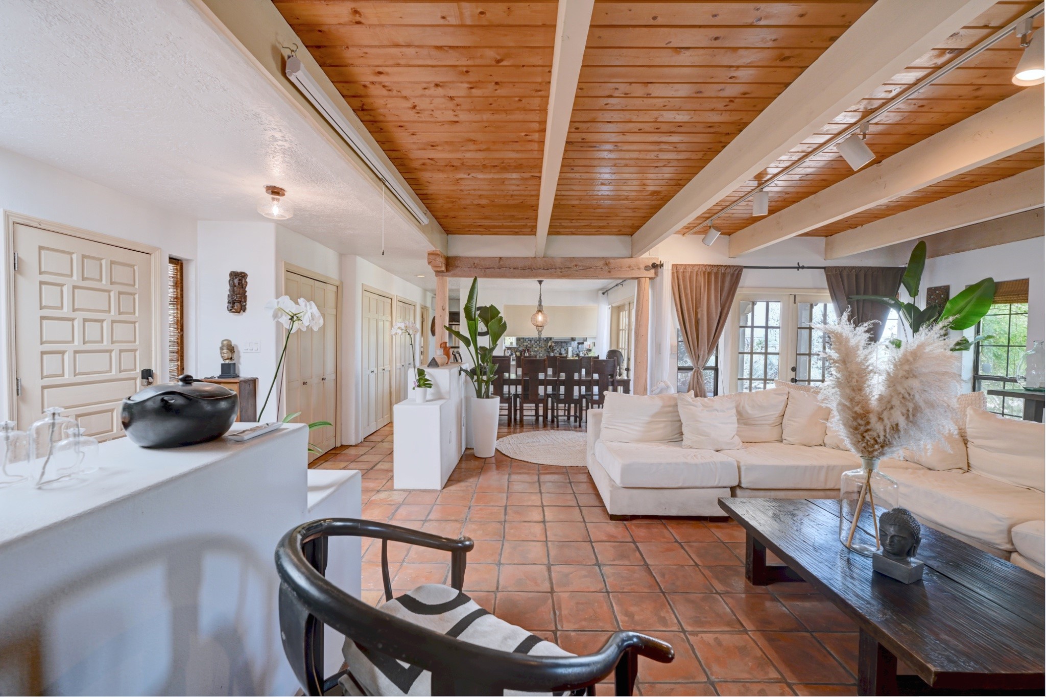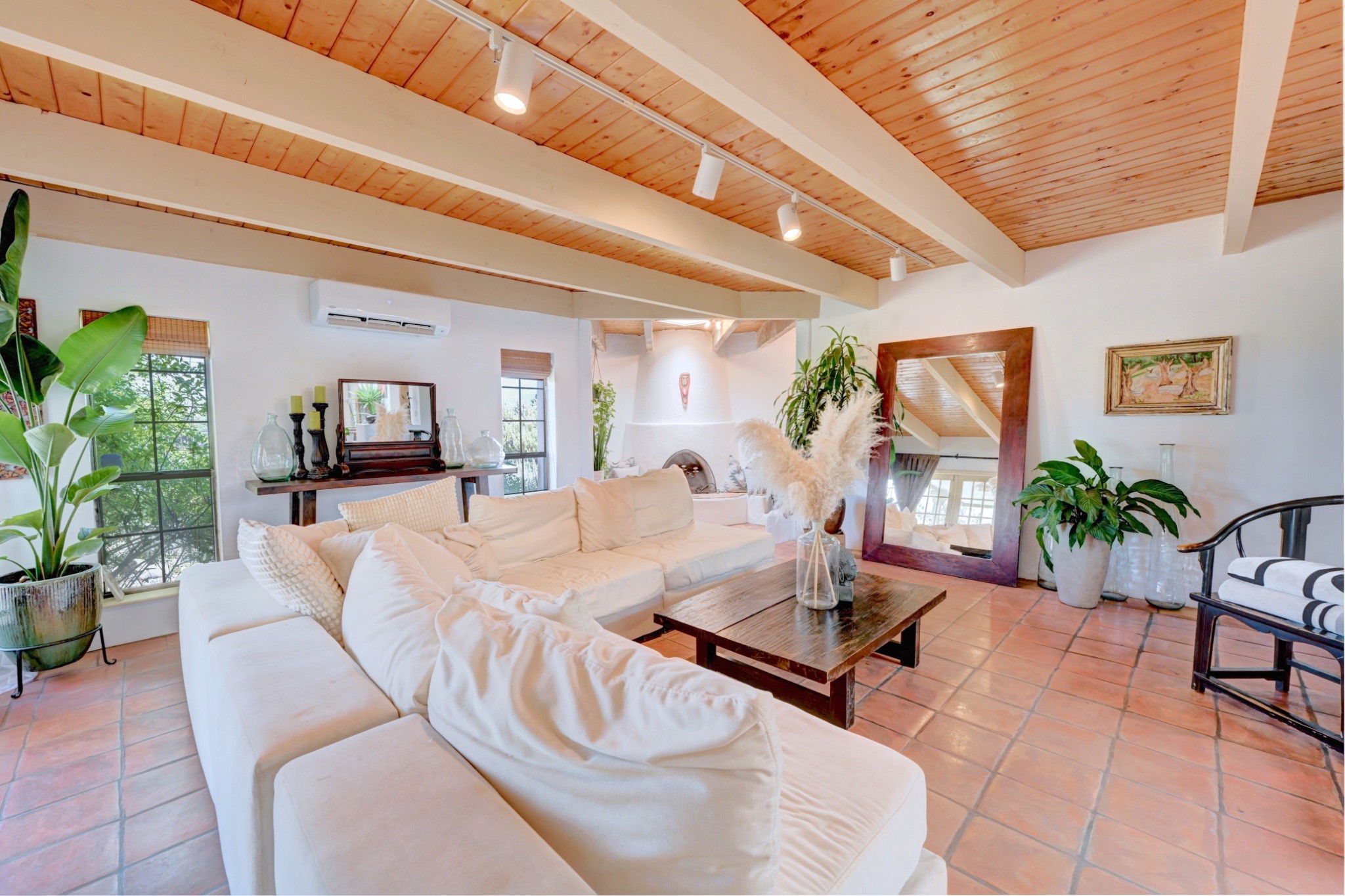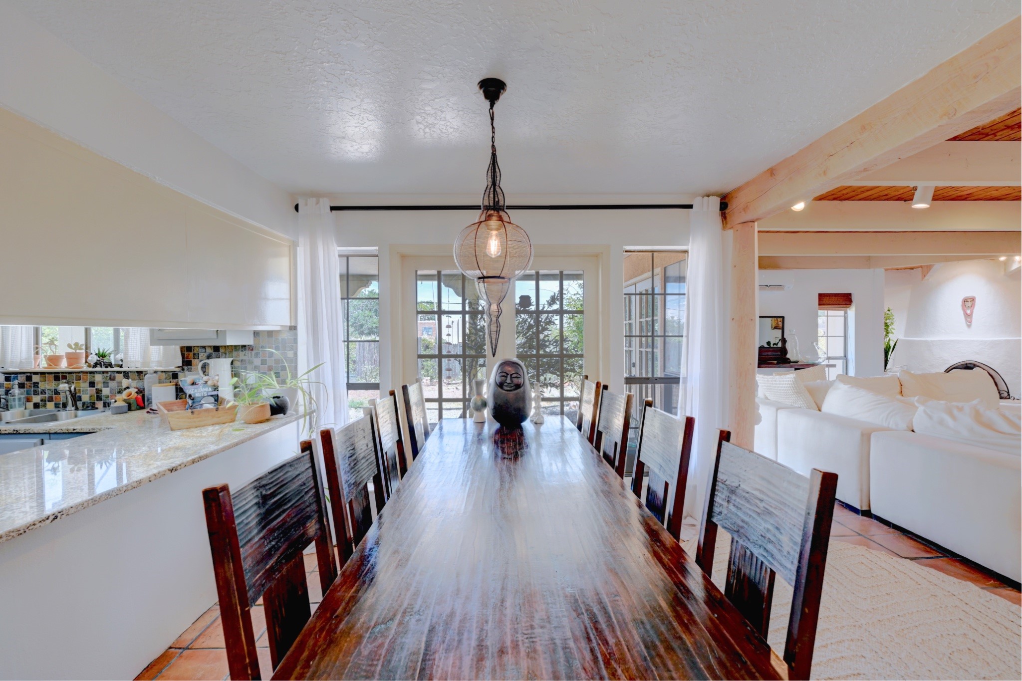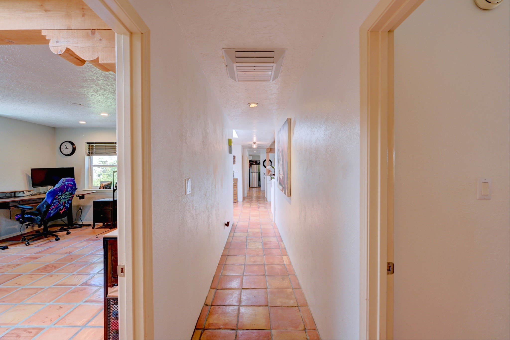 Discover the perfect blend of Southwestern charm and modern convenience in this captivating 3-bedroom, 3-bathroom home spanning 2,376 square feet. This Santa Fe gem welcomes you with authentic Saltillo tiles and stunning exposed ceiling beams that create an atmosphere of rustic elegance throughout.The heart of the home features a beautiful Kiva-style fireplace with its own intimate sitting area, perfect for cozy evenings or entertaining guests. Stay comfortable year-round with five newly installed mini-split systems ensuring optimal climate control in every corner of your home.Recent upgrades include a new tankless water heater for endless hot water, a convenient garage door opener, and a completely redone driveway that enhances curb appeal. Two radon mitigation systems provide peace of mind with comprehensive coverage at both ends of the house.The generous lot offers ample outdoor space, including room for recreational vehicle parking - a rare find that adds tremendous value for adventure enthusiasts. The neighborhood perfectly balances tranquil residential living with urban convenience, placing you within walking distance of local shops and restaurants.Your daily commute is simplified with the Zia Road Rail Runner Station just minutes away, while El Paisano Supermarkets ensures grocery runs are quick and convenient. For outdoor recreation, Dr. Martin Luther King Jr. Park sits practically at your doorstep, offering green space for relaxation and activities.This thoughtfully maintained home combines authentic Santa Fe architectural elements with practical modern amenities, creating an ideal living environment in one of the city's most desirable neighborhoods.Don't forget to check out the 3-D virtual tour, as well as the drone flyover of the area.
