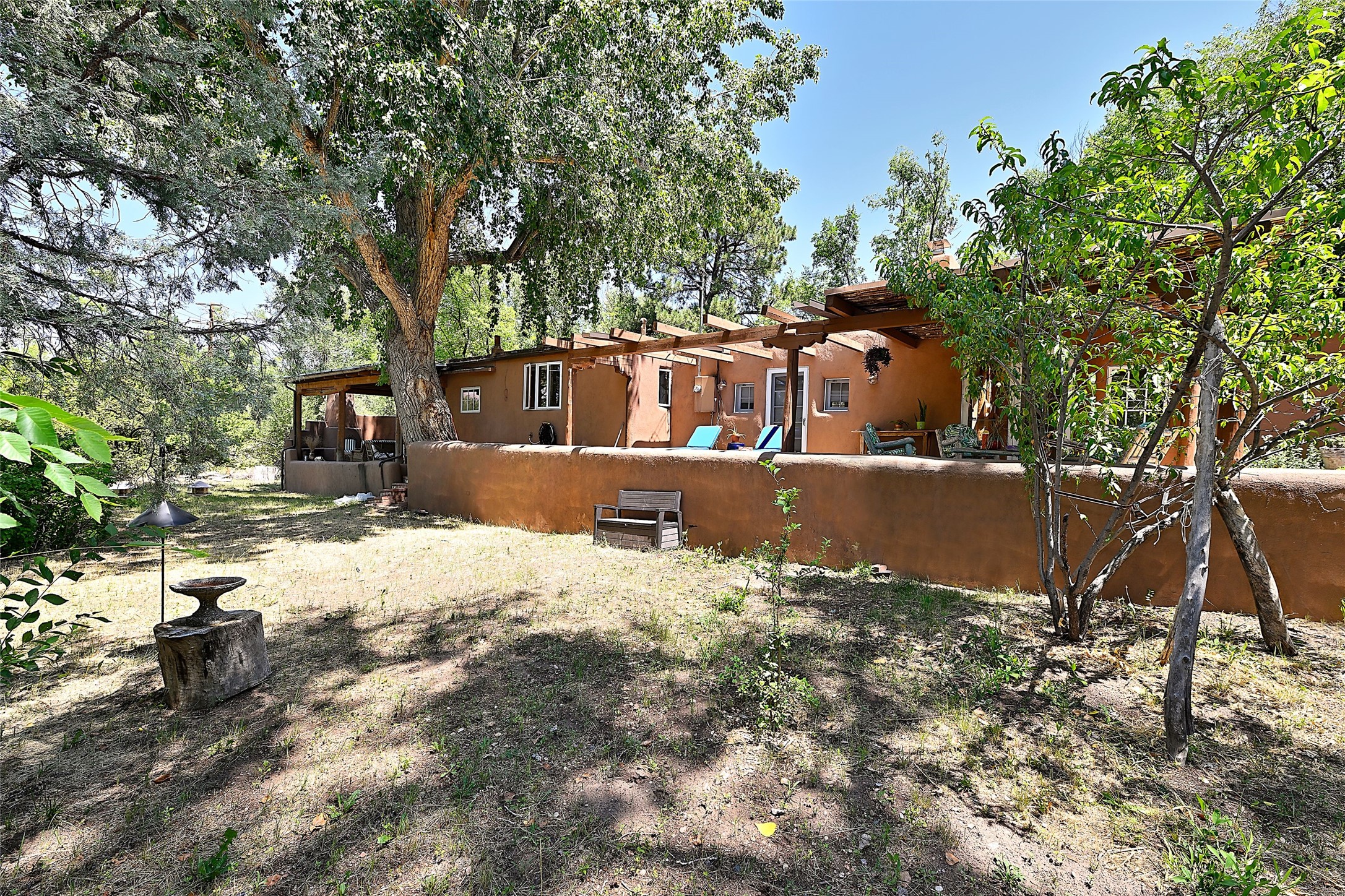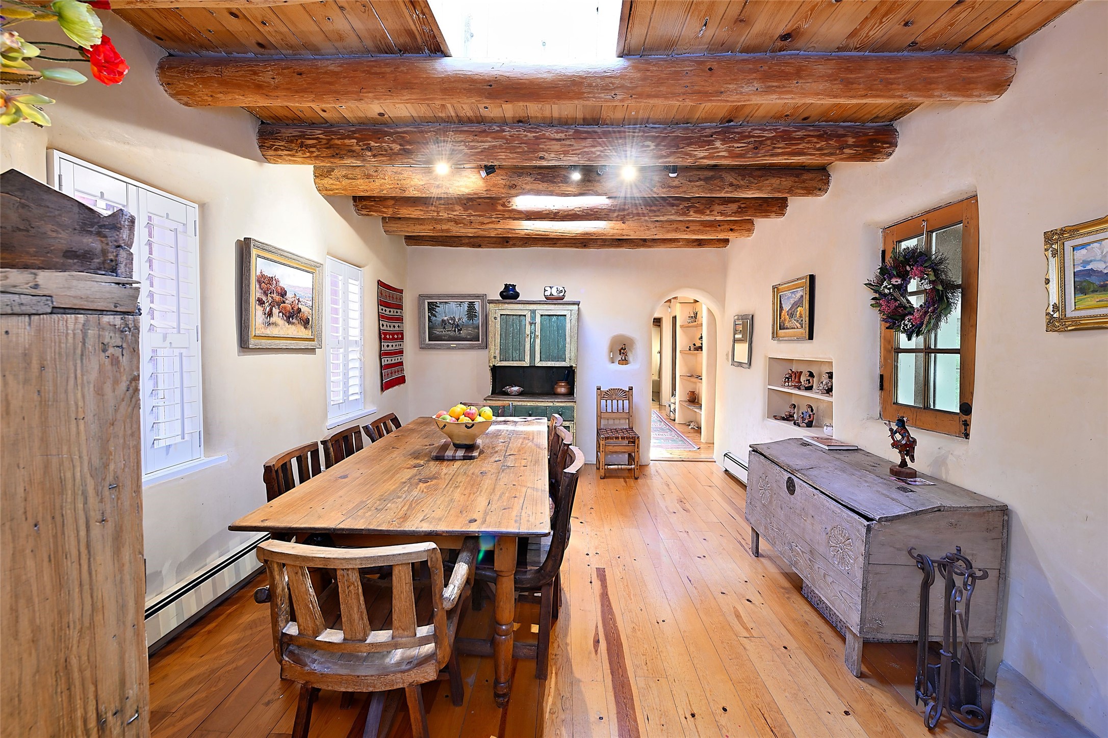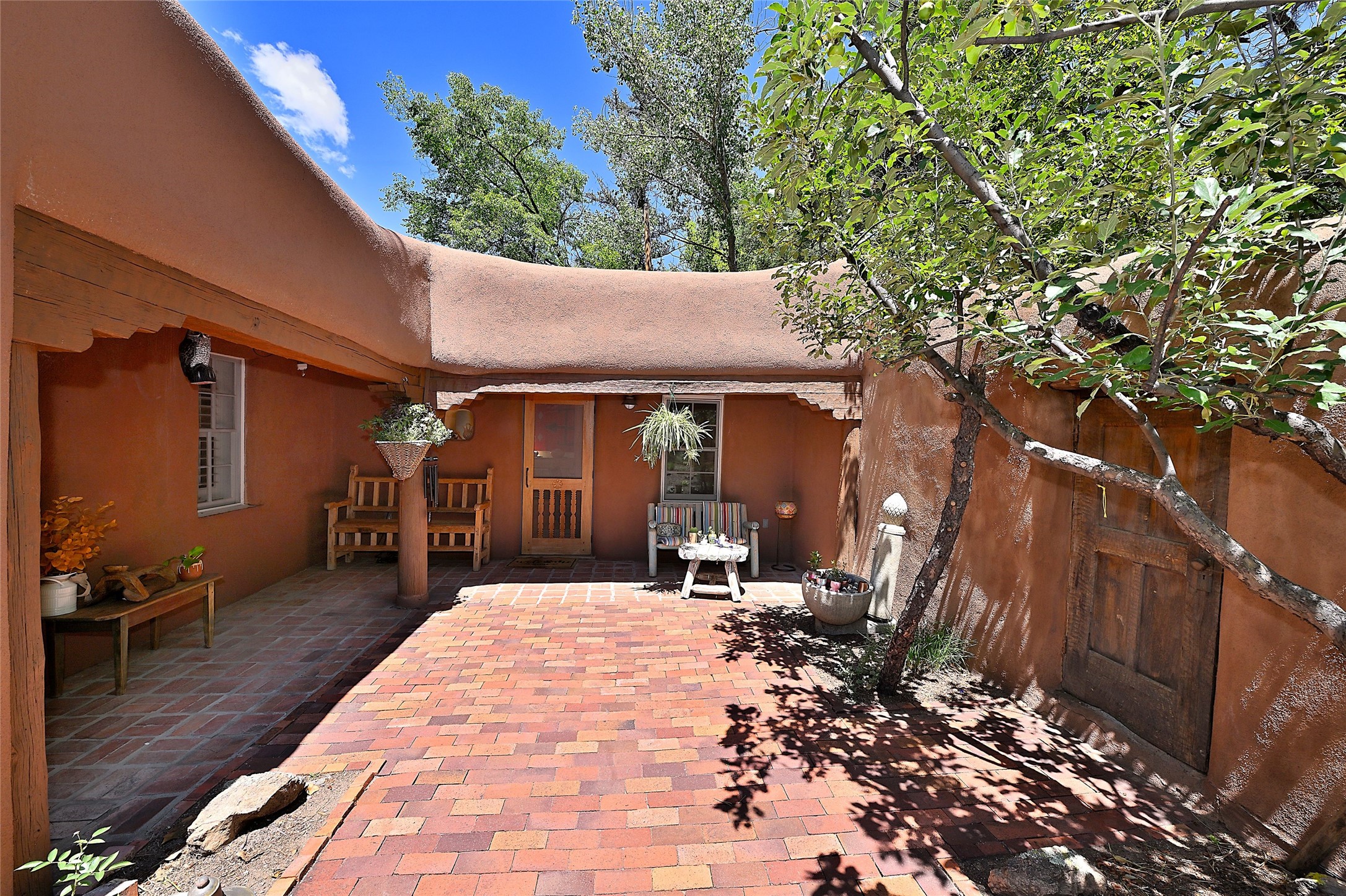 Beneath towering cottonwoods in the verdant Tesuque Valley, this two-bedroom home on the banks of the village's namesake river is filled with warm light, earth tones, and all the charm and whimsy of Santa Fe. A colorful courtyard garden with a lighted brick path and a portal introduce the home, which begins with a welcoming great room featuring hardwood floors, vigas, a corner kiva fireplace, and windows, skylights, and French doors admitting idyllic dappled sunlight. Enchanting skylit hallways lead to a formal dining room with nichos and a kiva fireplace; a delightful kitchen with stainless-steel appliances, stone tilework, warm wood cabinetry, and archways leading to a sunken breakfast nook or sitting area; a comfortable guest bedroom with an en suite bath bright with Talavera details; a discreet powder and laundry room; and a peaceful, luxurious owner's suite with an office area, a well-outfitted walk-in closet, and a spacious light-filled bath. Storage is offered throughout. An enviable portal off the kitchen and great room provides ideal space for outdoor living, dining, and entertaining amid eye-catching tilework, a kiva fireplace, and lush greenery. To the south is a breezy pergola--adjoined by a second flourishing garden area--perfect for birdwatching and appreciating the serene setting. The gravel drive and parking area is just off one of the village's main thoroughfares, and the fabled Tesuque Village Market is only a half mile away.
