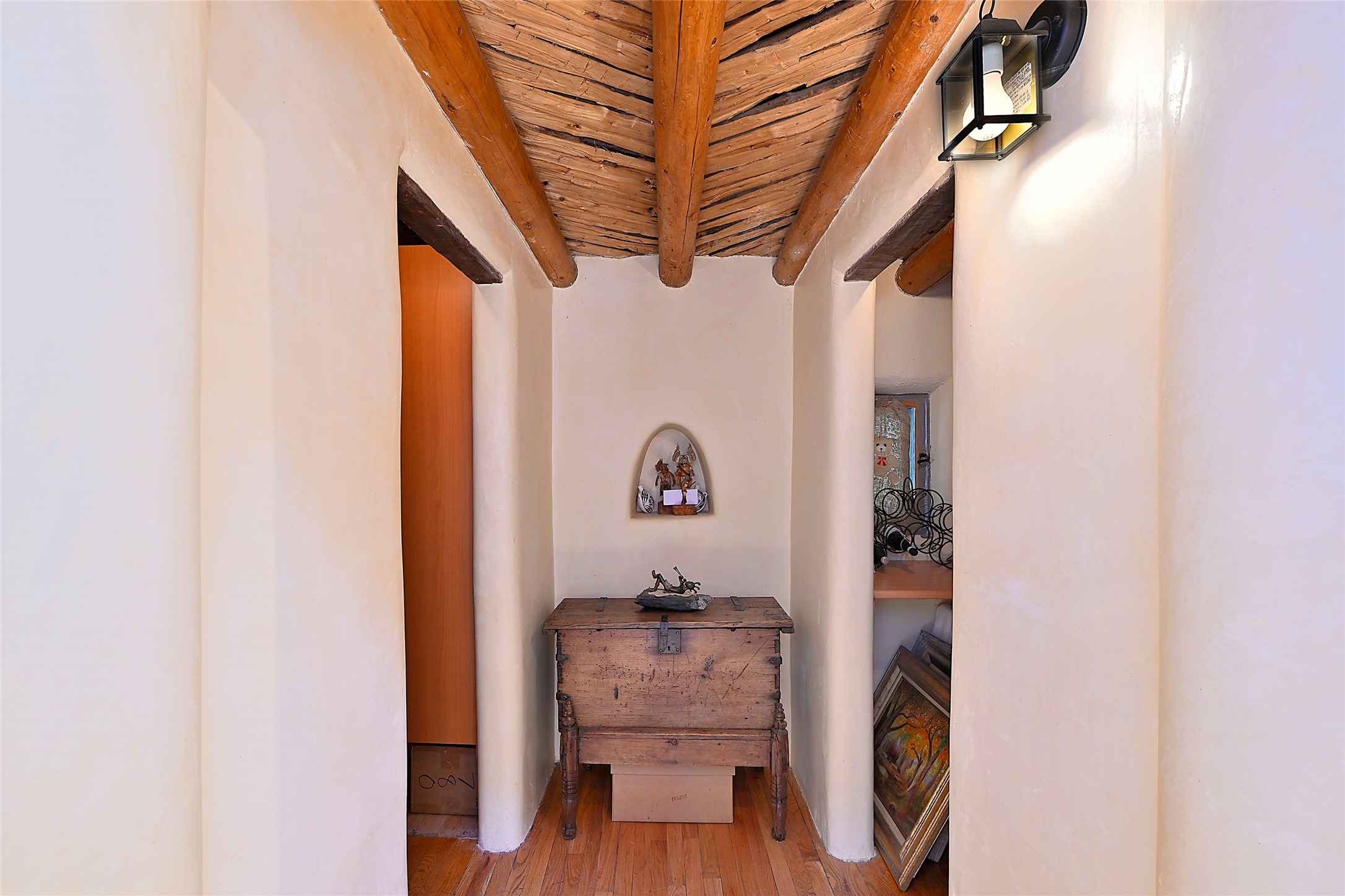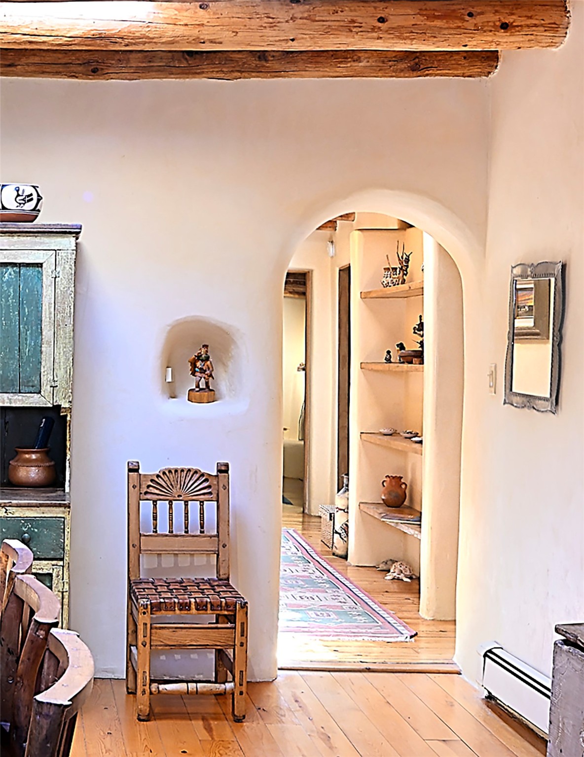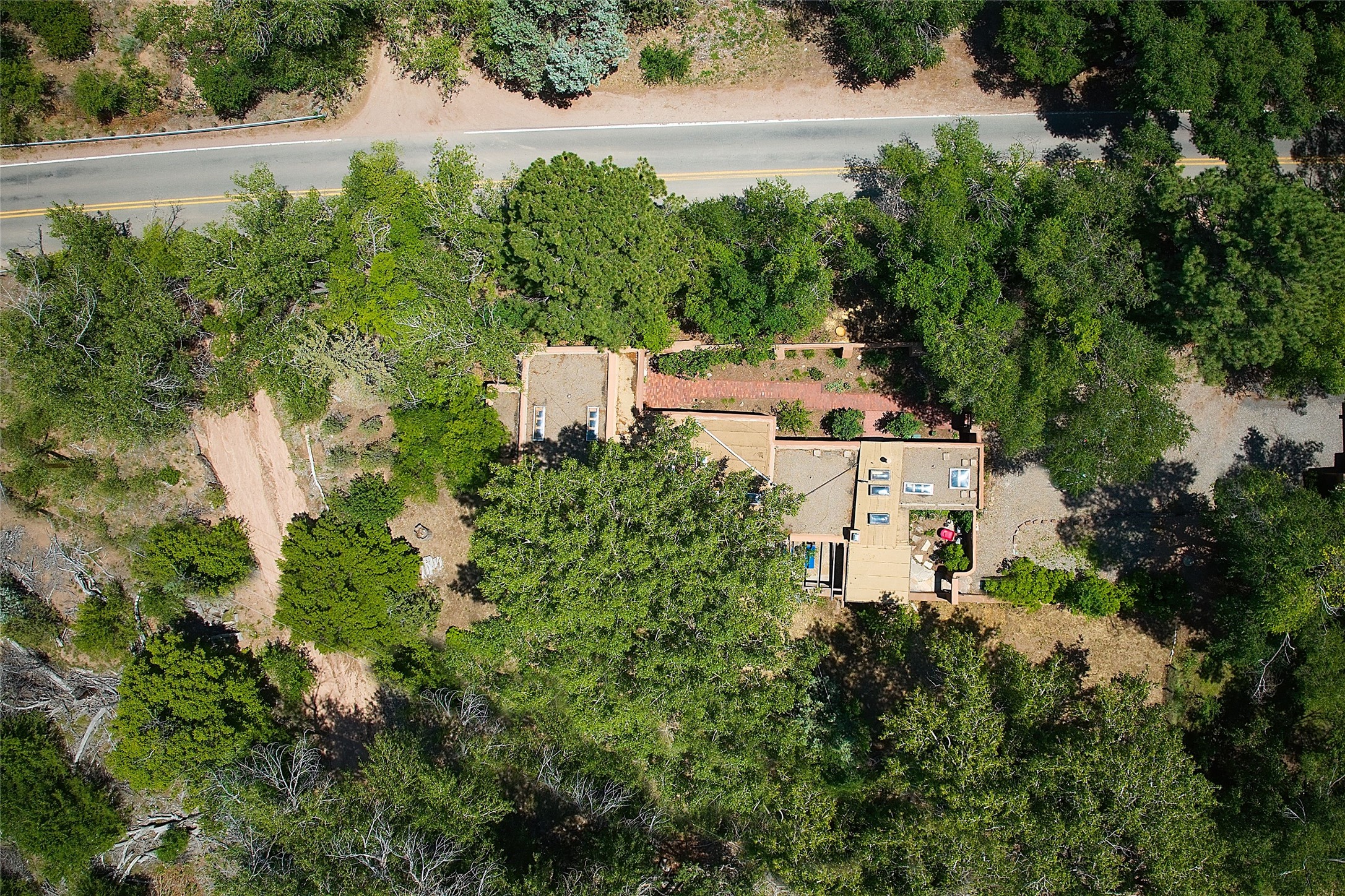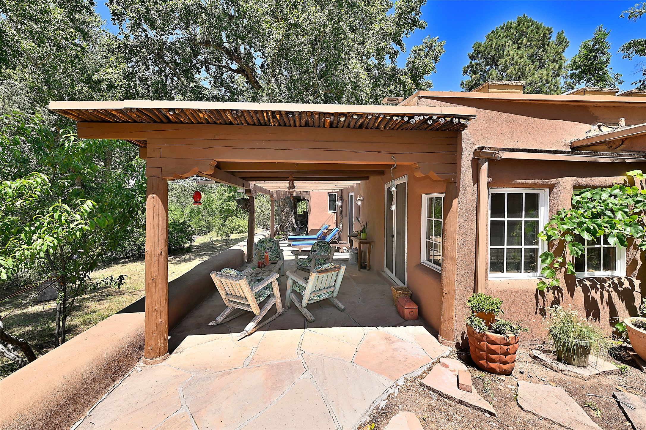 Beneath towering cottonwoods in the verdant Tesuque Valley, this two-bedroom home on the banks of the village's namesake river is filled with warm light, earth tones, and all the charm and whimsy of Santa Fe. A colorful courtyard garden with a lighted brick path and a portal introduce the home, which begins with a welcoming great room featuring hardwood floors, vigas, a corner kiva fireplace, and windows, skylights, and French doors admitting idyllic dappled sunlight. Enchanting skylit hallways lead to a formal dining room with nichos and a kiva fireplace; a delightful kitchen with stainless-steel appliances, stone tilework, warm wood cabinetry, and archways leading to a sunken breakfast nook or sitting area; a comfortable guest bedroom with an en suite bath bright with Talavera details; a discreet powder and laundry room; and a peaceful, luxurious owner's suite with an office area, a well-outfitted walk-in closet, and a spacious light-filled bath. Storage is offered throughout. An enviable portal off the kitchen and great room provides ideal space for outdoor living, dining, and entertaining amid eye-catching tilework, a kiva fireplace, and lush greenery. To the south is a breezy pergola--adjoined by a second flourishing garden area--perfect for birdwatching and appreciating the serene setting. The gravel drive and parking area is just off one of the village's main thoroughfares, and the fabled Tesuque Village Market is only a half mile away.
