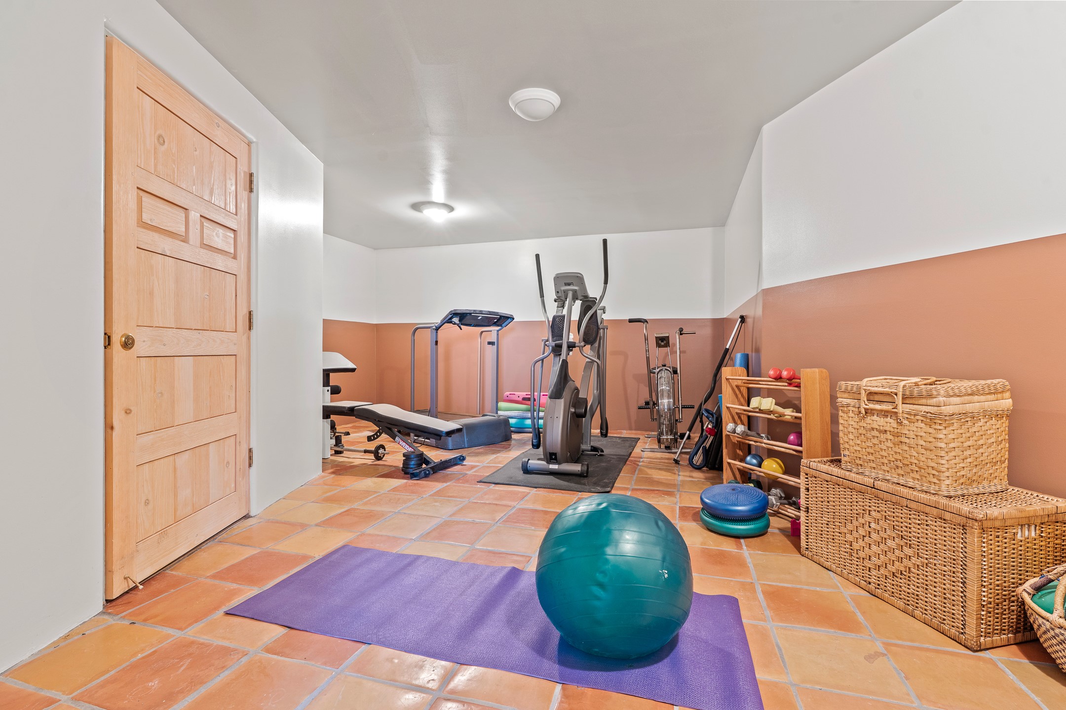 This gated sanctuary, less than 3 miles from the Plaza and Canyon Road, with unmatched views is on the market for first time. The pueblo-style property sits perched on approximately 2.24 acres of abundant aspens and blue spruce that frame the unparalleled city view and distant Sangre de Cristo and Jemez Mountains. Its thick wrap around brick patio is perfect for indoor-outdoor living and entertaining by the outdoor fireplace and skies. The extensive windows and glass doors on the westside of the home allow sunsets to bathe the home in shades of pink nightly. Upon entering the foyer you are warmed by a small kiva fireplace to greet your entrance. The main residence consists of 3 bedrooms, 2 1/2 baths, a library, an office, a den, an expansive sized great room, a bar, a gourmet kitchen, and 6 fireplaces. The 2 bedroom, 1 full bath guest house also offers panoramic views with a full kitchen, private covered patio, and kiva adorning the living room. Direct access to the main house as well as its own private entrance. The curved living quarters of the guest house boasts wall to wall windows of city views. Discover the magic of this property that sits perched above downtown Santa Fe with direct access to the Wilderness trails and the natural beauty of Santa Fe.