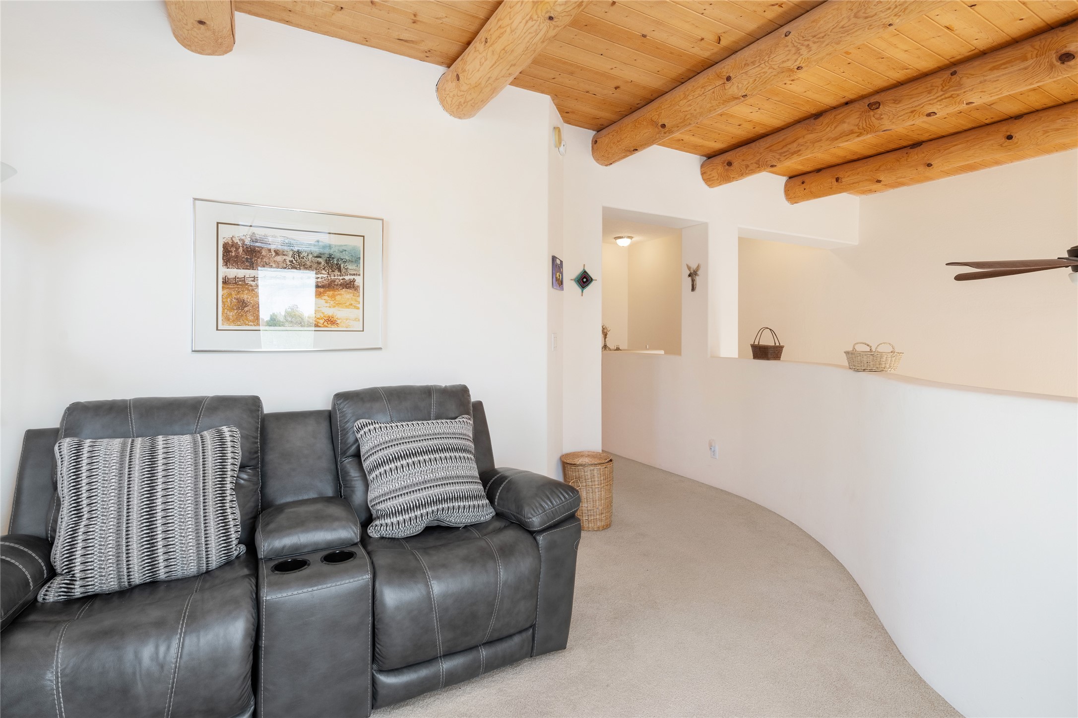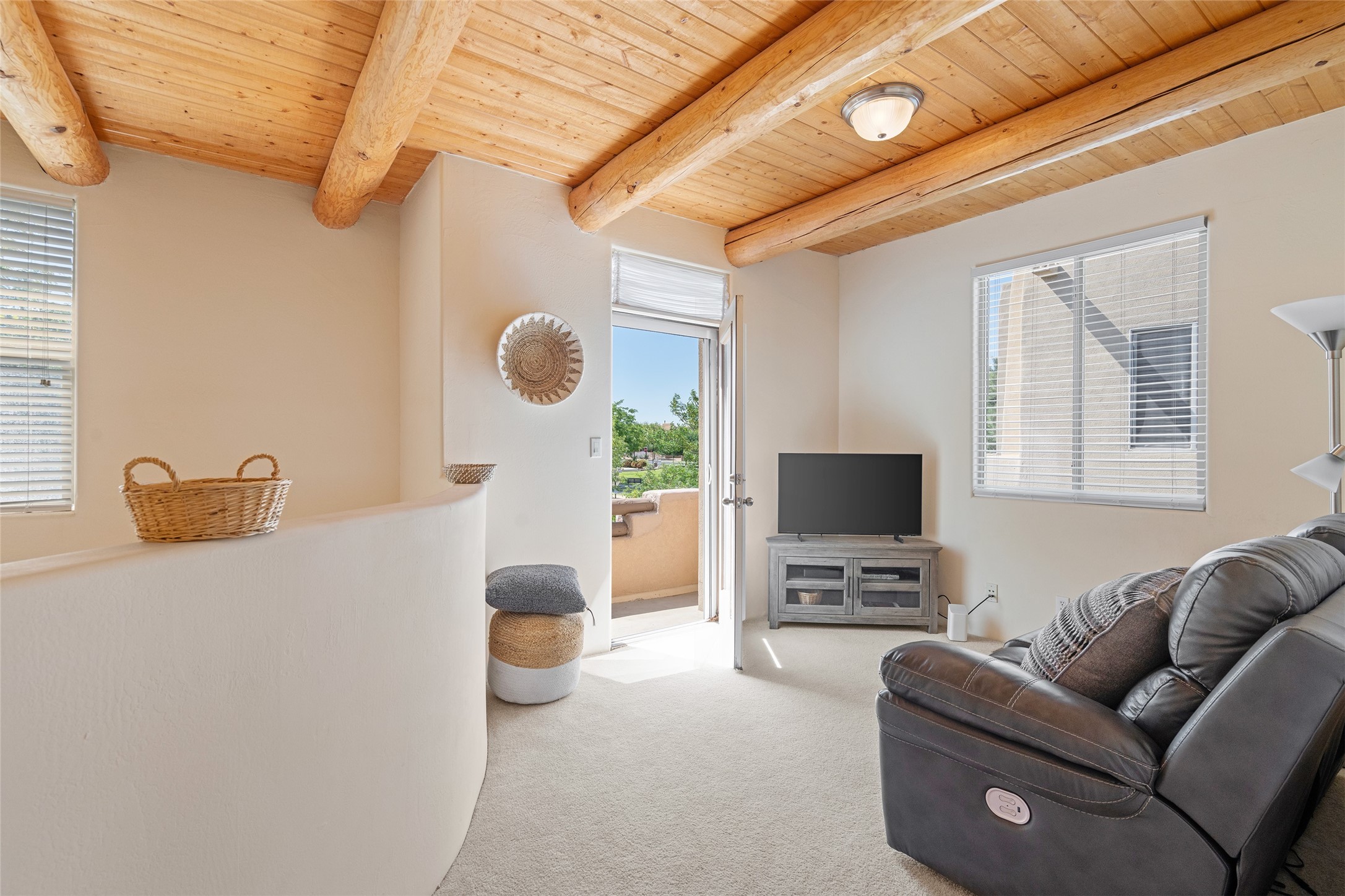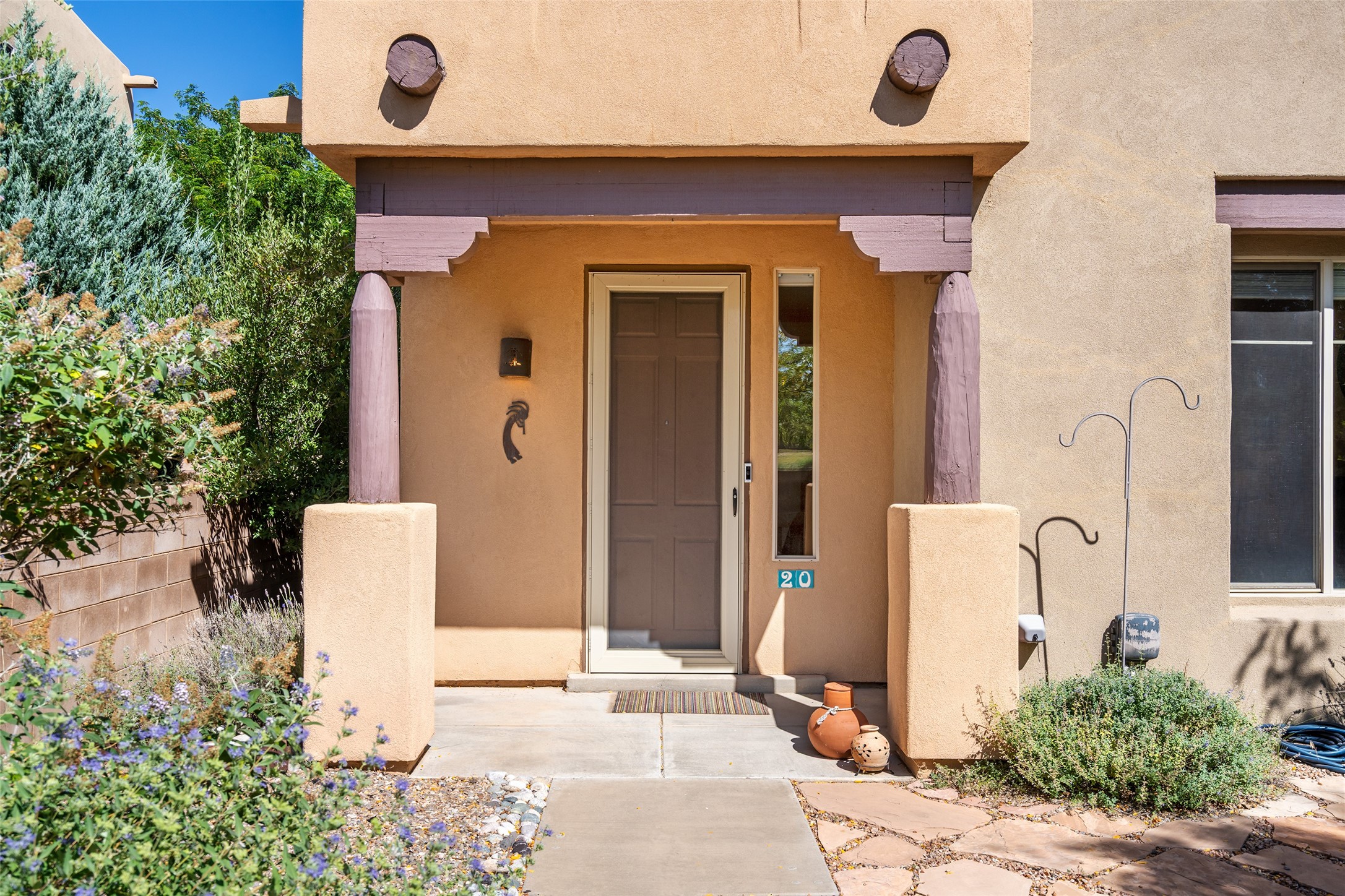 The seller will pay 1 YEAR HOA DUES with an acceptable offer for this Outstanding Windmill Ridge Townhome! So lightly lived in, you'll be amazed at its pristine condition! Located in the desirable Windmill Ridge area of Rancho Viejo, this turn-key property is ideal for full-time living or as a low-maintenance lock-and-leave. The main living area features beautiful tile floors and a soaring 20-foot ceiling, creating an open and expansive feel. A charming gas kiva fireplace, vigas, and wood ceilings add authentic Santa Fe warmth. The kitchen offers generous storage within maple cabinetry, complemented by soft neutral-toned tile countertops. A convenient laundry room and powder bath are located on the main level. Upstairs, a versatile loft provides the perfect space for a home office, media area, or reading nook, complete with a small balcony overlooking southern views and the neighborhood park. The primary suite boasts its own spacious balcony with sweeping views of designated open space and both the Jemez and Sangre de Cristo mountains. This immaculate home is part of a welcoming community featuring over 12 miles of paved walking trails, multiple parks, and an active HOA. Exterior maintenance is included in the townhome dues, making for stress-free living. Priced to sell and ready for its next owner!