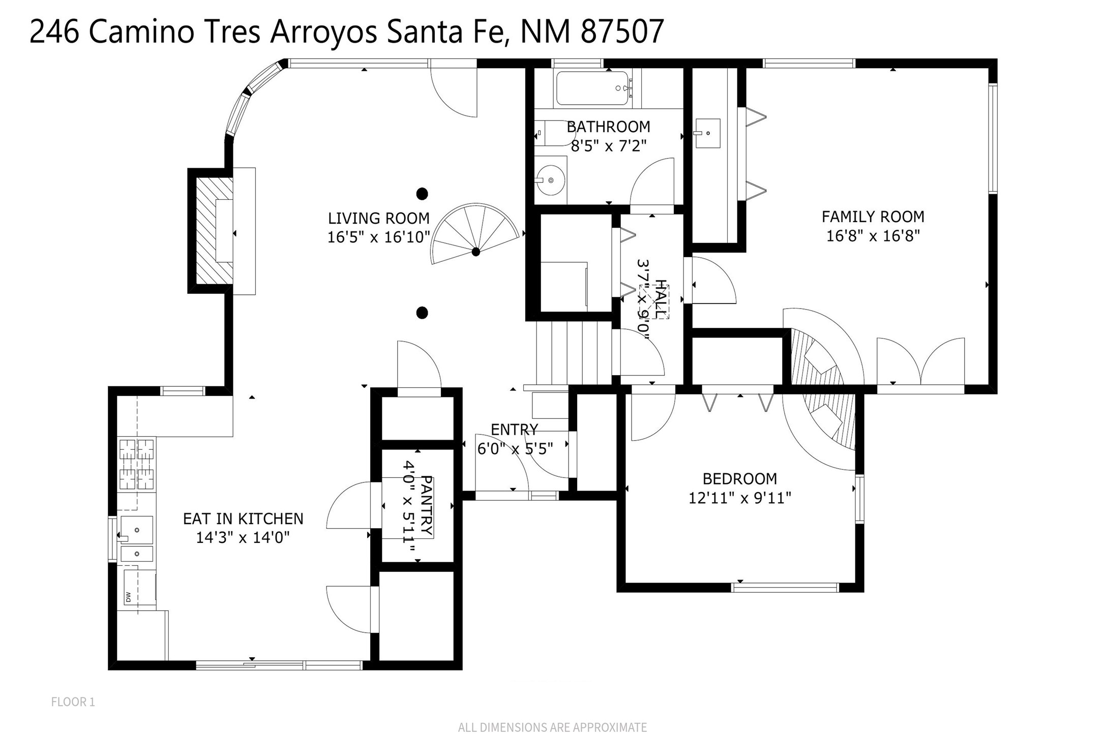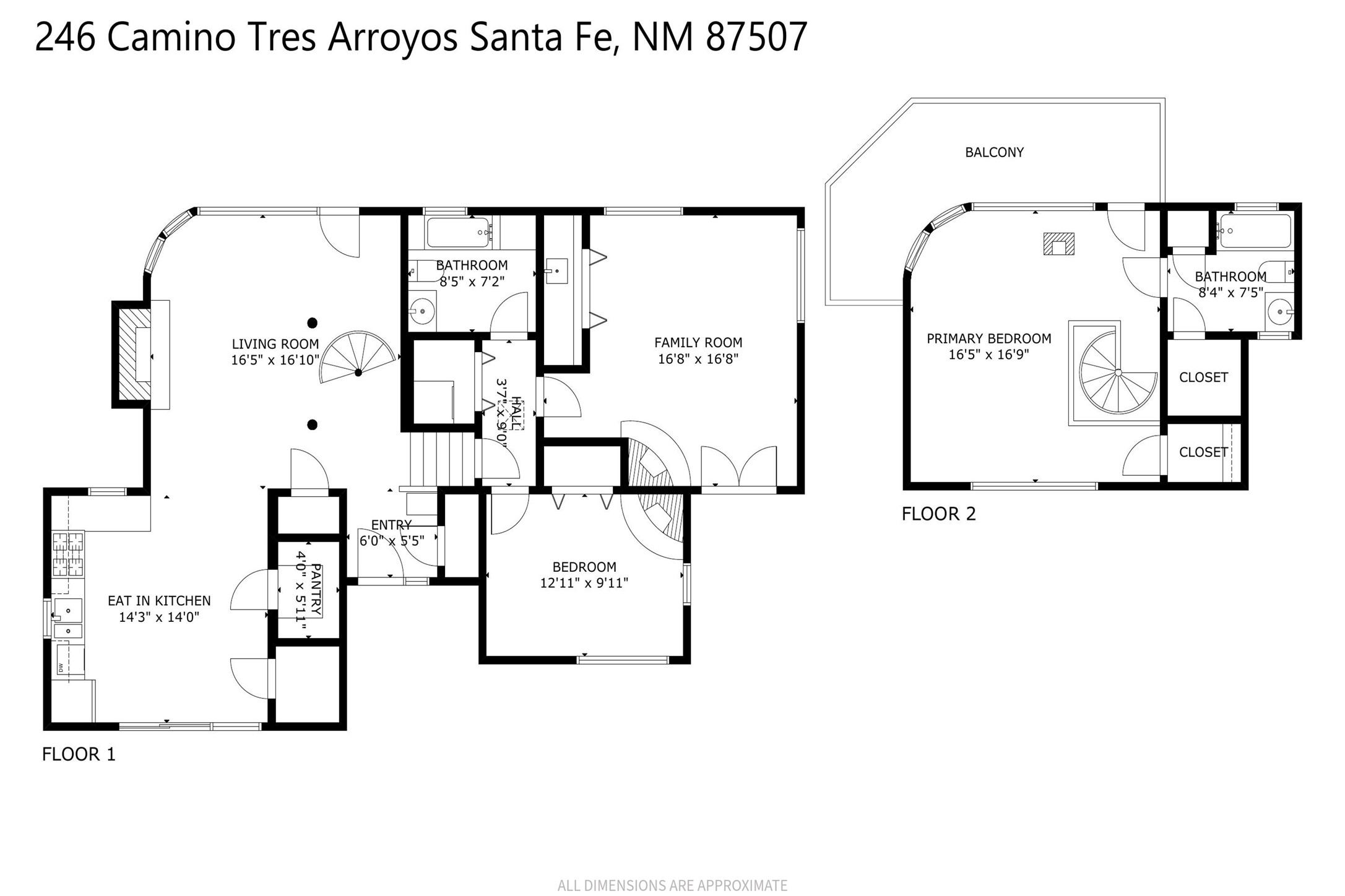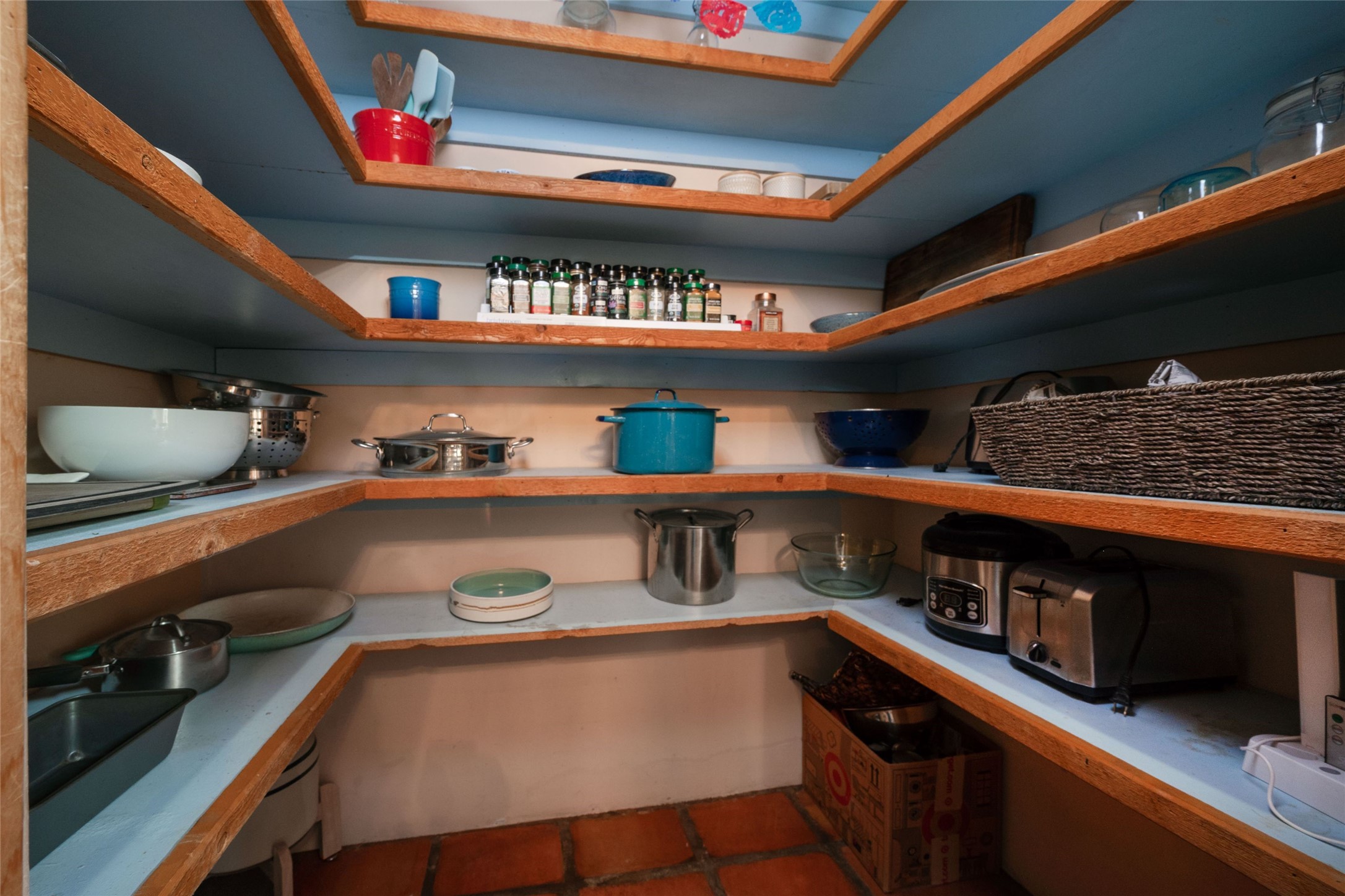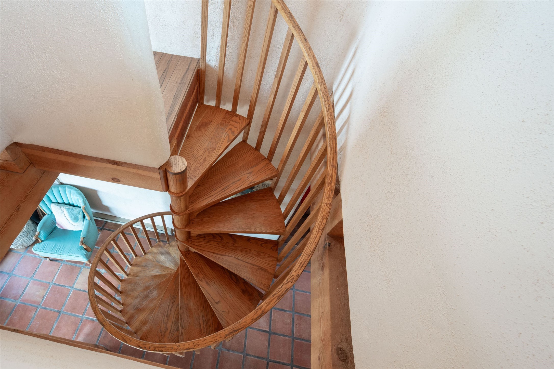 Located on 1.25 acres, a mere 4 miles from the Plaza, Casa del Sol feels like country living ten minutes from town. The Casa has 3 bedrooms and 2 full baths, ample privacy, stunning mountain views, and fantastic light. This classic Pueblo style adobe home was built by hand by artist Paul Glickman with careful attention to detail. You'll find all the classic finishes - vigas and beams, high ceilings, corbels, pretty wood doors, Saltillo tile floors, nichos and 4 fireplaces- kivas and 2 wood burning stoves. The main living areas have an open feel between kitchen, dining and living, as well as high ceilings with clerestory windows for added light and passive solar gain. The South-facing flagstone patio off the kitchen, as well as the Northwest outdoor area off the living room, are perfect for indoor and outdoor living and entertaining. A highlight of this home is the Loretto-inspired wooden spiral staircase to the second-floor primary bedroom, with custom bamboo floors, a wood-burning stove, and an ensuite bath. Outside the upstairs bedroom, a wrap-around deck makes it easy to enjoy big sunset and sunrise views. Down a few steps from the front entry is the guest bedroom, offering good separation and privacy, as well as a cozy corner kiva fireplace. The third bedroom, with its separate entry, can serve several functions: home office, guest suite, den, or studio, and has a wood stove insert in the fireplace as well as a sink. With the adobe construction and a mini split for cooling, the house stays comfortable in winter and summer. A ground-mount solar array provides a surplus of energy almost every month. The property is zoned for livestock, with space for a corral. Brand new roof fall of 2025, with 10 year transferrable warranty! This home is a special retreat, with its charm, exquisite craftsmanship, and stunning views in a tranquil, beautiful, and natural setting. Casa del Sol is one of a kind.