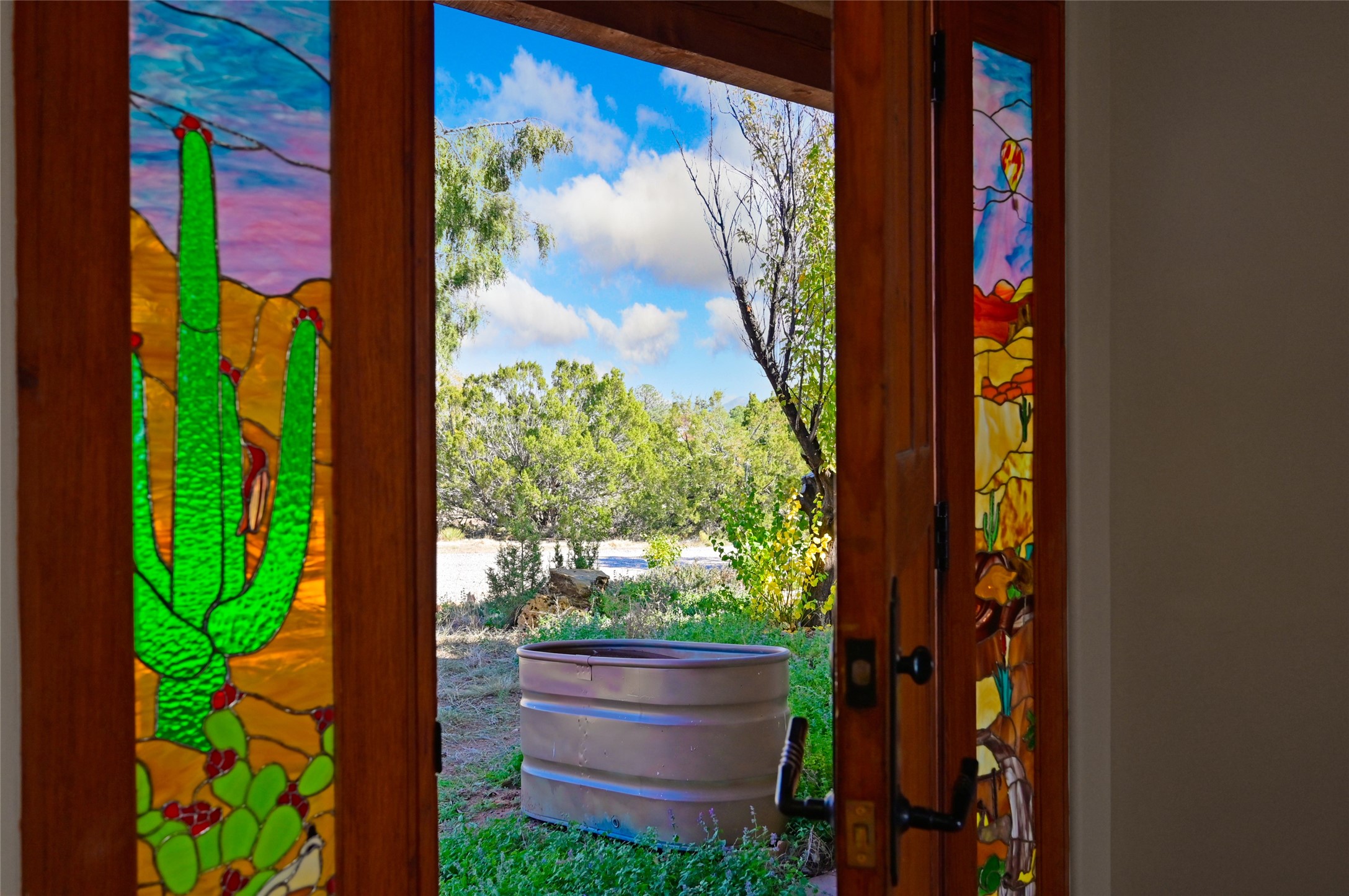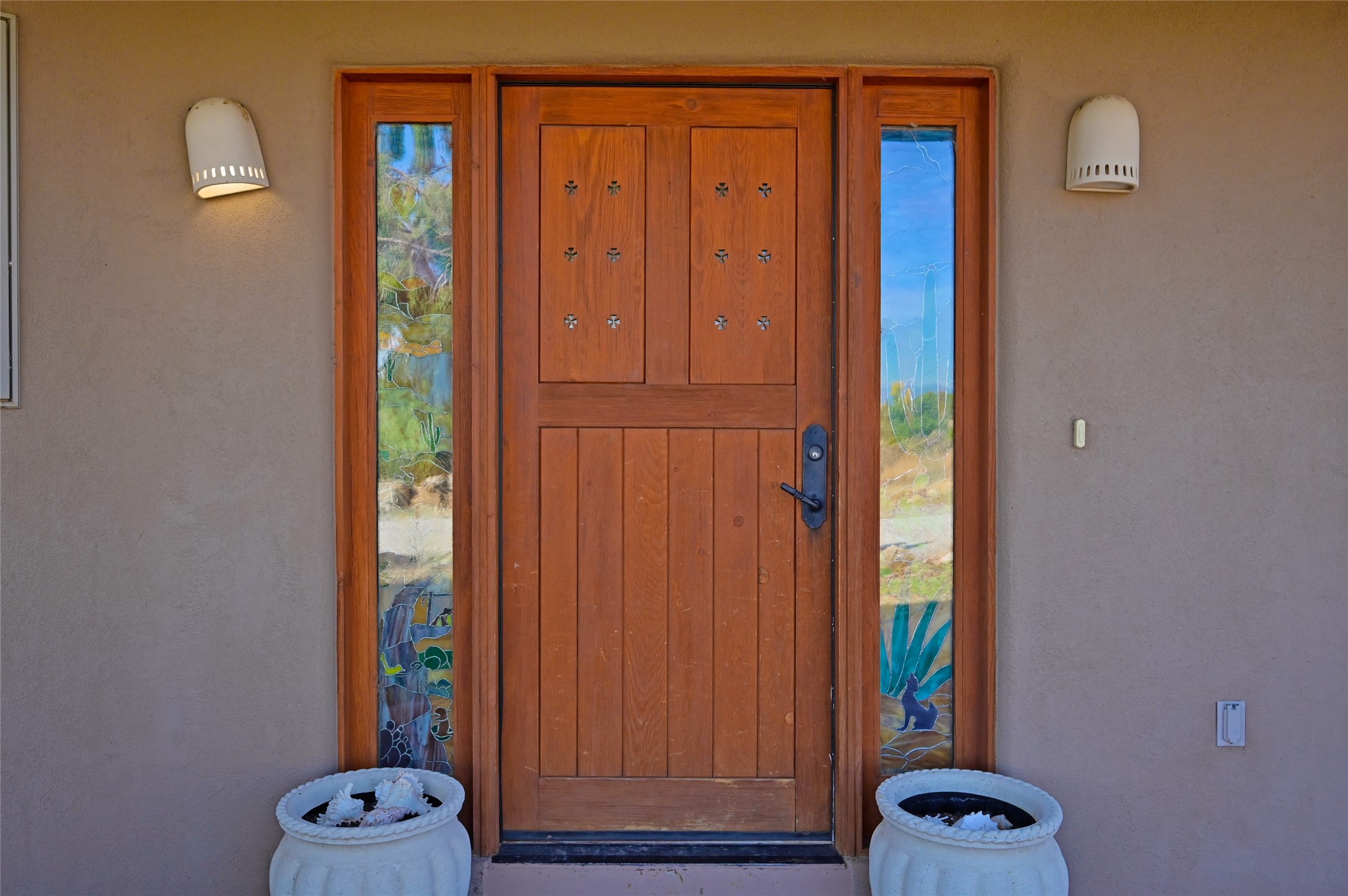 Desirable Eldorado location with stunning Sangre de Cristo and Sandia Mountain views! Set on almost two acres, this beautiful home offers the perfect balance of rural serenity and easy access to Santa Fe's shops, dining, and amenities. Featuring viga ceilings, a very large open floor plan, and generously sized rooms throughout, the home combines spaciousness with classic Santa Fe charm. The flexible layout includes three ensuite bedrooms, four bathrooms, plus an office, ideal for guests, family, or a home workspace. Numerous recent upgrades include the kitchen, bathrooms, well equipment, and roof, providing modern comfort and peace of mind. The modern eat-in kitchen opens to bright living areas accented by wood vigas and a kiva fireplace. Enjoy in-floor radiant heat and take in the expansive mountain views from the covered portal, perfect for outdoor dining or quiet evenings. A two-car garage and workshop/artist studio offer ample space for projects and storage. With breathtaking views, thoughtful upgrades, and an unbeatable Eldorado setting, this home truly has it all--space, style, and comfort in every detail.